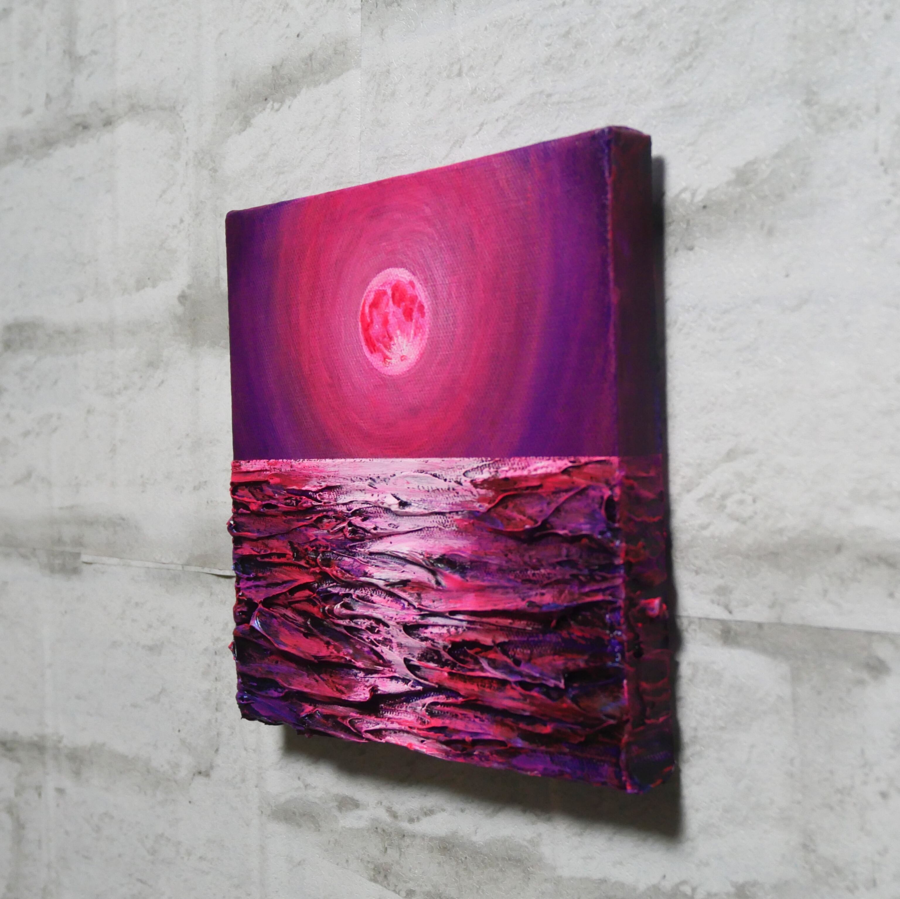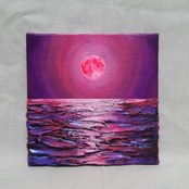 「ストロベリームーン」は、幻想的なピンクと紫色の夜空を背景に、穏やかなピンク色の満月と海の光の道を描いた心に響く油彩作品です。この作品は、夜空に煌めく無数の星々の下、月明かりに照らされた海が静かに波を打つ様子を美しく表現しています。観る人々に、心の安らぎと穏やかなひとときを提供することでしょう。