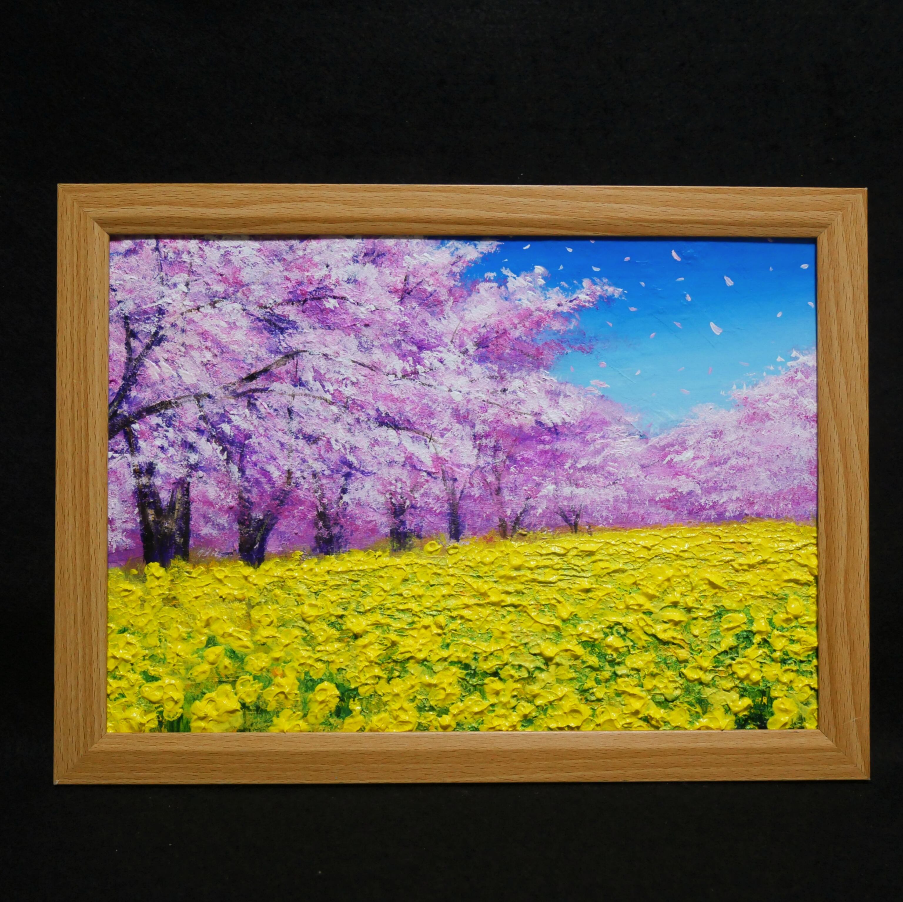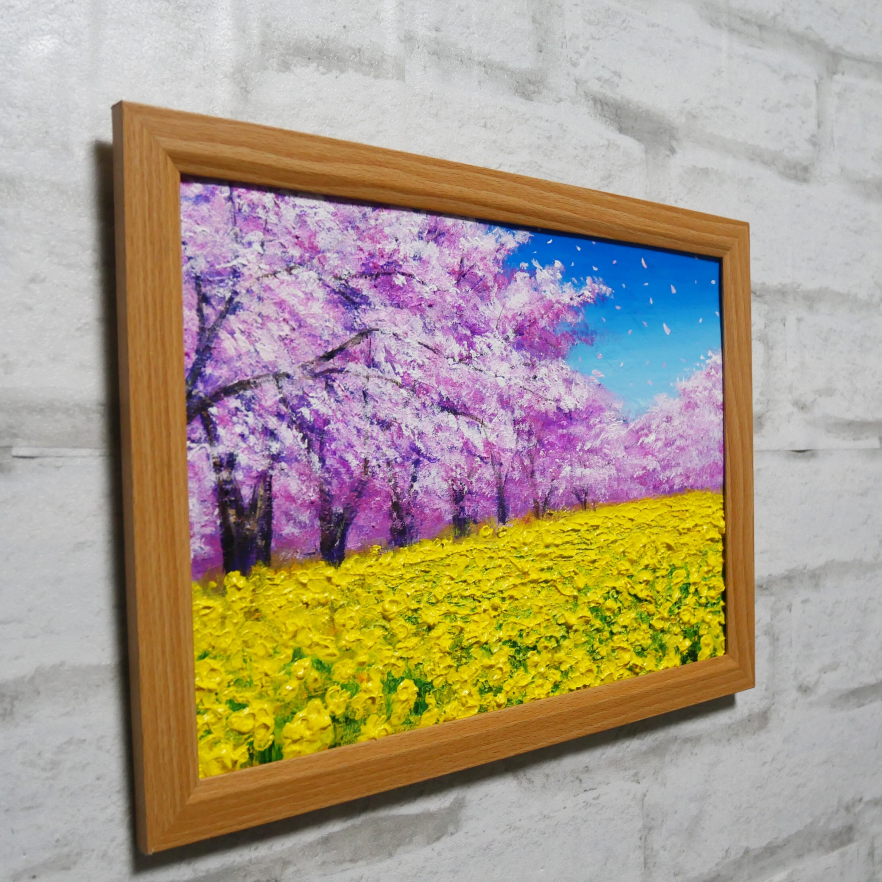 使用されている油絵の具は一流の【ホルベイン】やアクリル絵具【リキテックス】で、色鮮やかな花々の表現が見事に施されています。「桜と菜の花」は、春の生命力と心を和ませる瞬間を感じさせる特別な作品で、あなたを魅了することでしょう。