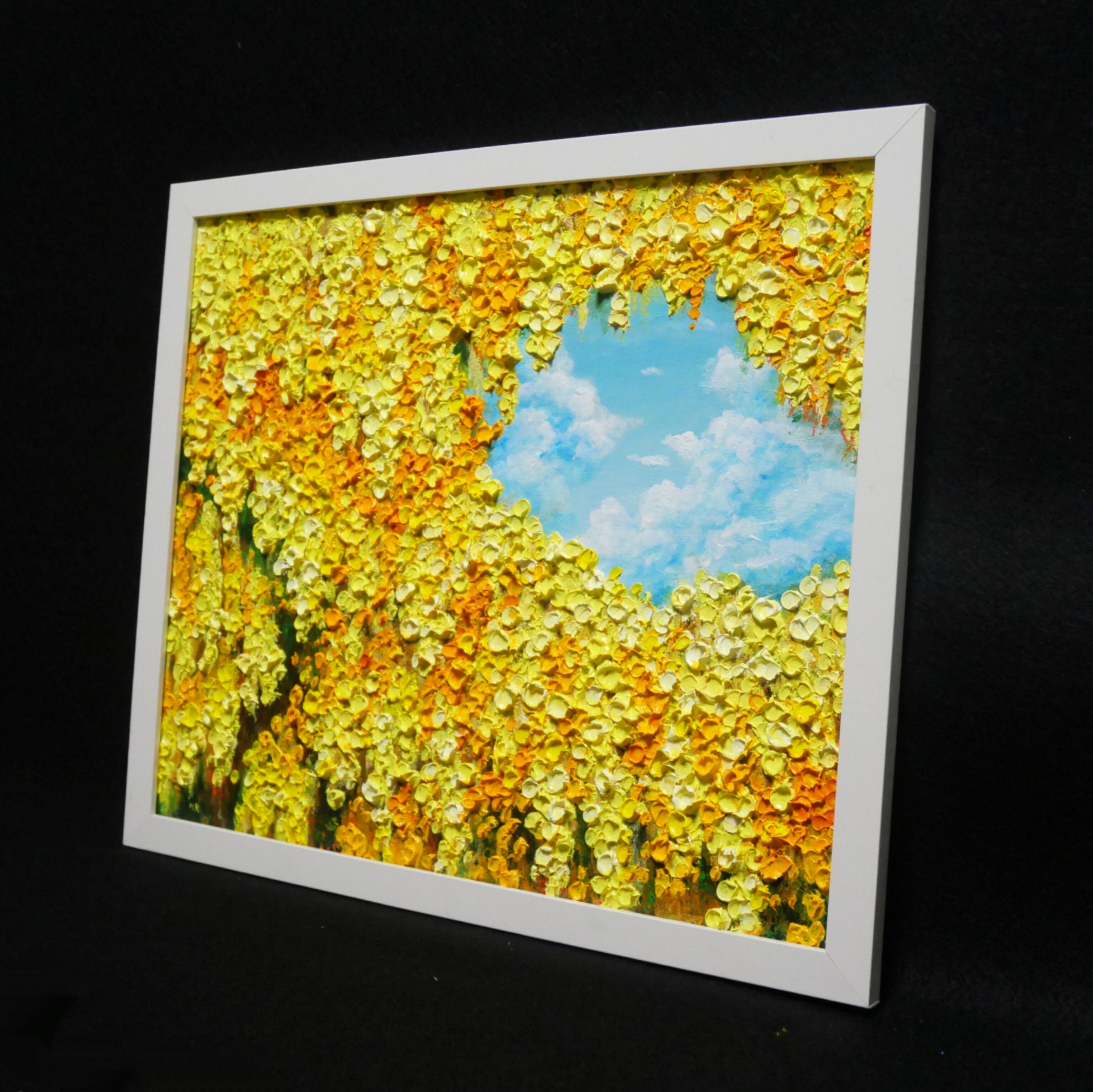 「ミモザの丘」は、青空と雲を背景に、鮮やかに咲き誇るミモザの花々が描かれた、美しい油彩作品です。この作品では、ミモザとその周りの風景が調和し、観る人々に穏やかで心温まる瞬間を提供します。ミモザの優しい黄色は、春の訪れを感じさせ、あなたの生活空間に明るさと生き生きとしたエネルギーを与えてくれることでしょう。