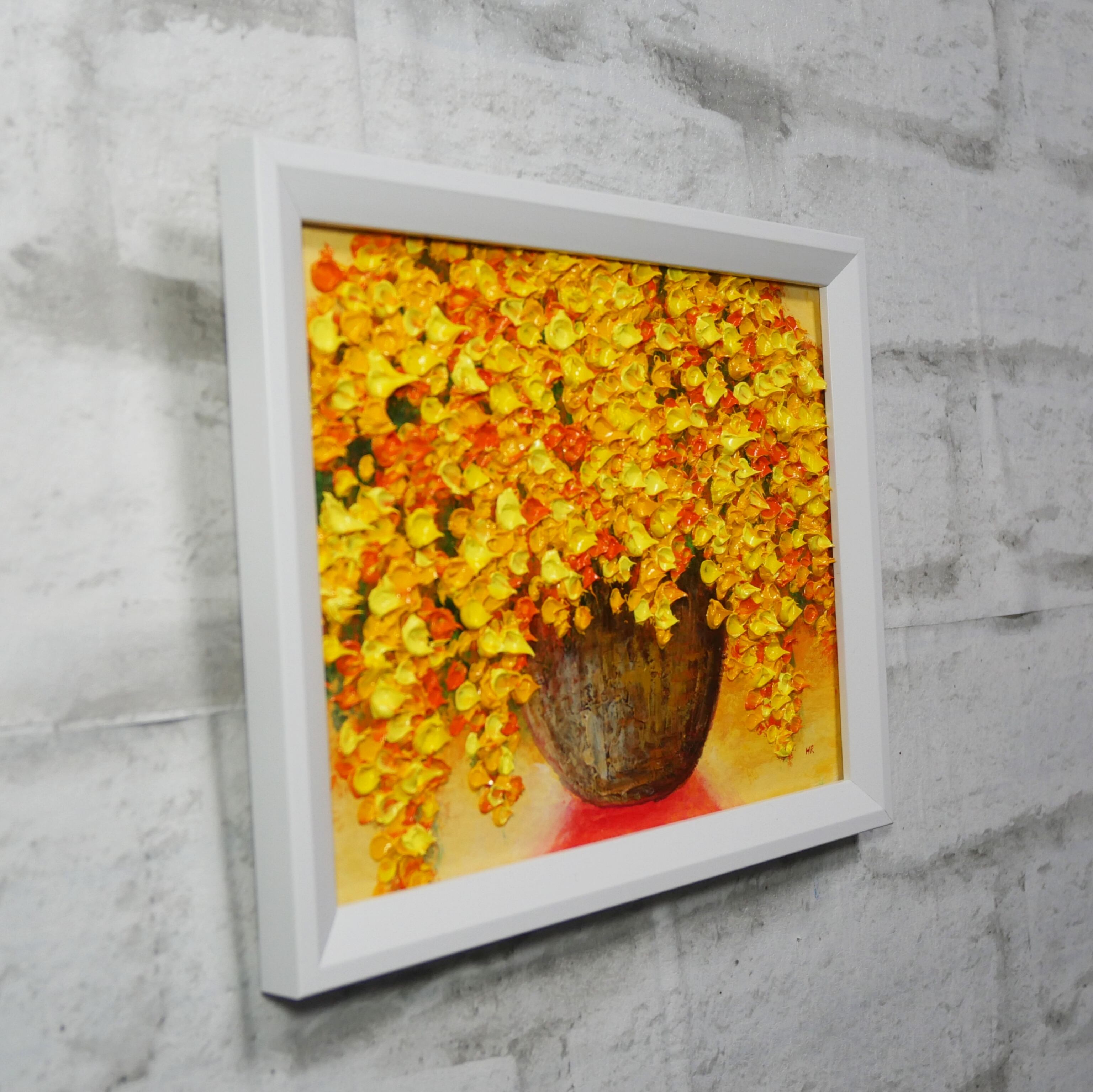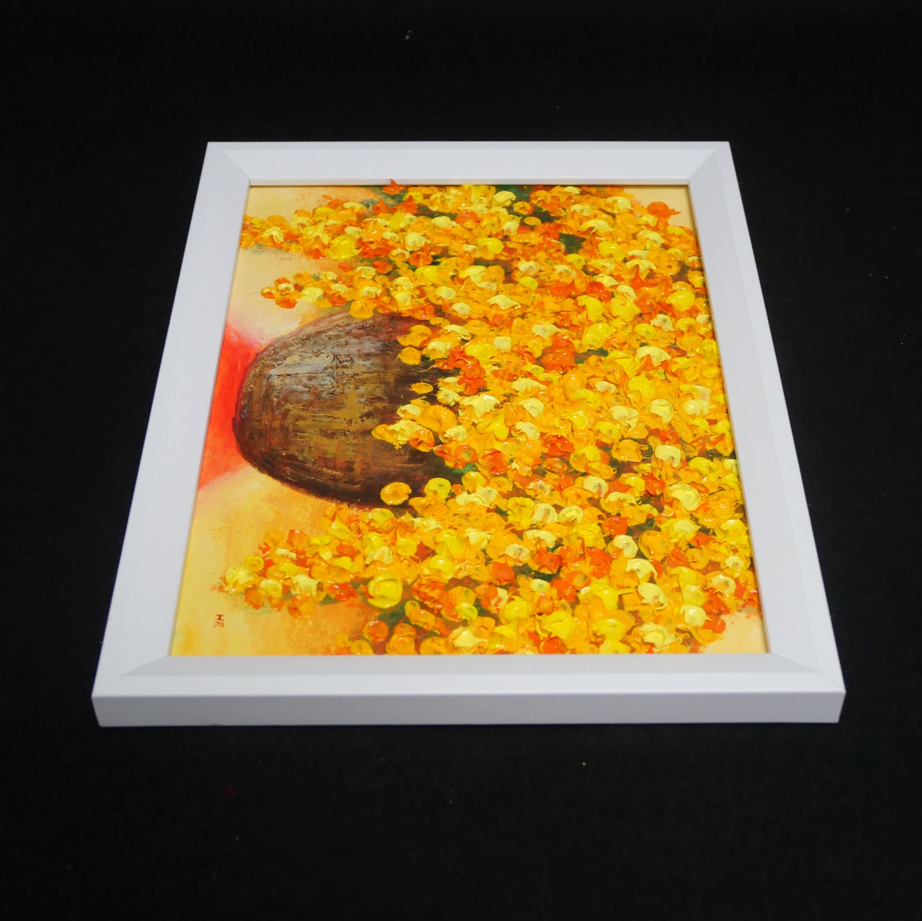 「ミモザ」は、鮮やかな黄色と茶色の花瓶を背景に、メインのミモザの花々を描いた美しい油彩作品です。この作品では、ミモザの花とその周りの景色が見事に調和し、観る人々に穏やかで心温まる瞬間を提供します。ミモザの明るい黄色は、春の息吹を感じさせ、あなたの生活空間に生き生きとしたエネルギーを与えてくれることでしょう。
