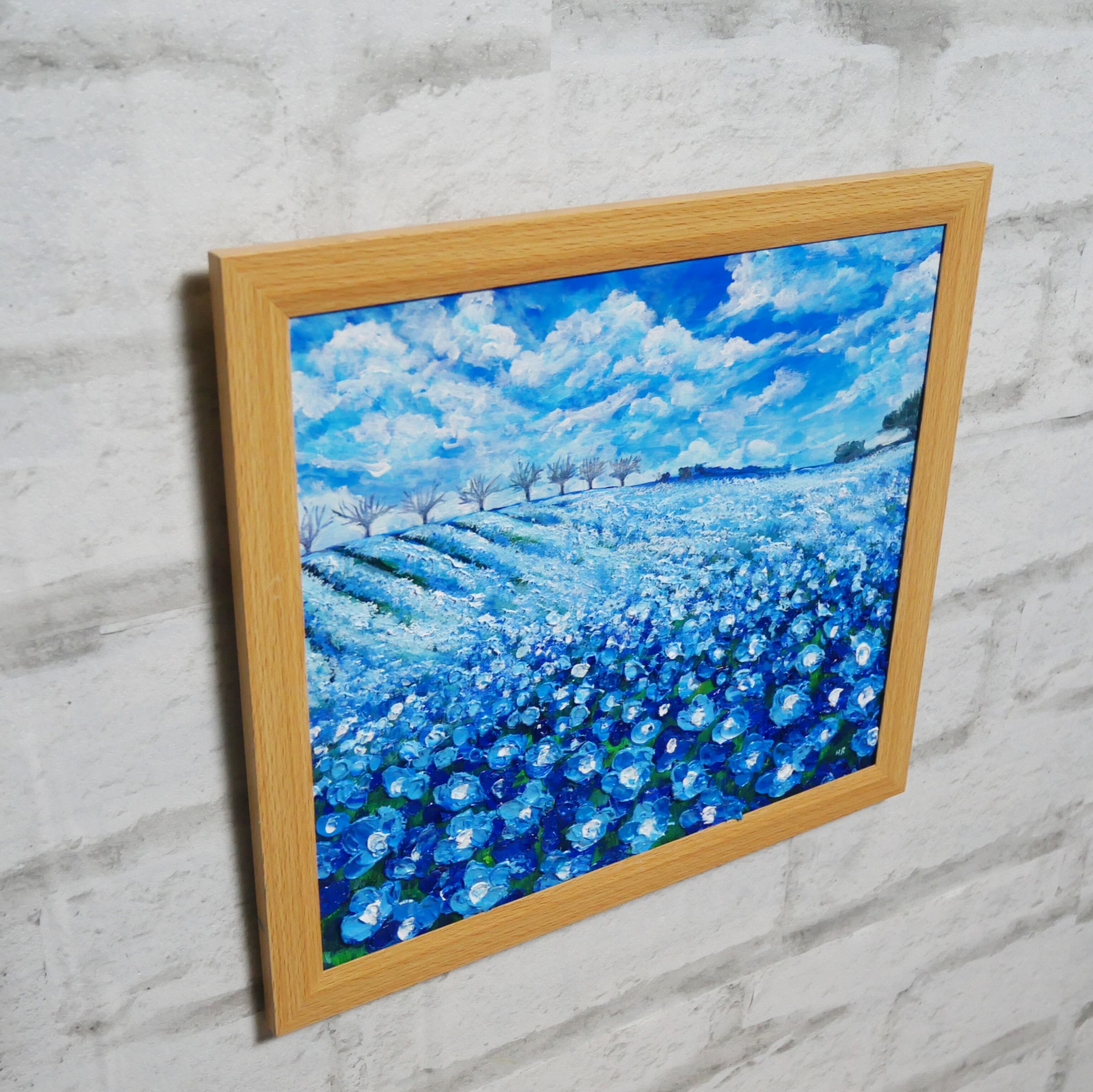 使用されている油絵の具は一流の【ホルベイン】で、ネモフィラの透明感と生命感が見事に表現されています。「ネモフィラブルーの丘」は、見る人を惹きつけ、心を和ませる特別な作品となっています。
