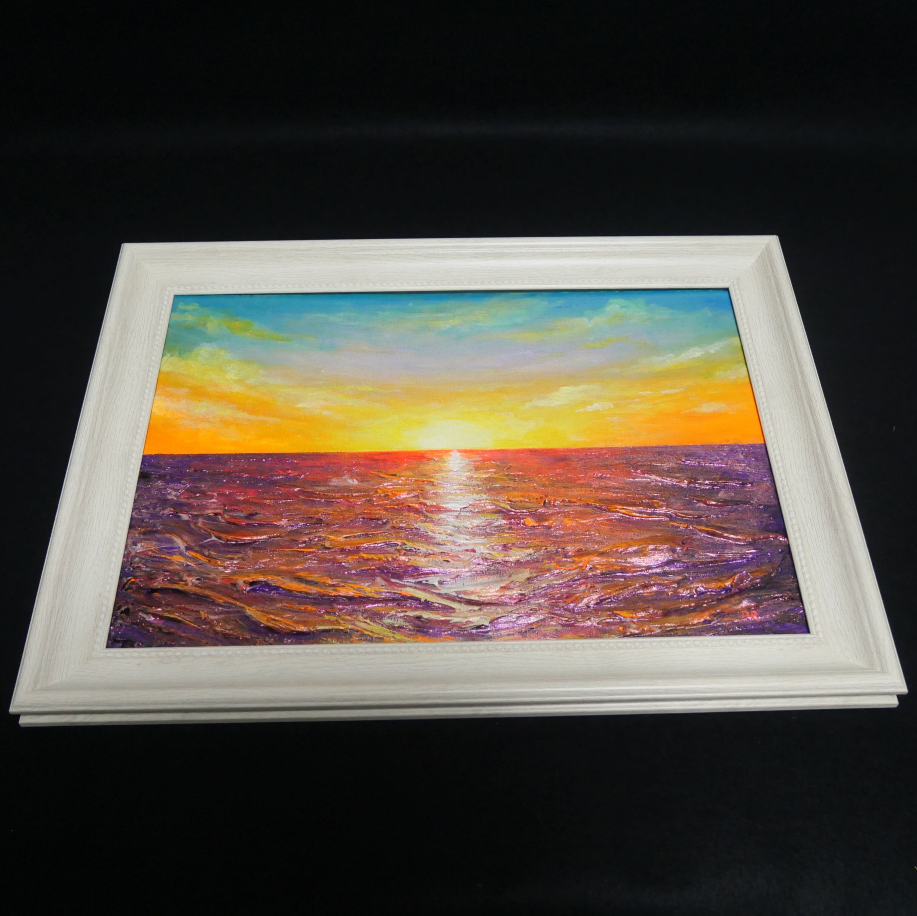 使用されている油絵の具は高品質な【ホルベイン】を使用しており、ジェルメディウムで波の感触を表現した特別な技法が光ります。「朝日に輝く海」は、あなたの空間に明るさと感動をもたらす、特別なアート作品です。