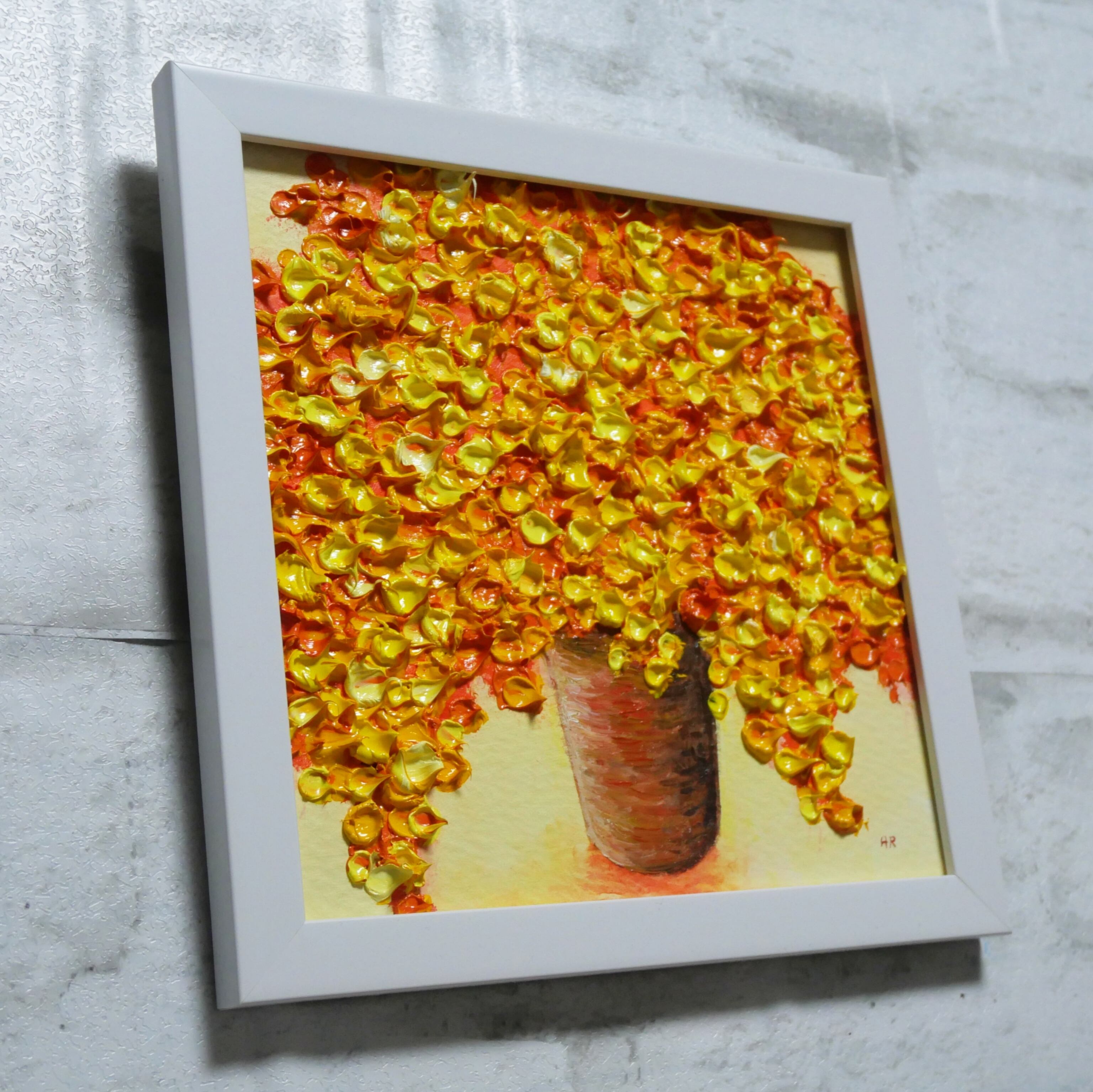 「ミモザ」は、陽射しを浴びて輝くミモザの花を描いた魅力的な油絵作品です。鮮やかな黄色のミモザは、春の息吹を感じさせ、見る人の心に温かみを与えます。この作品は、シンプルでありながら豊かな色彩が特徴で、あなたの生活空間に彩りと幸福感をもたらすことでしょう。
