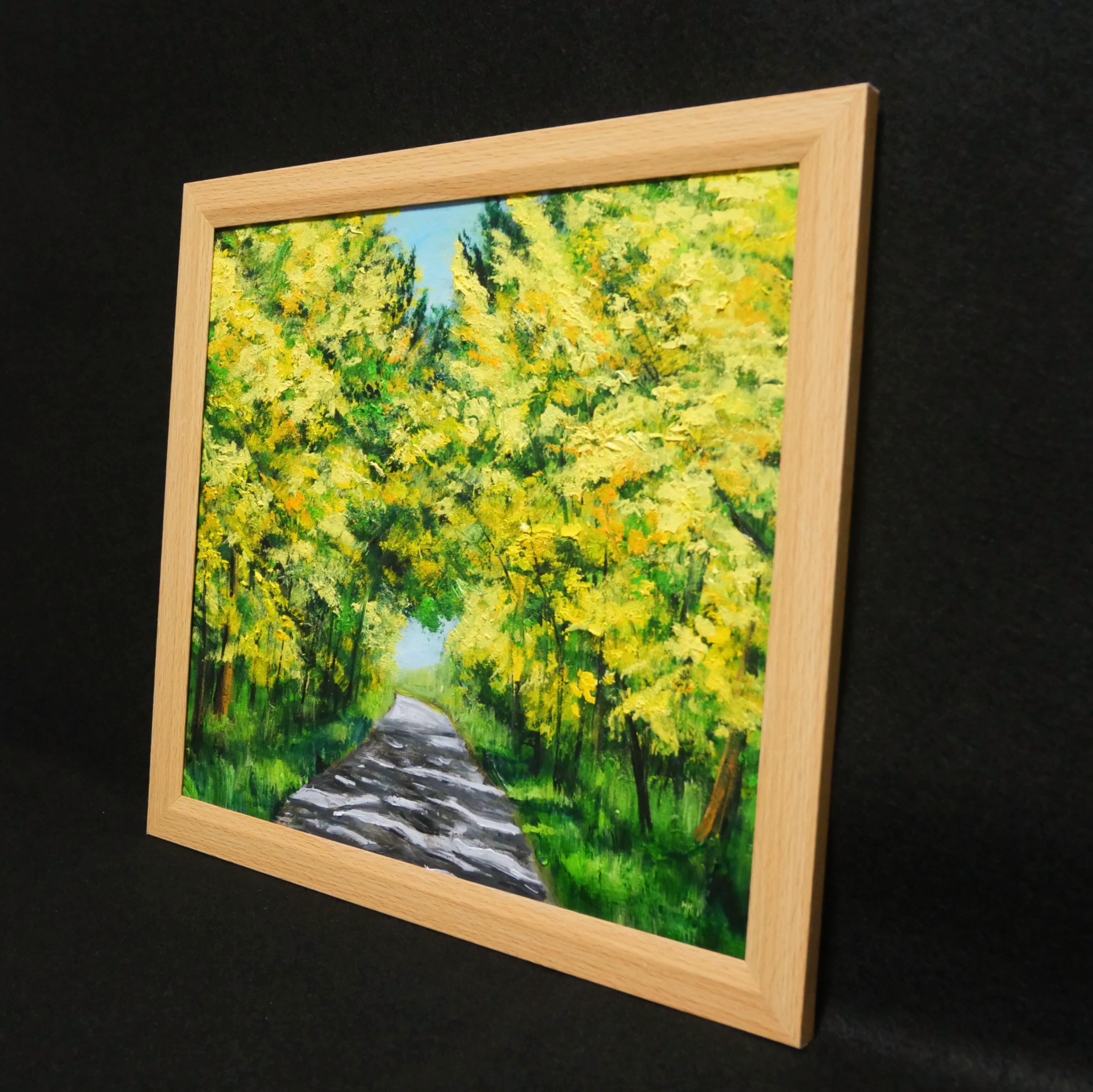 「ミモザのトンネル」は、優雅に咲くミモザの鮮やかな黄色の花と、その周囲に広がる道路と影を描いた美しい油絵作品です。この作品では、風にそよぐミモザと静かな道が織りなす穏やかな風景が、観る人に心の安らぎを届けます。柔らかな色合いが、あなたの生活空間に温かな明るさを添えてくれることでしょう。