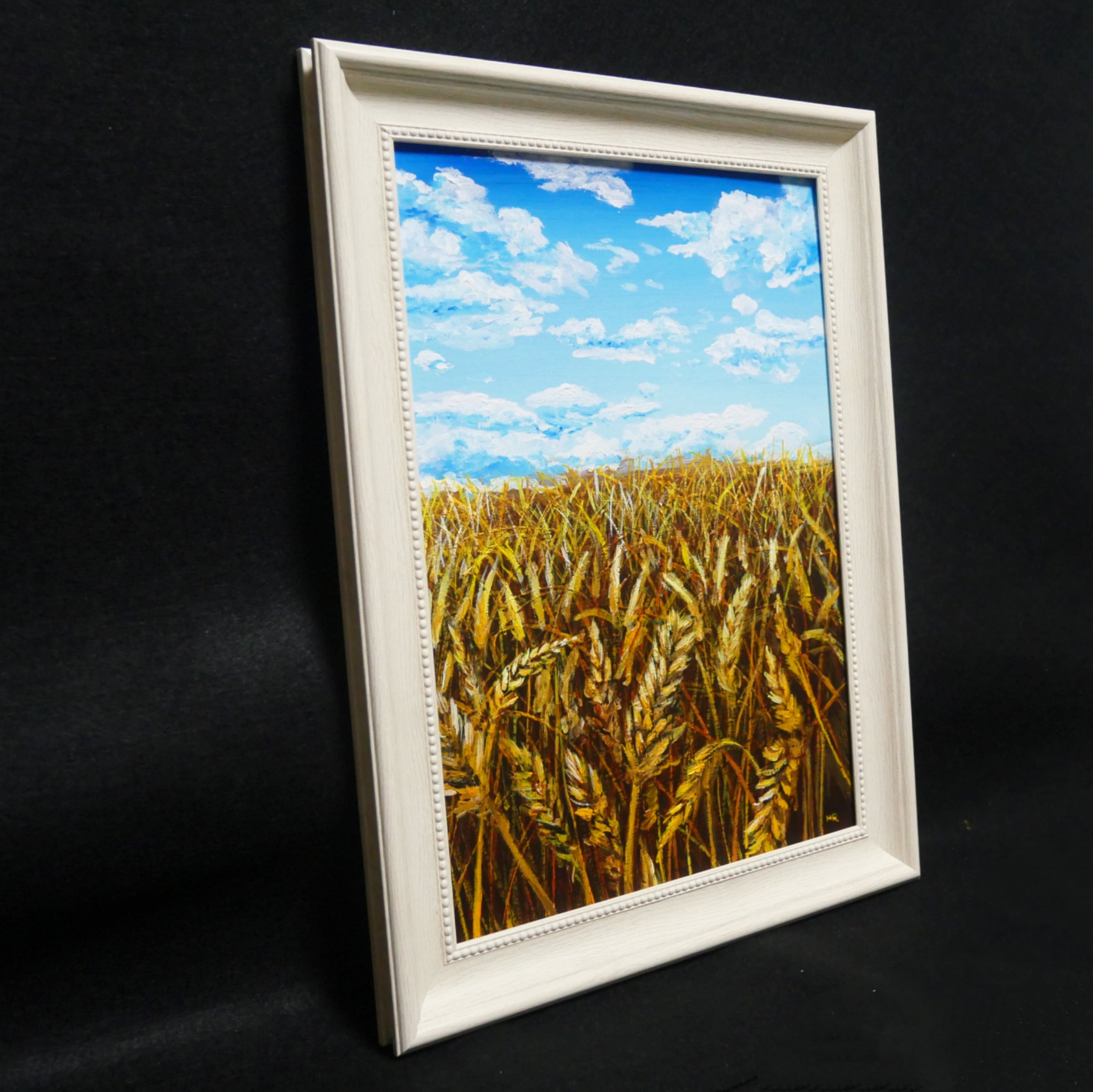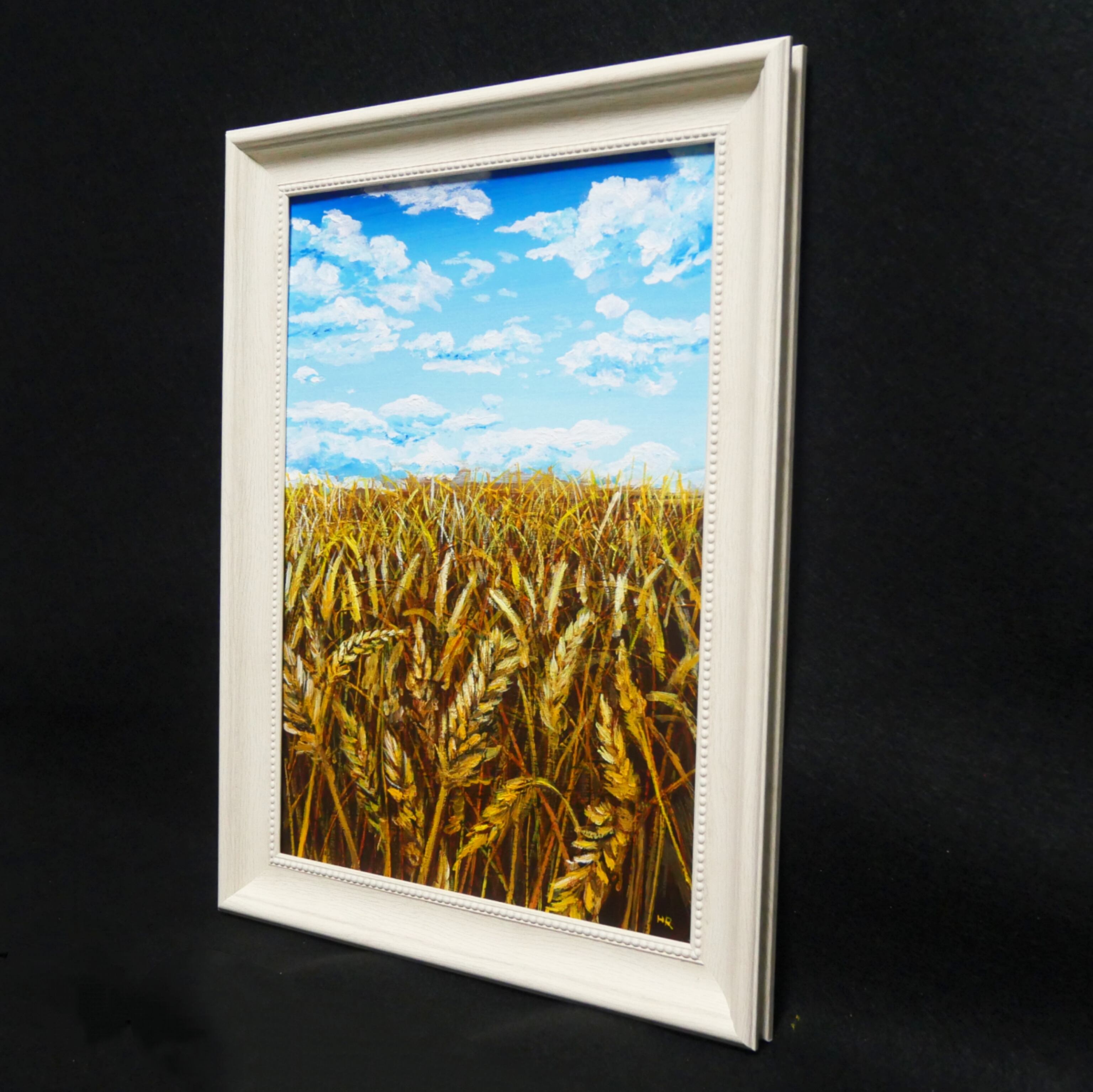 使用されている油絵の具は高品質な【ホルベイン】を用いており、特別な技法で空と雲、麦畑の魅力を最大限に表現しています。「空と雲の麦畑」は、あなたの心に自然の美しさを届ける特別な一品です。