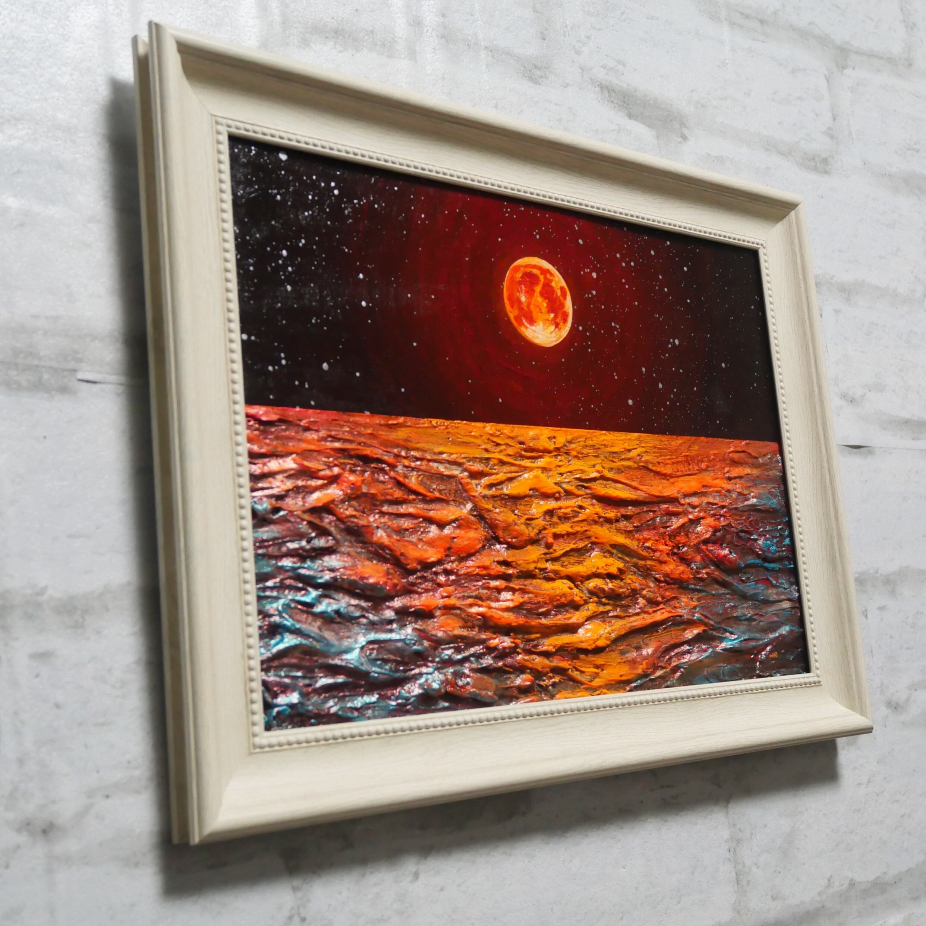 「オレンジ色の満月と輝く海」は、赤黒色の夜空に浮かぶ銀色の星々と、幻想的なオレンジ色の満月が織りなす美しい風景を描いた油絵作品です。このアートは、月光が海を照らし、その反射によってもたらされる輝きが、観る人に深い感動を与えます。満月の明かりが道となって海に広がり、特別な夜の情景を演出します。