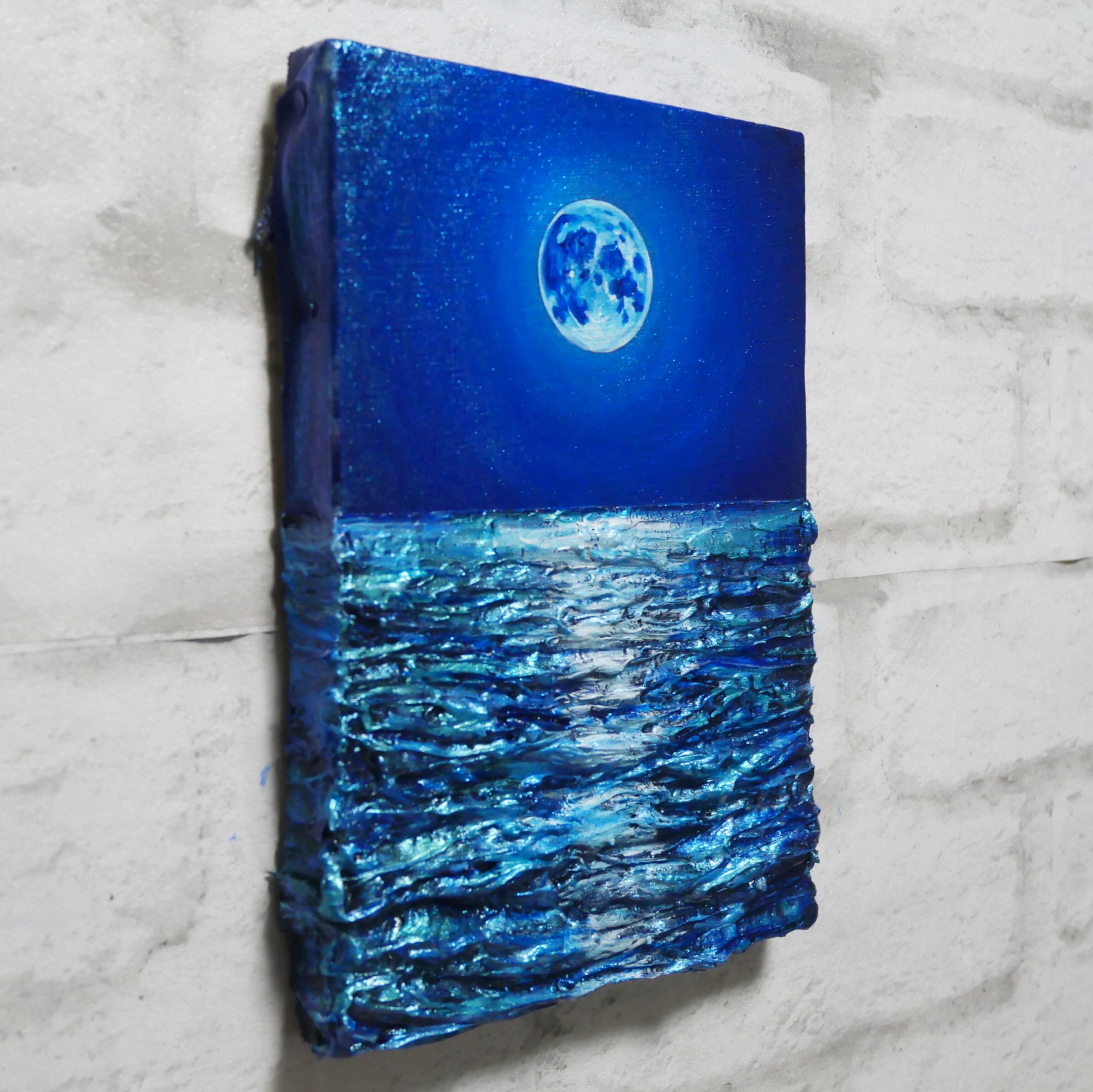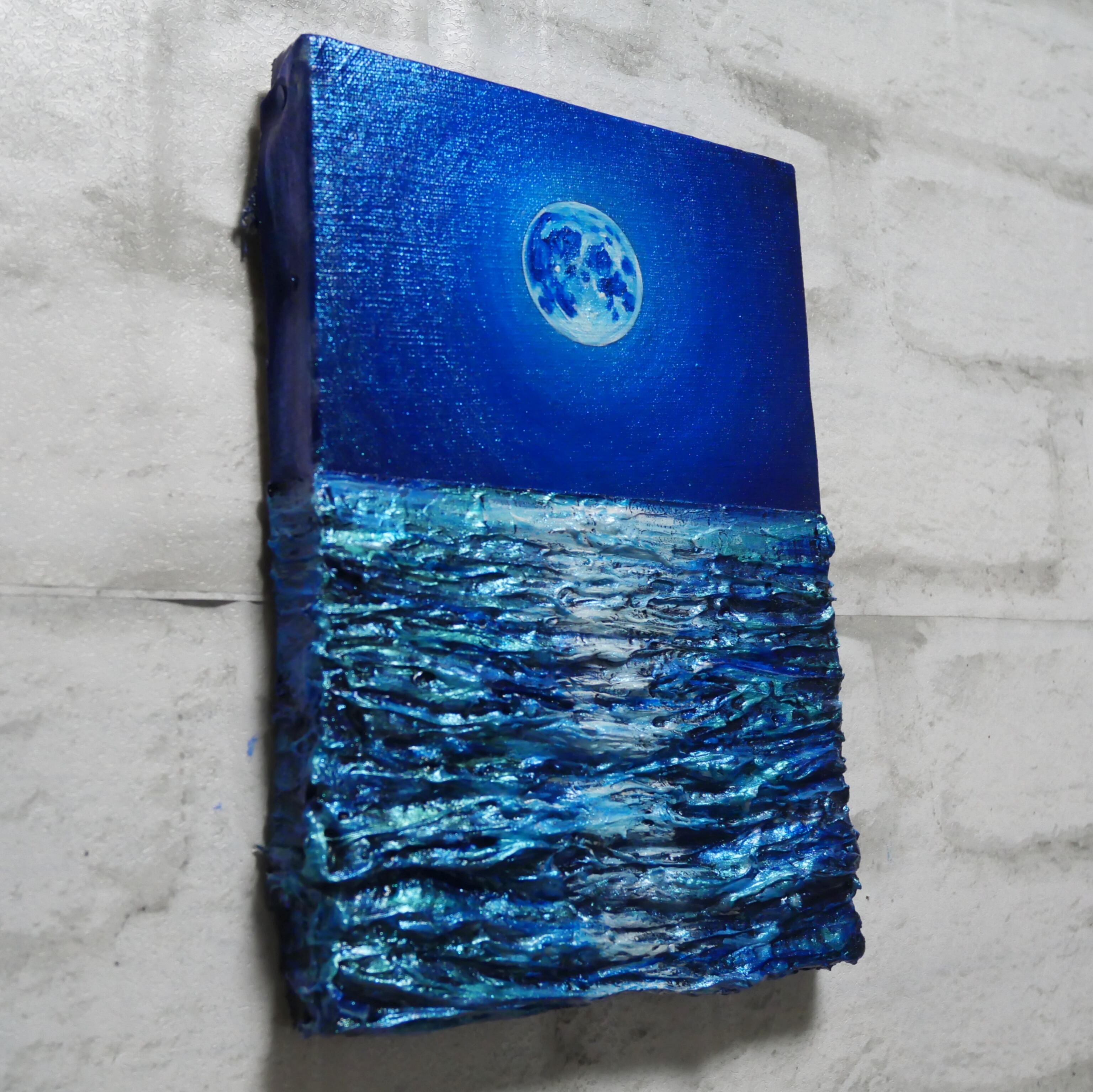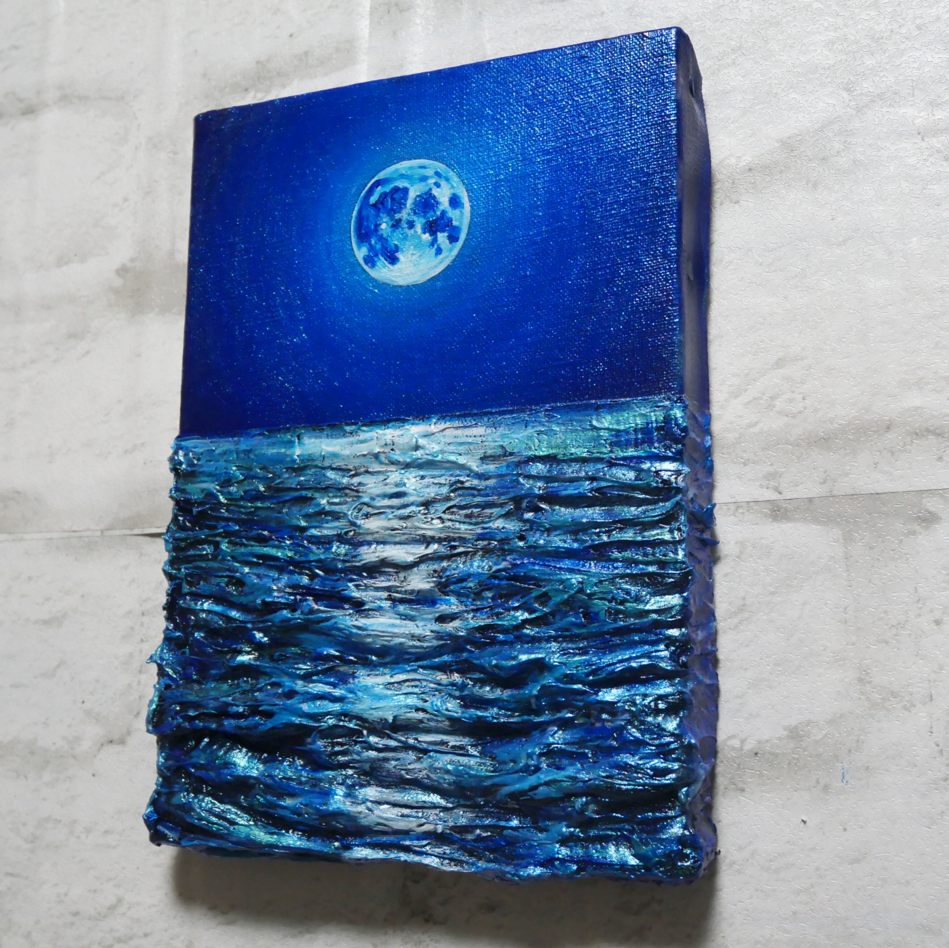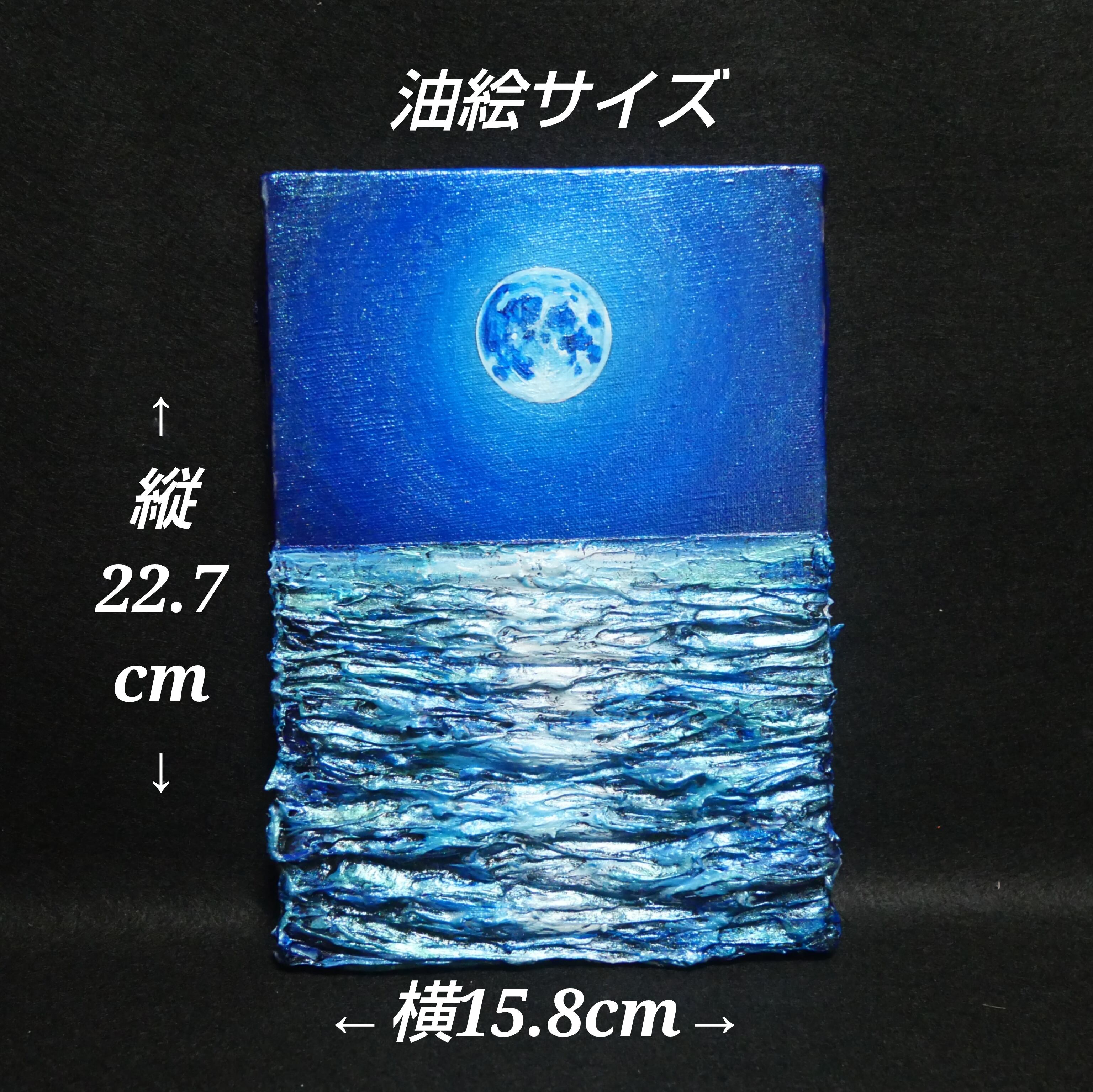 使用されている素材には、ホルベインの油絵の具をはじめ、高級クロマパールブルーとジェルメディウム・ヘビーボディが用いられており、波の動きや月明かりの輝きが見事に表現されています。この作品は、あなたの日常に長く楽しんでいただける特別なアートとして、心に響くことでしょう。