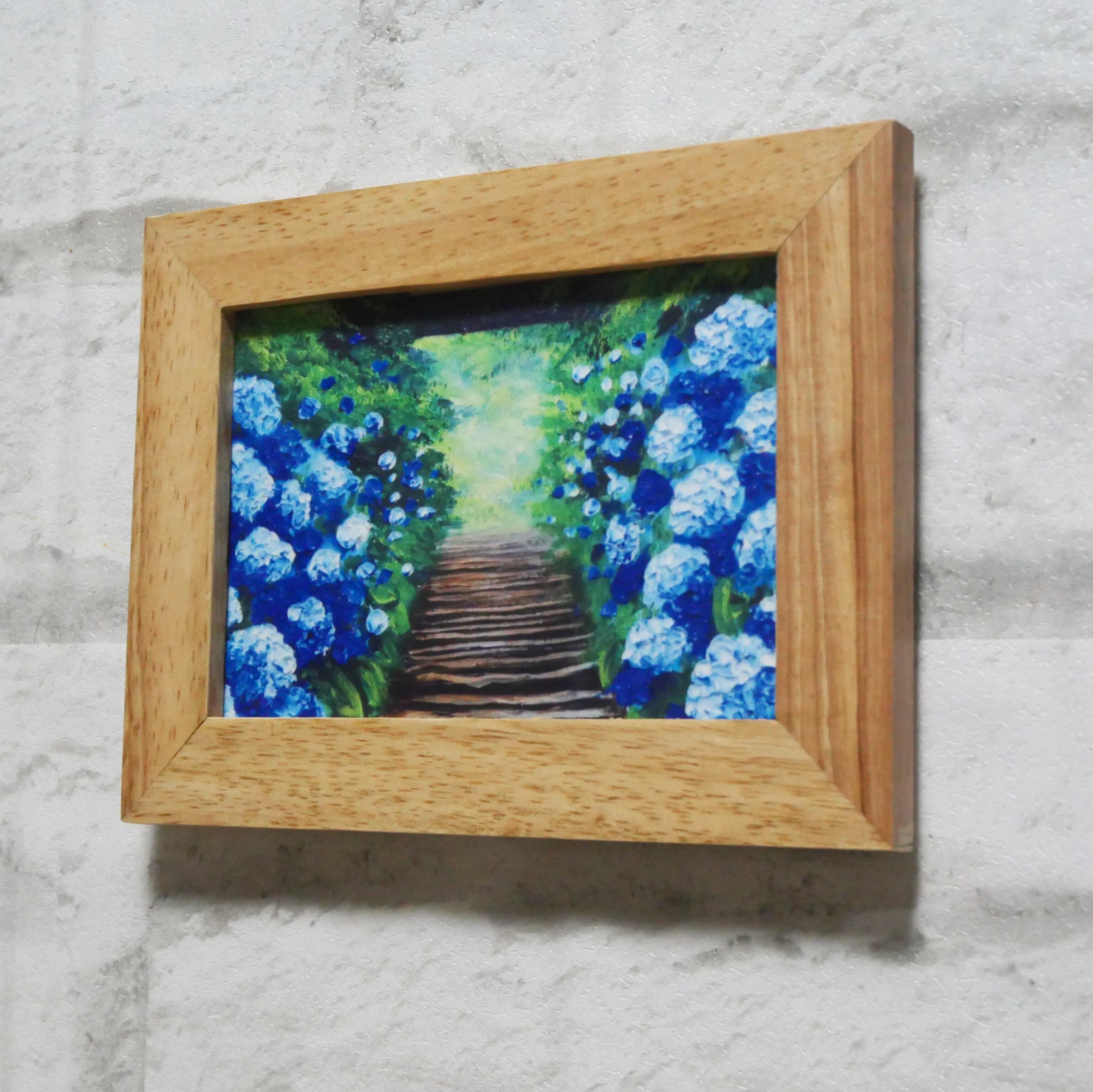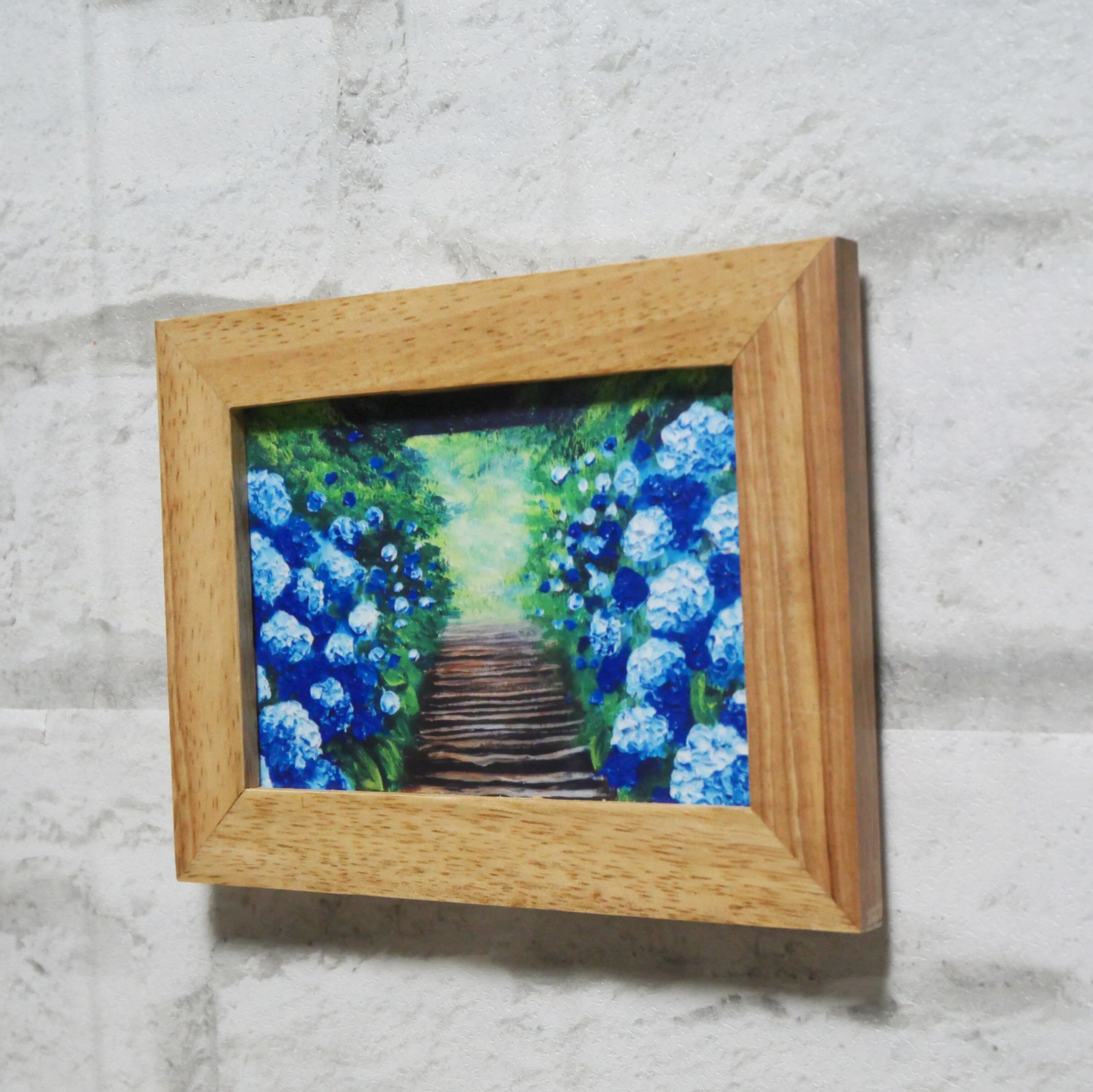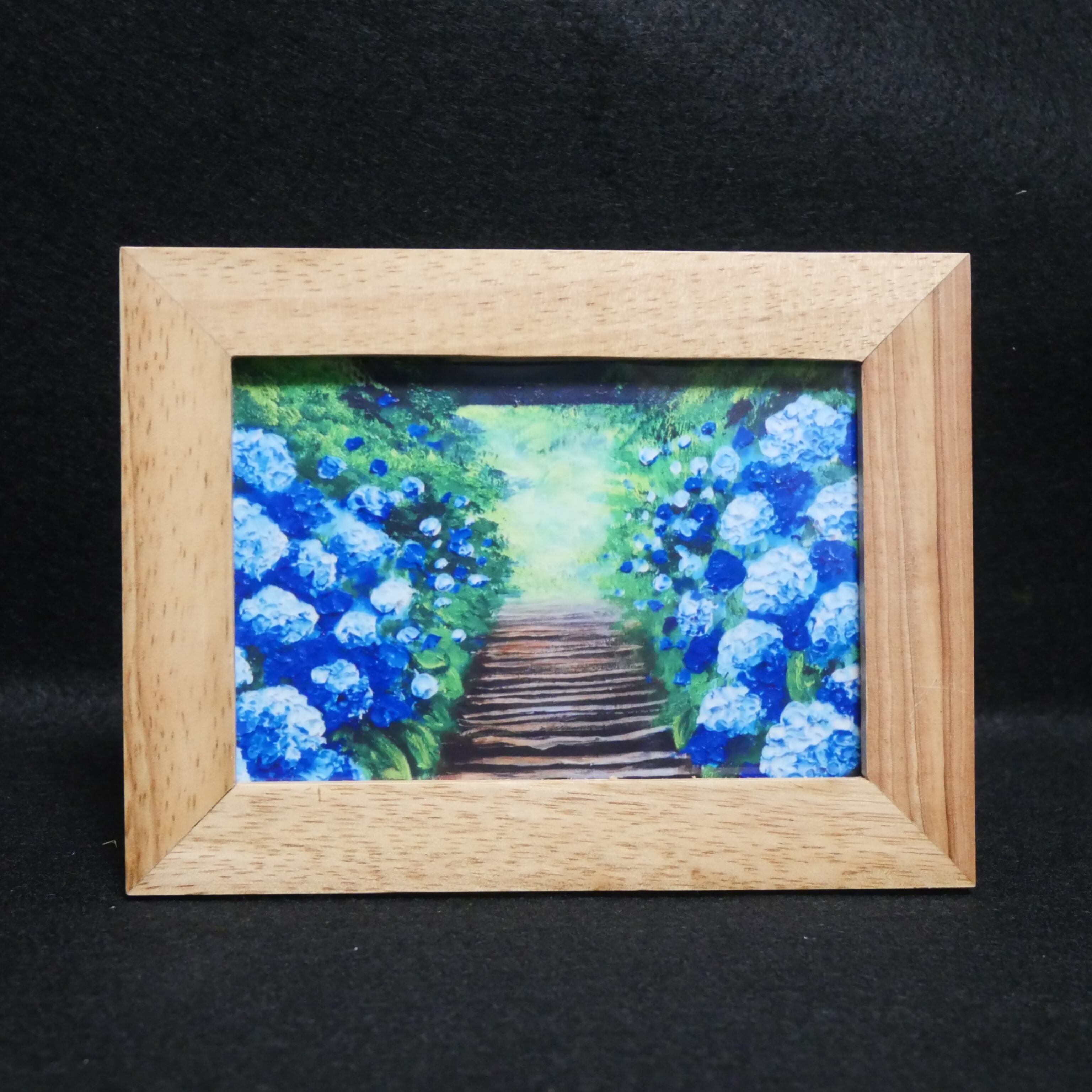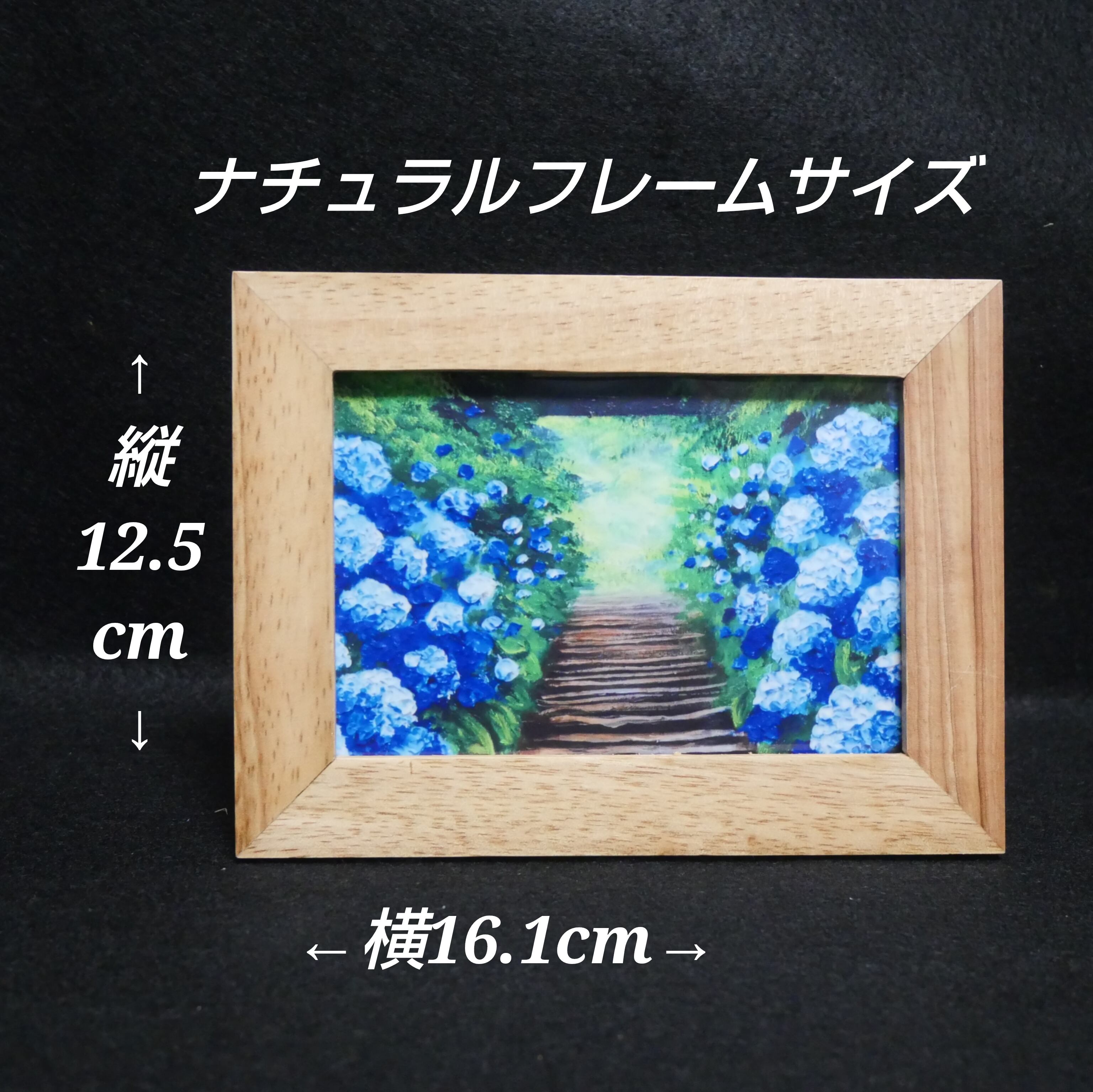 このポスターカードのサイズは縦89mm × 横127mmで、ナチュラルフレームサイズは縦12.5cm × 横16.1cmです。壁掛けや立て掛けのスタイルで、お好みに合わせて楽しむことができ、どの空間にもふさわしい魅力的なアートです。「紫陽花寺」は、リビングや書斎、寝室など多くの場所で鮮やかな風景を彩ります。