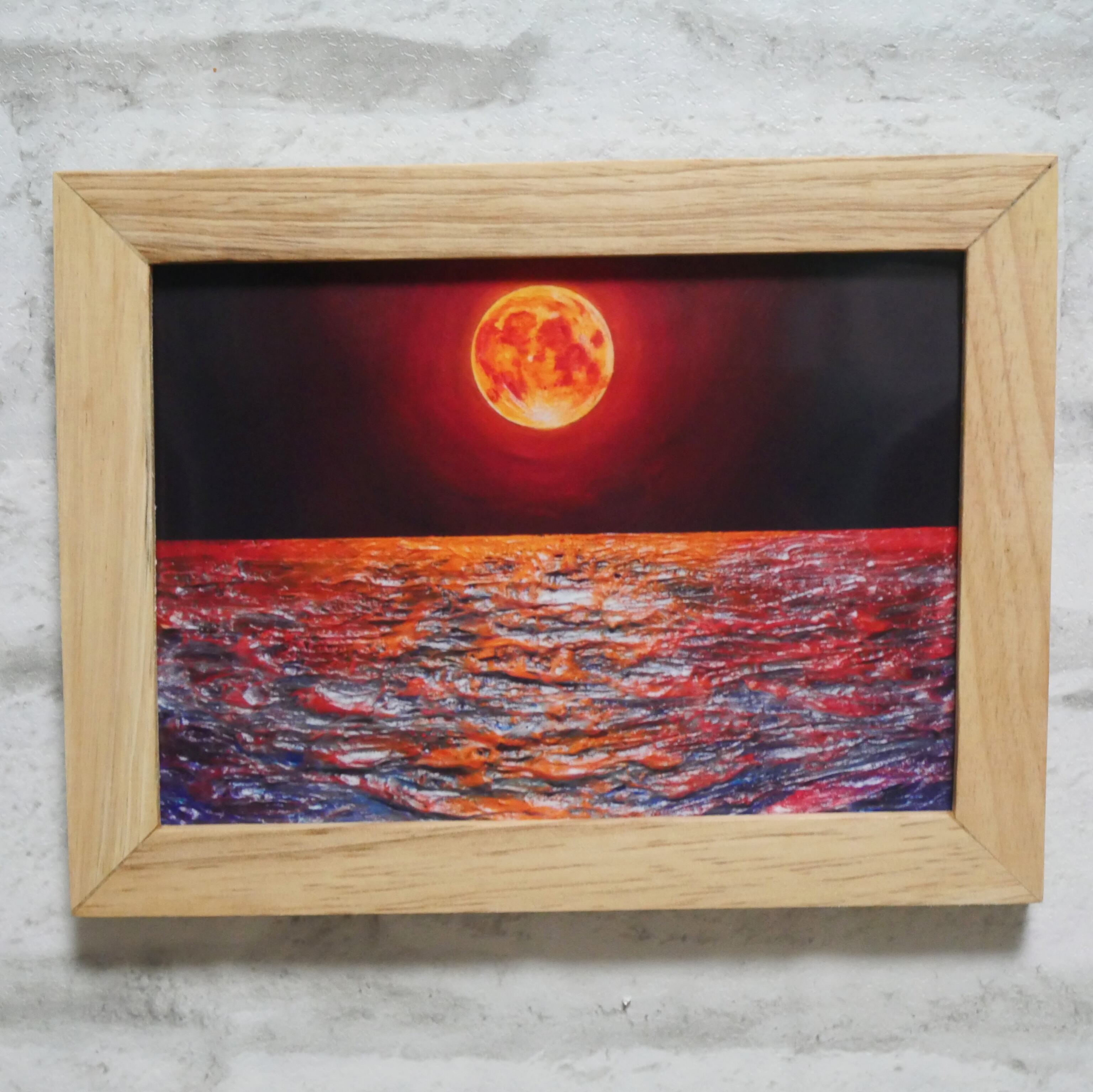 「オレンジの満月」は、赤黒色の夜空に煌めくオレンジ色の満月と、その下で美しく光るオレンジ、赤、紫、青の海を描いた魅力的なポスターカードです。このアートは、色彩の豊かさと神秘的な夜の雰囲気が調和し、観る人に心の安らぎと感動をもたらします。夜空と海との見事なコントラストが、あなたの生活空間に特別な彩りを加えてくれることでしょう。
