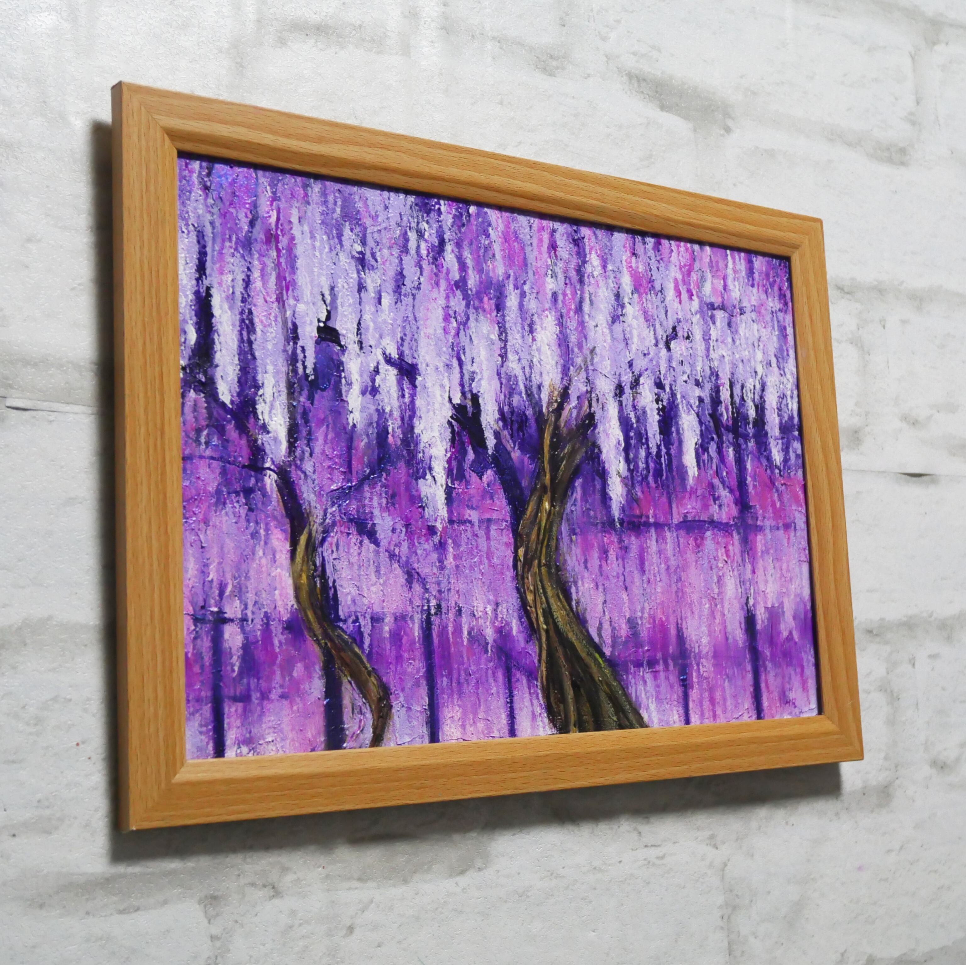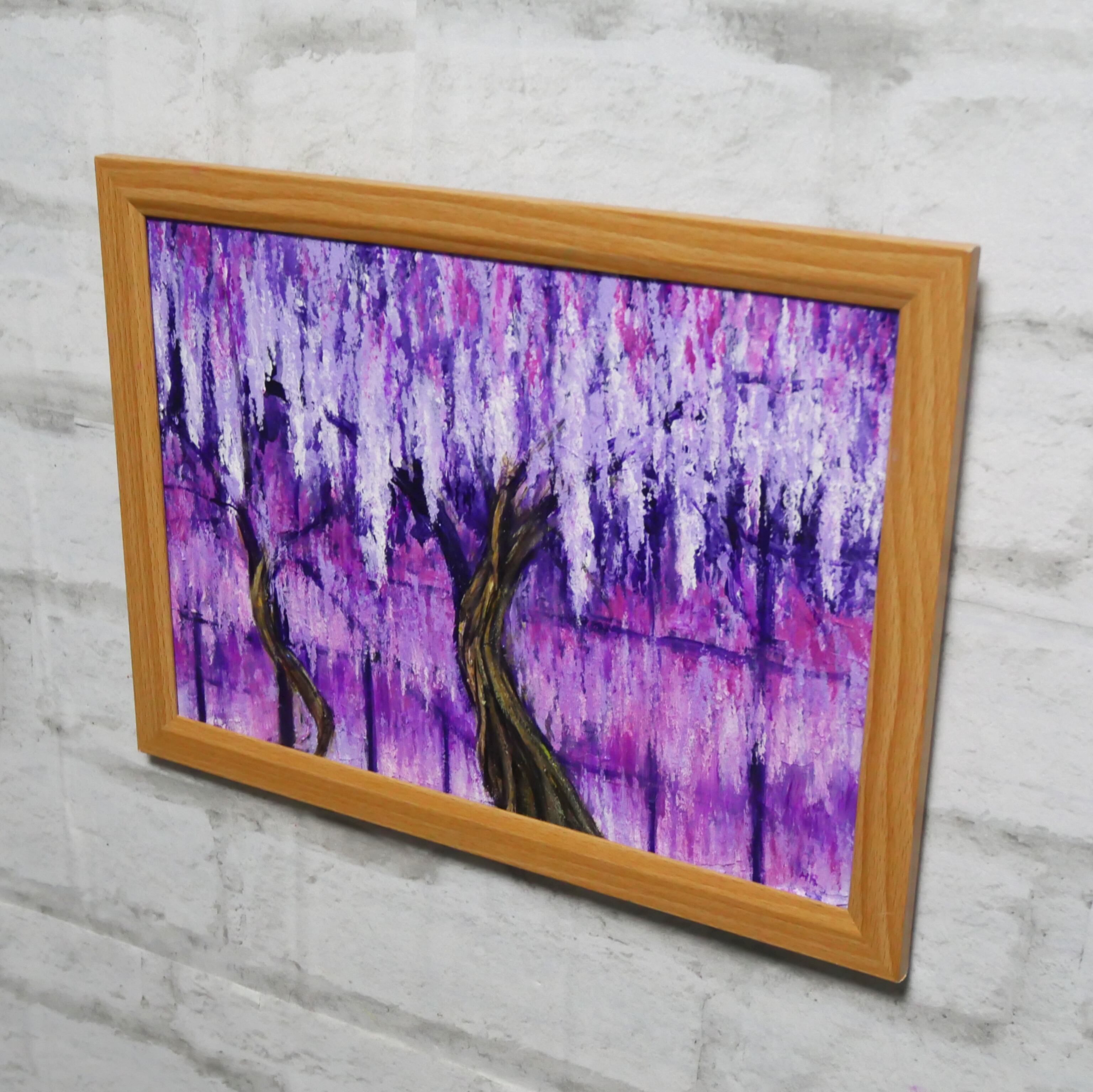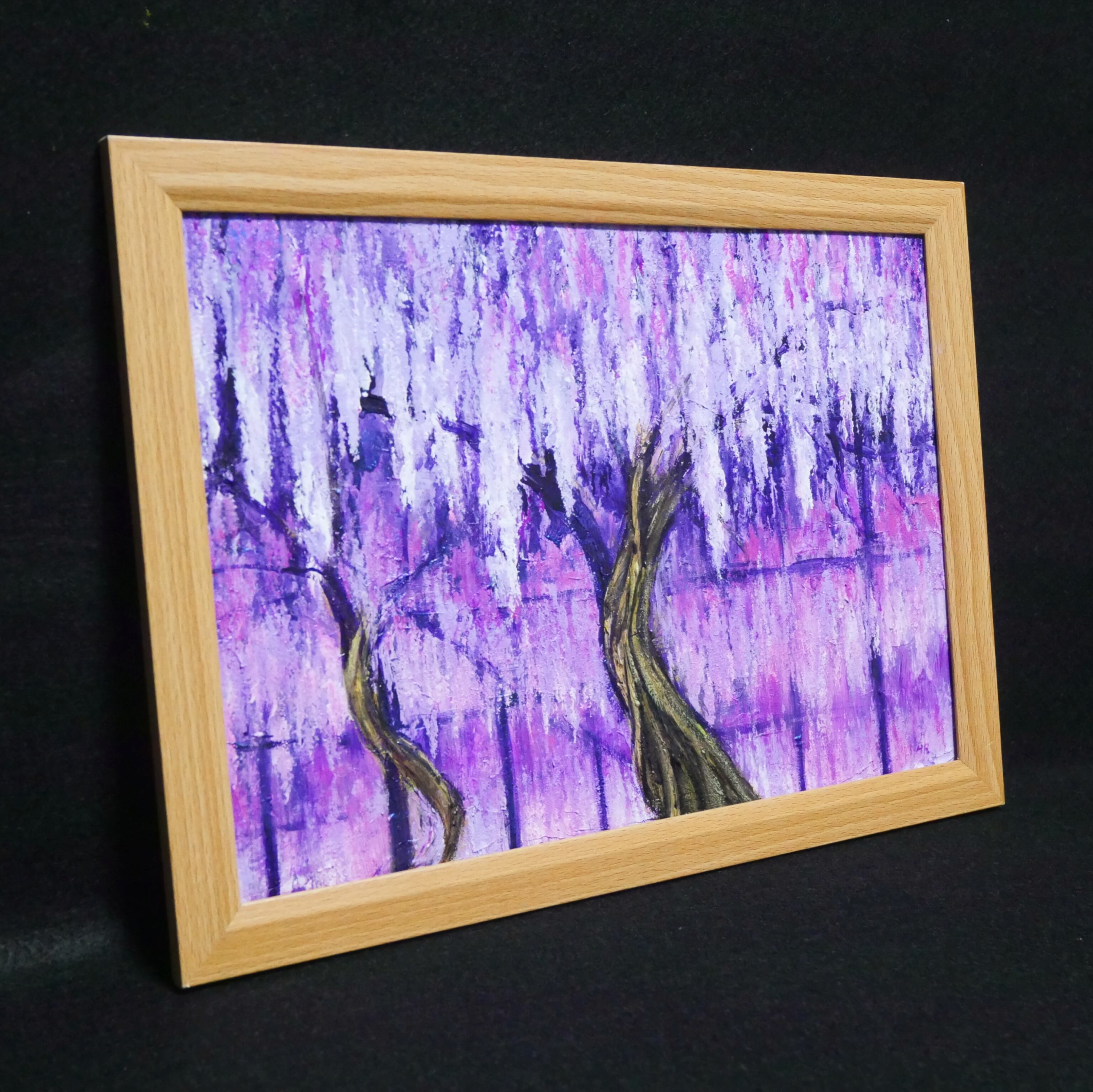 「フジ」は、優雅に垂れ下がる紫色の藤の花々を描いた、美しい油絵作品です。この作品は、藤の花の繊細さとその周囲の自然が調和し、観る人に心の安らぎと穏やかなひとときをもたらします。豊かな紫色が、あなたの生活空間に特別な華やかさと格調を加えてくれることでしょう。
