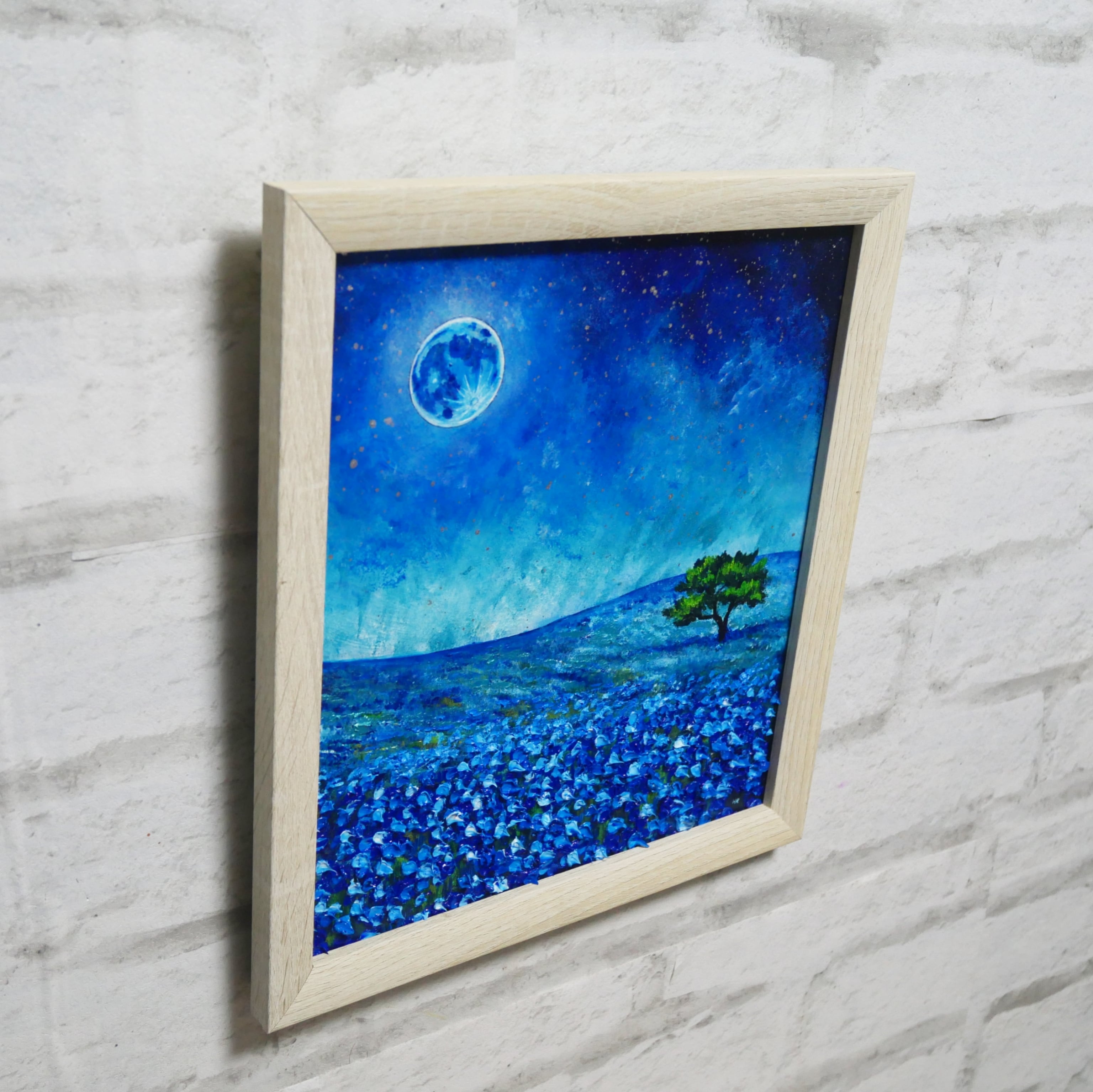 「ネモフィラと青い満月と星空」は、深い青い夜空に輝く銀色の星々と、左上に浮かぶ青い満月、そして下には美しい青いネモフィラ畑が広がる魅力的な油絵作品です。このアートは、幻想的な星空と自然の風景が織りなす心の安らぎを表現し、観る人に癒しを与えることでしょう。小さな一本木が右下に描かれ、この作品にさらなる深みを加えています。