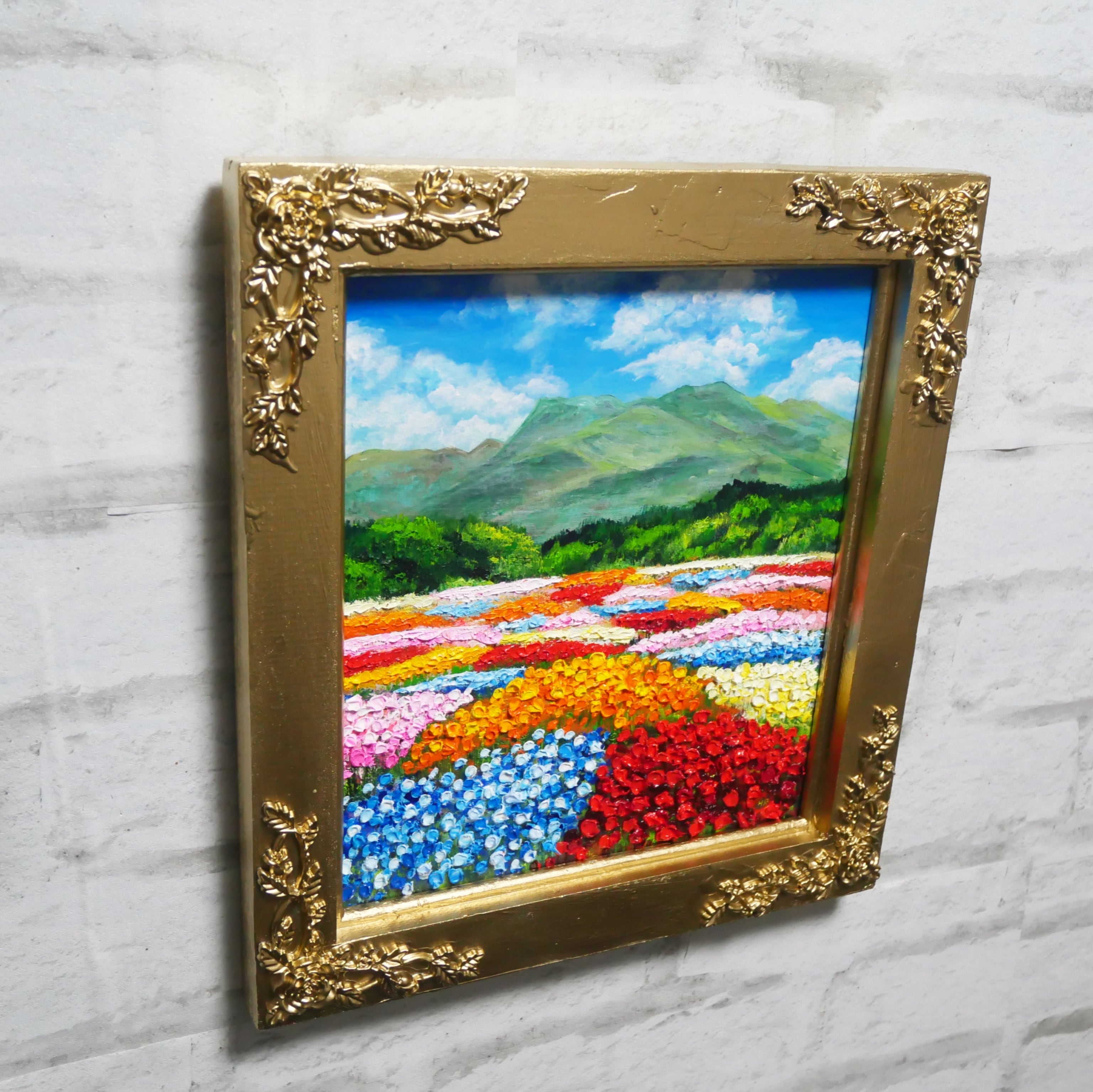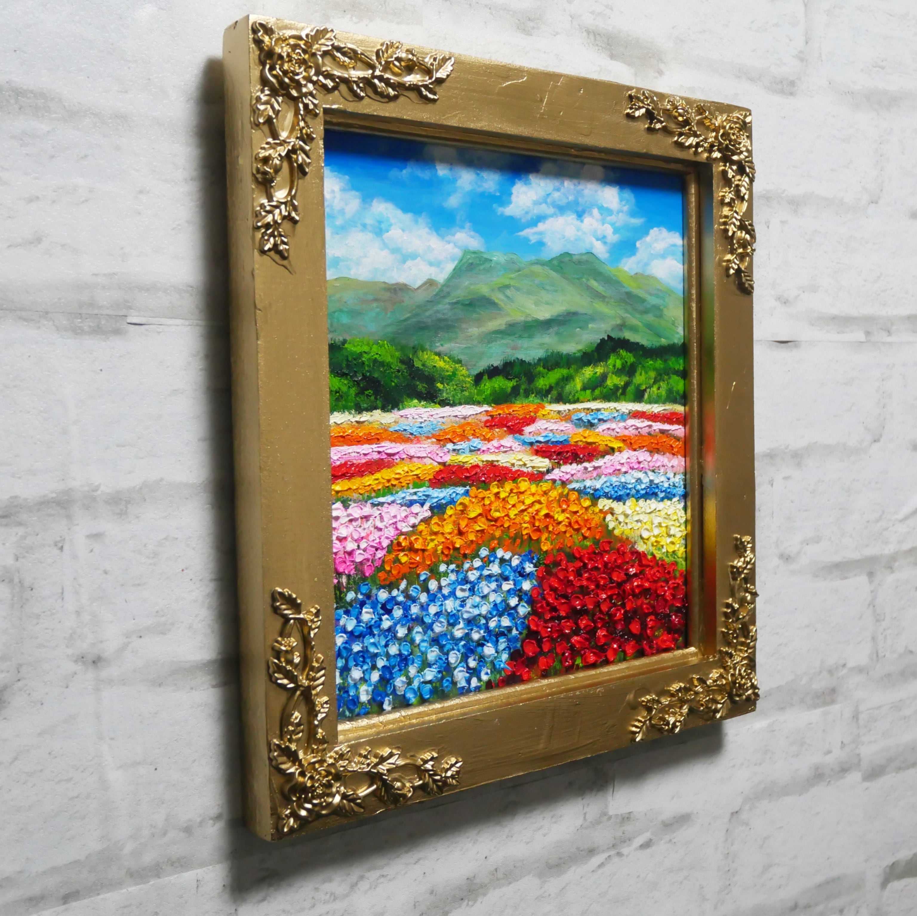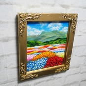 この油絵のサイズは横242mm × 縦272mmで、壁掛け用の金具が付属していますので、リビングや寝室に手軽に飾ることができ、「花畑」は日常の中で美しいアートとして存在感を発揮します。金色額縁には4箇所の薔薇模様が施されており、作品に華やかなアクセントを加えています。