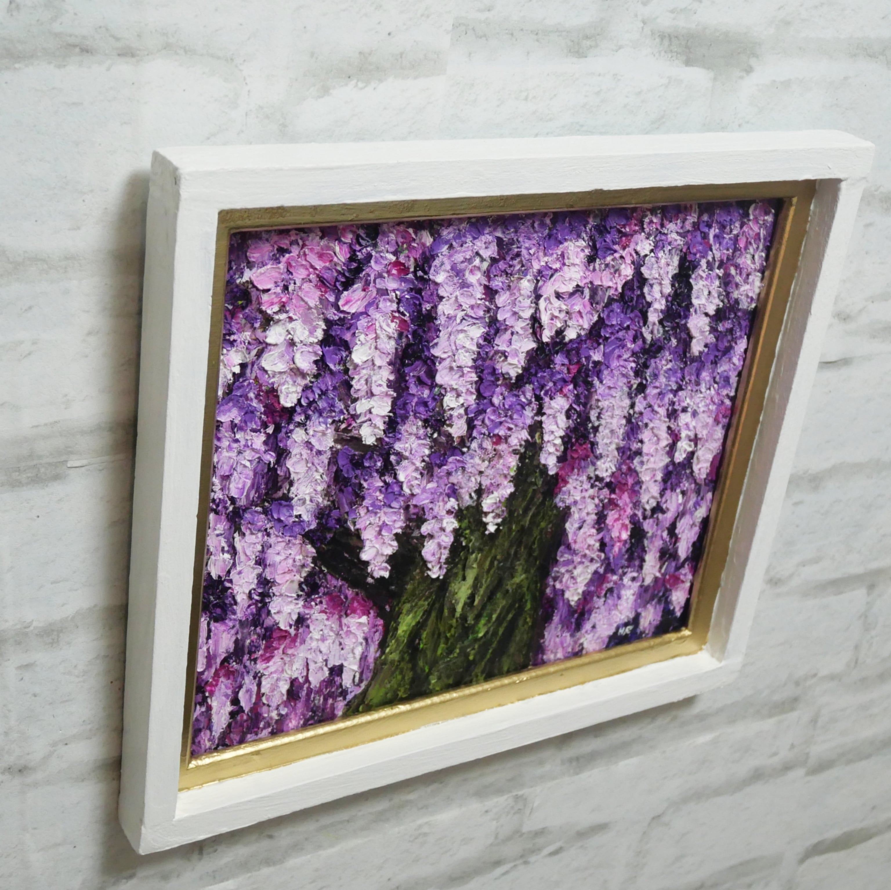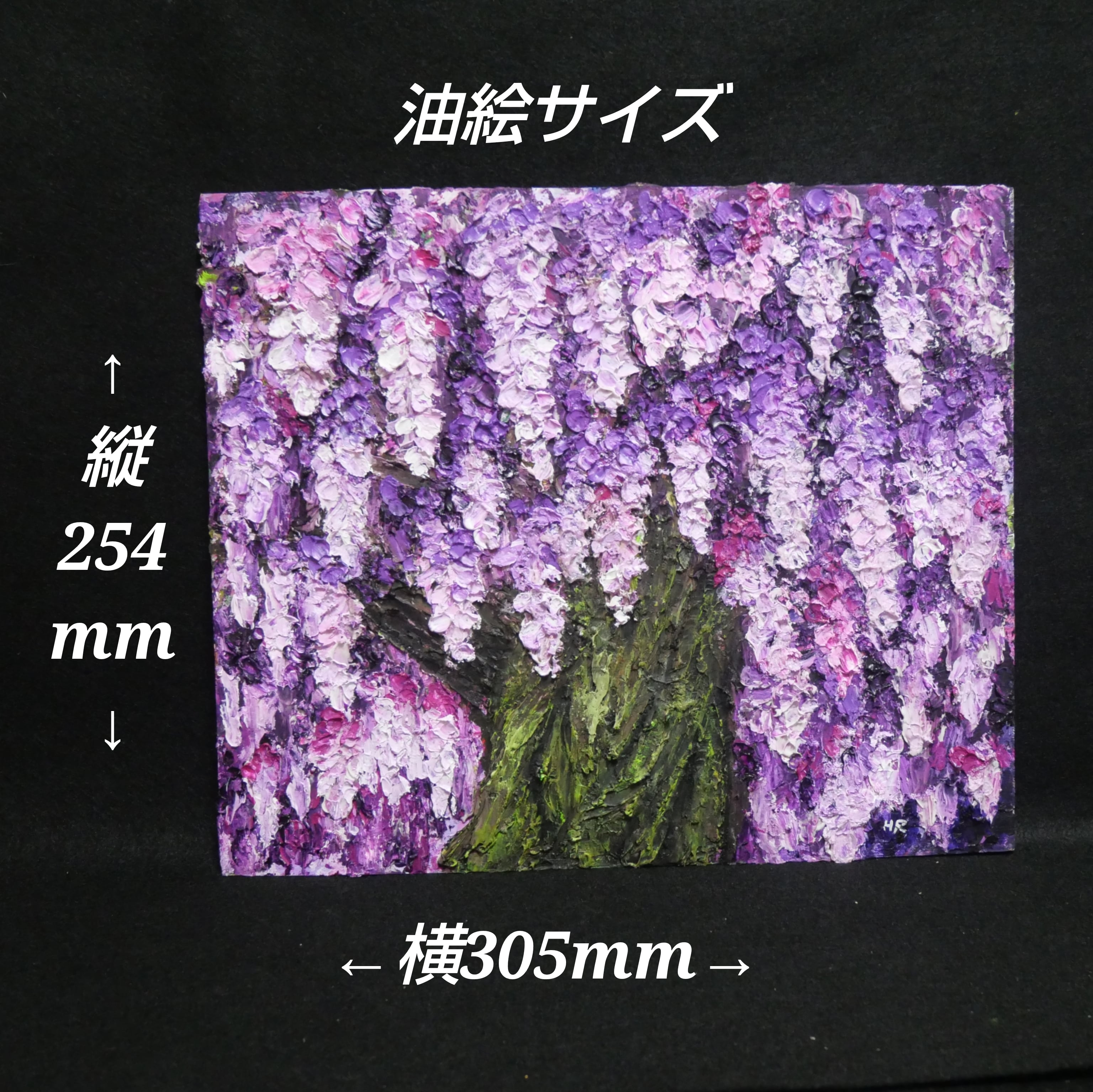 この油絵のサイズは横305mm × 縦254mmで、壁掛け用の金具も付属していますので、お好きな場所に手軽に飾ることが可能です。「藤」は、日常の中で特別な瞬間を演出し、豊かな自然の息吹を届けるアートとして自信を持ってお勧めいたします。