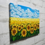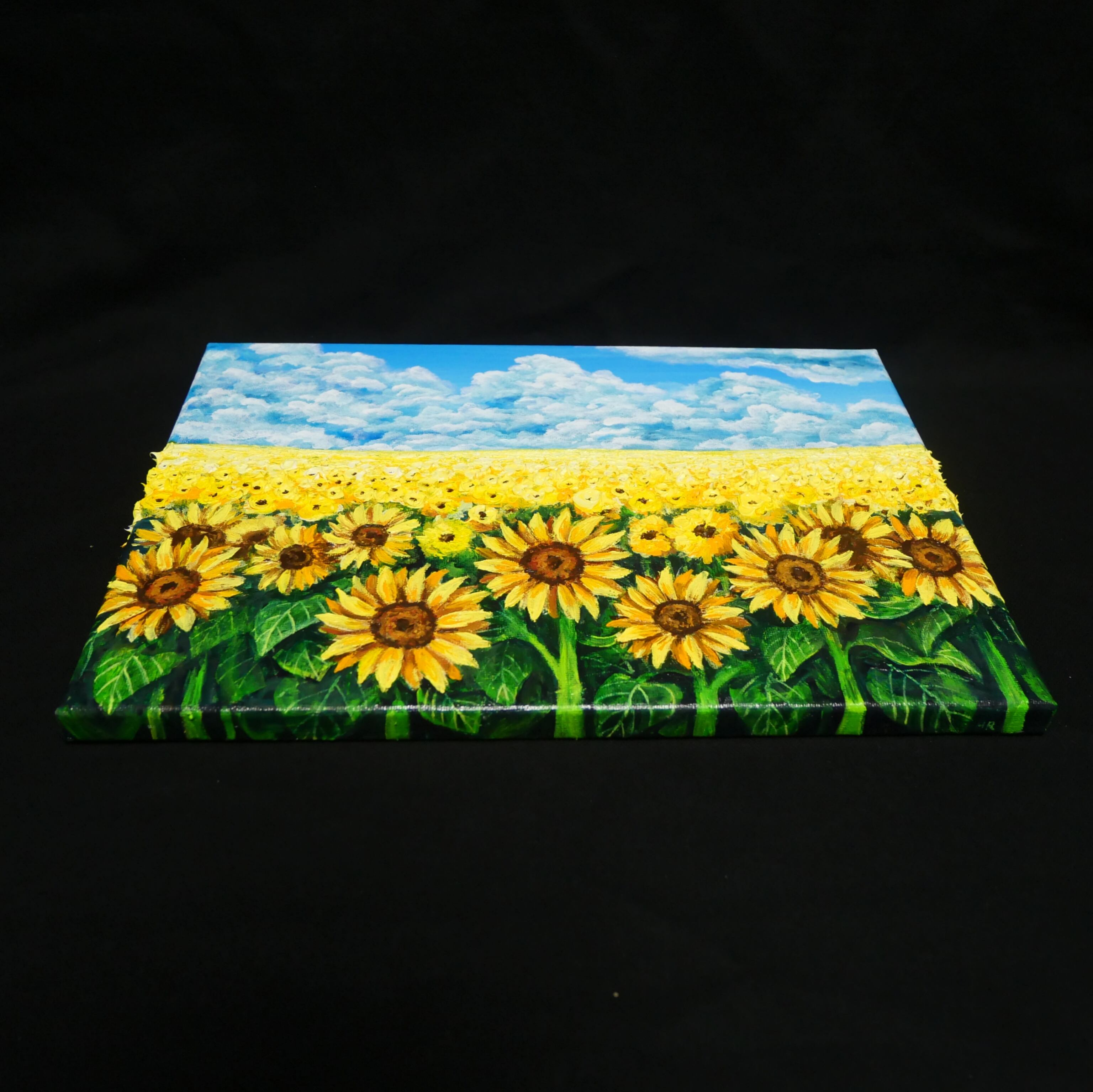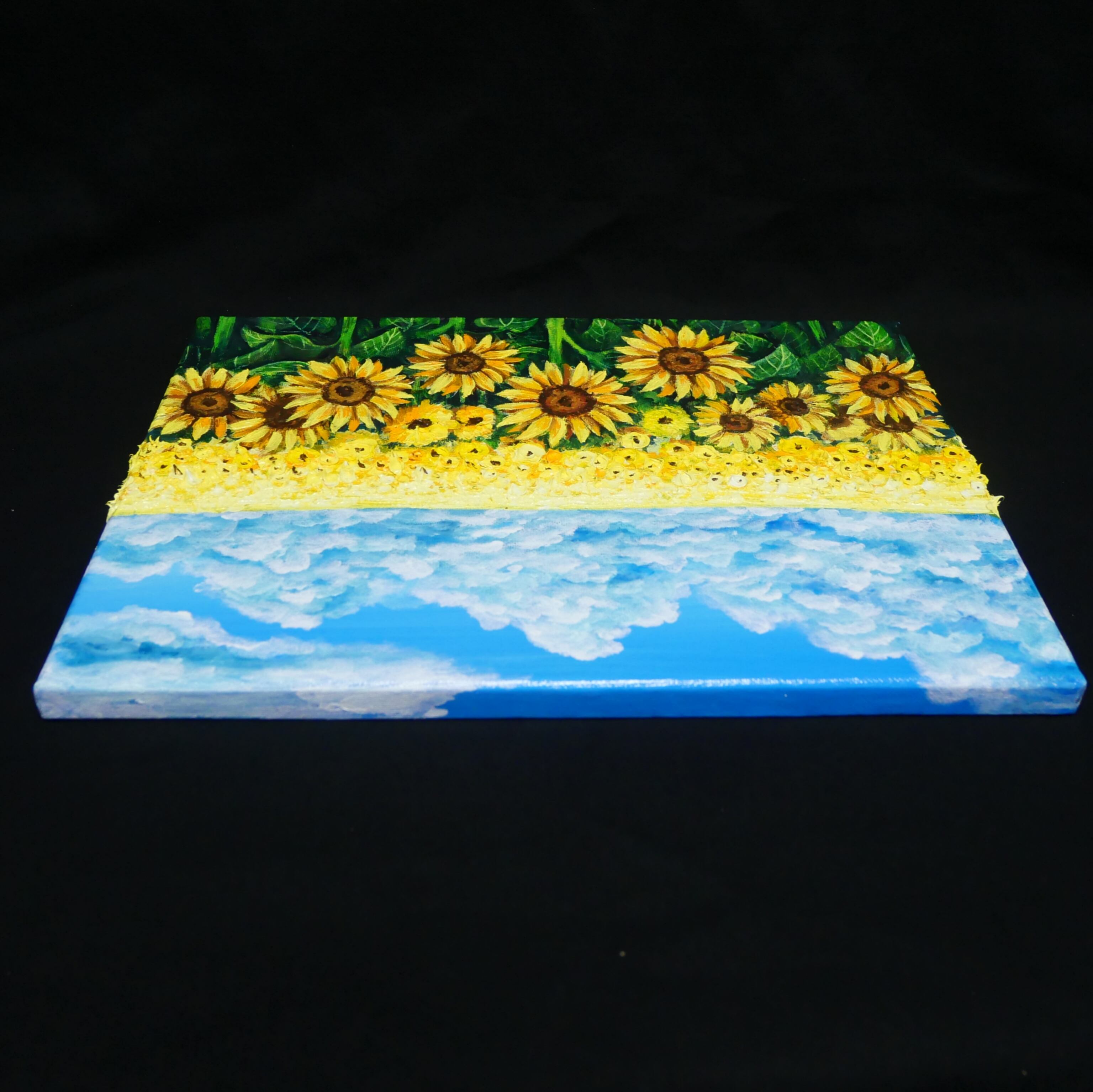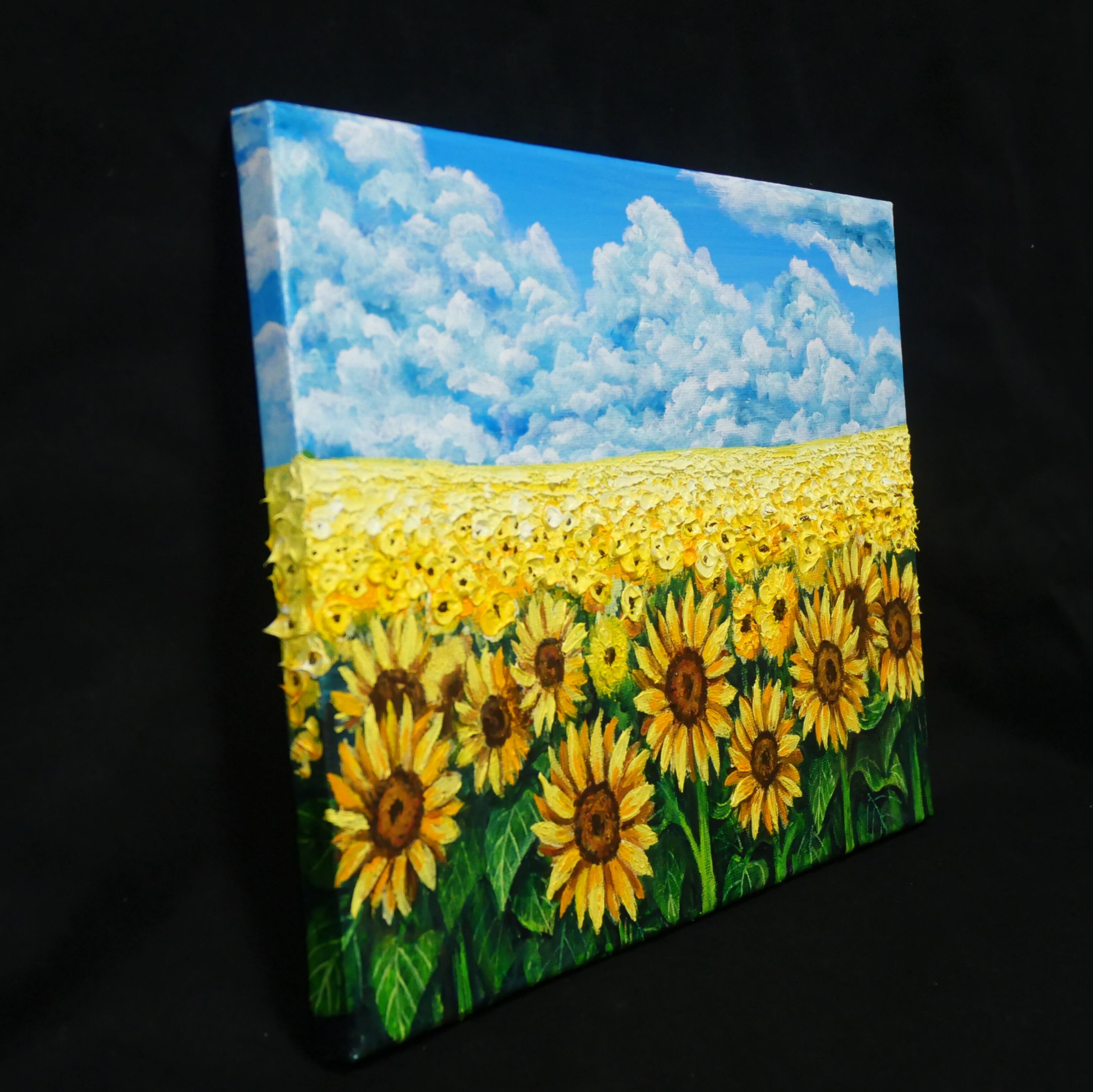 「夏の向日葵畑」は、晴れ渡る青空と豊かな夏雲のもと、色鮮やかなひまわり畑を描いた特別な油絵作品です。情熱的なひまわりの姿が、観る者に夏の活力と温もりを届けてくれることでしょう。この作品は、真夏の季節にぴったりなインテリアとして、あなたの空間を華やかに彩ります。