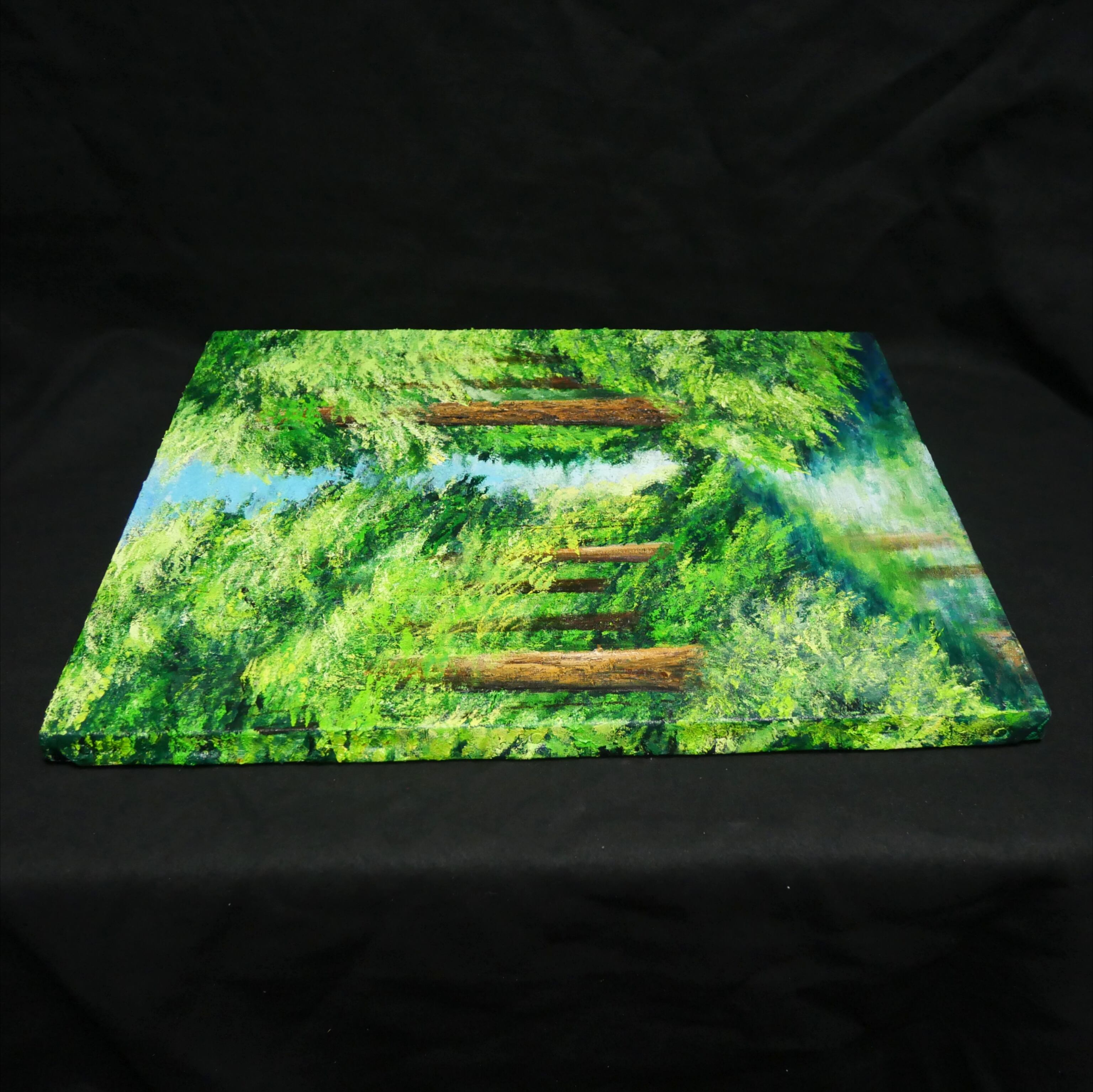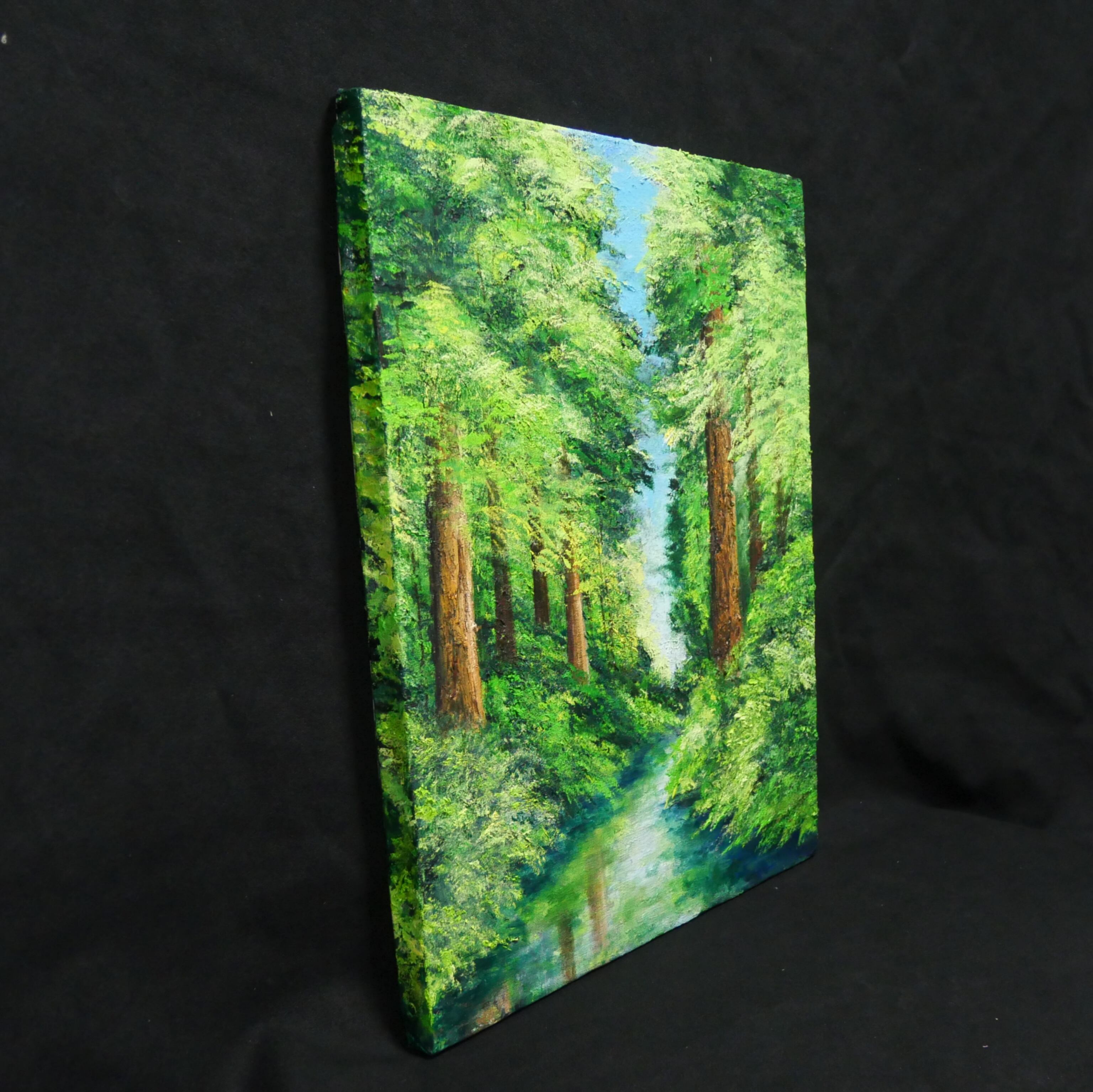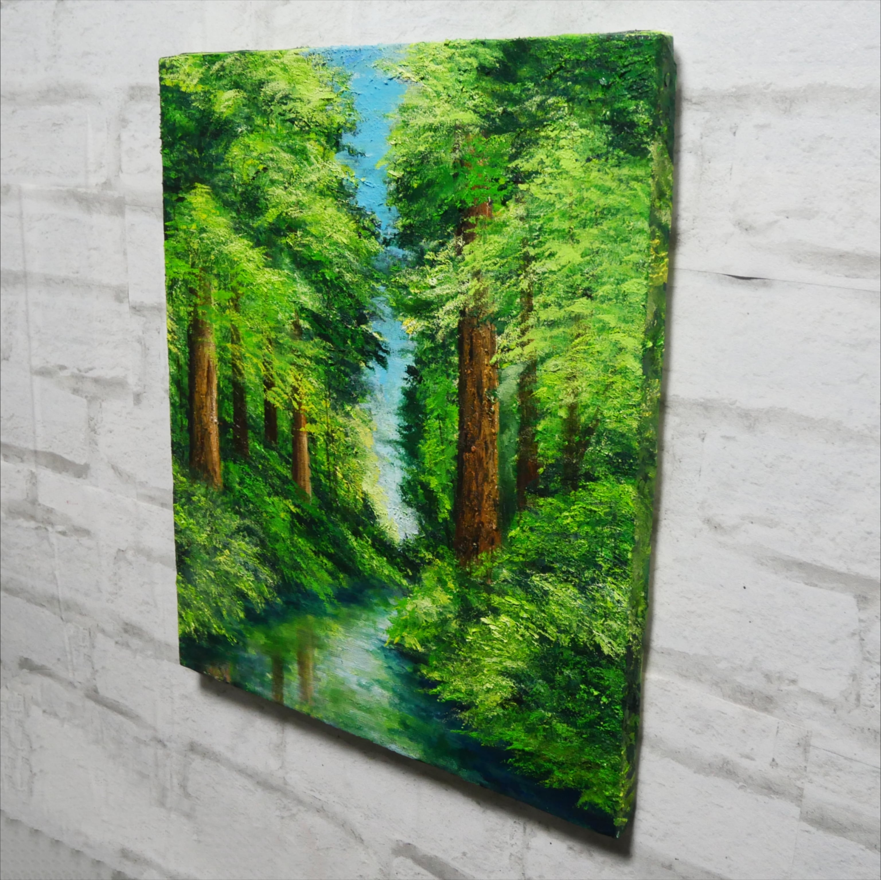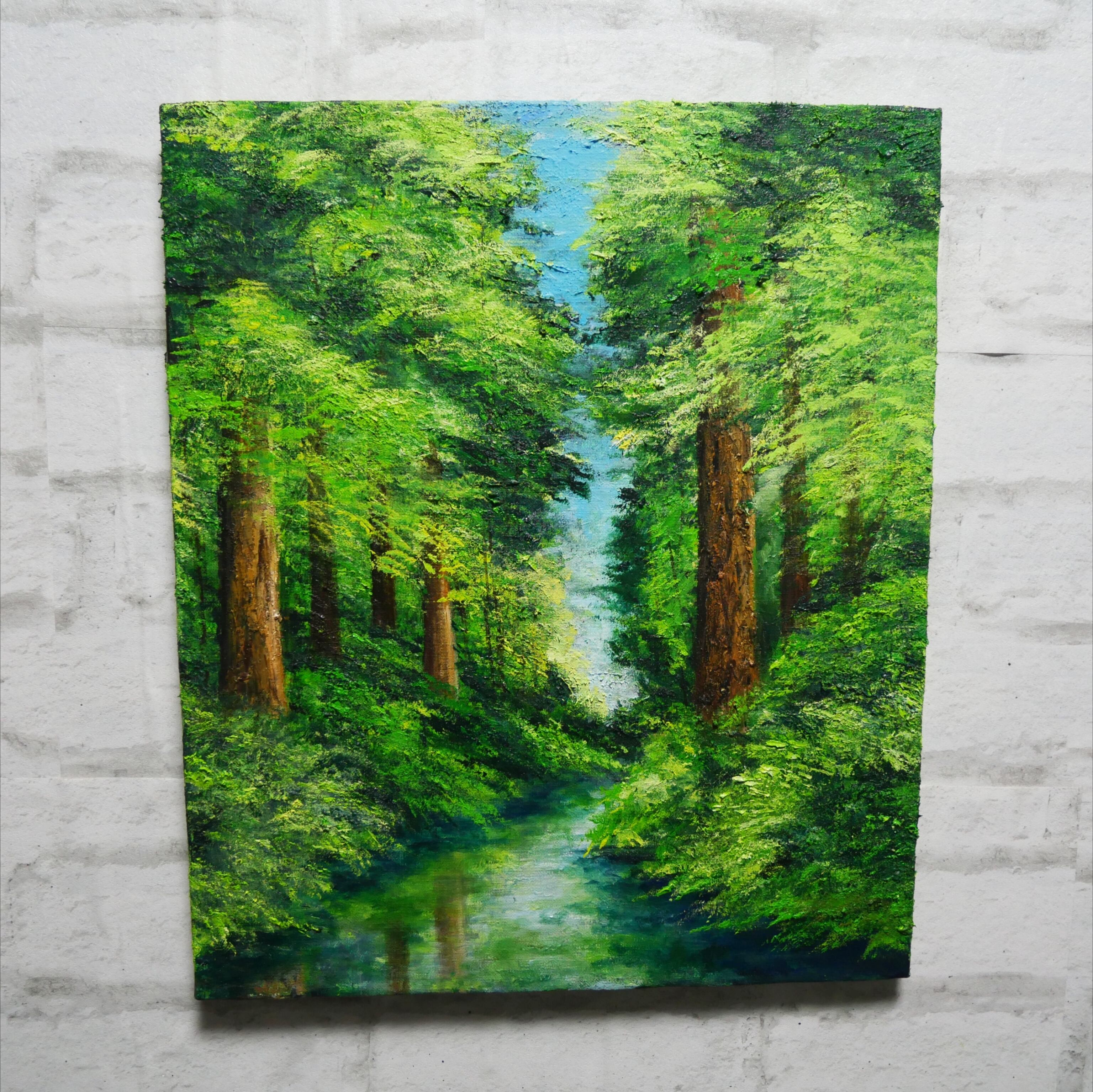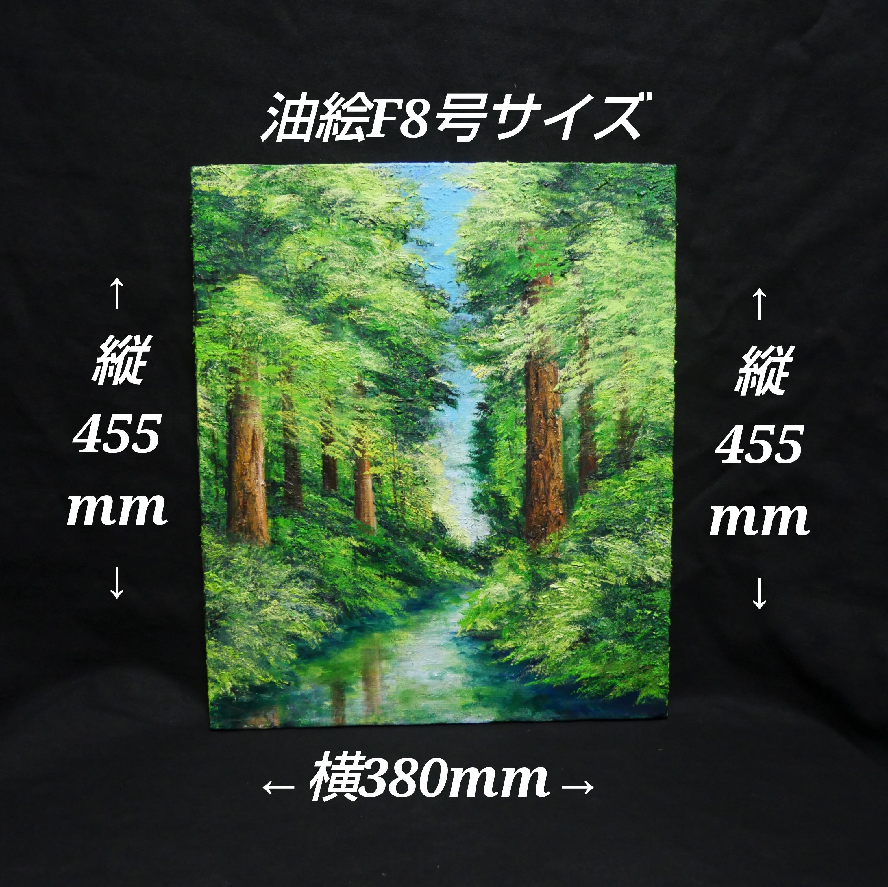 この作品が、お客様の日常に自然の美しさをもたらし、心豊かなひとときを楽しむきっかけとなることを願っています。そして、新緑の爽やかな香りと静かな川のせせらぎを感じるこの特別な油絵で、生活空間に豊かな彩りを加えてみてはいかがでしょうか。