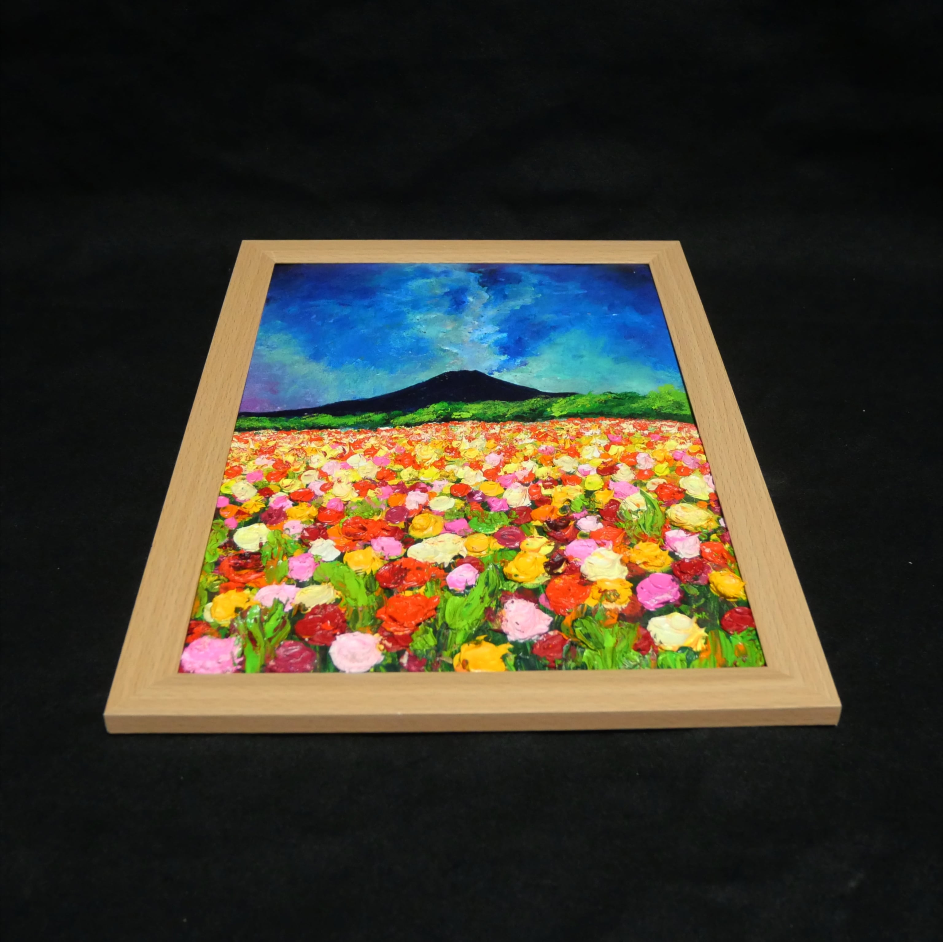 「星空のお花畑の富士山」は、幻想的な星空と色とりどりのお花畑を背景に、雄大な富士山を描いた特別な油絵作品です。コバルトブルー、ターコイズブルー、シルバー、紫の星空が織りなす美しさと、赤、ピンク、オレンジ、黄の花々が咲き誇るお花畑が融合し、見る人に心の豊かさを感じさせます。この美しいアートは、星空と自然を愛する方に特におすすめで、日常のインテリアに華やかさを加えてくれることでしょう。