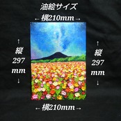 この油絵は、サイズ横210mm × 縦297mmで、質の高いホルベインの油絵具を使用し、アートの美しさと耐久性を兼ね備えています。壁掛け用の金具も付属しているため、お好きな場所に手軽に飾ることが可能です。「星空のお花畑の富士山」は、大切な方への贈り物としても自信を持っておすすめいたします。