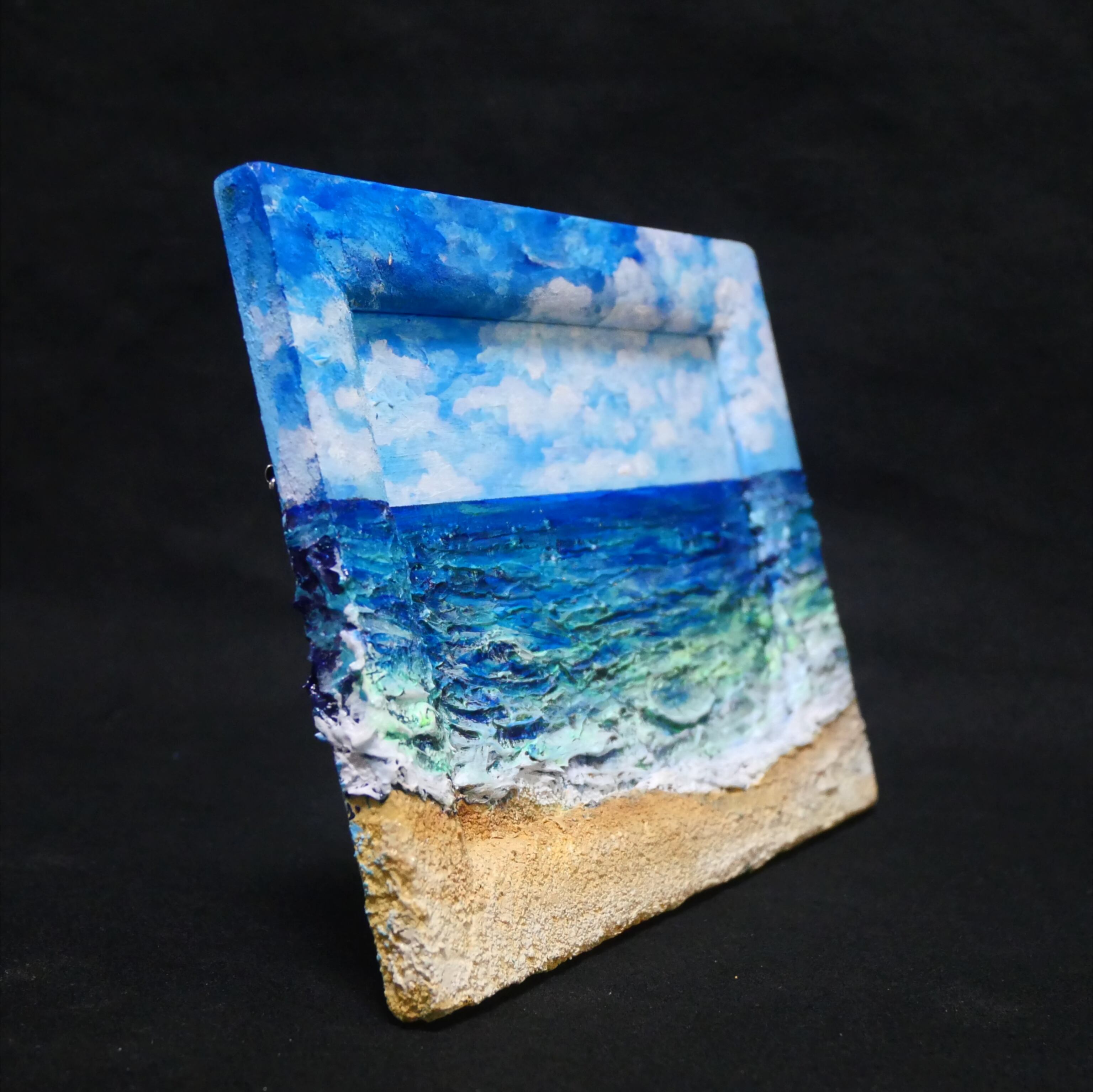 この油絵は、サイズ横18.7cm × 縦13.7cm、厚さ1cmのミニサイズで、質の高いホルベインの油絵具とリキテックスのアクリル絵具を使用し、鮮やかな色彩の美しさを誇ります。壁掛け用の金具も付属しているため、お好きな場所に簡単に飾ることが可能です。「海の砂浜」は、大切な方への特別な贈り物としても自信を持っておすすめいたします。