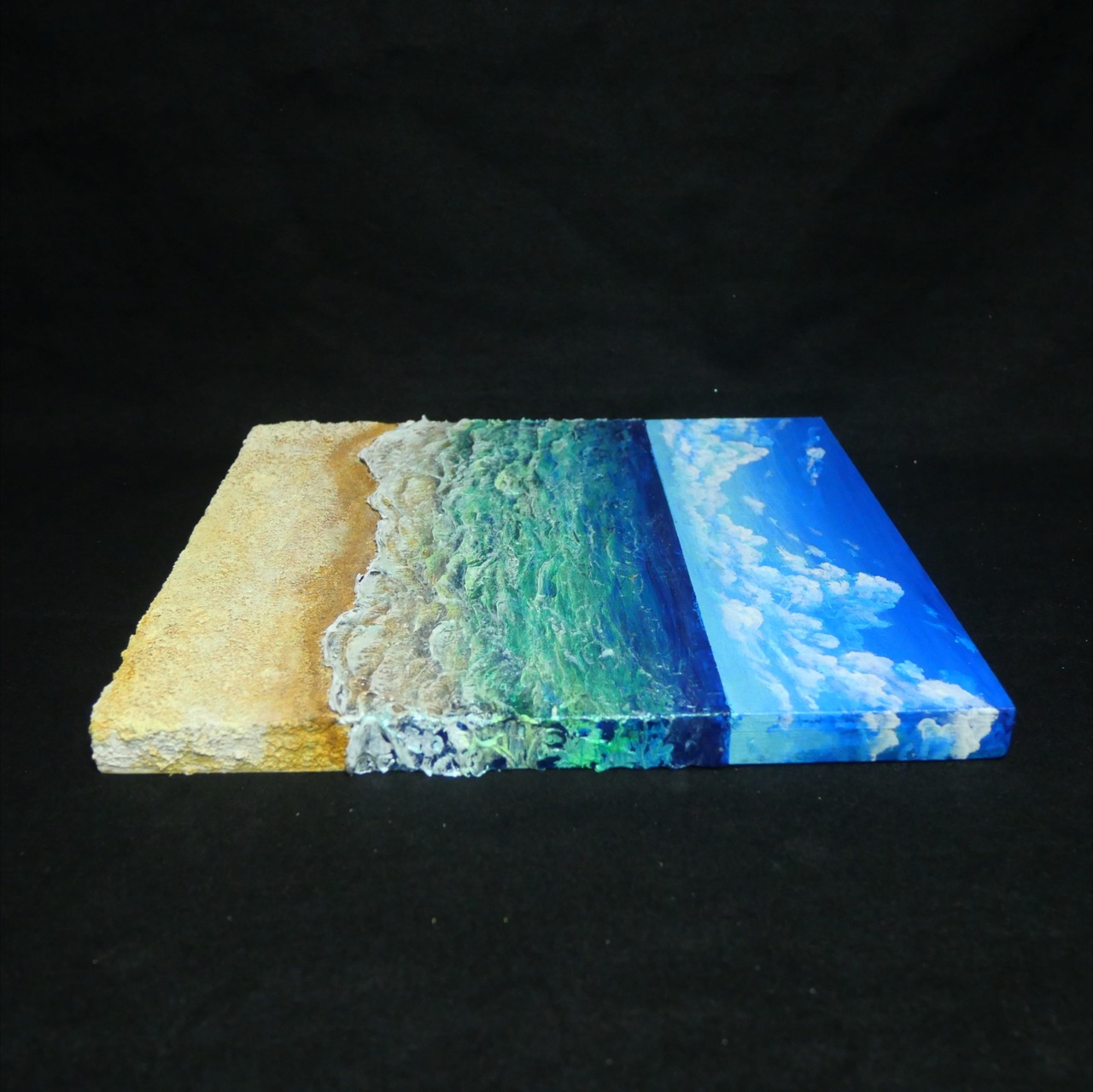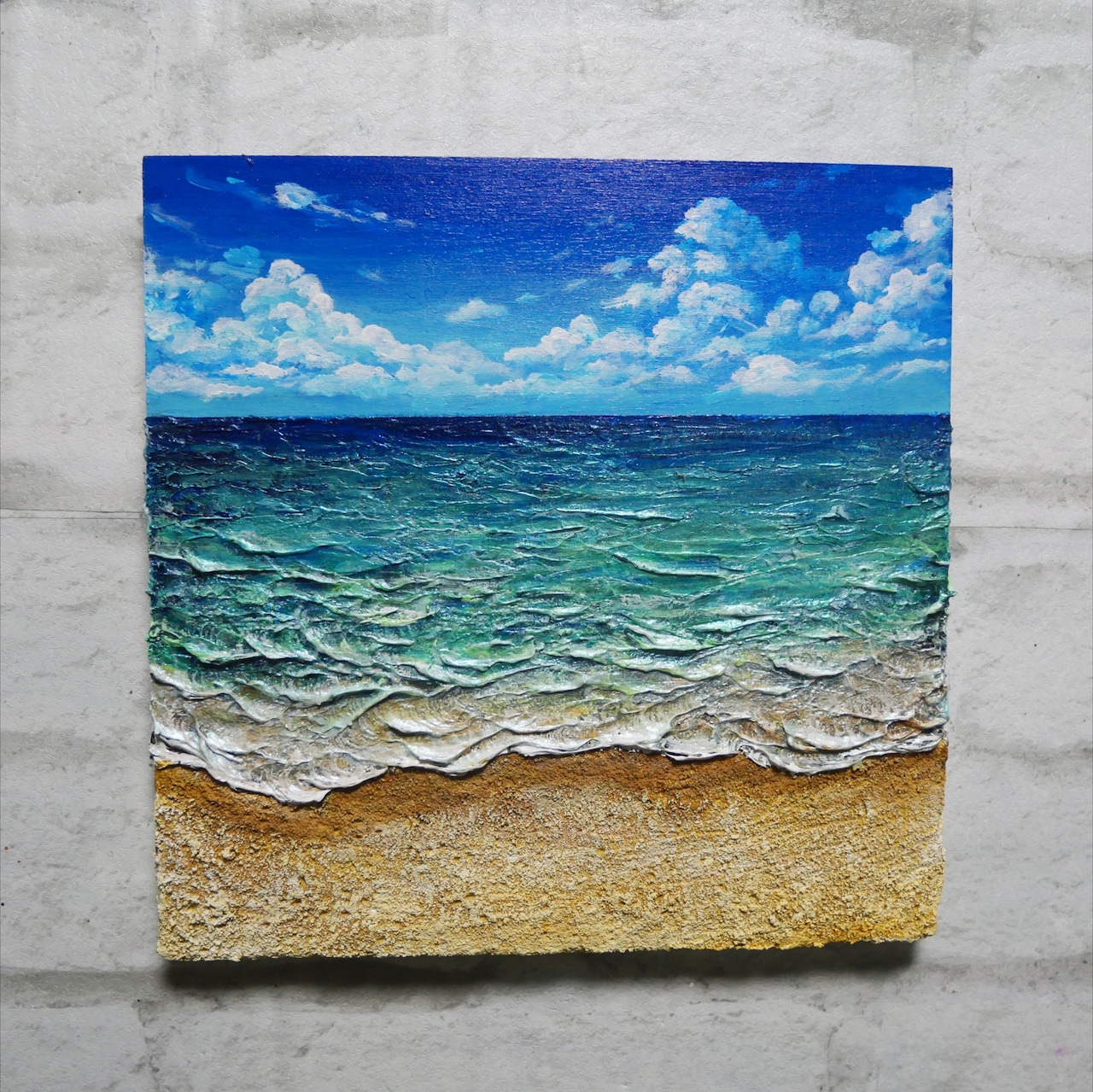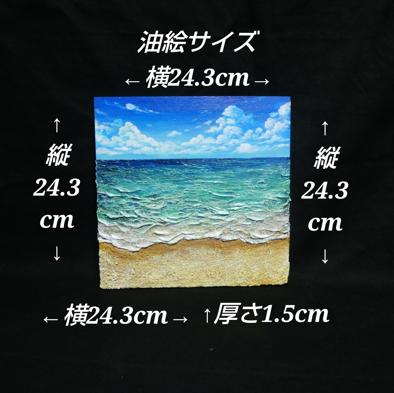 この油絵は、サイズ横24.3cm×縦24.3cm、厚さ1.5cmのコンパクトなサイズで、質の高いホルベインの油絵具とリキテックスのアクリル絵具を使用し、色彩の深みと豊かな表現を追及しています。また、壁掛け用の金具も付属しているため、お好きな場所に手軽に飾ることができます。「砂浜の海」は、大切な方への贈り物としても自信を持っておすすめいたします。