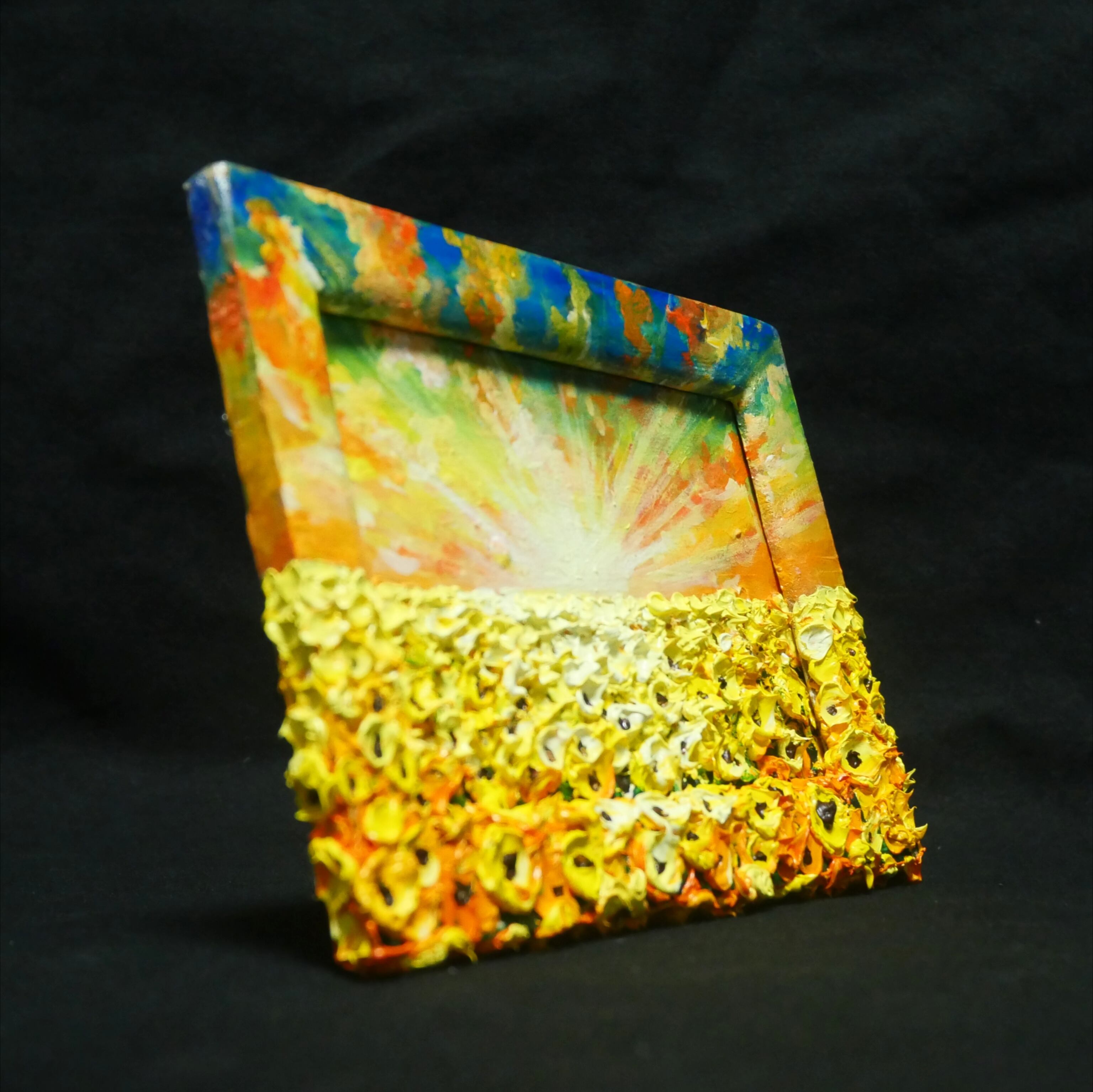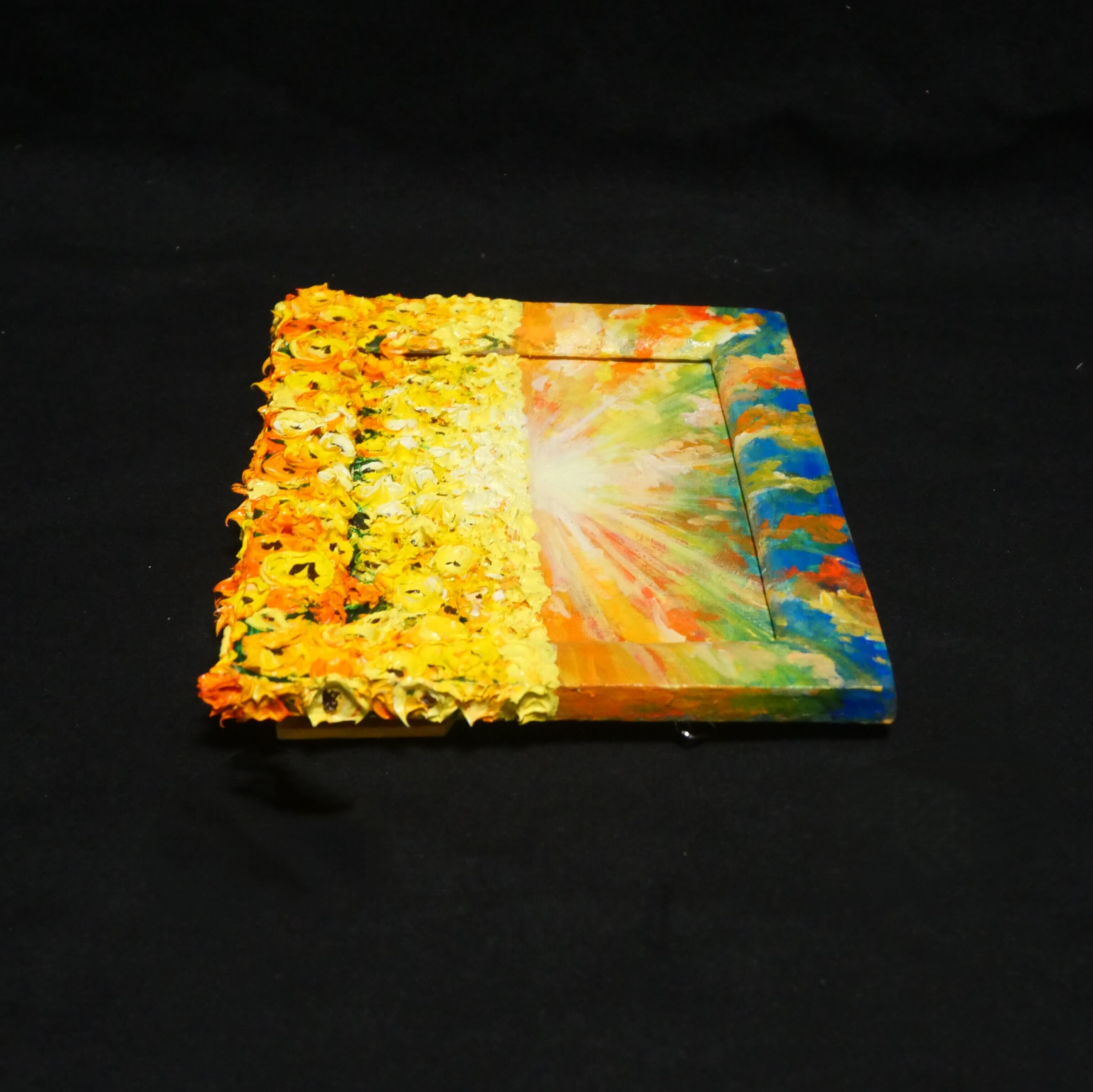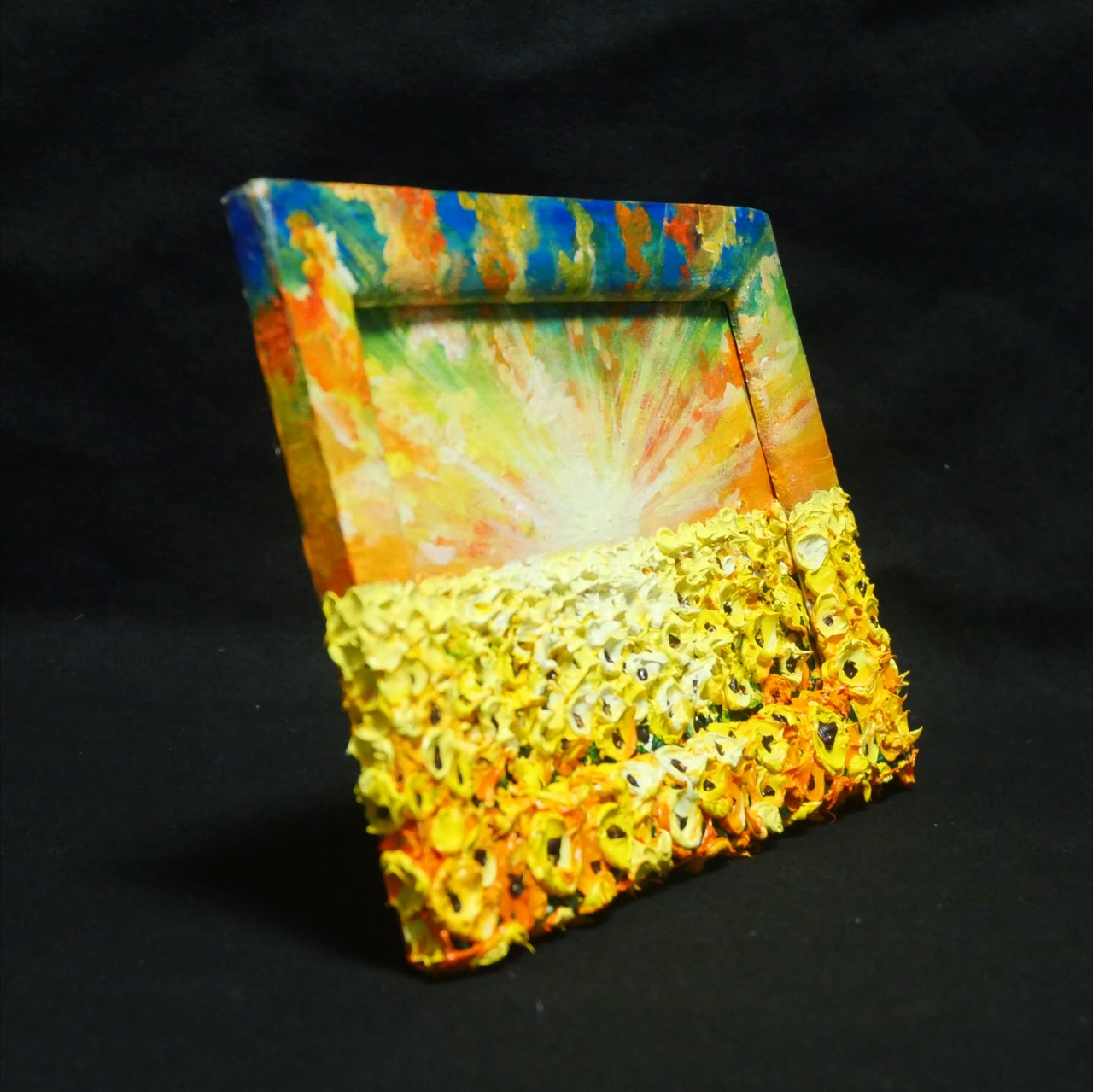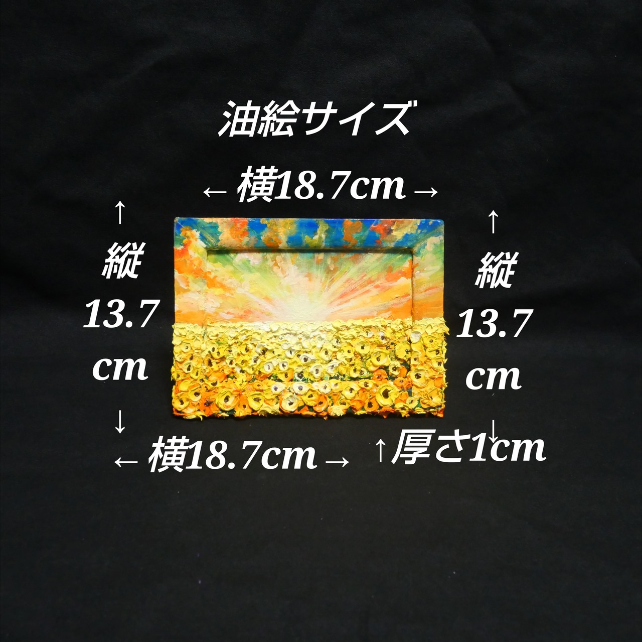 こちらの油絵は、サイズ縦18.7cm × 横13.7cm、額縁サイズは縦18.7cm × 横13.7cm × 厚さ1cmとなっており、高級な油絵具を使用して制作されています。そのため、10年後、100年後も変わらず美しい色を保ち続けます。エレガントな額縁がデザインされており、どんなインテリアにも調和し、特別な空間を演出します。壁掛け用の金具も付属しているため、お好きな場所に手軽に飾ることができます。「黄昏の向日葵」は、大切な方へのプレゼントにもぴったりな作品です。無料のラッピングサービスをご用意しておりますので、心を込めた贈り物としても喜ばれること間違いなしです。