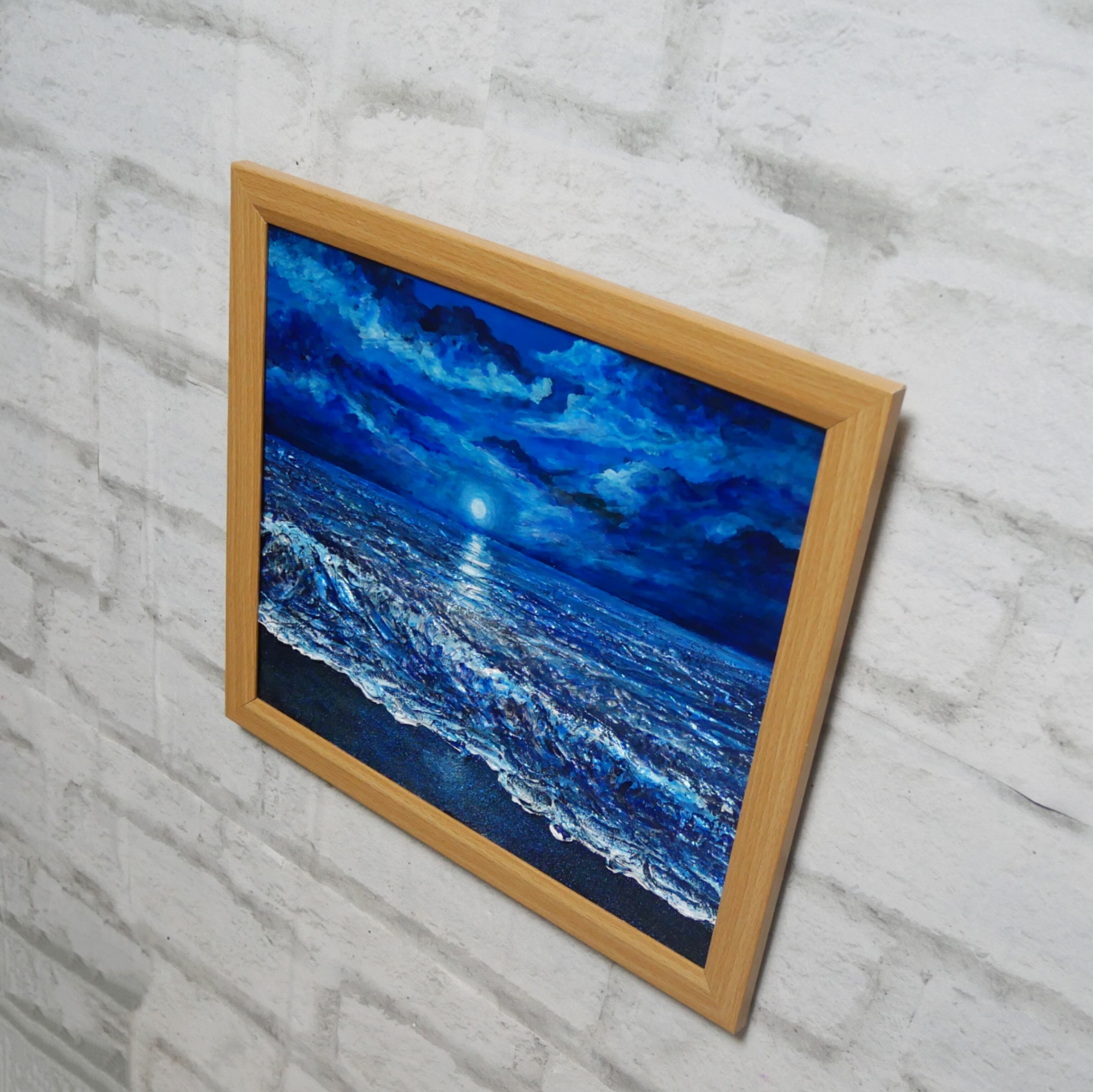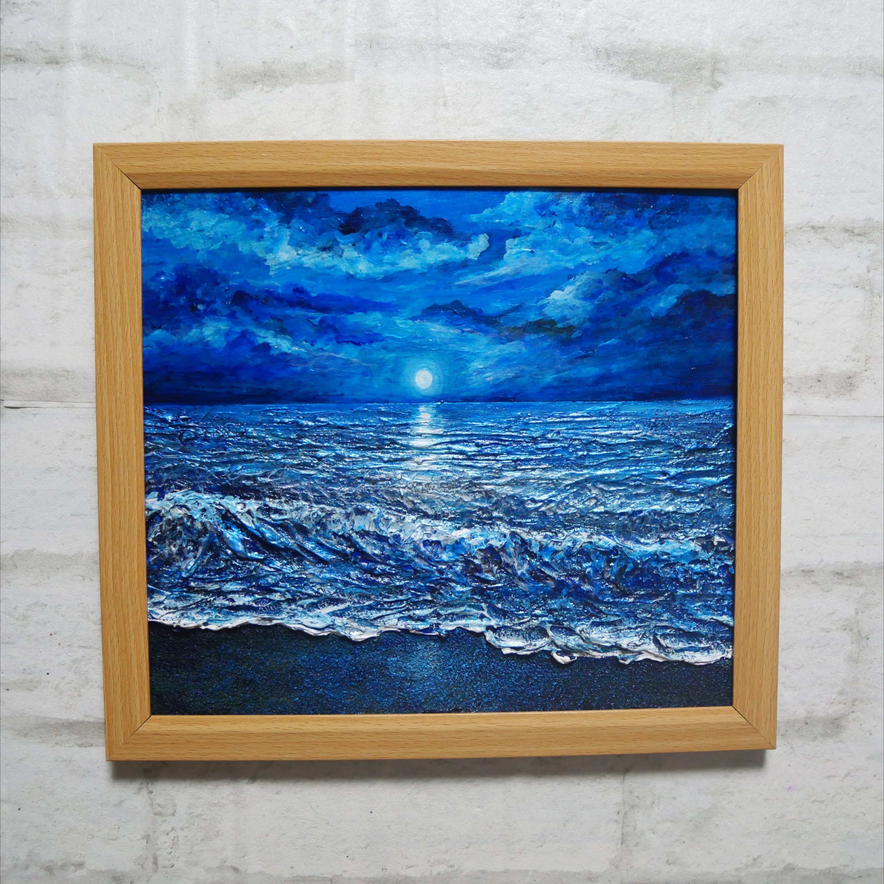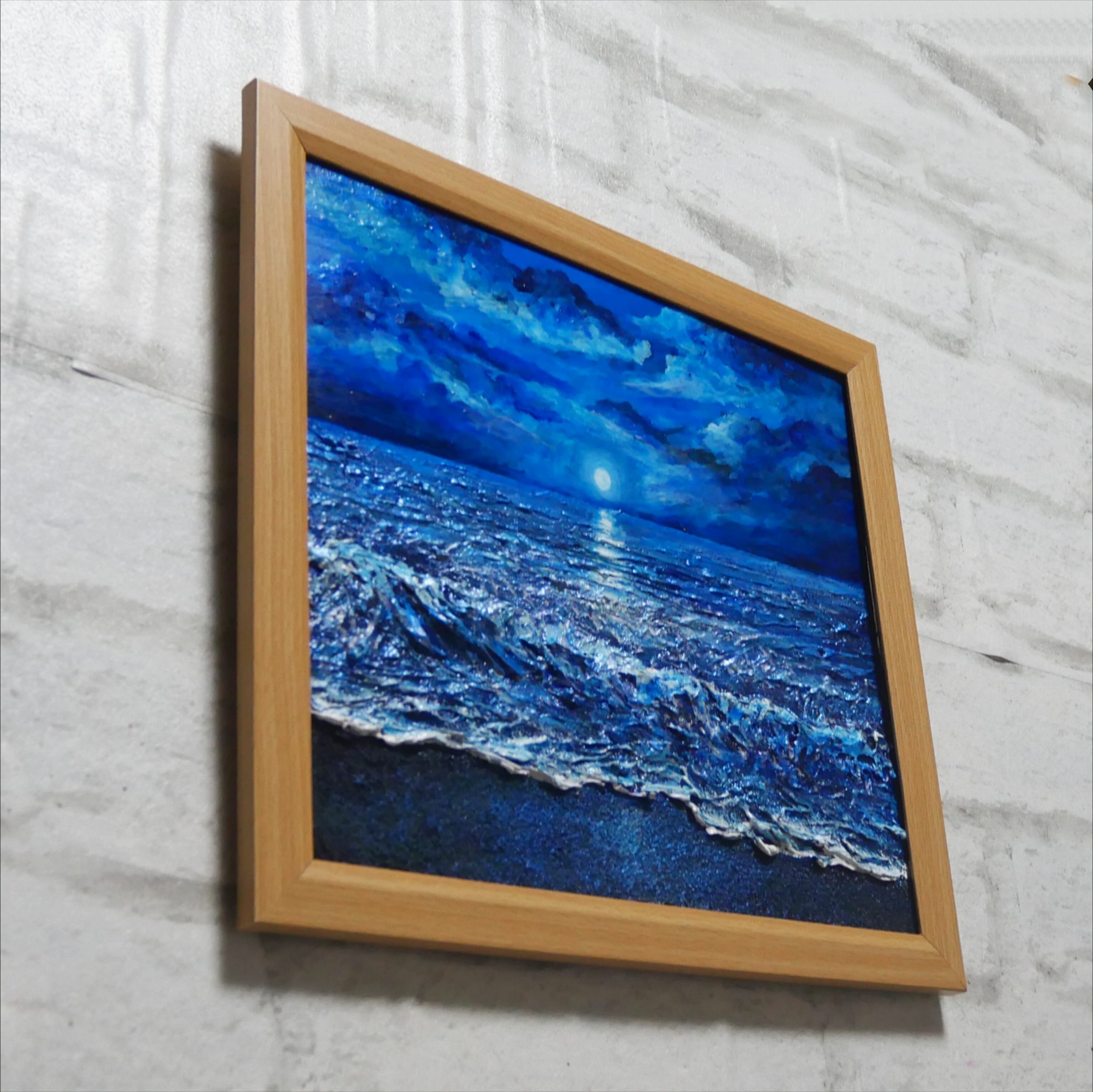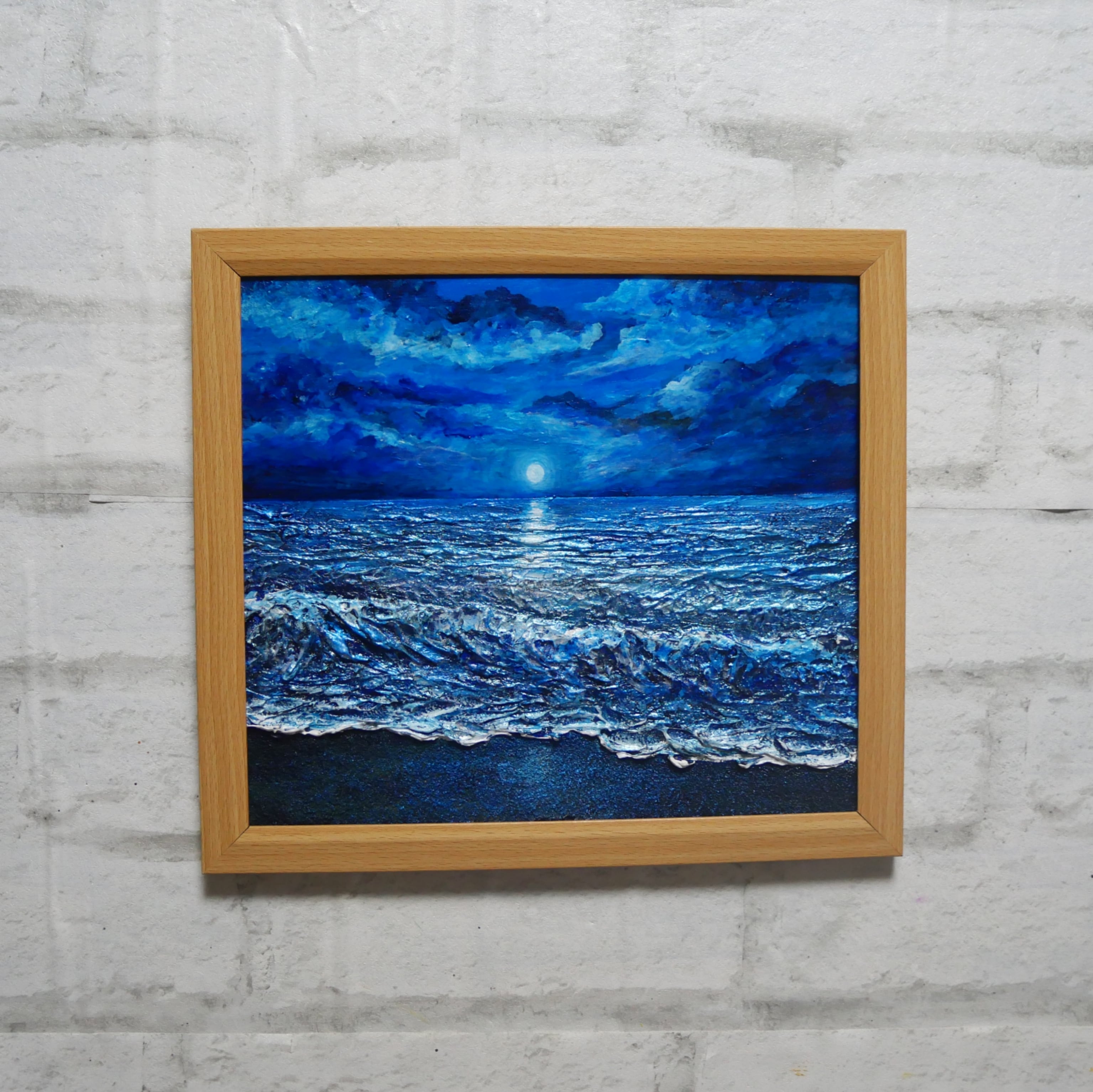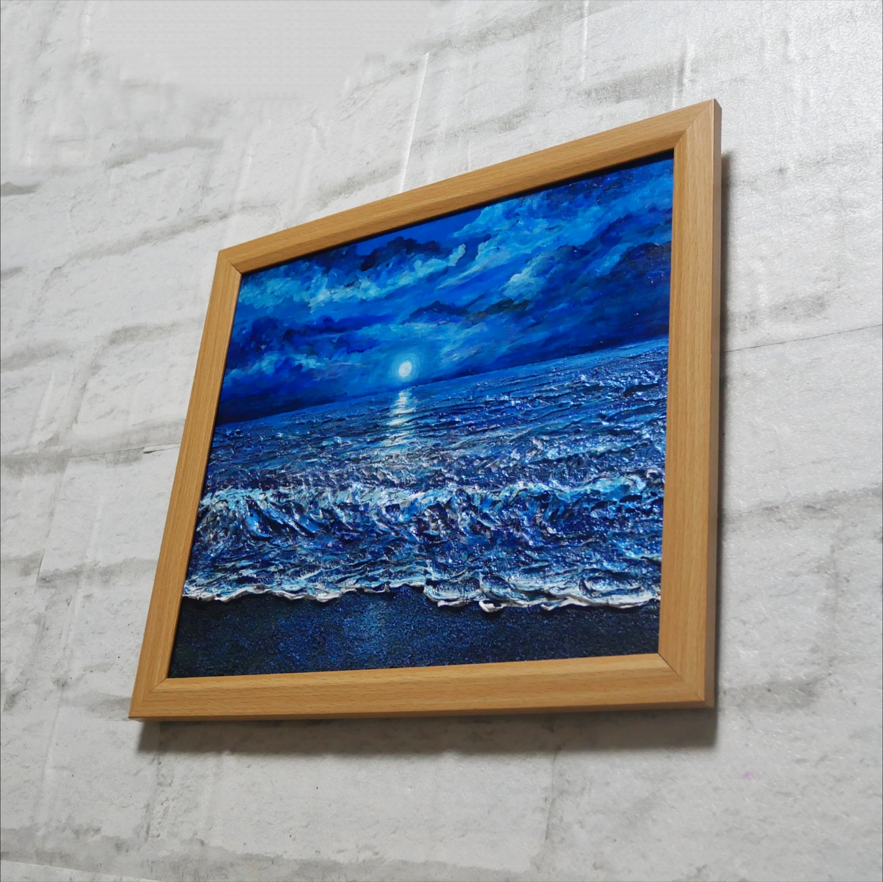 「水平線に沈む満月」は、夜空の神秘的な深青と雲、水平線の中心に位置する満月、そしてその光の下で静かに揺れる海や波、青い砂浜を描いた特別な油絵作品です。この美しい光景は、見る人に心の安らぎとロマンティックなひとときをもたらし、特別な空間を演出することでしょう。