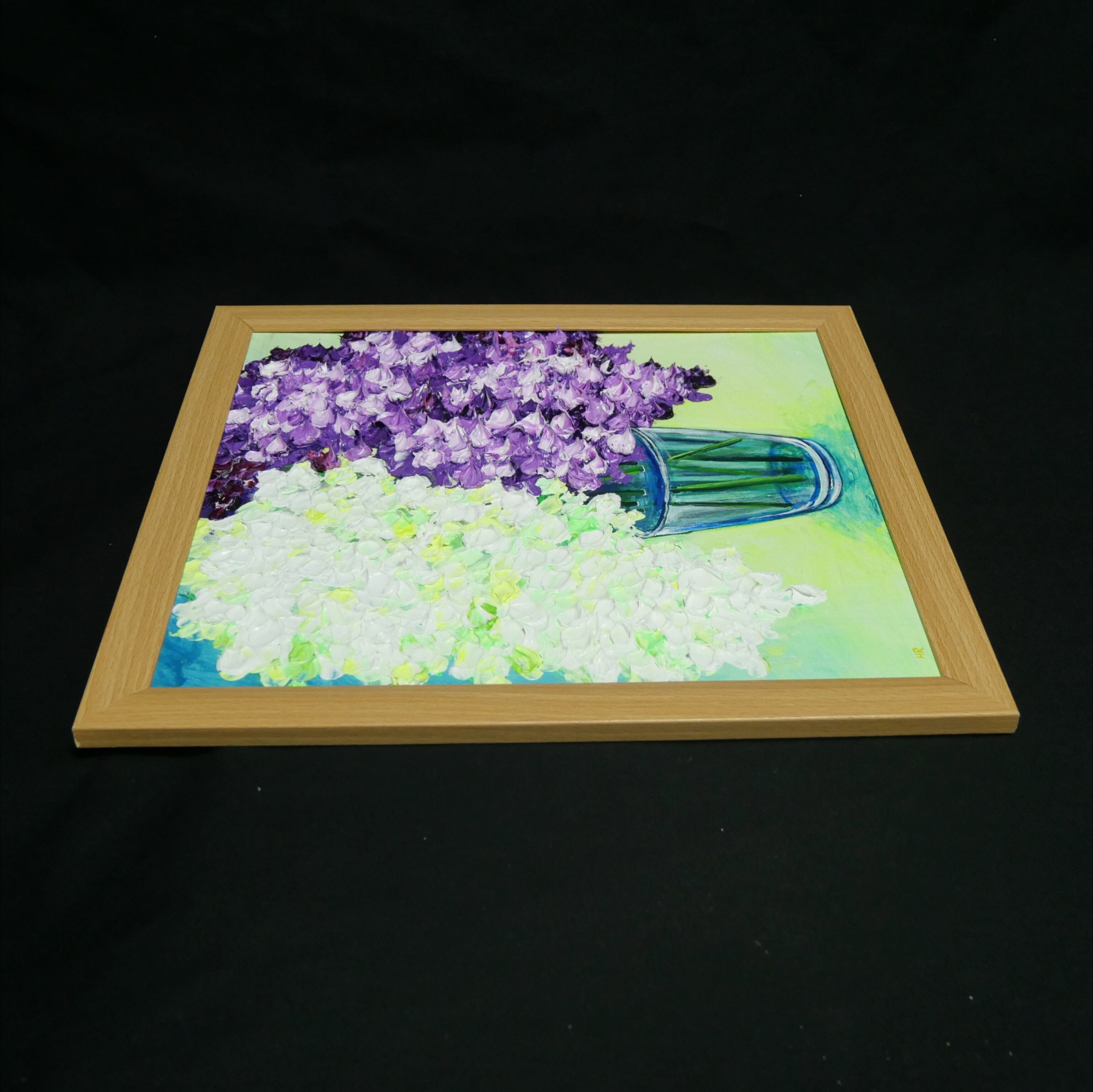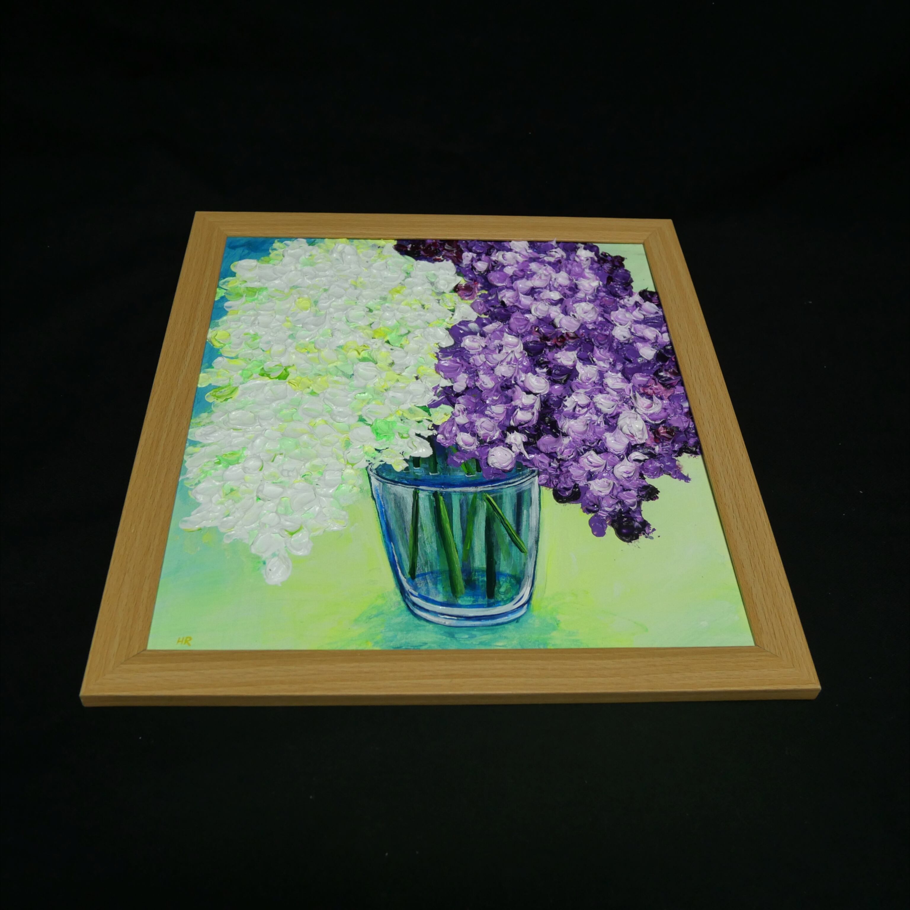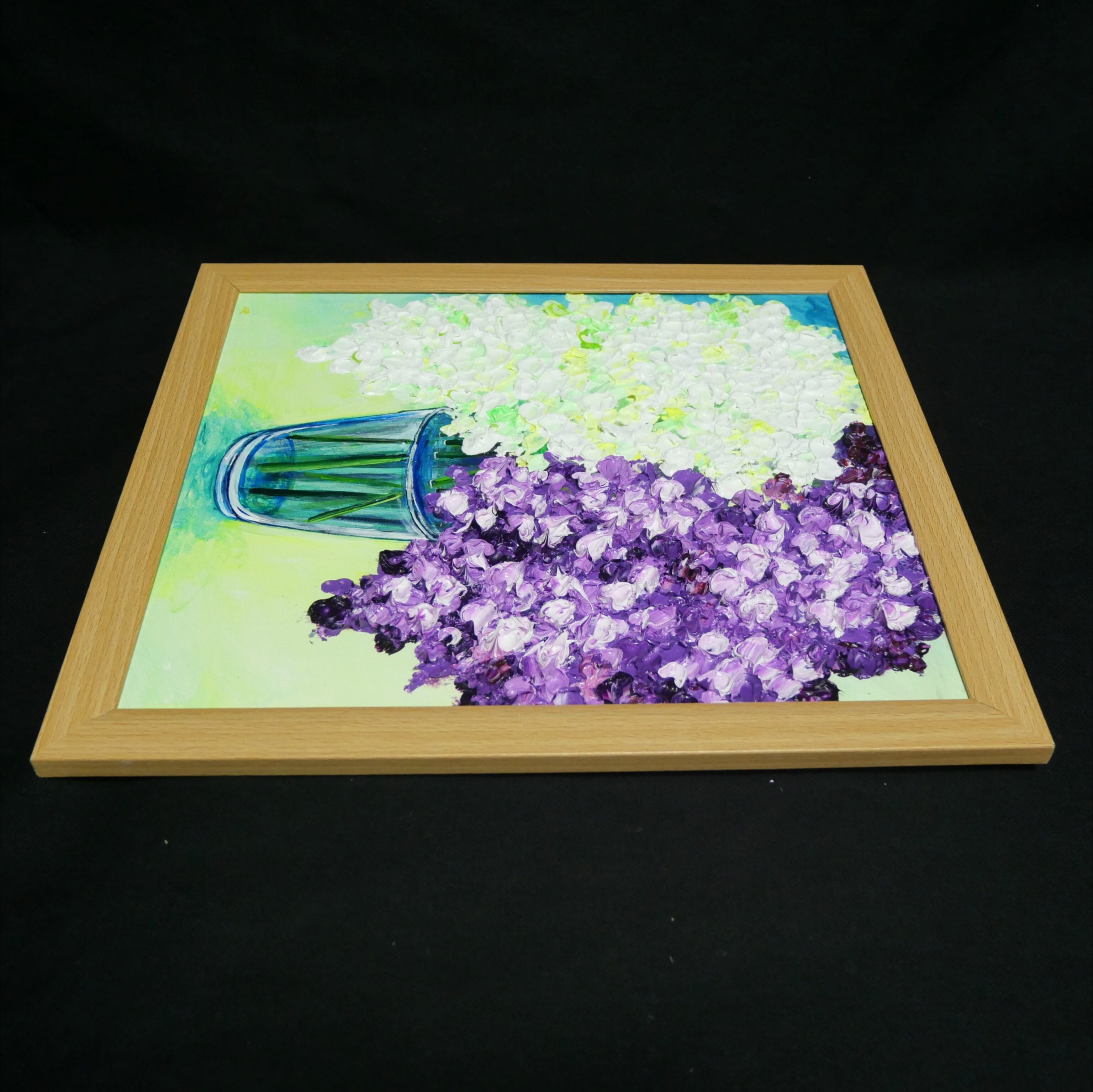 「白と紫のライラック」は、明るいブルーグリーンと薄いイエローの背景に、透明な花瓶に盛られた白と紫のライラックを描いた特別な油絵作品です。この美しい花々は、見る人に心の安らぎと青春の喜びをもたらし、特別な瞬間を演出してくれることでしょう。ナチュラルカラーの額縁が、作品の魅力を一層引き立て、どんなインテリアにも優雅さを添えます。