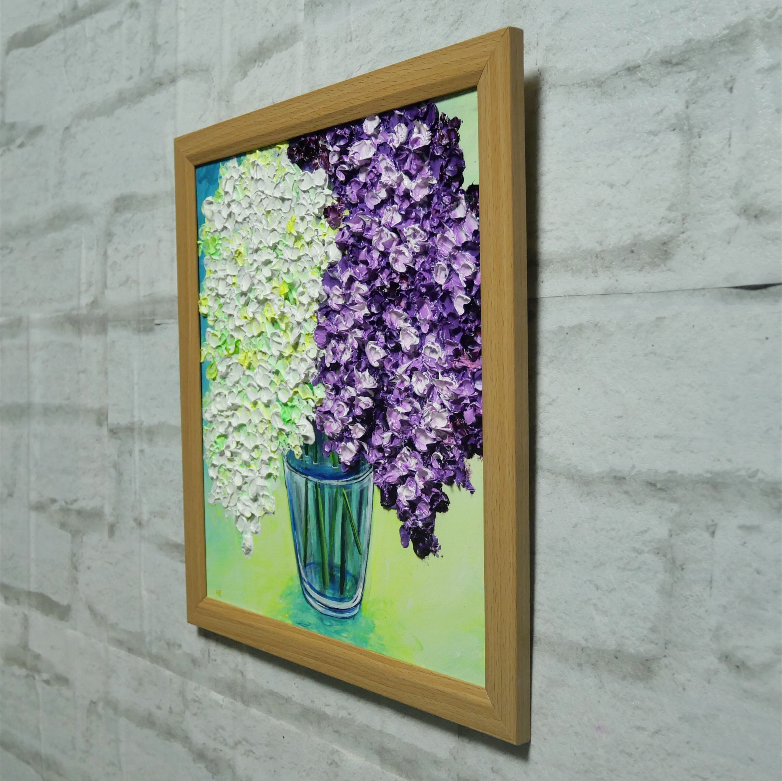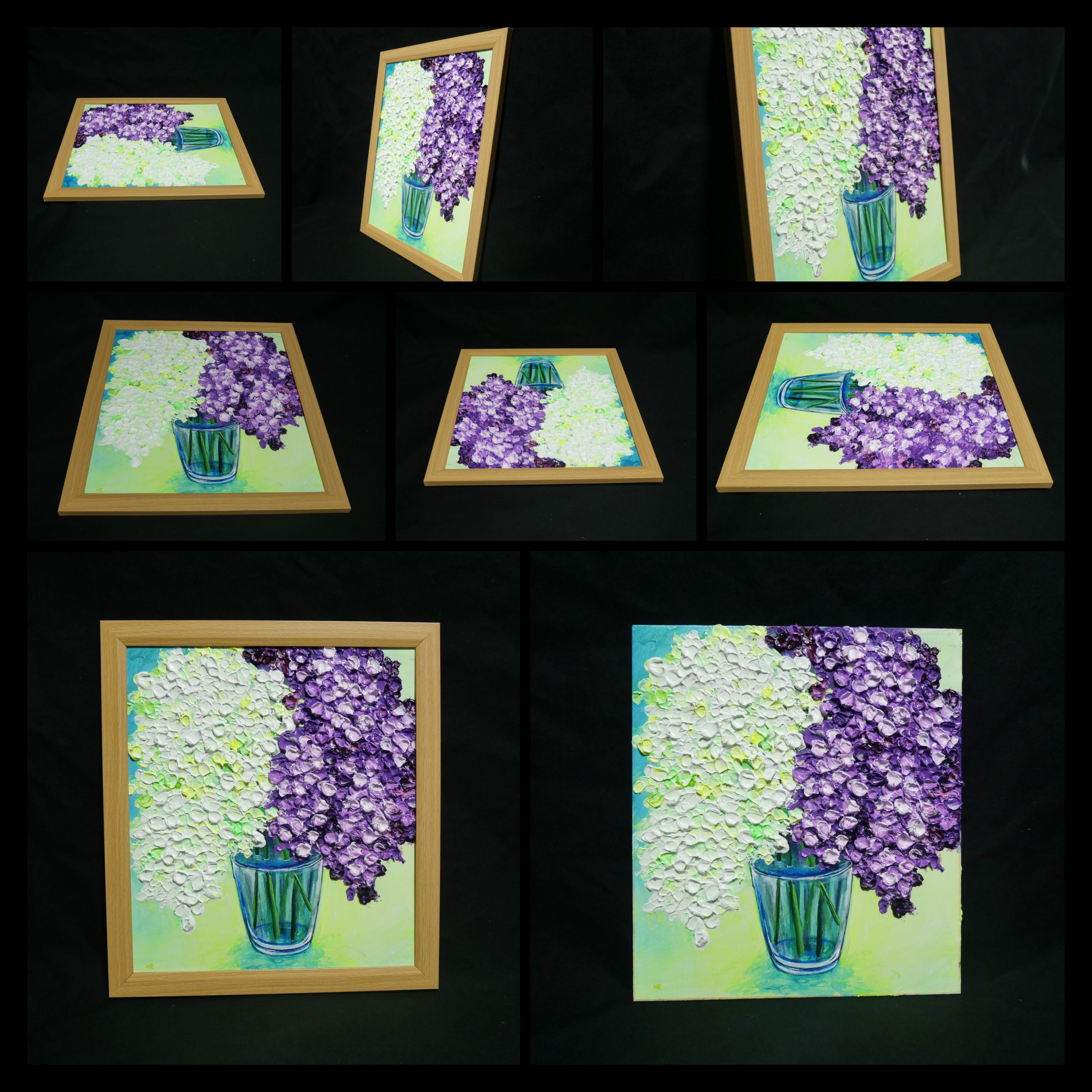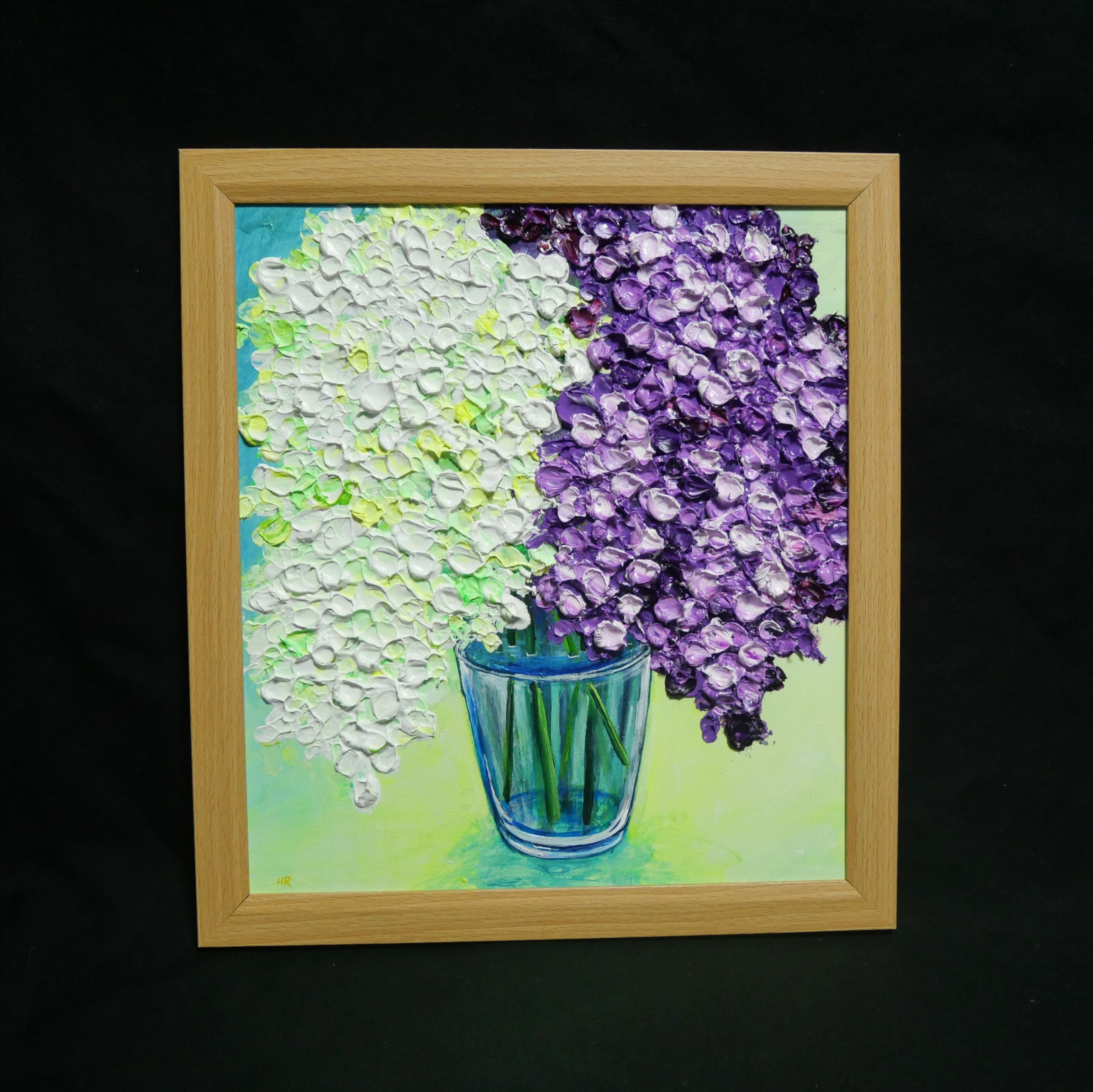 「白と紫のライラック」は、明るいブルーグリーンと薄いイエローの背景に、透明な花瓶に盛られた白と紫のライラックを描いた特別な油絵作品です。この美しい花々は、見る人に心の安らぎと青春の喜びをもたらし、特別な瞬間を演出してくれることでしょう。ナチュラルカラーの額縁が、作品の魅力を一層引き立て、どんなインテリアにも優雅さを添えます。