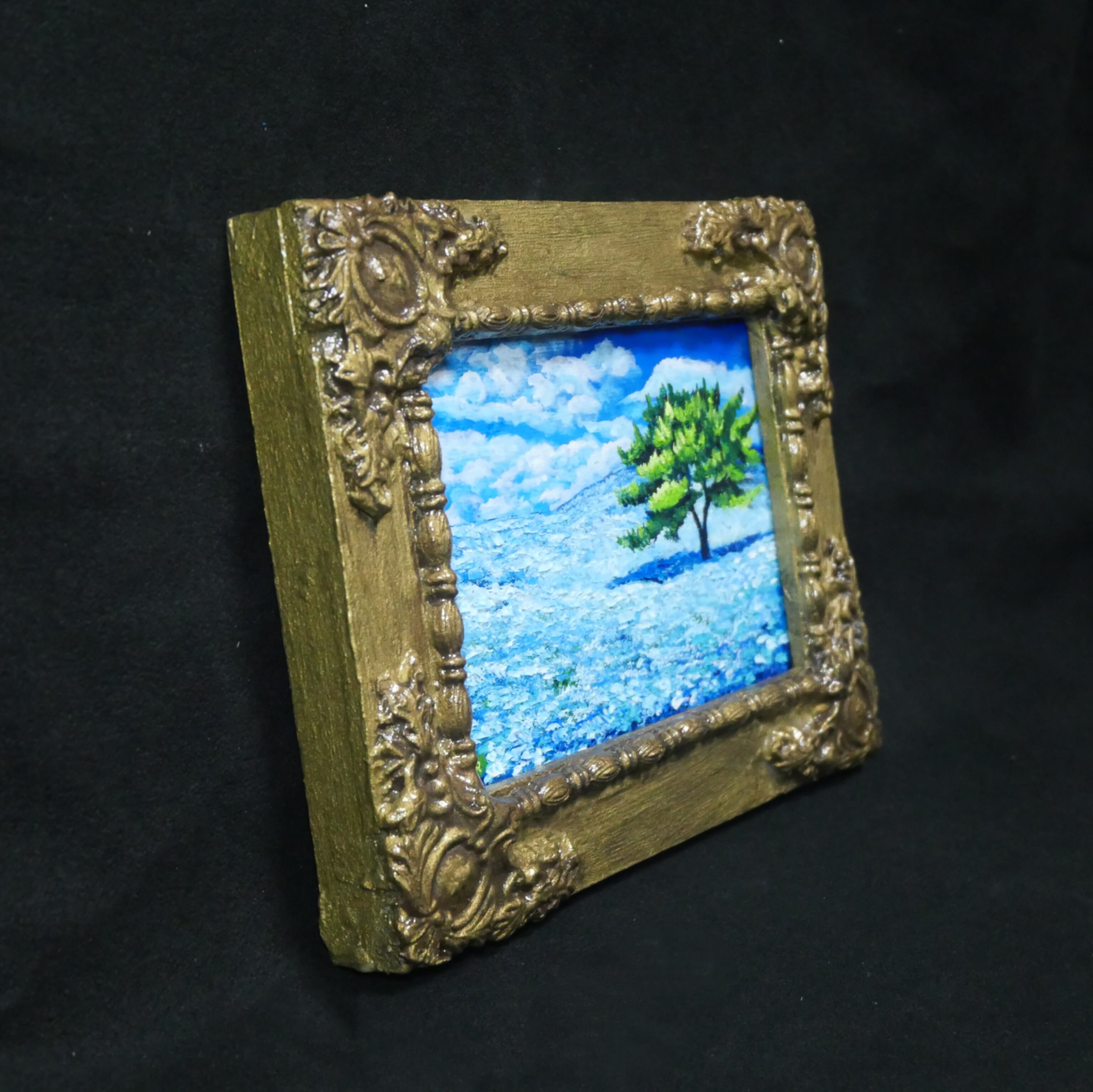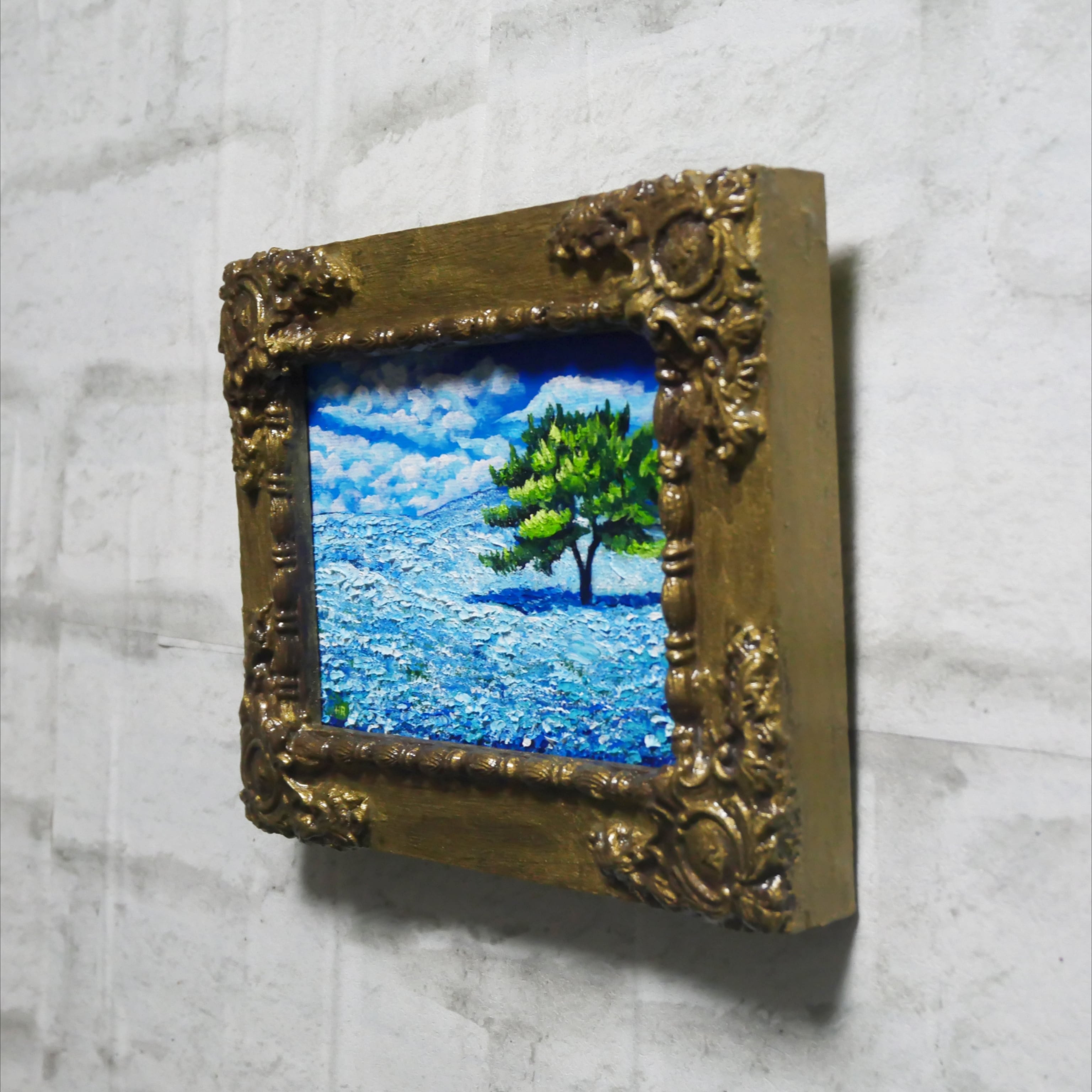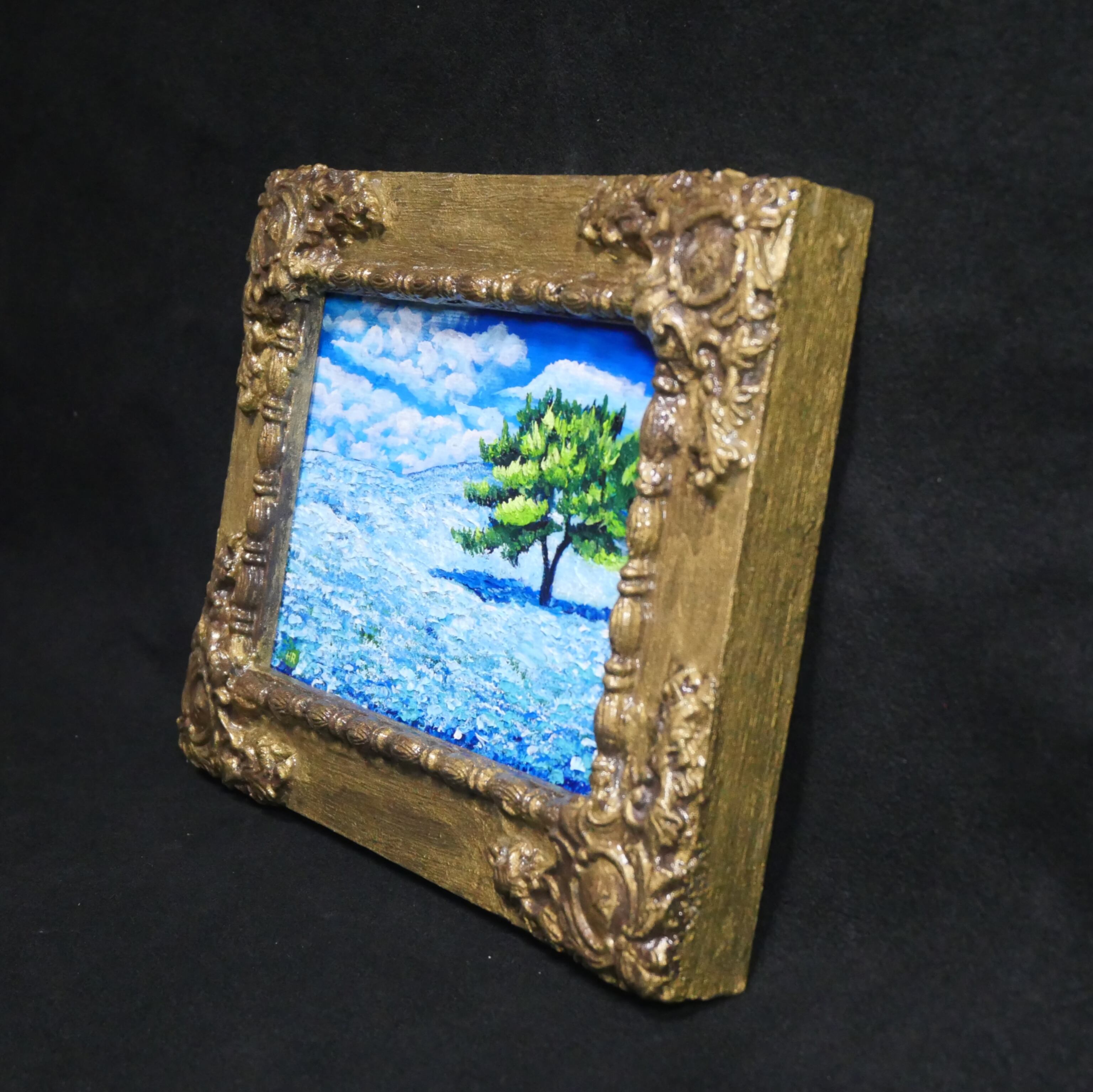 「ネモフィラの丘」は、国営ひたち海浜公園に広がる青いネモフィラ畑を描いた特別な油絵作品です。この美しい風景は、爽やかな青空と柔らかな雲、そして一面に広がる青いネモフィラ畑が調和し、見る人に癒しと心の安らぎをもたらします。右側には一本の木が優雅に佇み、自然の美しさを一層引き立てています。豪華なアンティークライトゴールドの額縁が、この作品にエレガントな雰囲気を添え、どんなインテリアにも調和します。