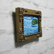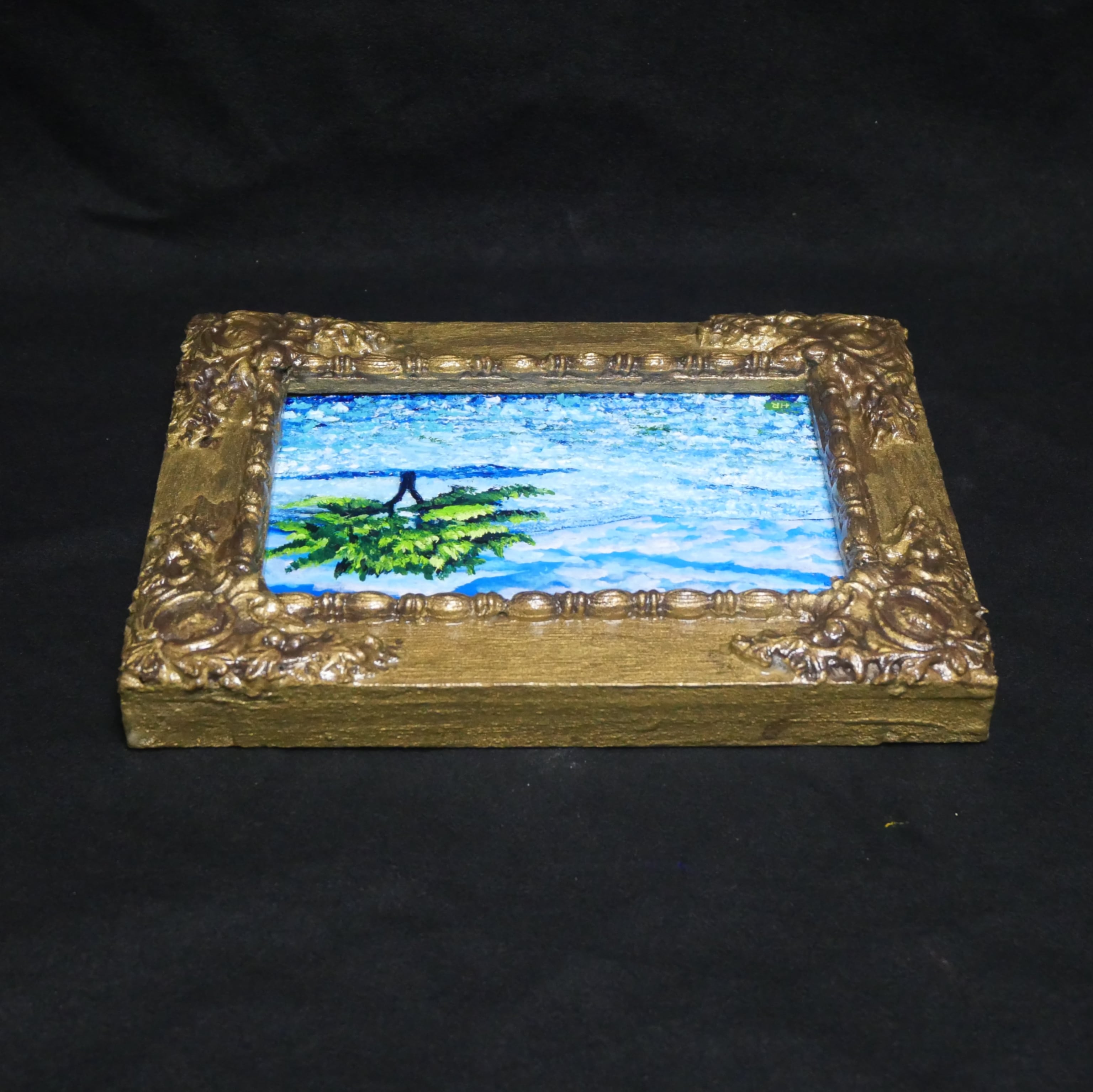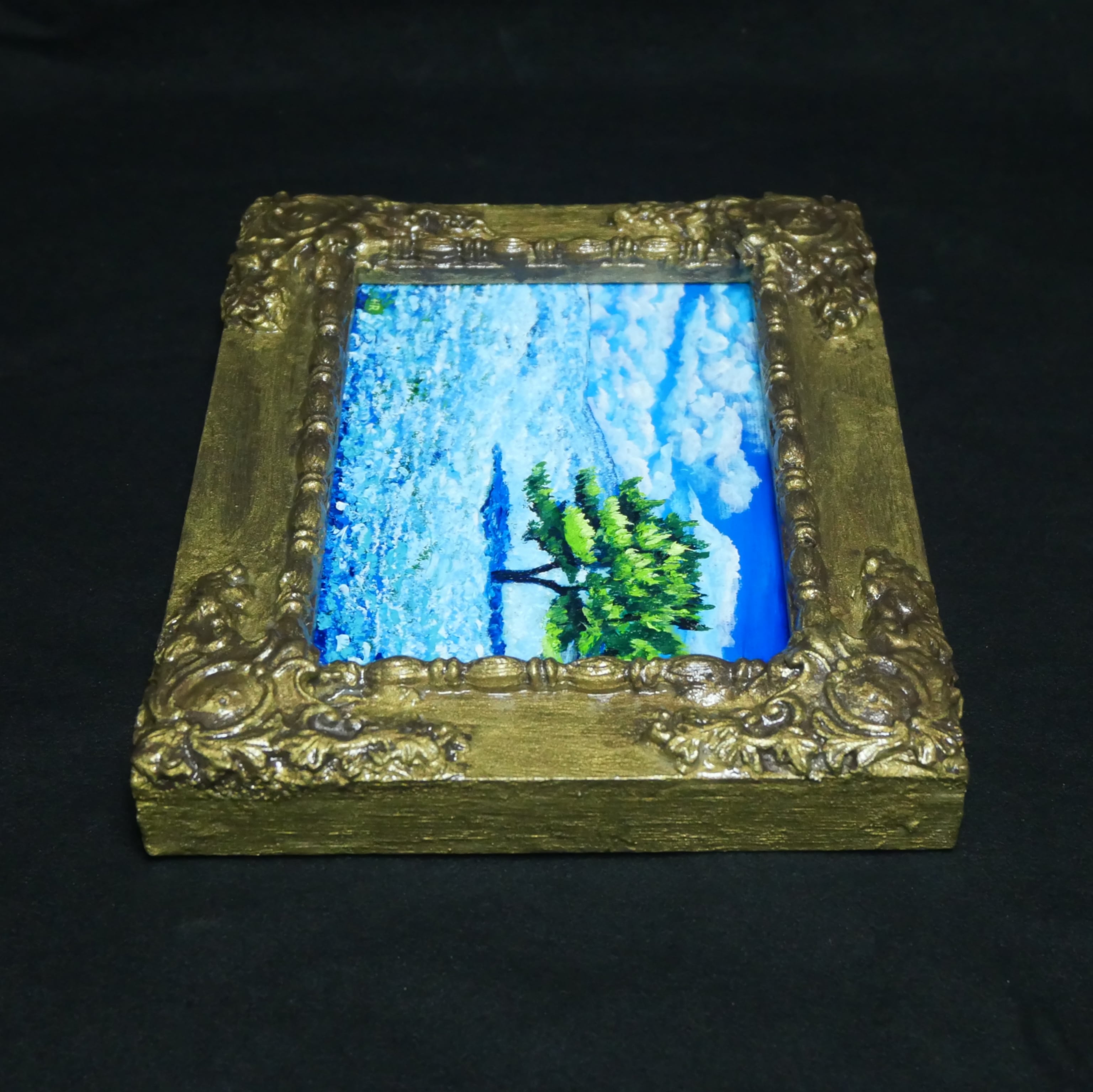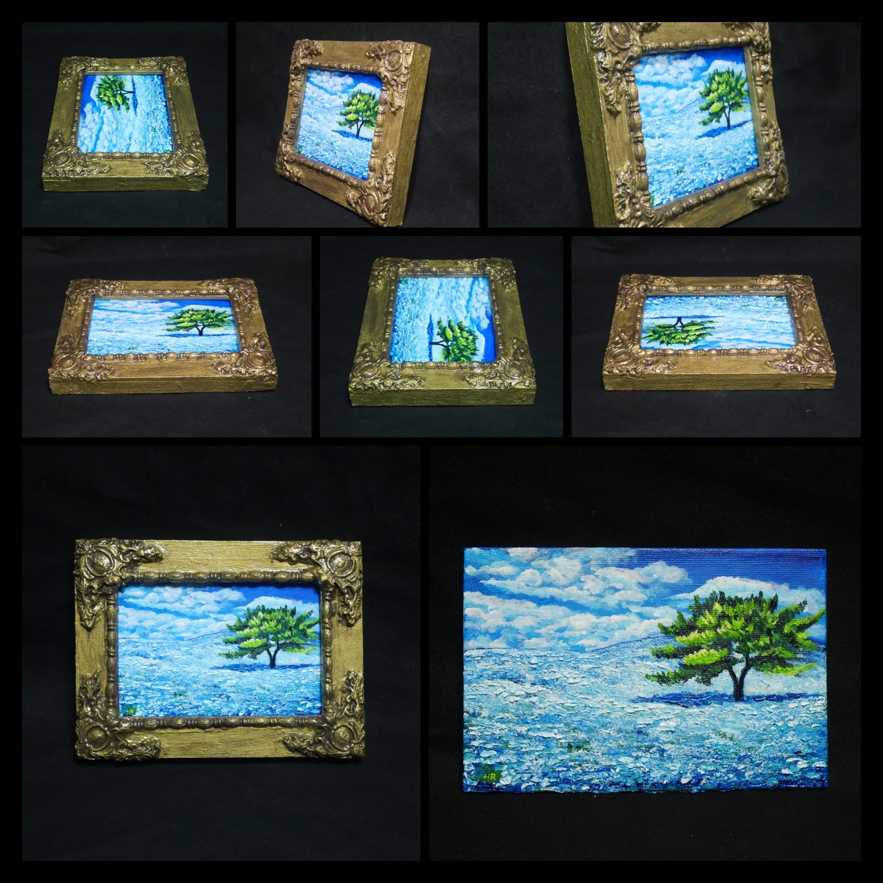 「ネモフィラの丘」は、国営ひたち海浜公園に広がる青いネモフィラ畑を描いた特別な油絵作品です。この美しい風景は、爽やかな青空と柔らかな雲、そして一面に広がる青いネモフィラ畑が調和し、見る人に癒しと心の安らぎをもたらします。右側には一本の木が優雅に佇み、自然の美しさを一層引き立てています。豪華なアンティークライトゴールドの額縁が、この作品にエレガントな雰囲気を添え、どんなインテリアにも調和します。