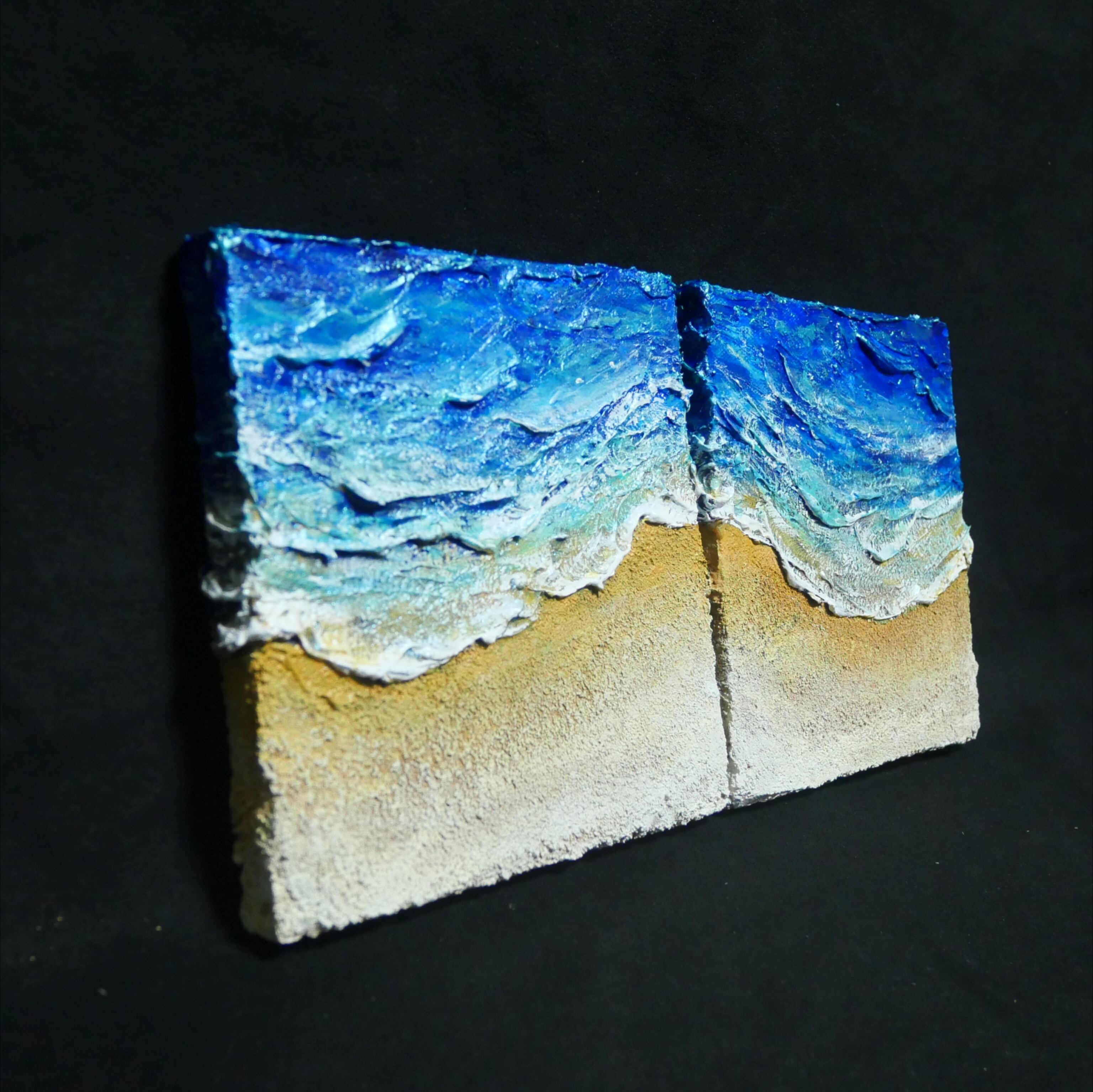 こちらの油絵は、サイズが縦15.7cm×横15.7cm、2点を合わせたサイズは横31.4cm×縦15.7cm、厚さ1.5cmで制作されています。高級な油絵具を使用しており、10年後、100年後もその美しい色合いを保ち続け、長くご愛用いただけます。「海と波」は、大切な方への贈り物としても最適で、特別な瞬間をお祝いするための一品です。無料のラッピングサービスをご用意しておりますので、心を込めた贈り物としてもご満足いただけることでしょう。