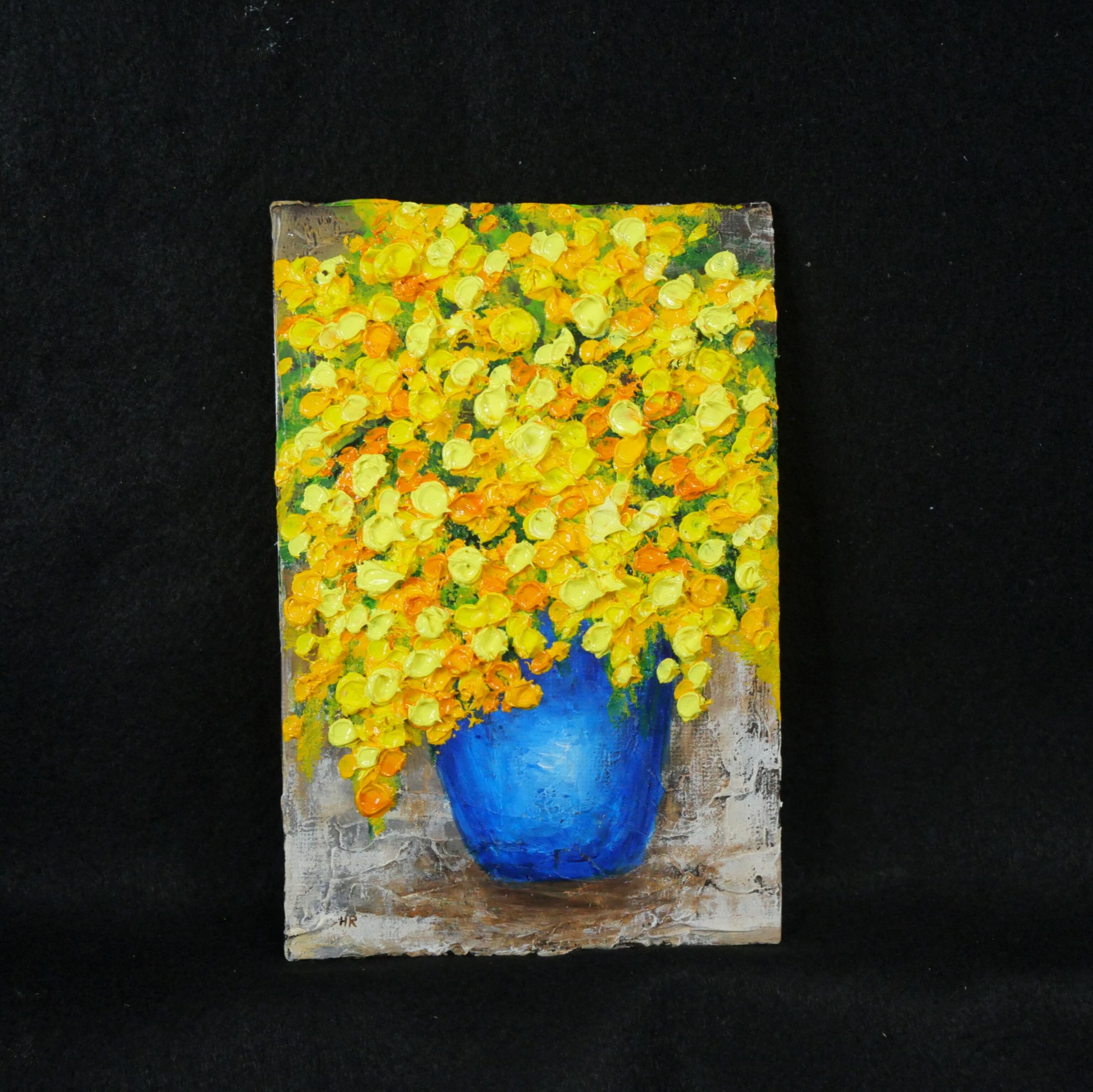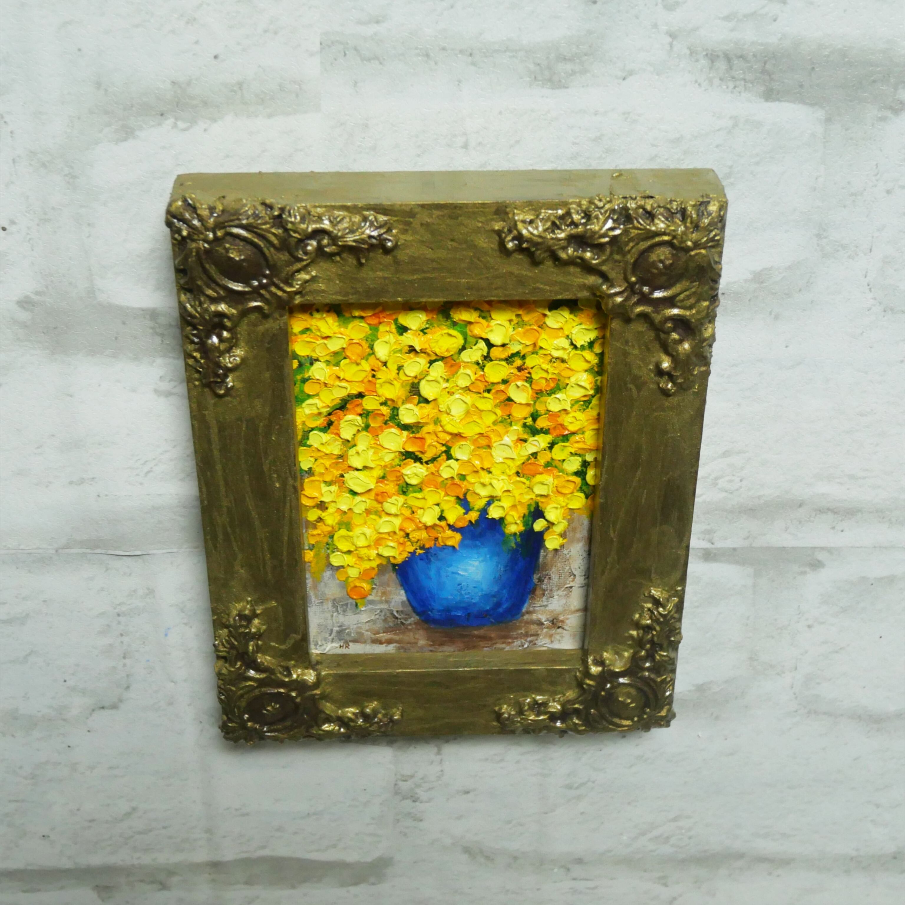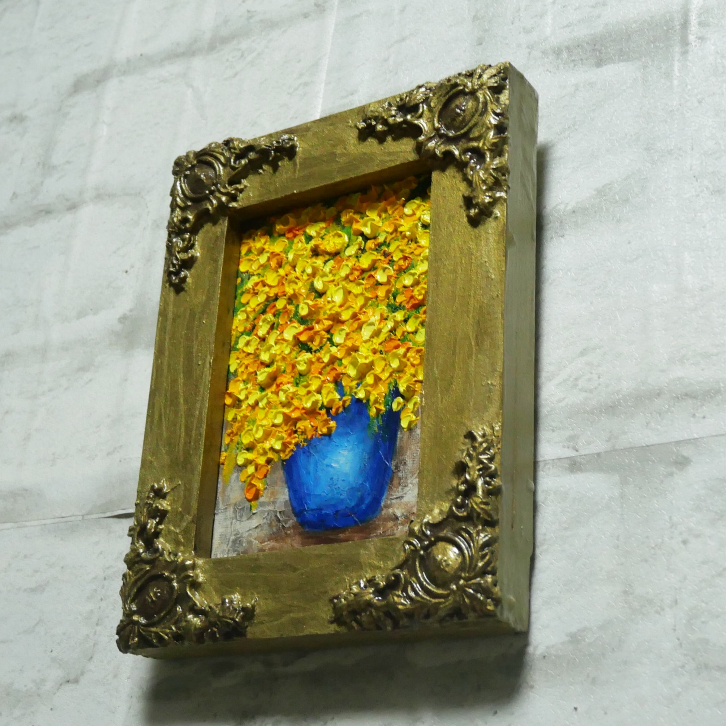 「ミモザ」は、青い花瓶に入れた美しい黄色のミモザを描いた特別な油絵作品です。鮮やかな色彩がインテリアに華やかさを加え、見る人の心を明るく照らします。この作品は、大切なひとときを彩る一品として、ミモザ好きな方々に特におすすめです。