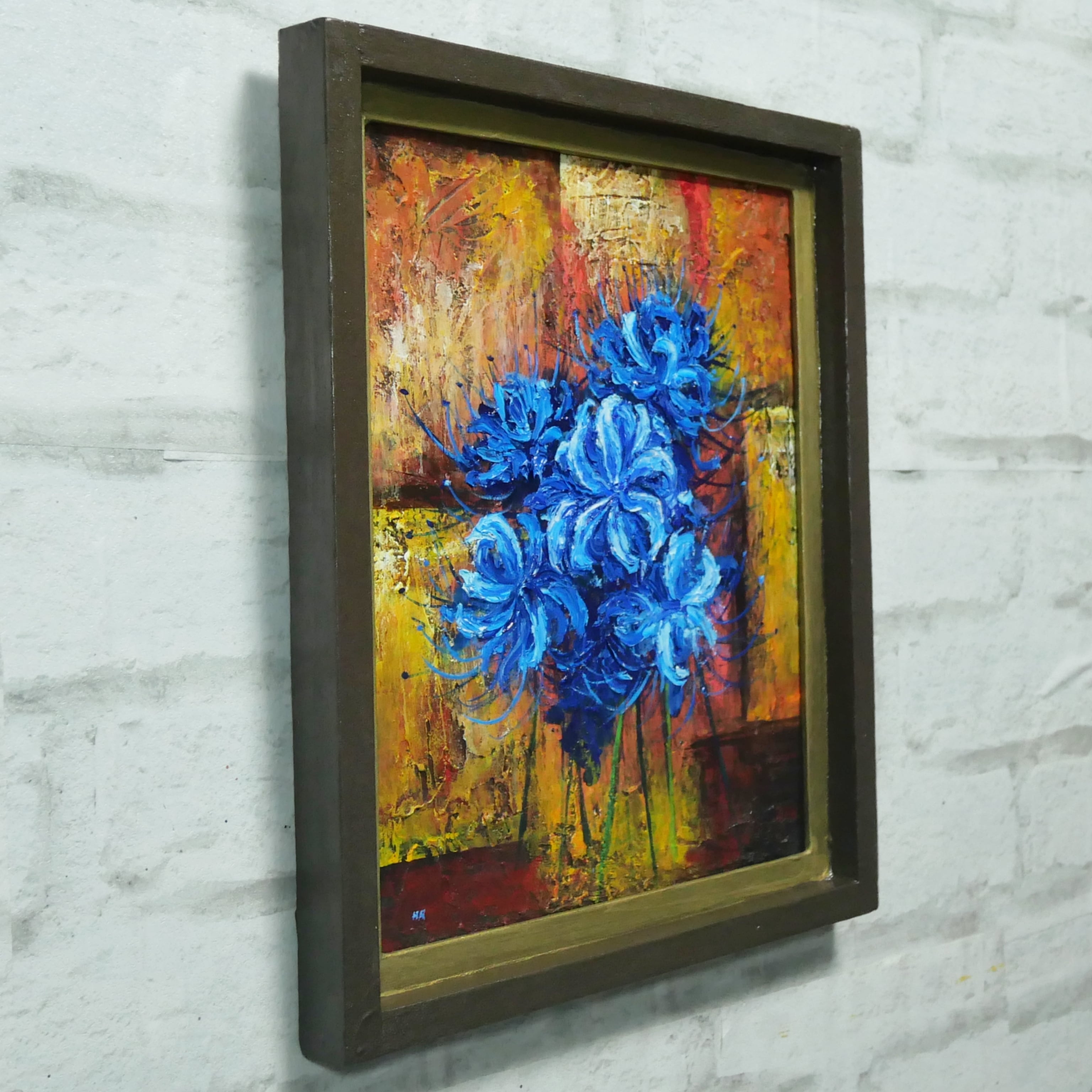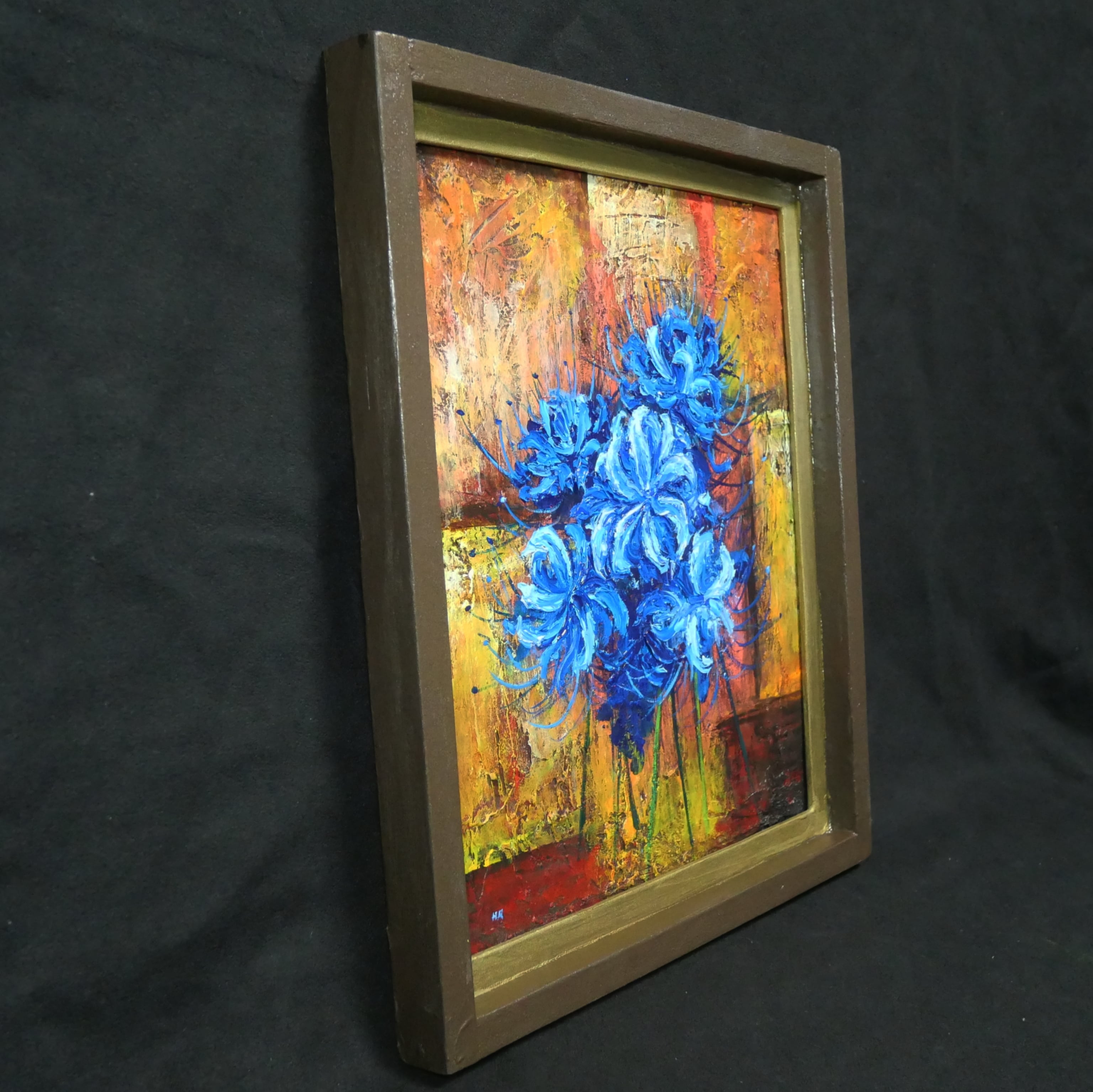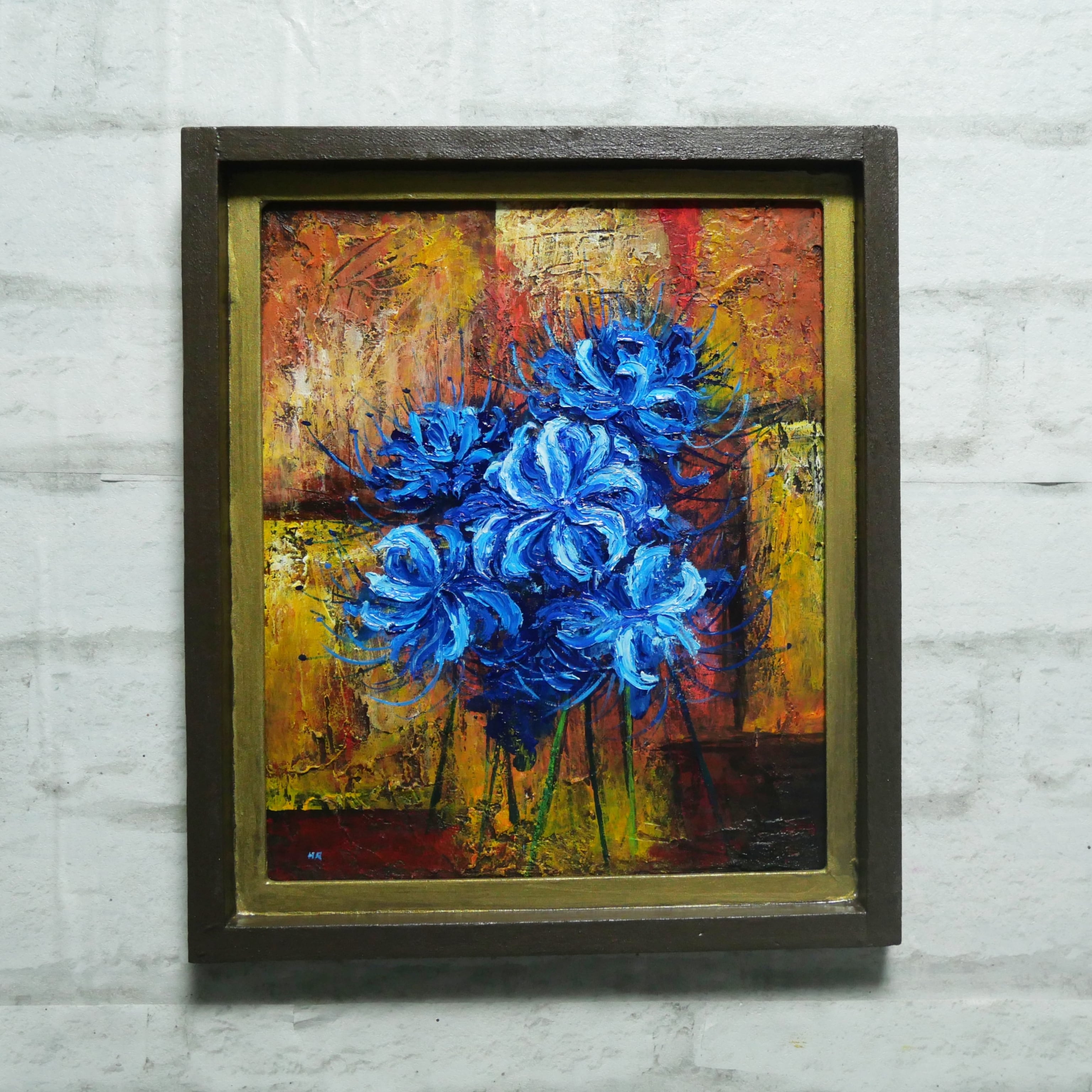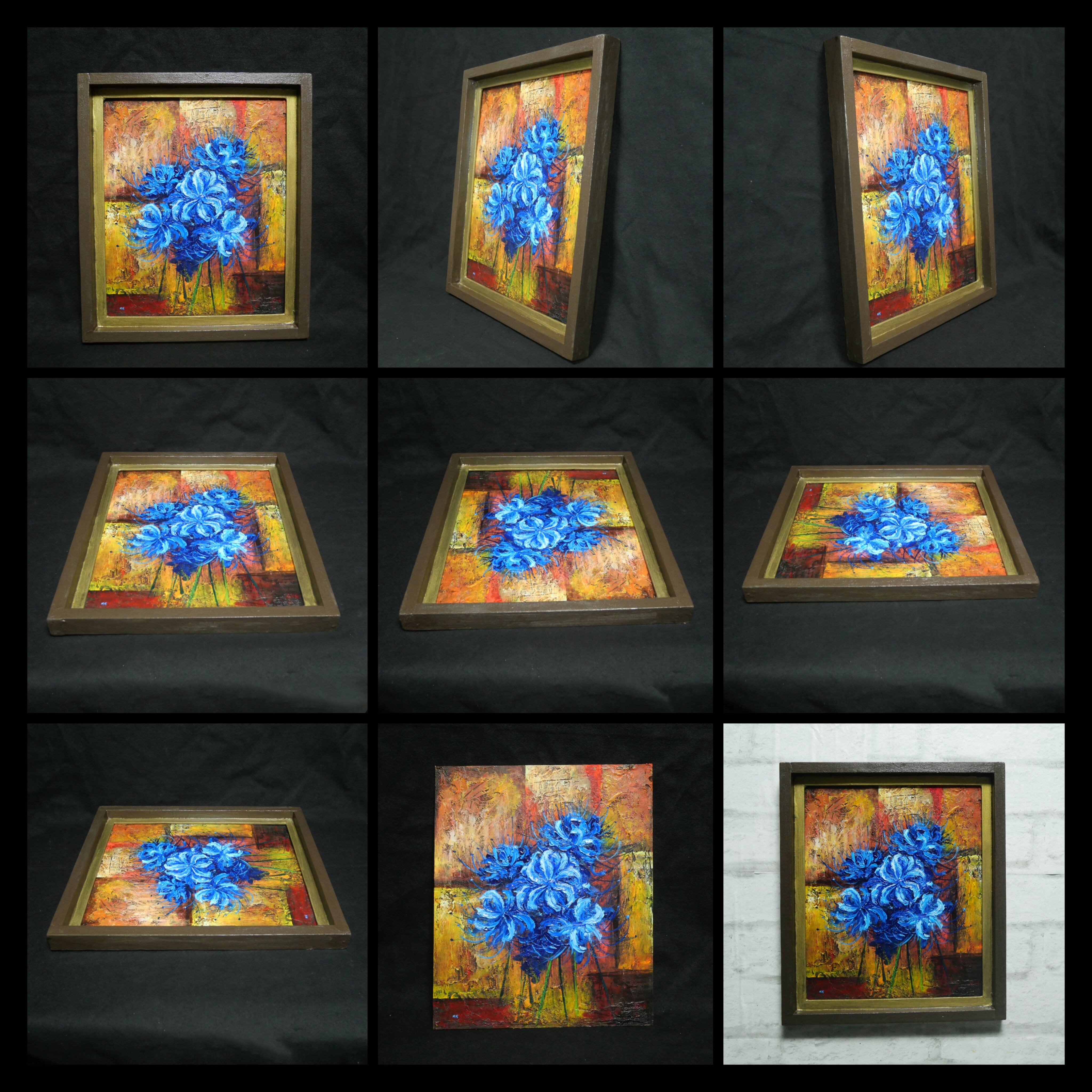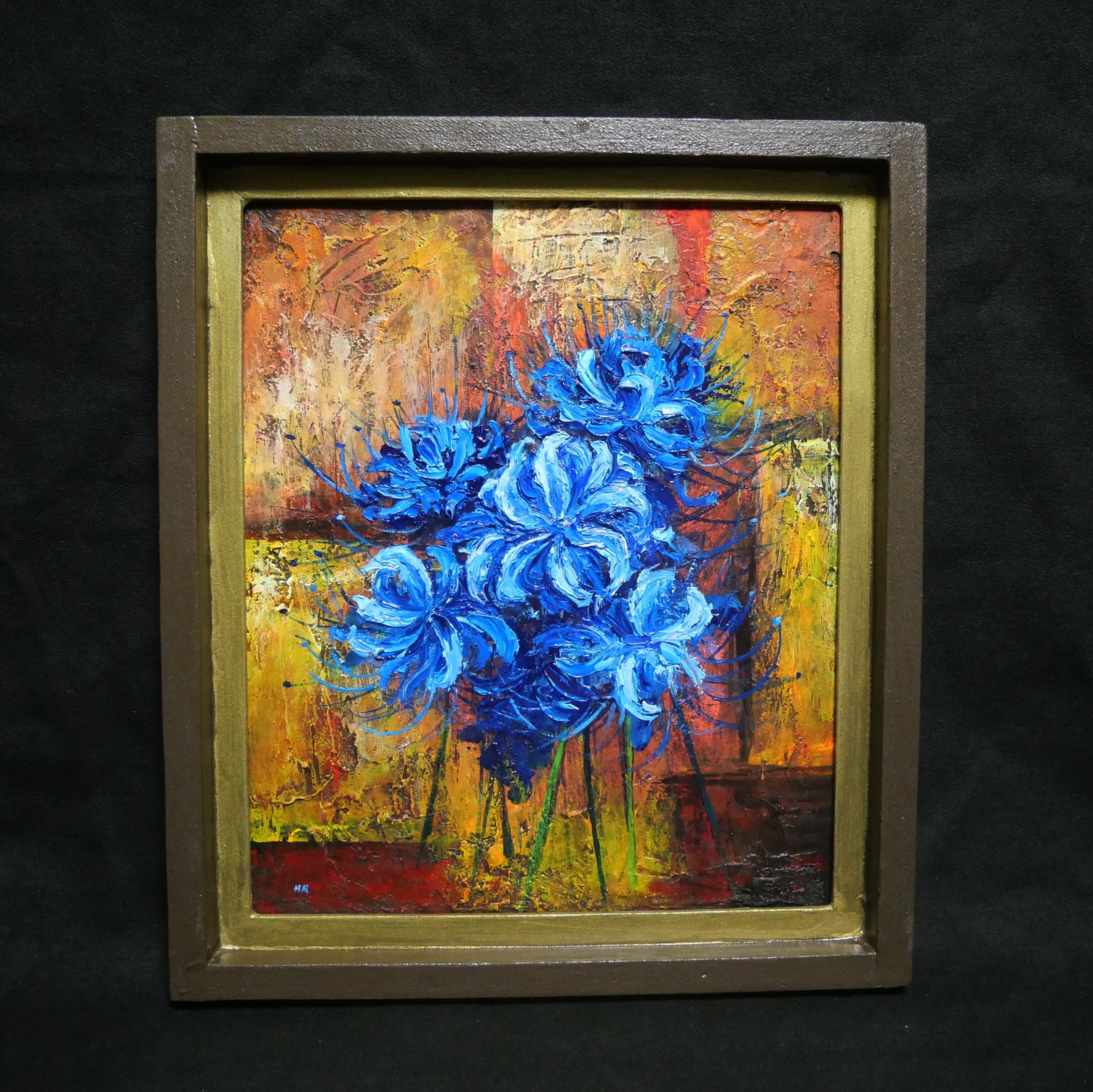 「青い彼岸花」は、鮮やかな青い彼岸花をデザインの中心に据え、背景に黄色、茶色、赤色の抽象画を配した特別な油絵作品です。この作品は、青い彼岸花に魅了される方々に最適で、見るたびに心を和ませ、インテリアに華やかな彩りを加えます。