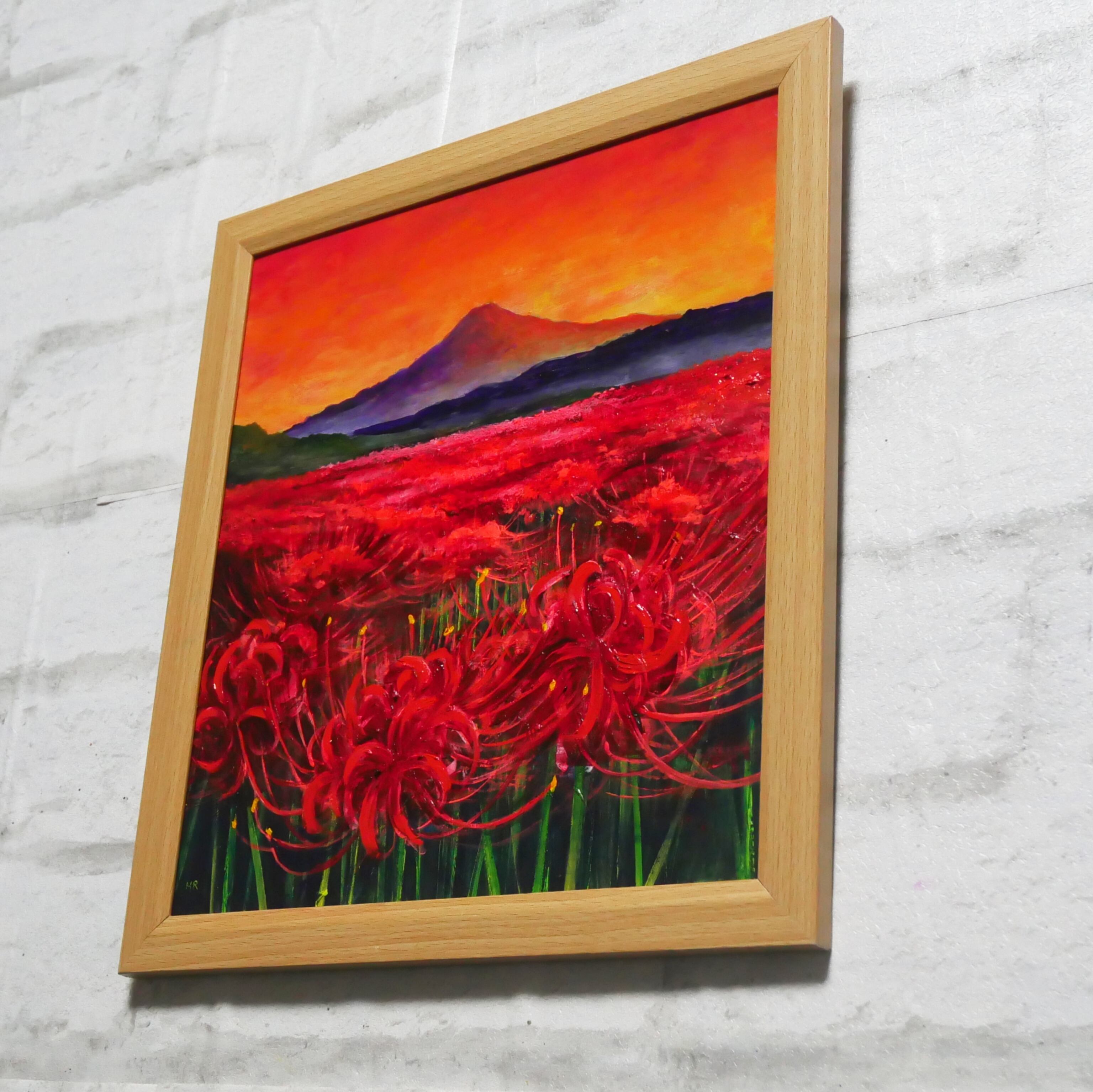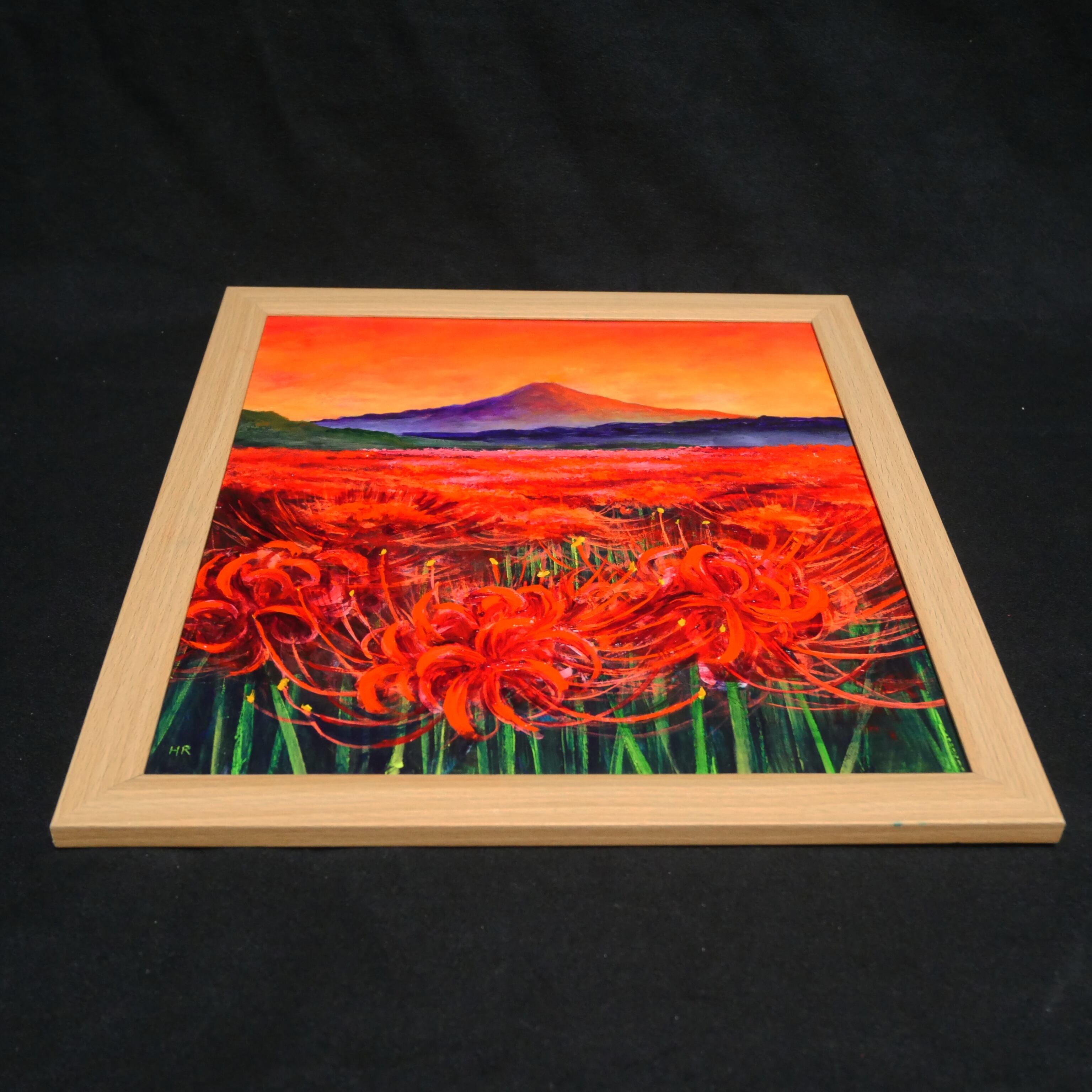 「秋日和(あきびより)」は、興徳寺から見える夕日と富士山、そして赤い彼岸花畑を描いた特別な油絵作品です。この作品は、夕日や富士山、彼岸花の美しさを愛する方々に最適で、見るたびに心を癒し、お部屋に穏やかな秋の風情を添えます。