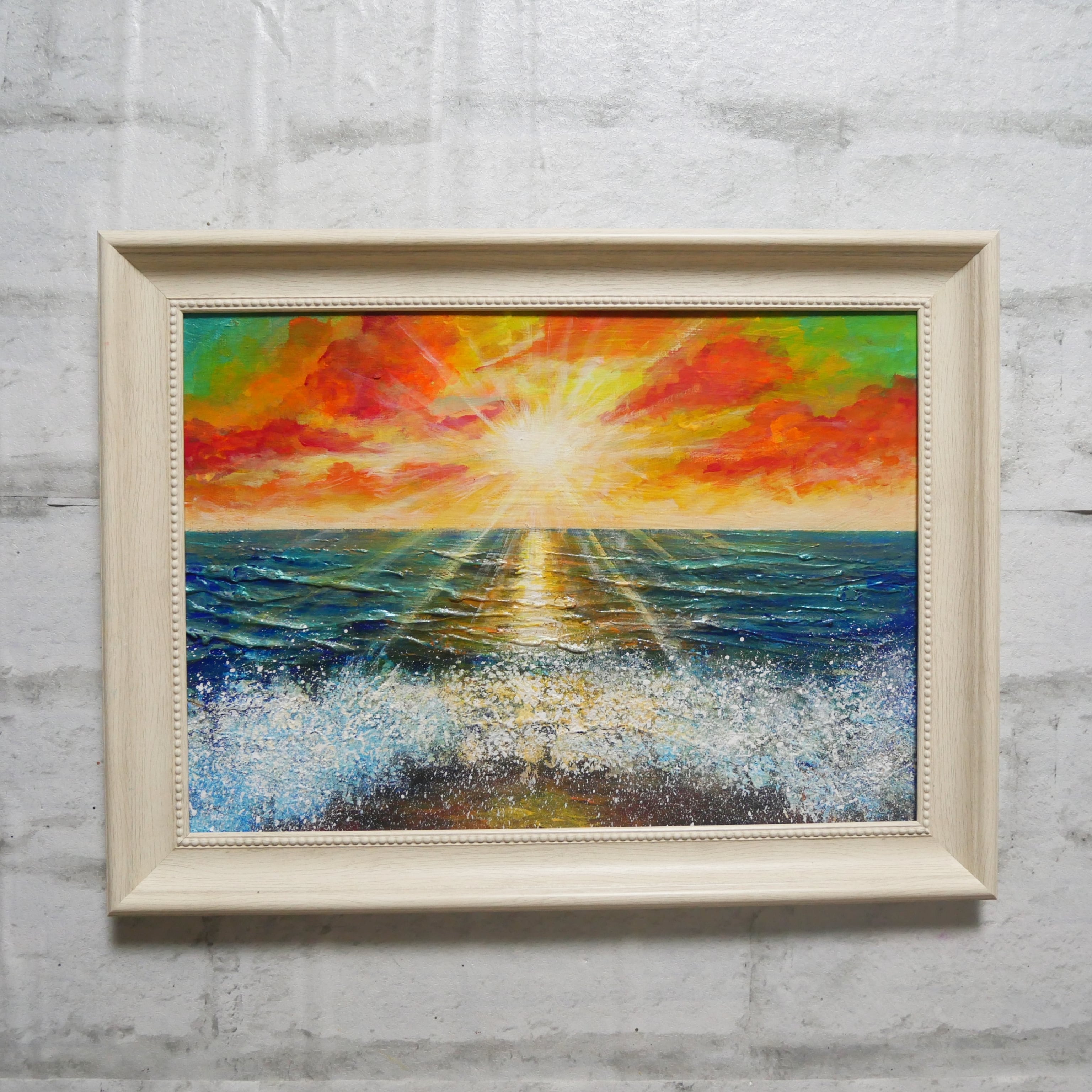 「癒しの朝焼けの海」は、太陽と海、そして津波の力強さを描き出した美しい油絵作品です。朝焼けの温かみと海の穏やかさが融合したこの作品は、朝焼けと海を愛する方に特におすすめです。見るたびに心が癒され、お部屋に爽やかで穏やかな空間を提供します。