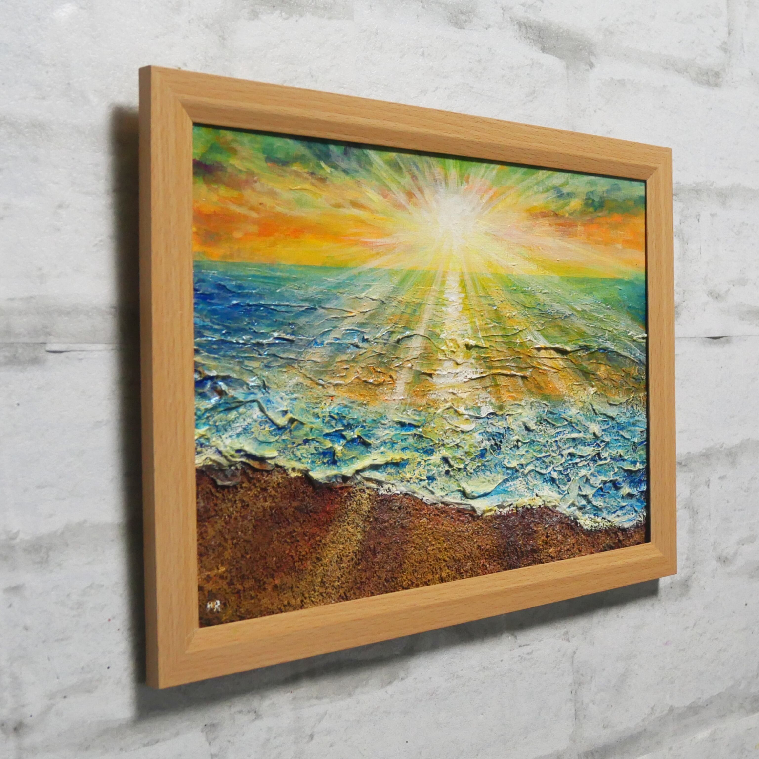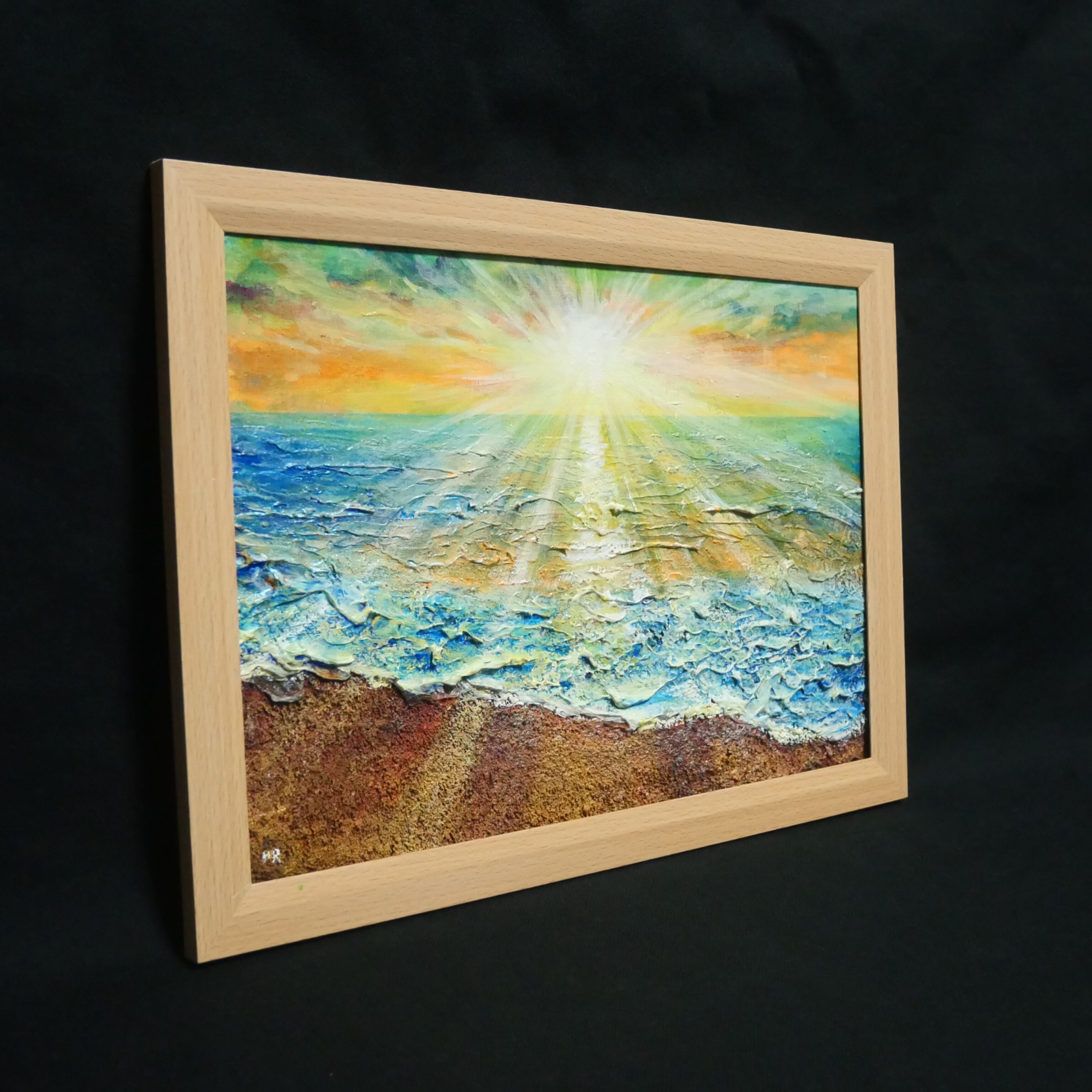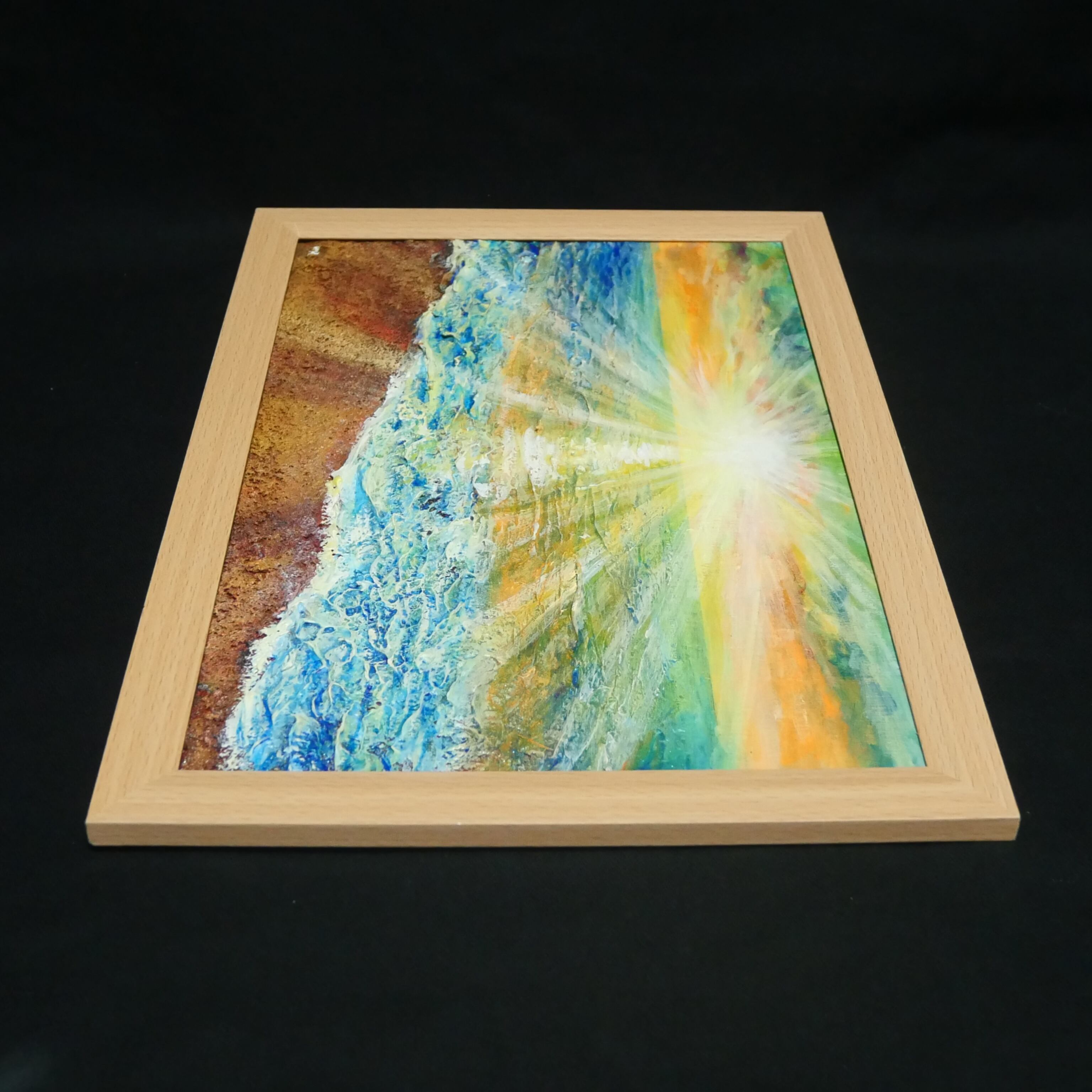 「潮風のまどろむ浜辺で」は、優しい朝焼け光に包まれる静かな海辺を描いた特別な油絵作品です。柔らかい日差しが水面を美しくきらめかせ、心地よい波の音が子守歌のように響く中、静かに目覚める砂浜の幸福を感じられる瞬間を切り取っています。この作品は、海や太陽の光が好きな方に特におすすめです。