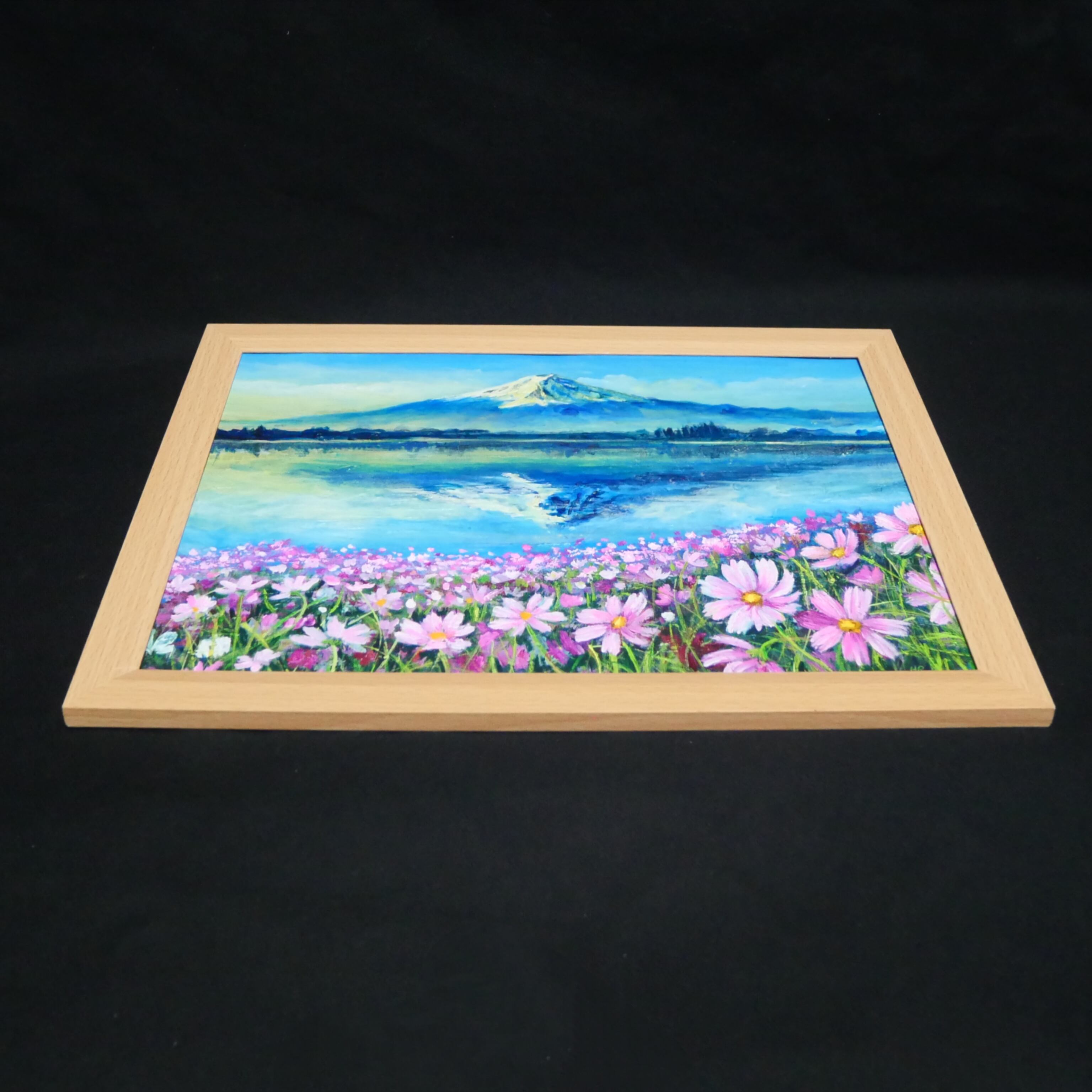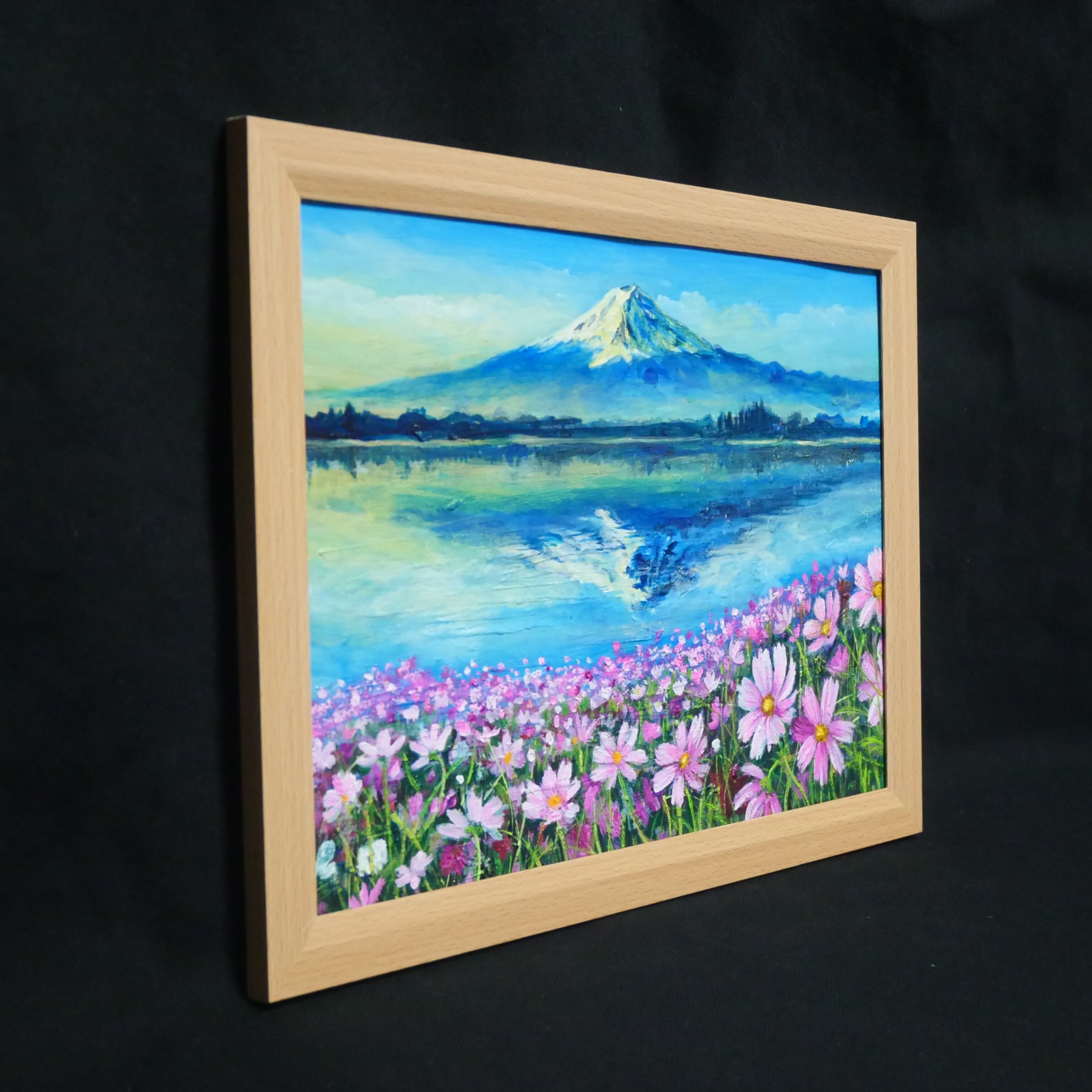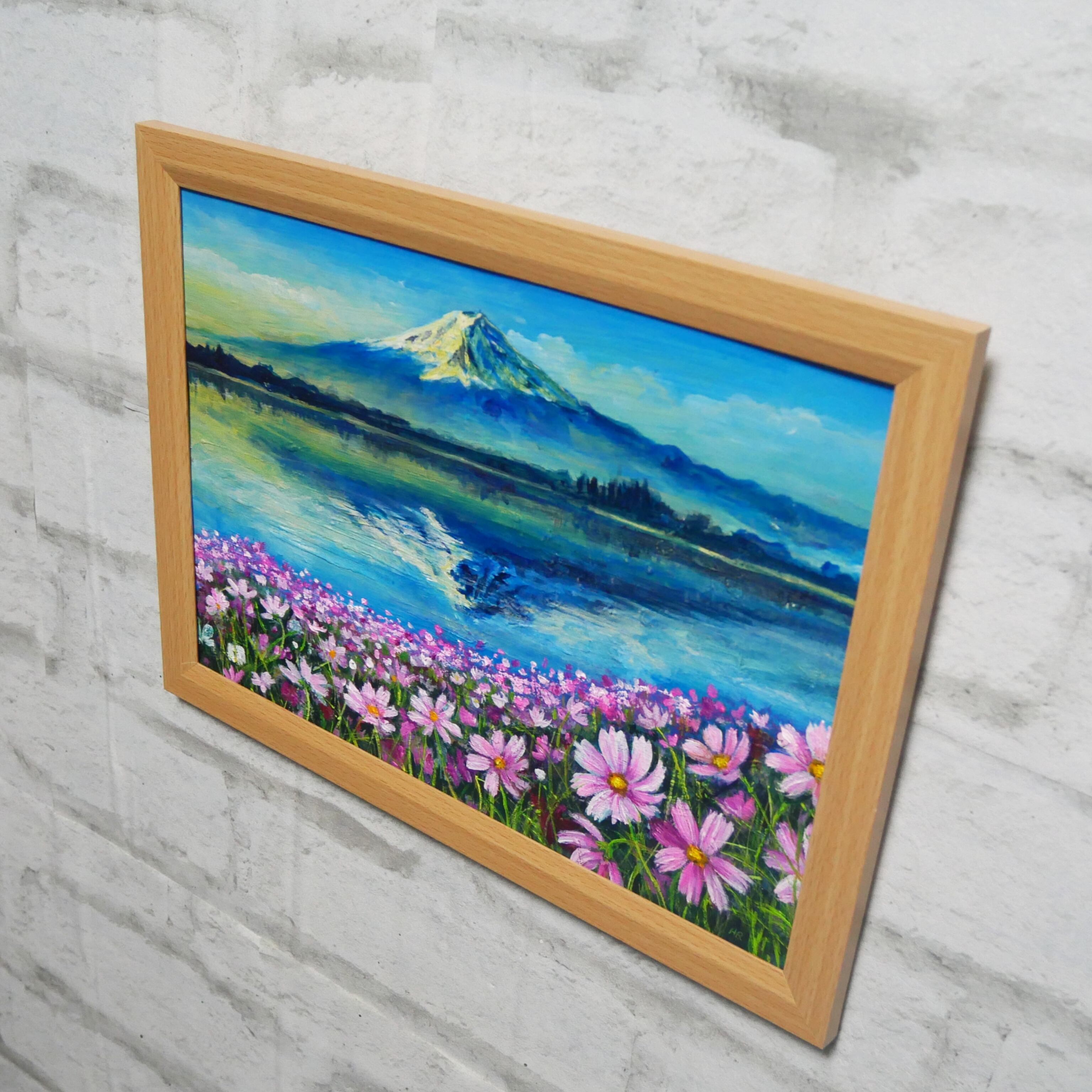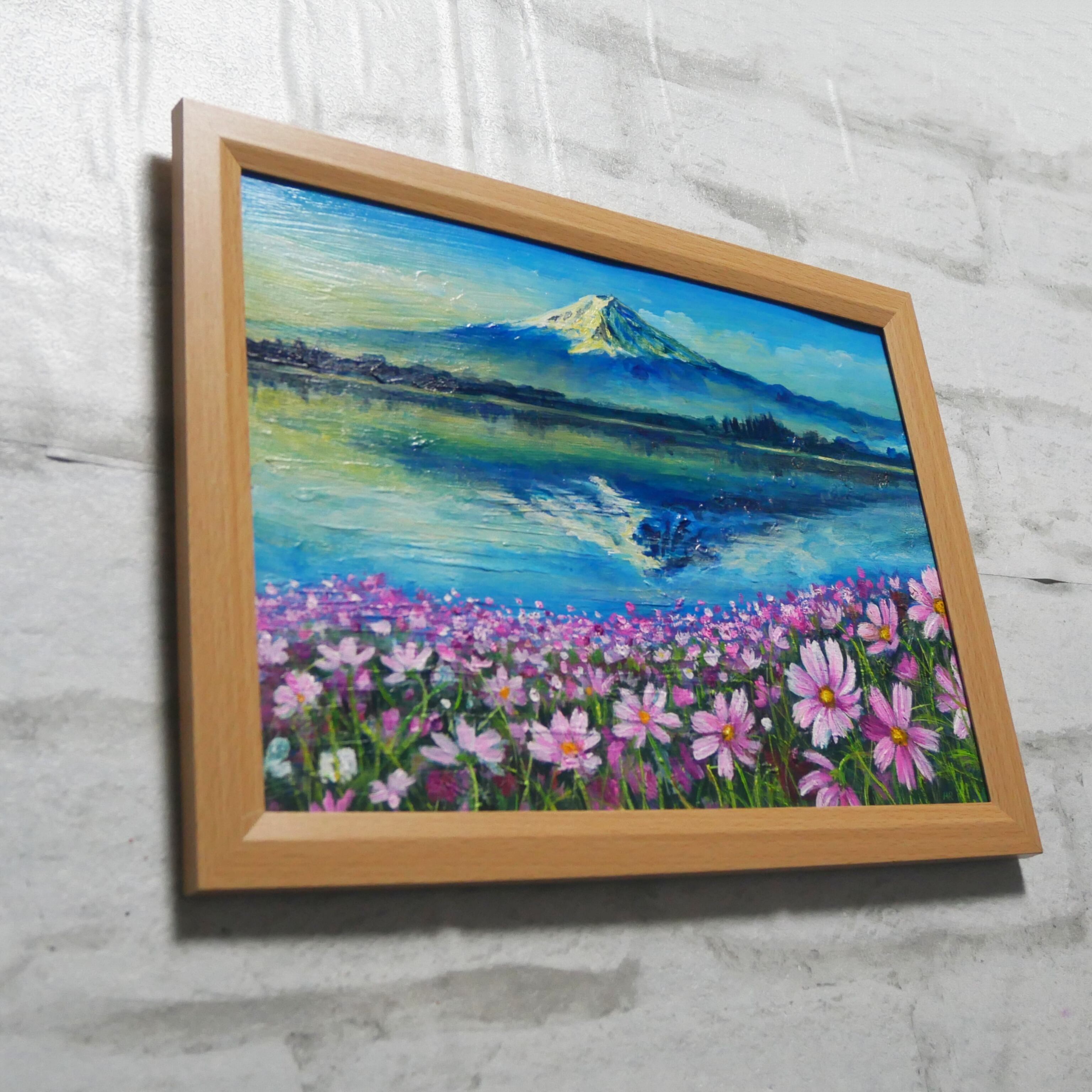 「湖畔の朝の詩(うた)」は、山梨県の山中湖の情景を詩情豊かに描いた特別な油絵作品です。水面に映る壮麗な富士山や、風に揺れる秋桜、逆さ富士が織り成す景色は、見た人の心を奪います。朝焼けの柔らかな光が湖に映り込む様子は、自然の美しさと静けさを大切にした瞬間です。この作品は、湖と富士山の美に魅了される方に特におすすめです。