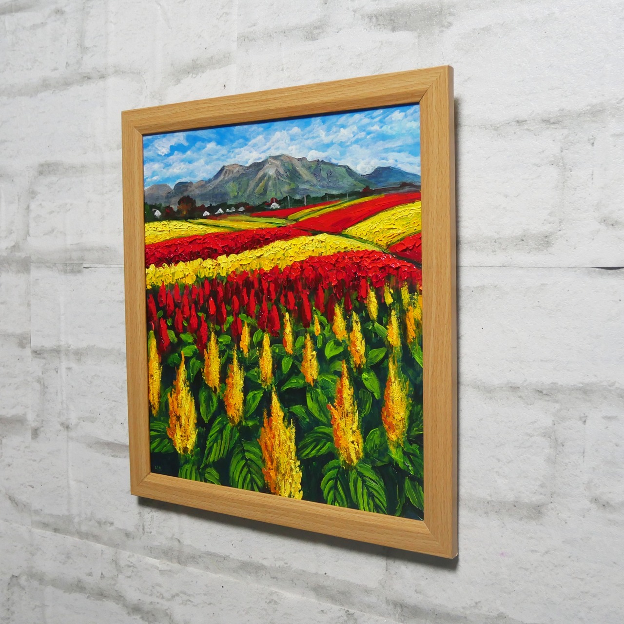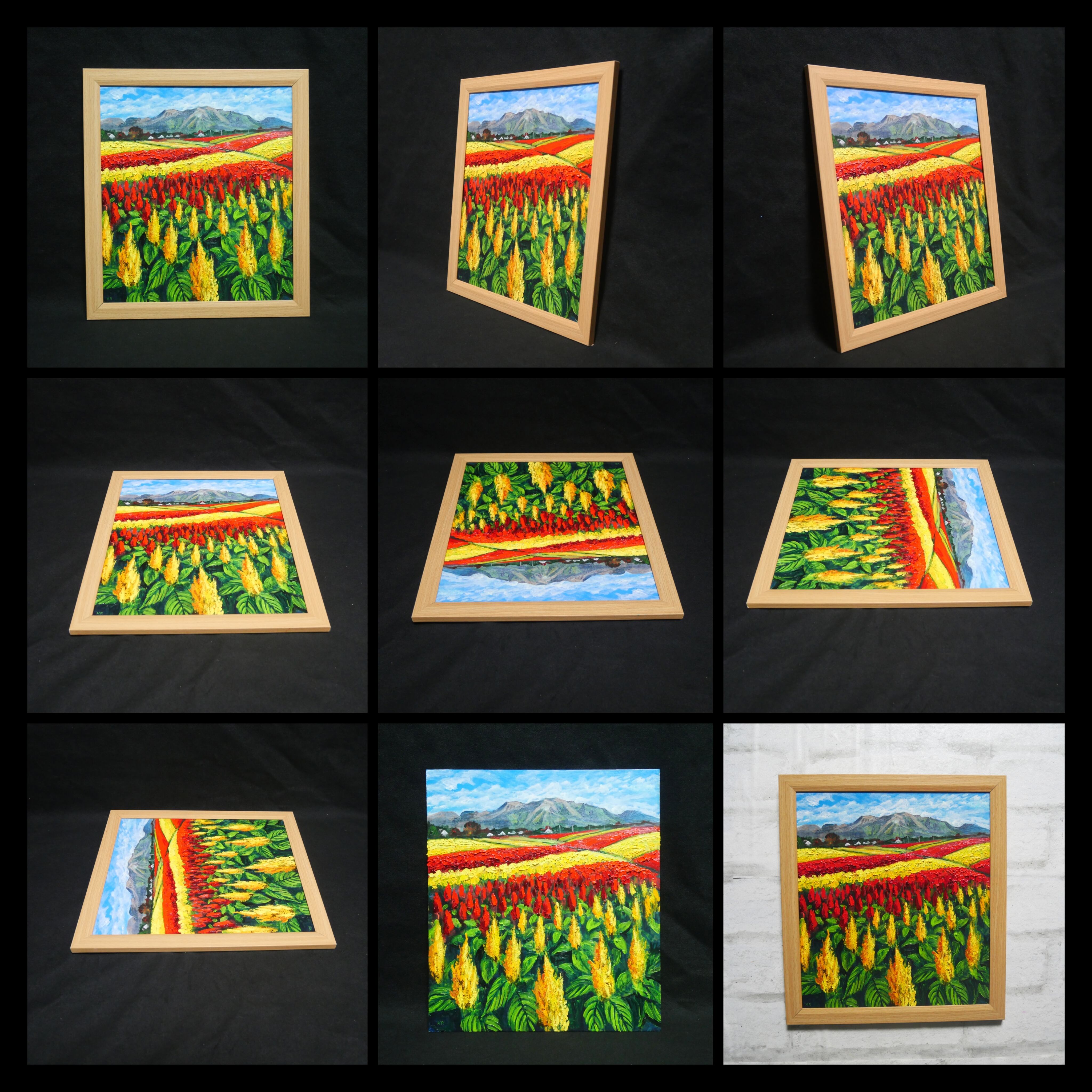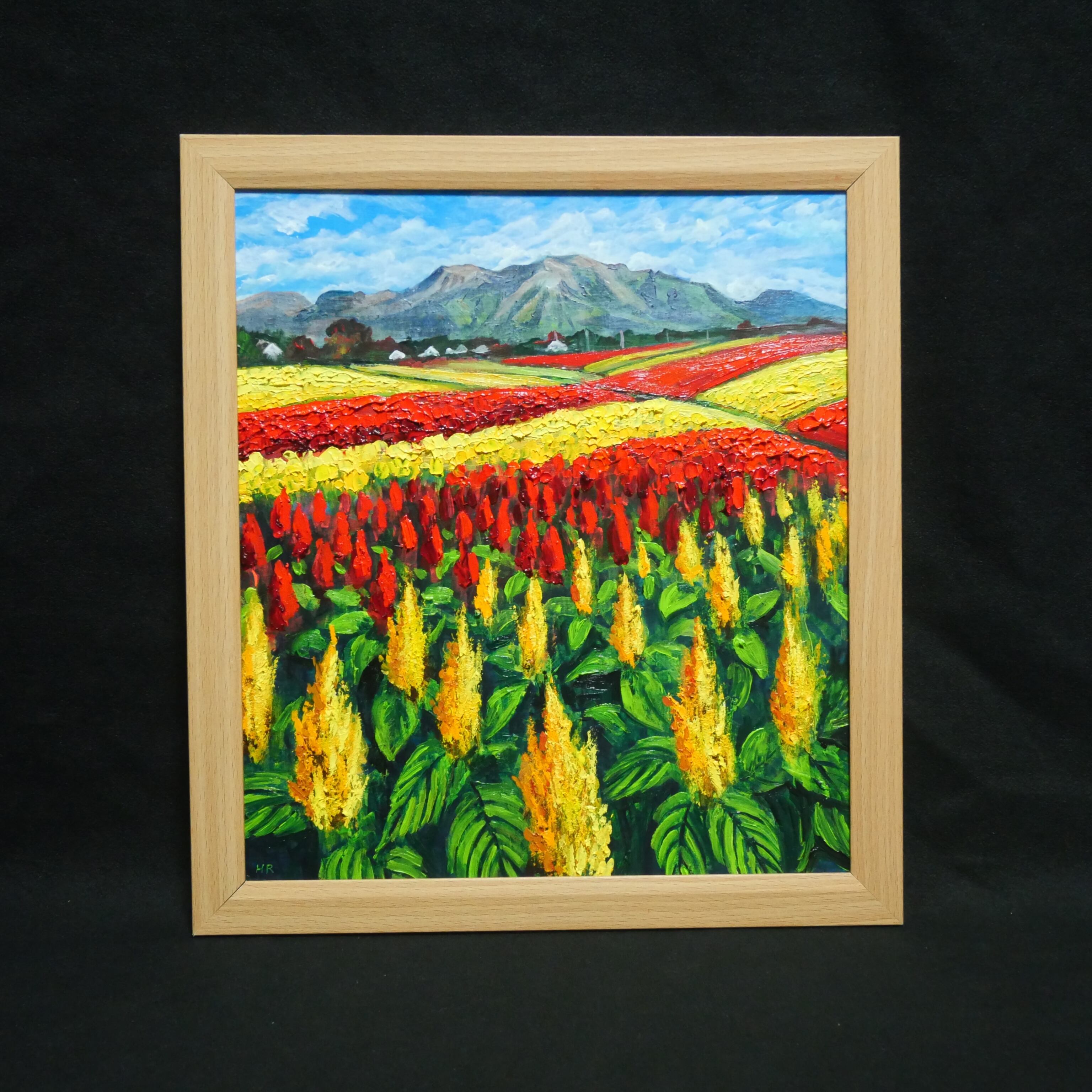 「秋日和のケイトウ」は、くじゅう花公園の秋に咲き誇るケイトウをテーマにした特別な油絵作品です。広大な敷地で、風に揺れる色とりどりのケイトウが、まるで炎のように生き生きと描かれています。赤や黄の鮮烈な色彩が秋の空気を一層彩り、訪れる人々の心を惹きつける瞬間を逃すことはできません。この作品は、見る者に秋の豊かさと大自然の美しさを感じさせ、心に温かな感動をもたらします。