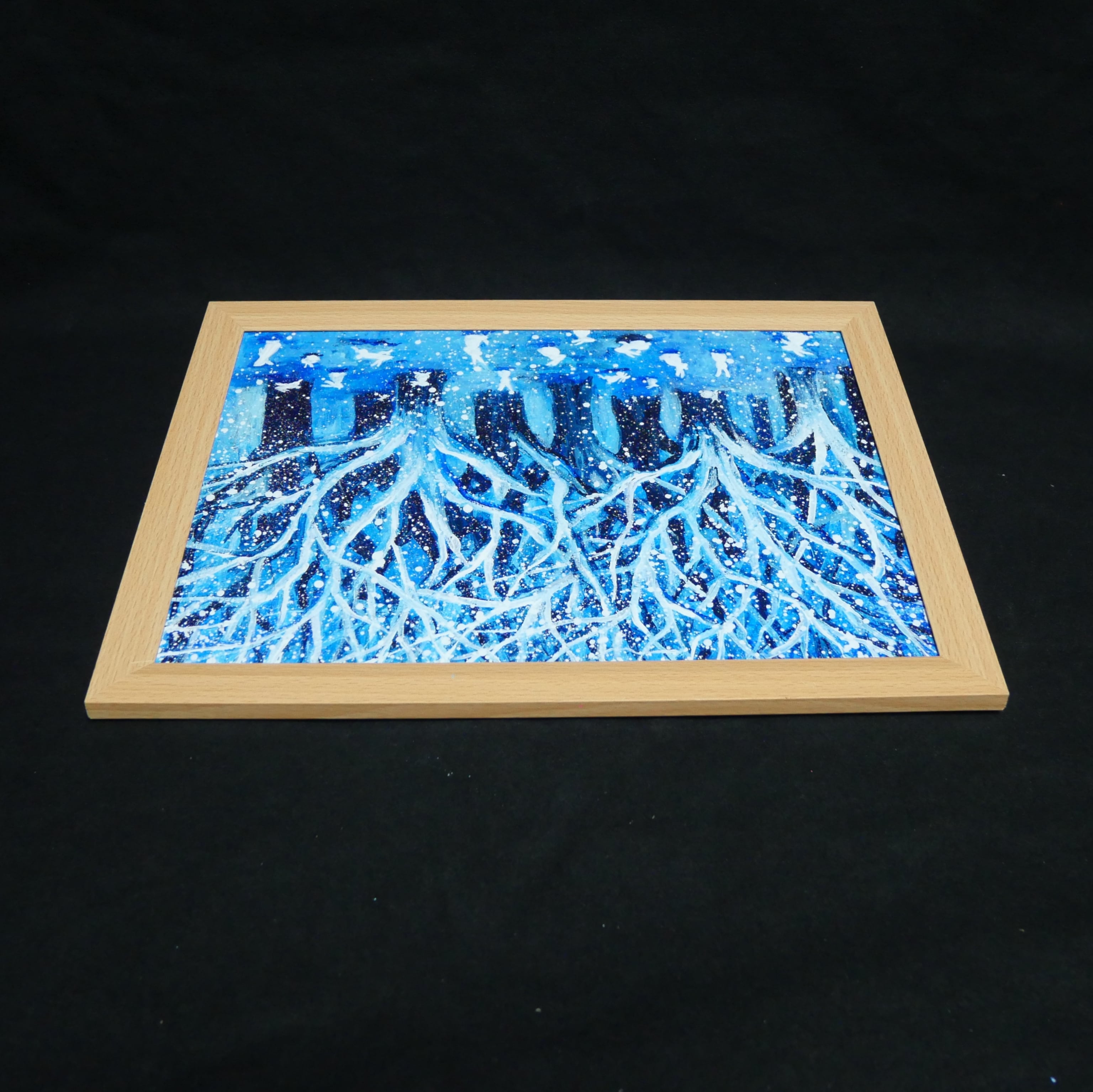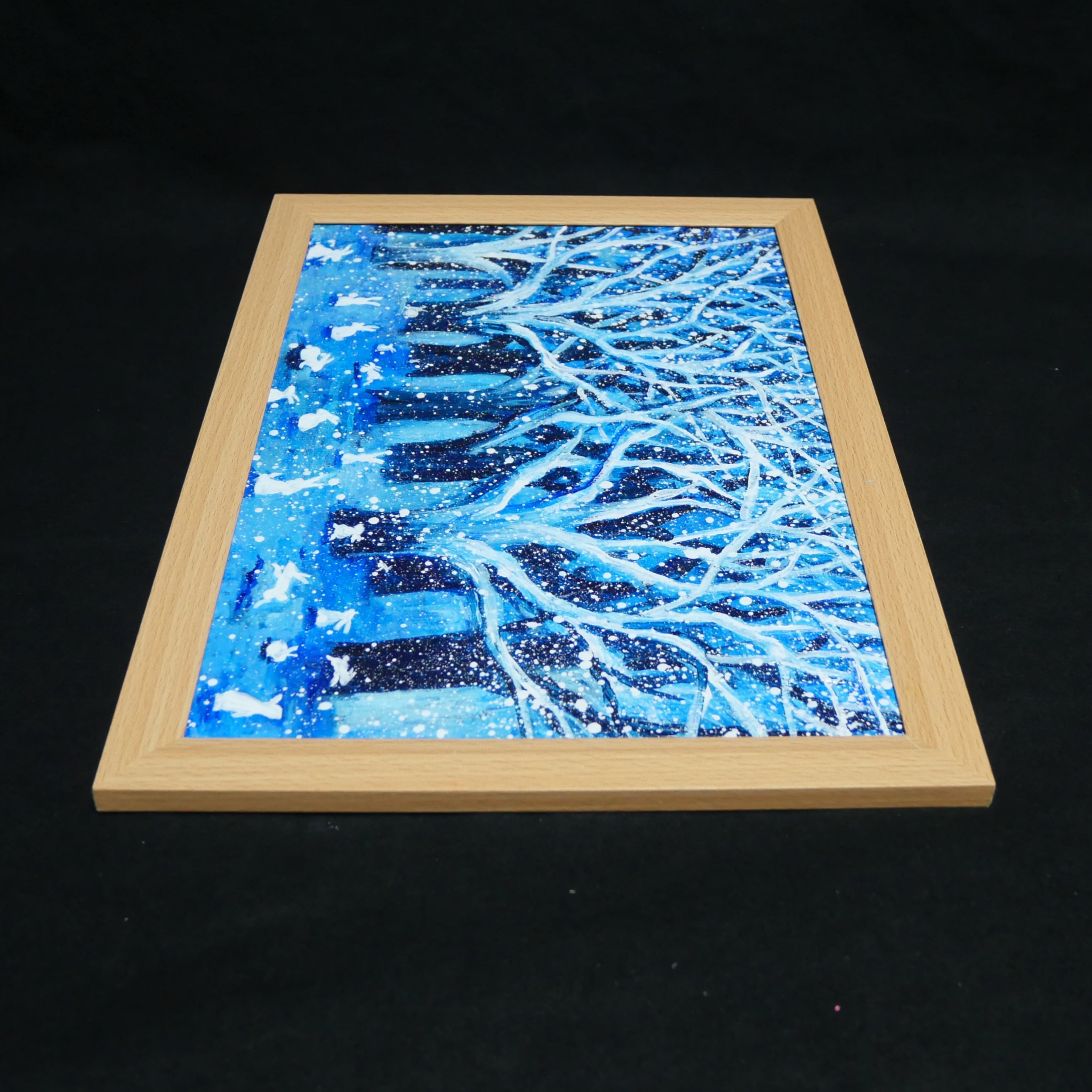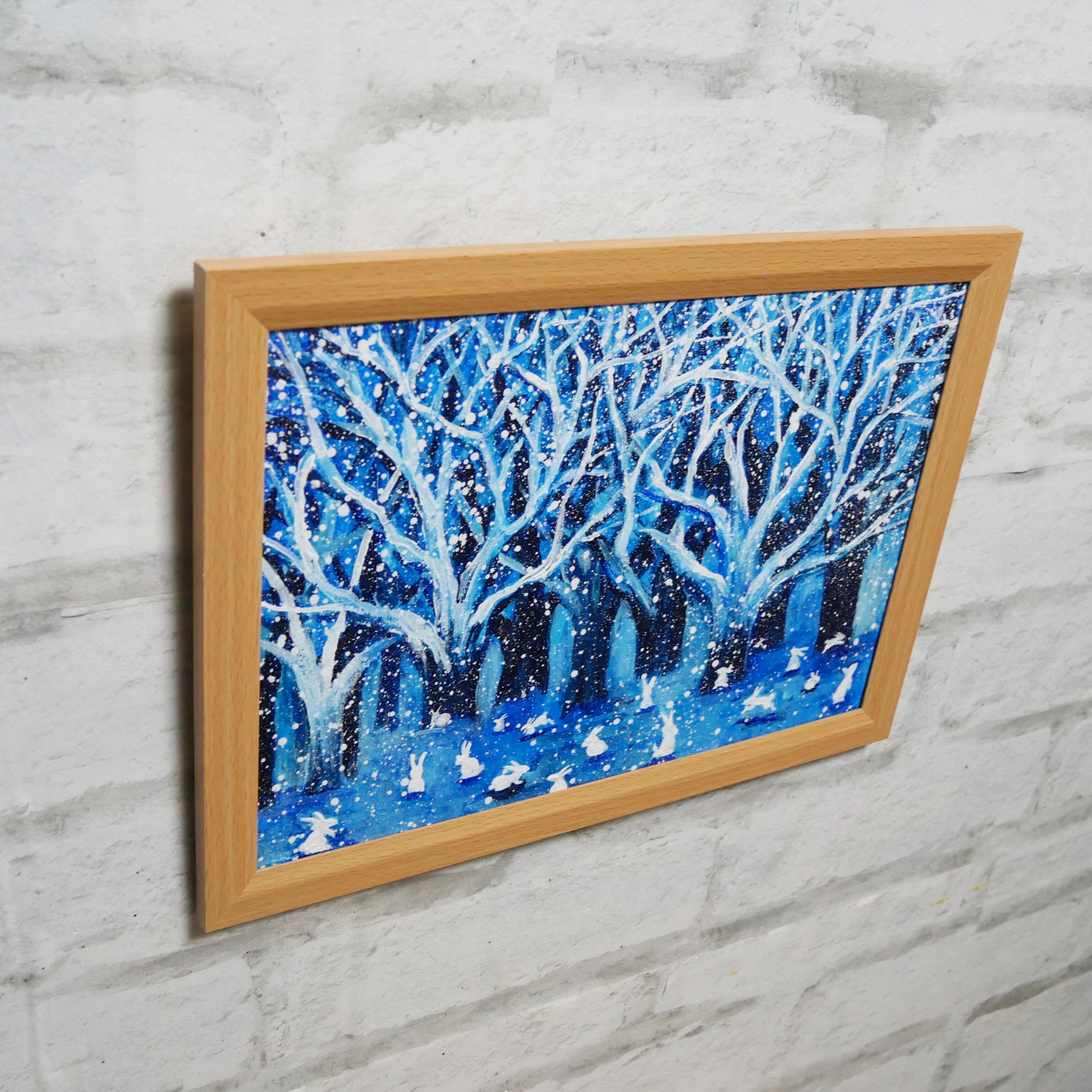 こちらの油絵は、縦210mm × 横297mmのベニヤ板に高級油絵具【ホルベイン】を使用し、一点ずつ丁寧に手描きで制作されています。「冬の林と兎たち」は、大切な方への贈り物や冬のインテリアとしても最適です。この美しい作品が、お客様の生活空間に冬の魅力を届けることを願っています。