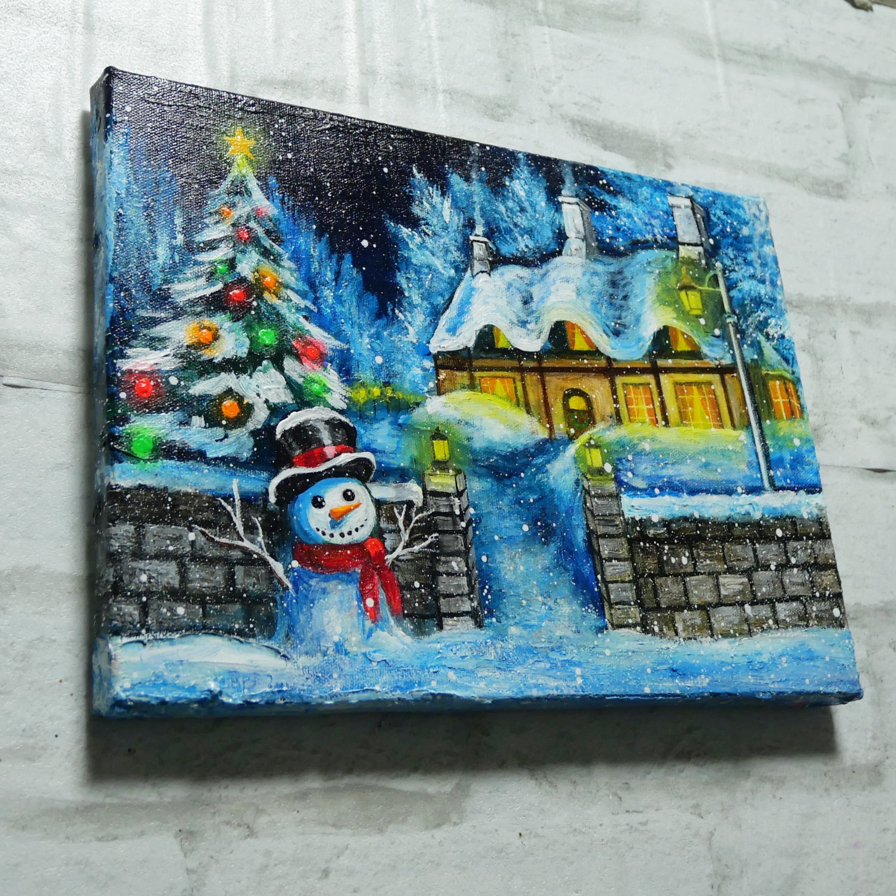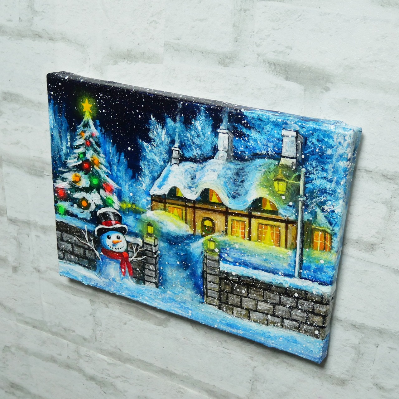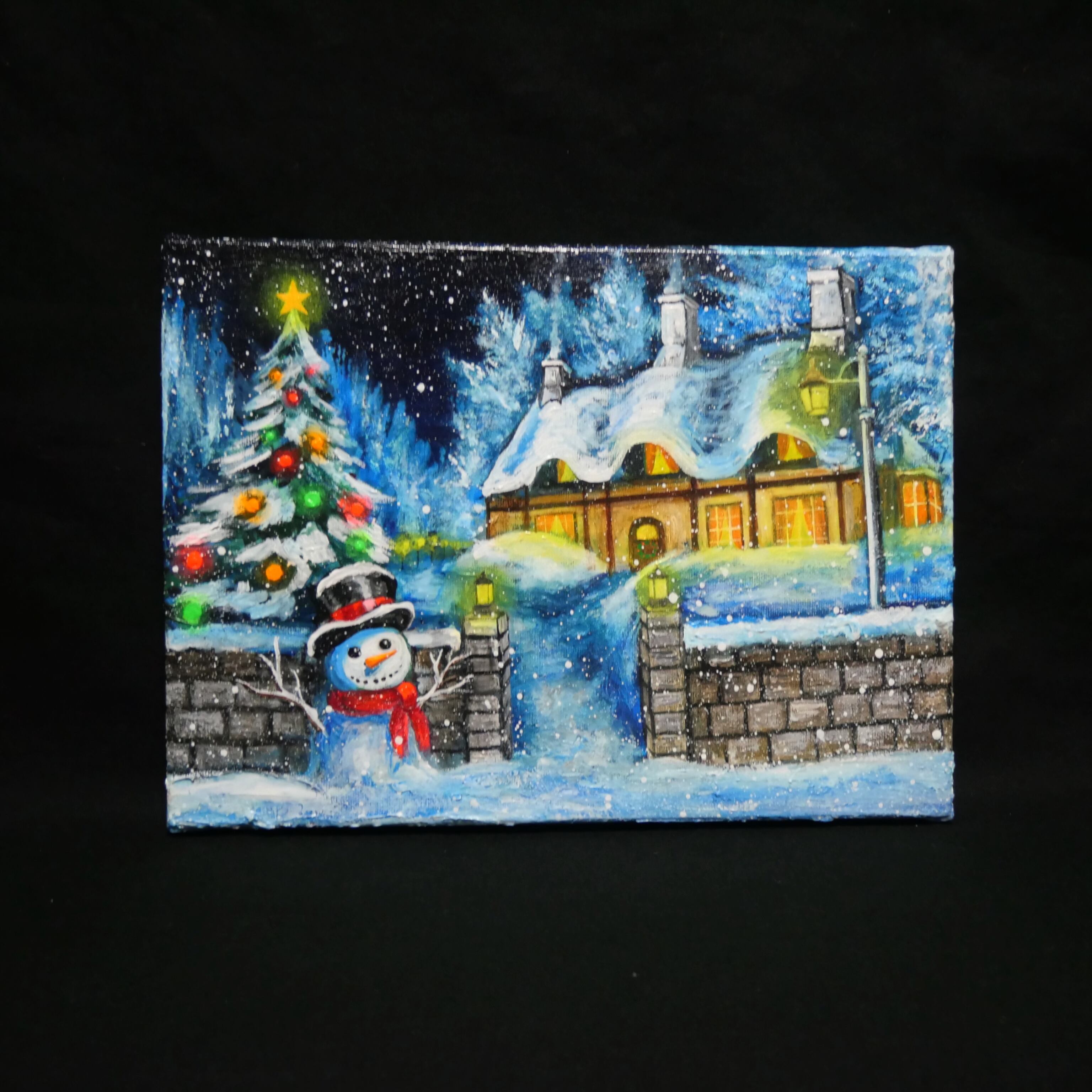 「おとぎの国のホワイトクリスマス」は、冬の幻想的な情景を描いた特別な油絵作品です。F4号のキャンバスに、一面に降り積もる雪と、静寂に包まれたヨーロッパ風の田舎町、そして中心に佇む小さな家が優しく描かれています。夜空から舞い落ちる雪は、まるで時間が止まったかのような静謐な空気を醸し出し、観る人に温かな冬の夢を届けてくれます。