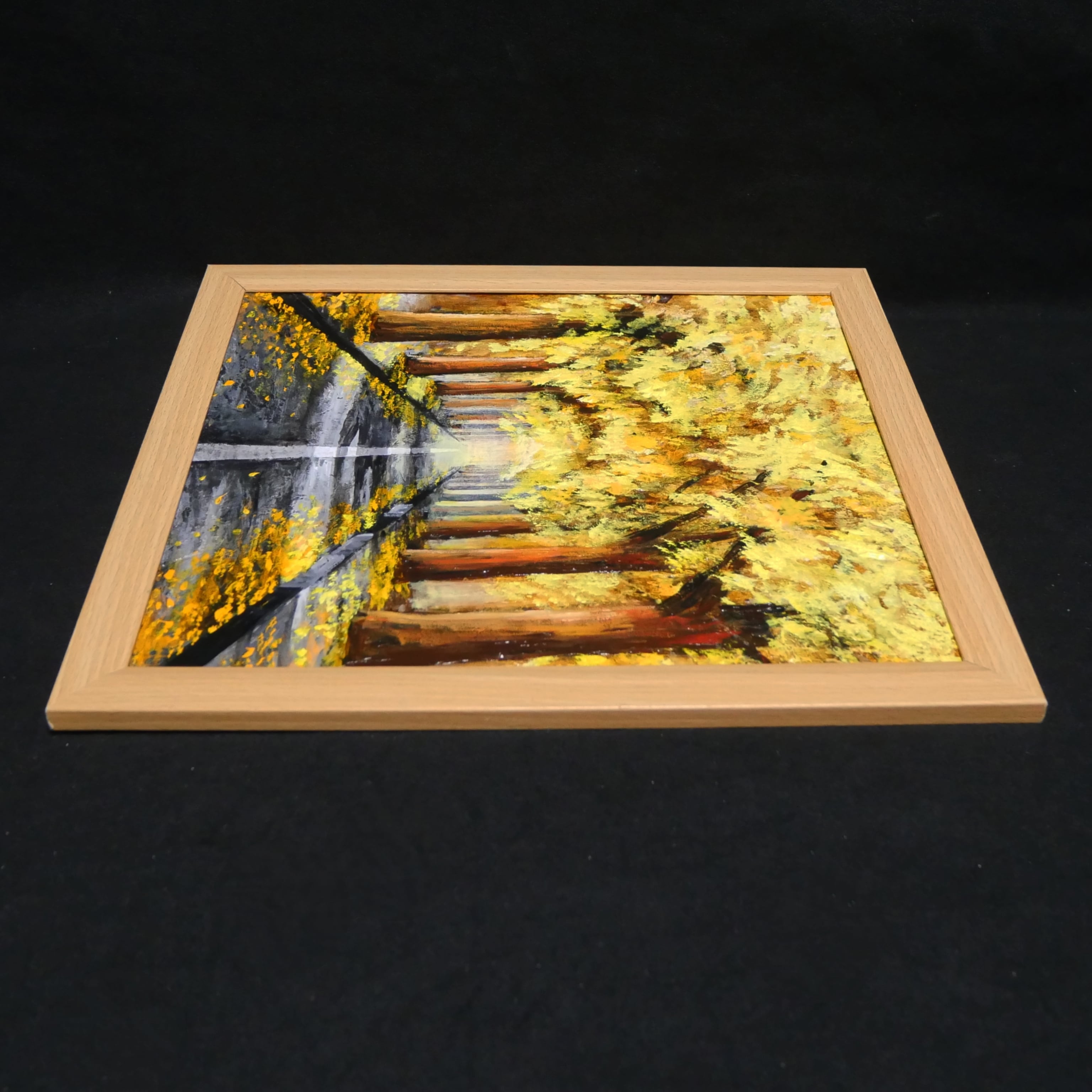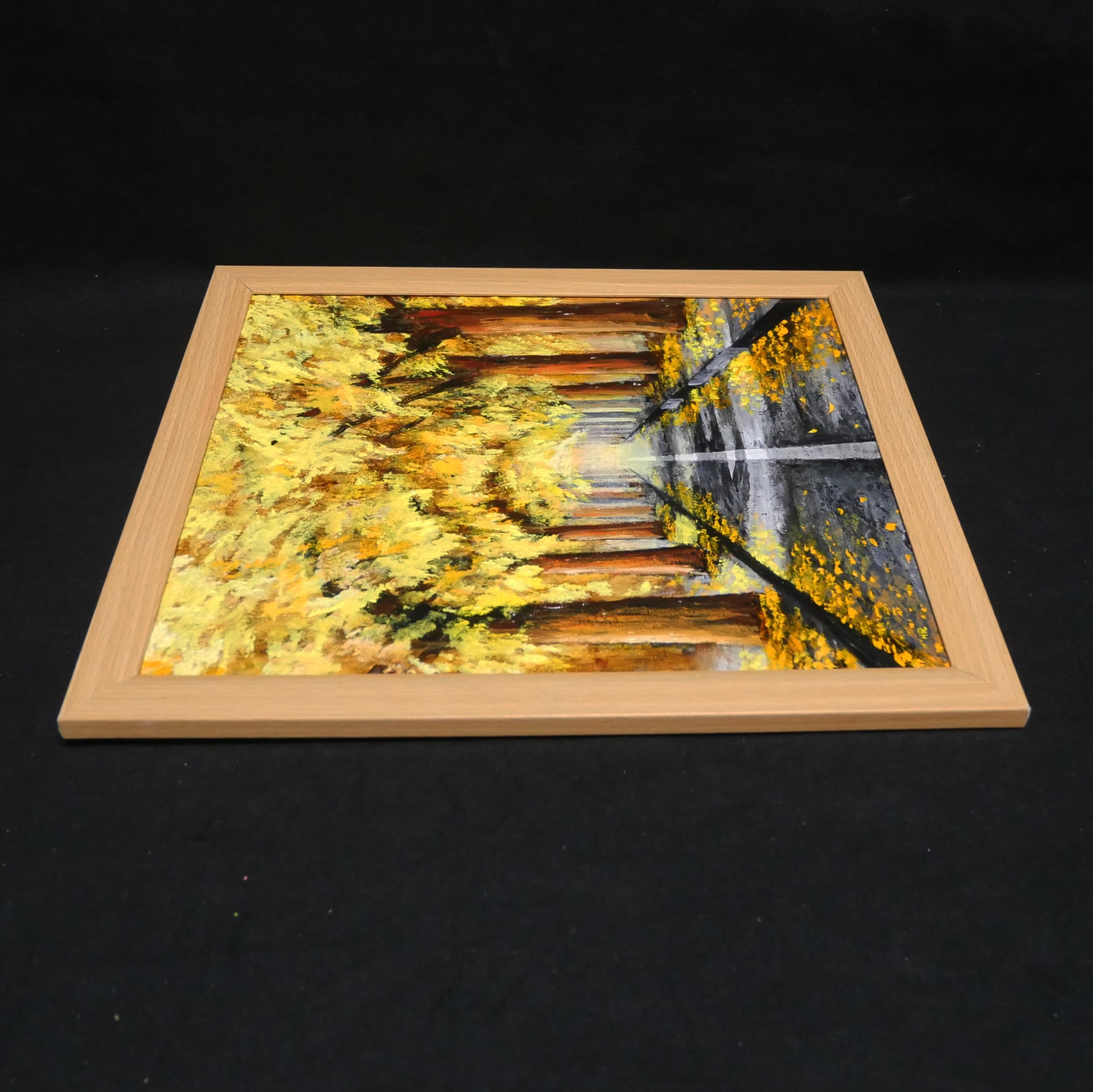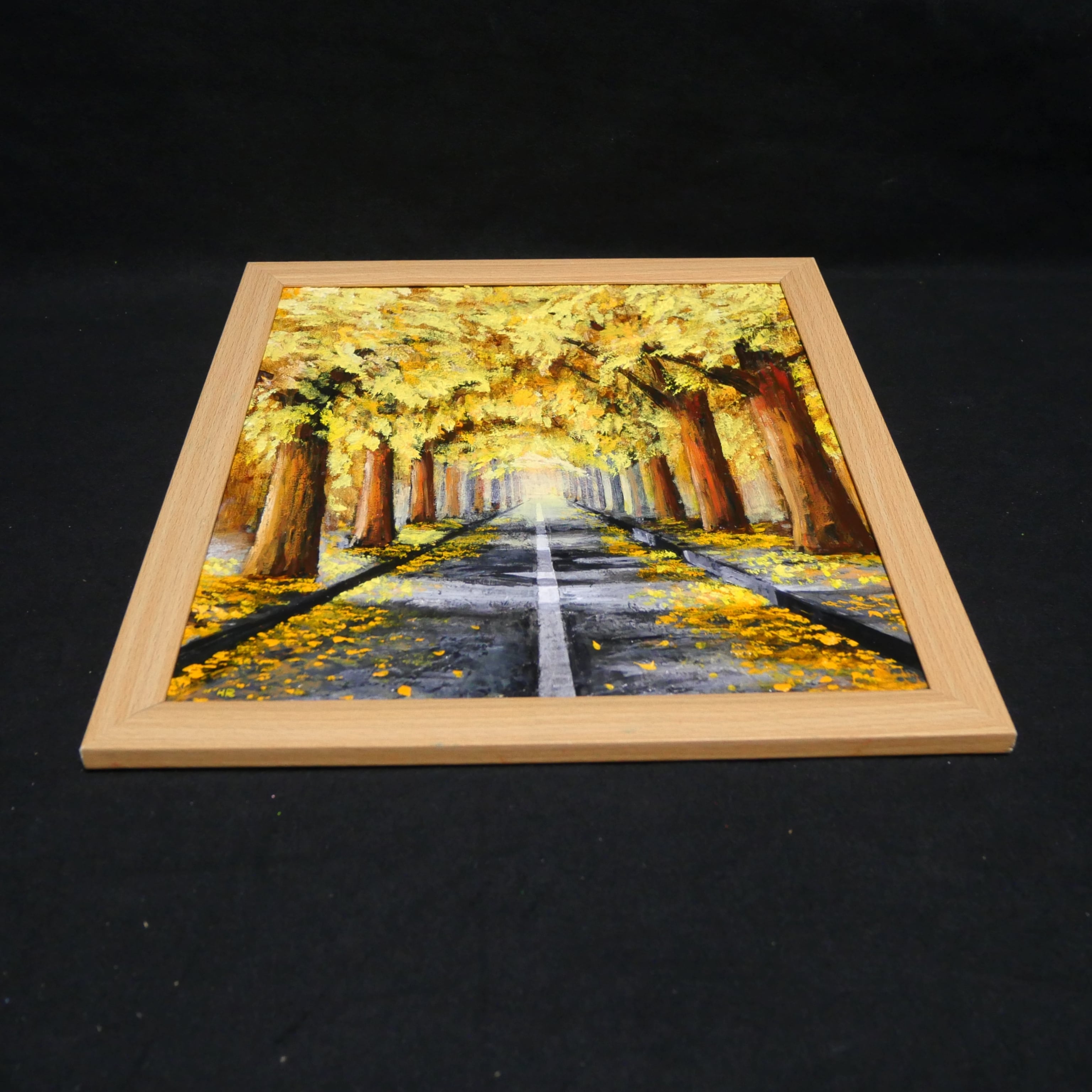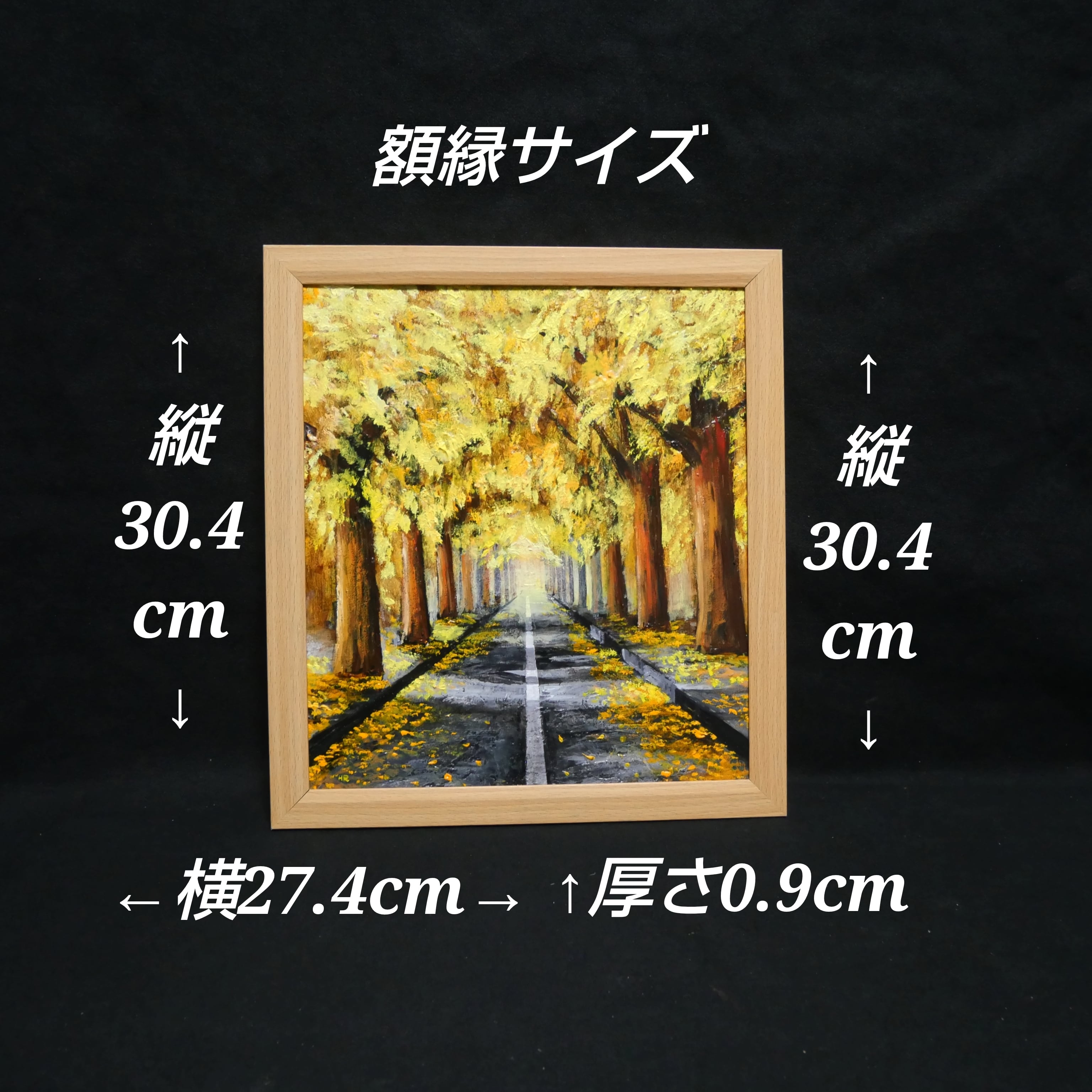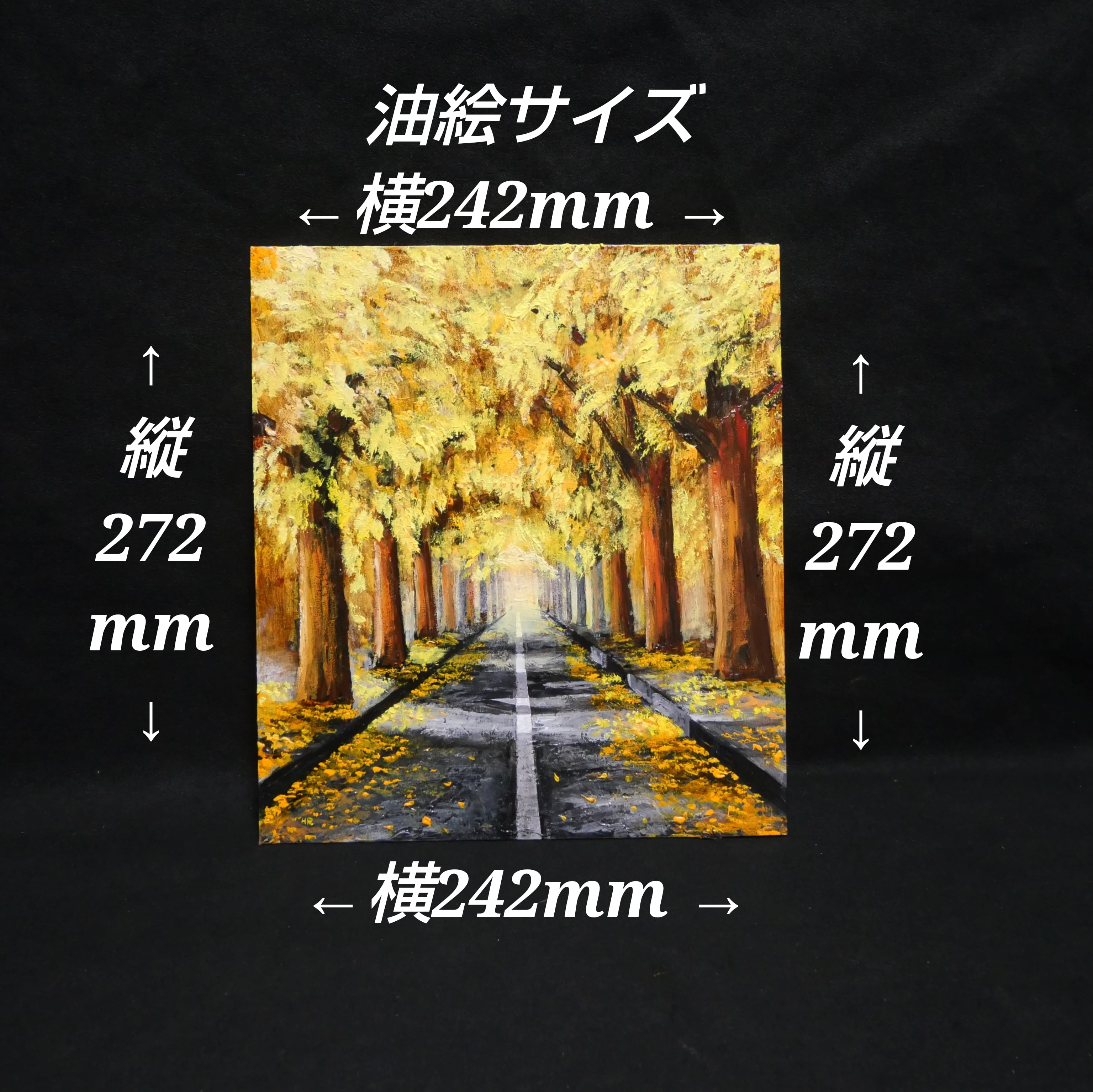 こちらの油絵は、高級油絵具【ホルベイン】を使用し、色紙に丁寧に手描きで制作されています。「黄金色の並木道」は、大切な方へのギフトや特別な日の想い出としても最適です。この美しい作品が、お客様の生活空間に秋の温もりと魅力をもたらすことを願っています。