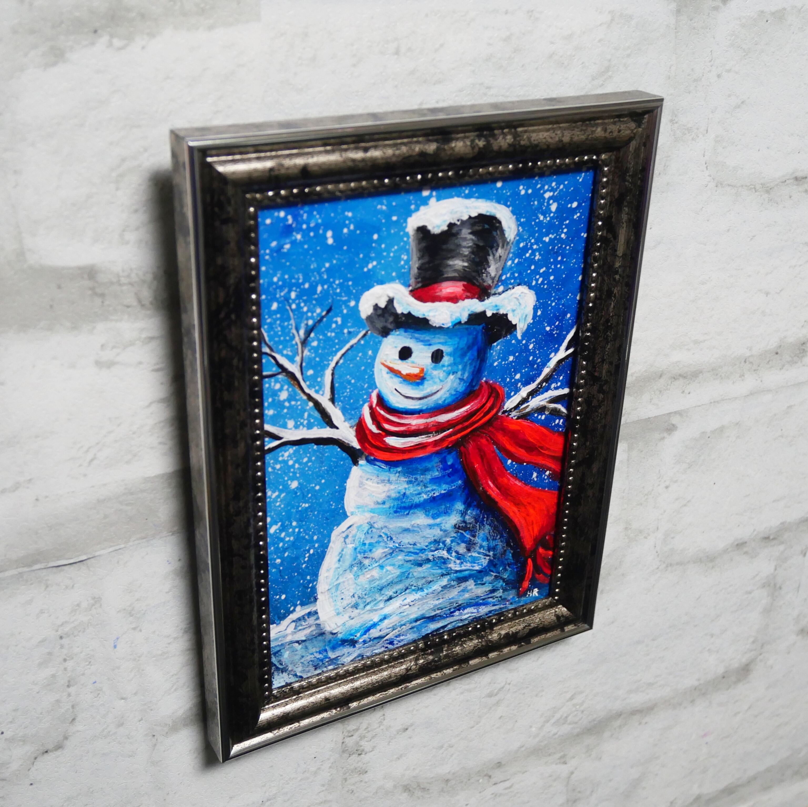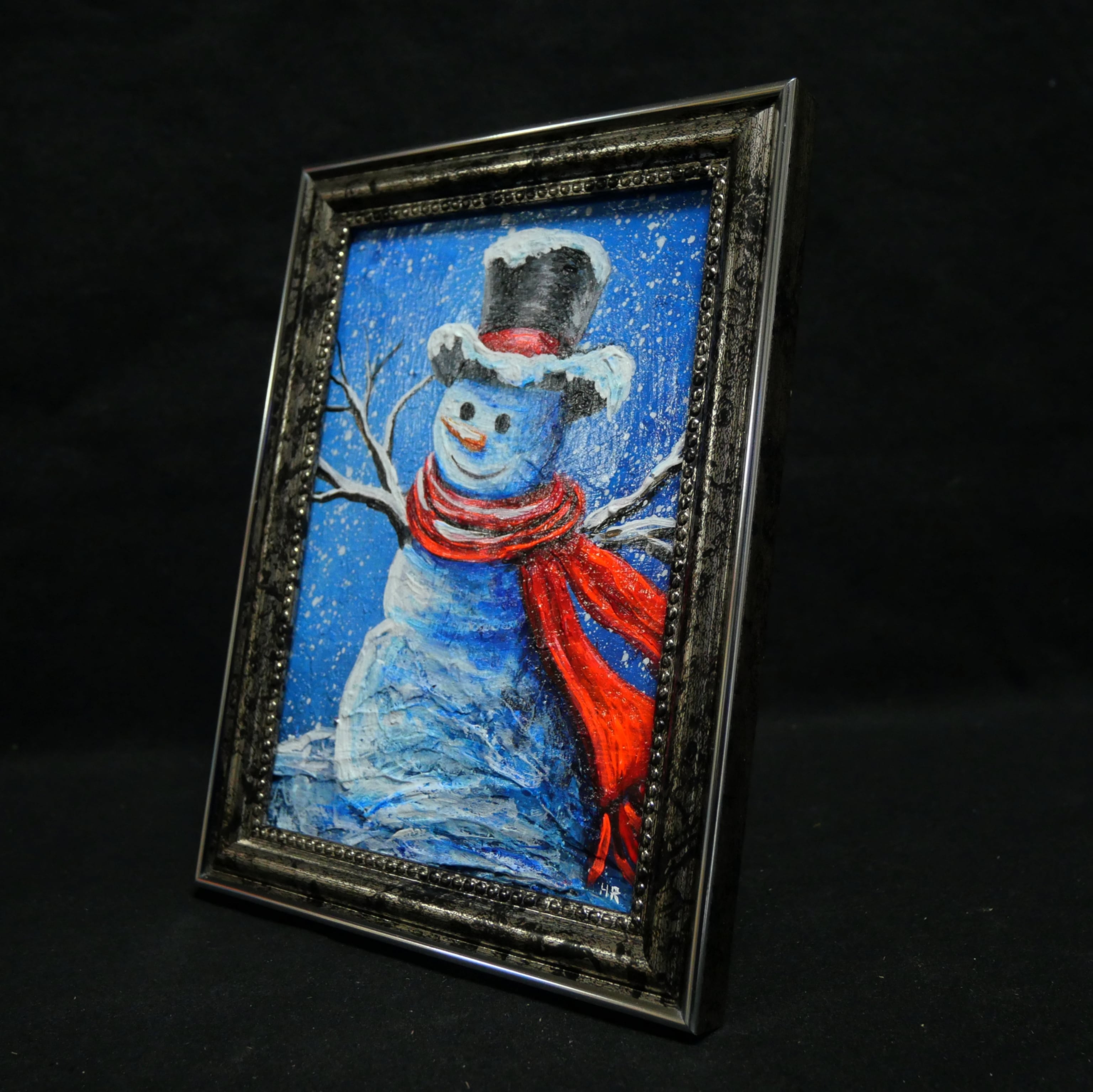 「赤いマフラーの雪だるま」は、白く覆いつくされた雪景色を背景に、可愛らしい雪だるまとその上にそっと乗せられた黒のシルクハット、鮮やかな赤いマフラーが印象的な特別な油絵作品です。降りしきる雪が、冬の魔法を一層引き立て、この作品はクリスマスの季節にぴったりなアイテムとなっています。特別なひとときや、大切な人との思い出を彩る一品です。