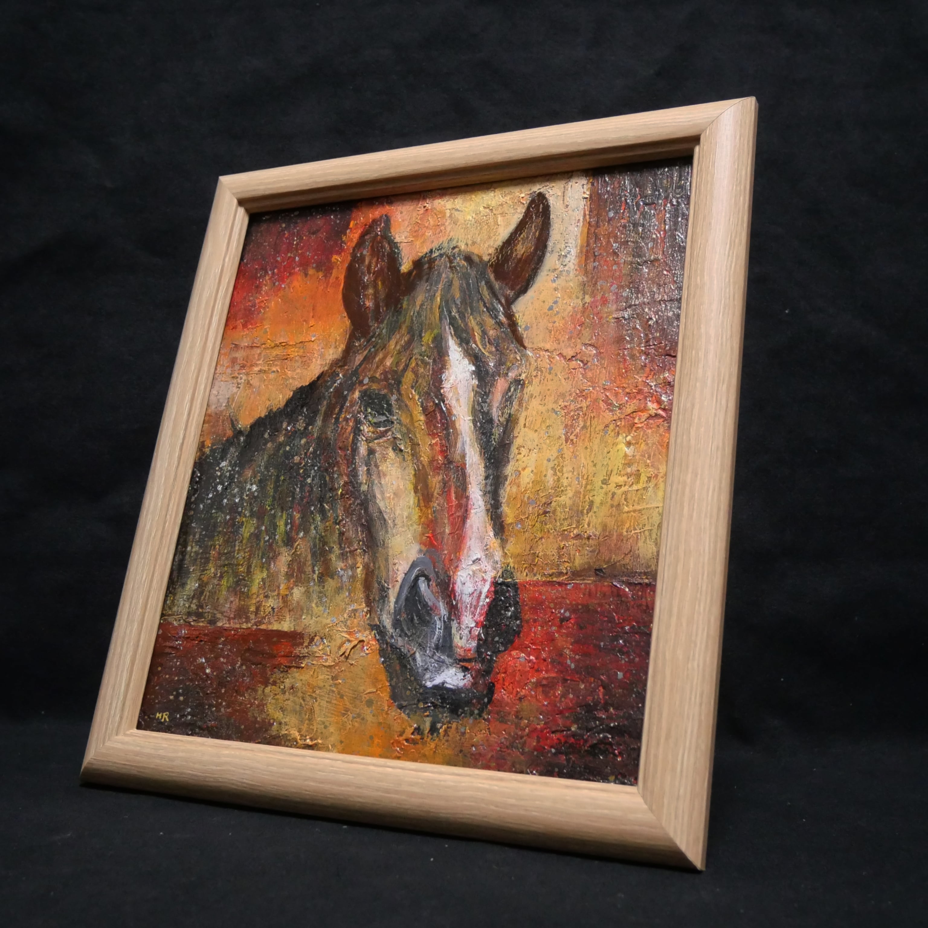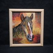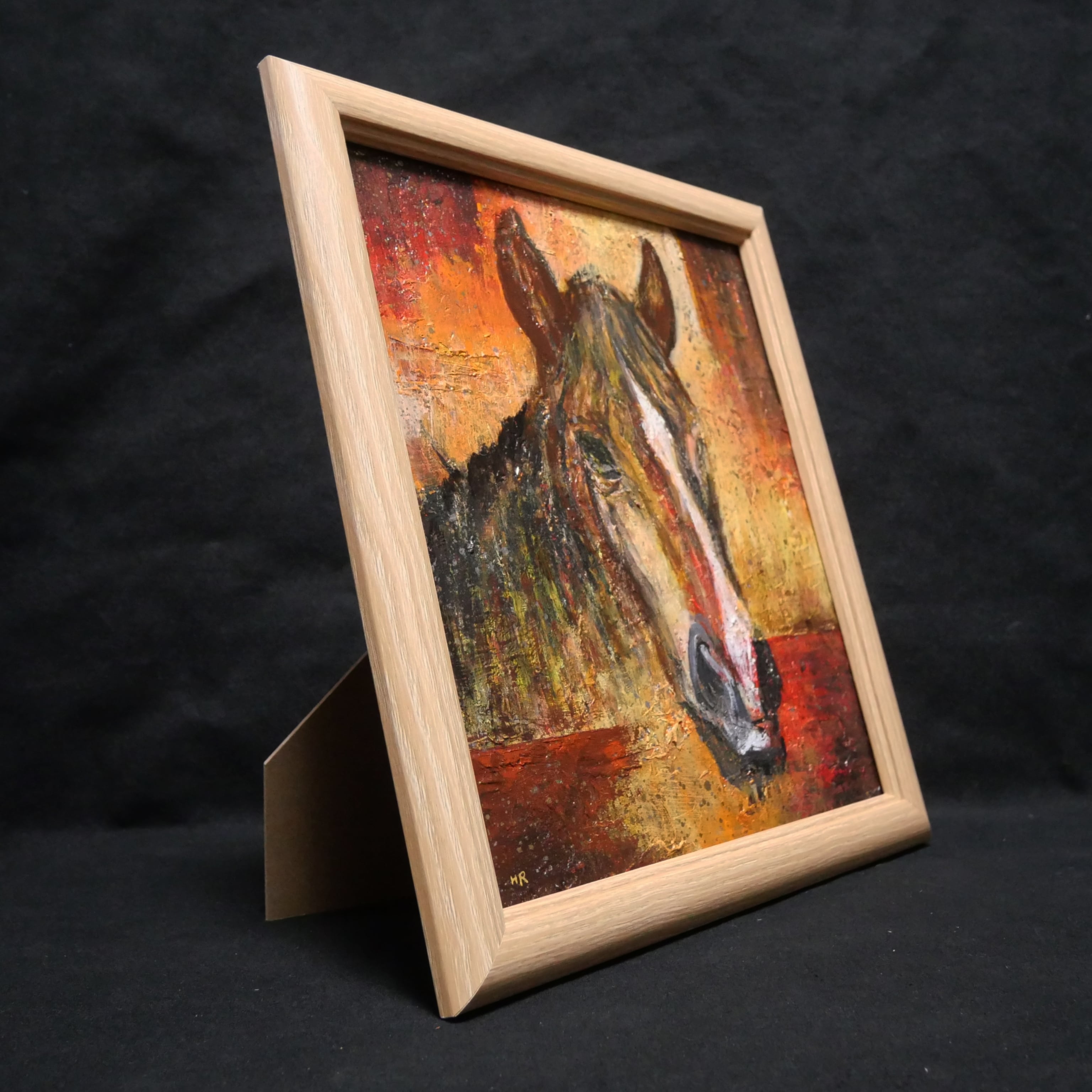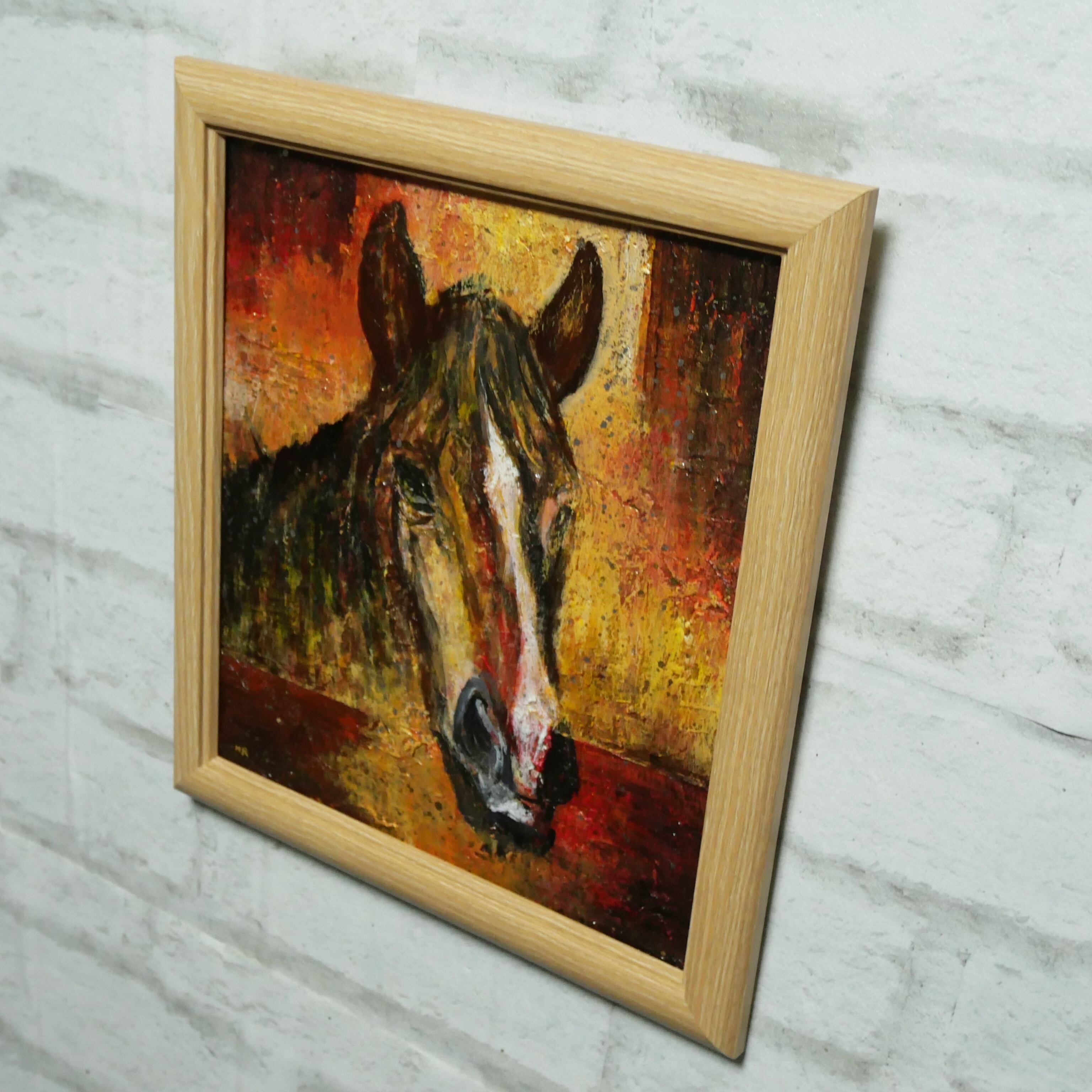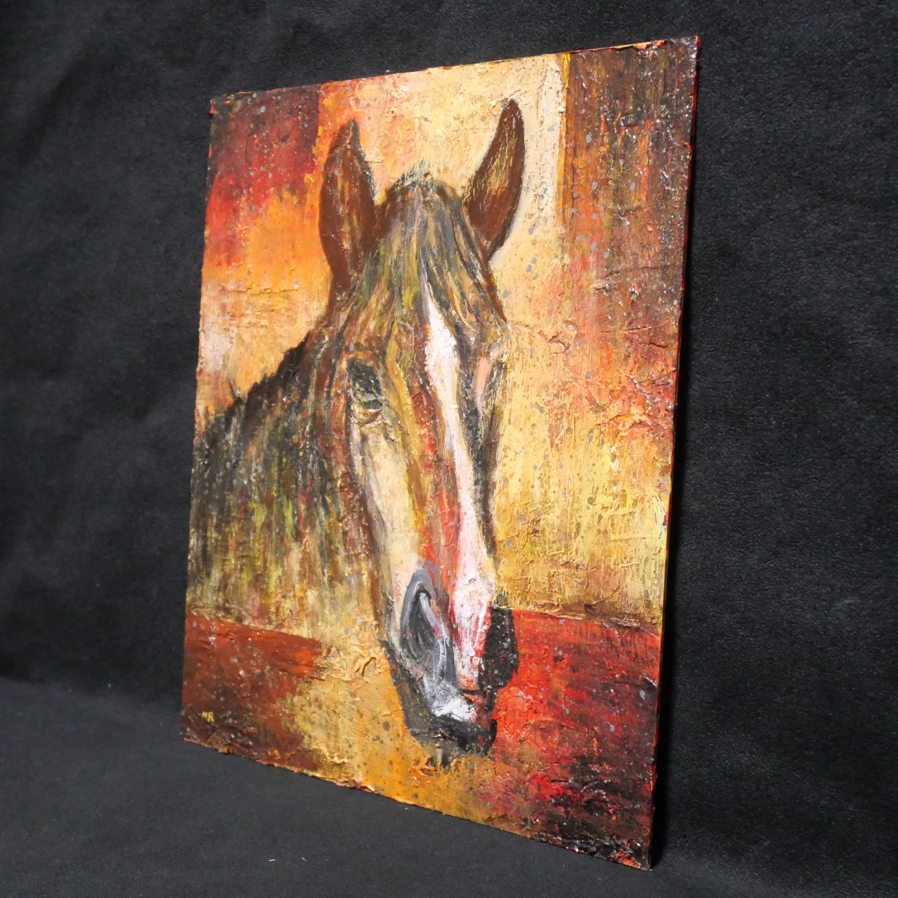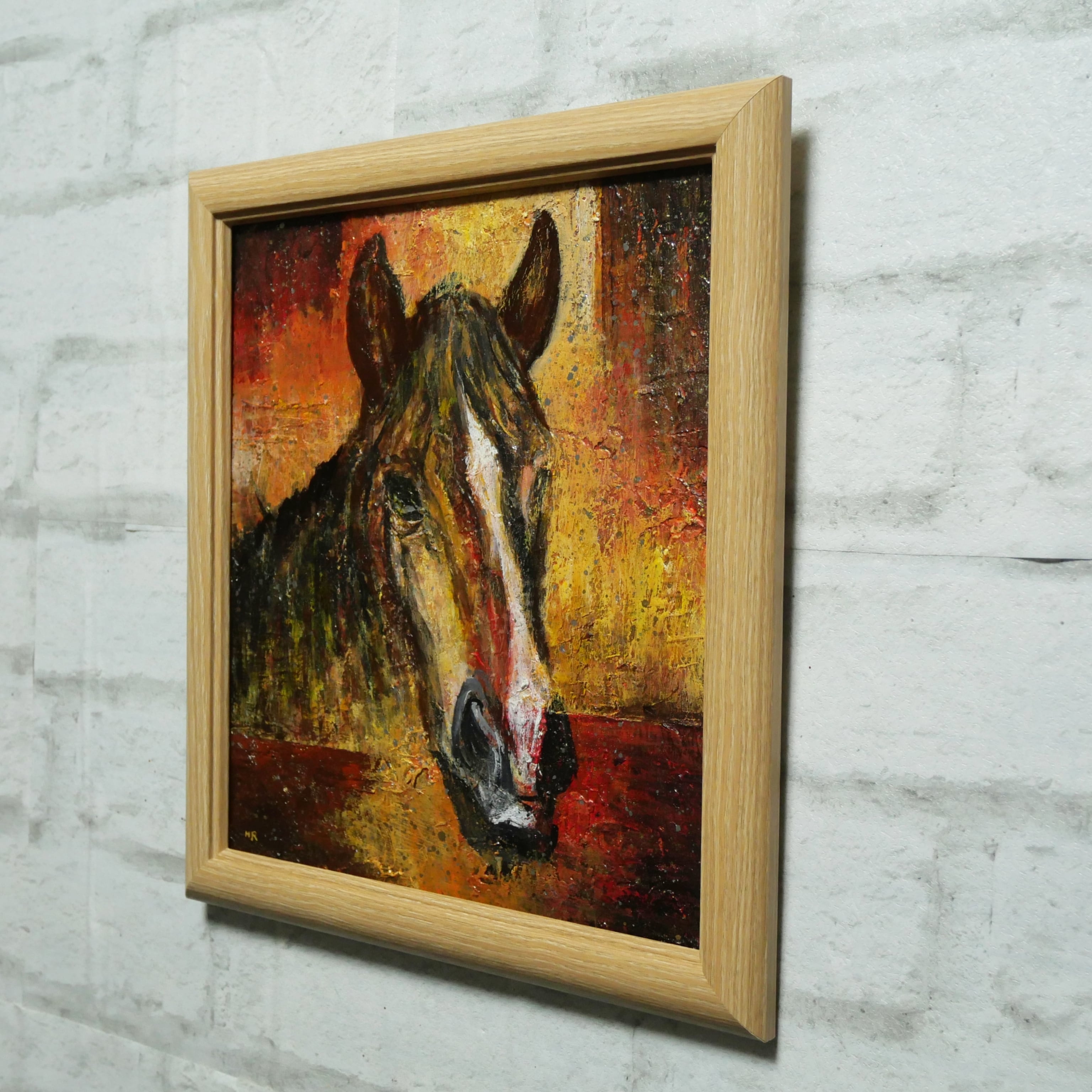 こちらの油絵は、高品質な油絵具【ホルベイン】を使用し、サイズは縦272mm × 横242mm、額縁は縦31.2cm × 横28.1cm、厚さ1.5cmです。作品が持つ美しい色合いは10年後、100年後も変わらず、長くお楽しみいただけます。スタンド付き・金具付きで、壁に掛けてもテーブルなどに置いても飾れる便利な仕様です。「午年」は、大切な方への特別な贈り物や新年の縁起物としても自信を持ってご提案いたします。この作品が、お客様の生活空間に力強いエネルギーをもたらし、素晴らしいパートナーとなることを願っています。
