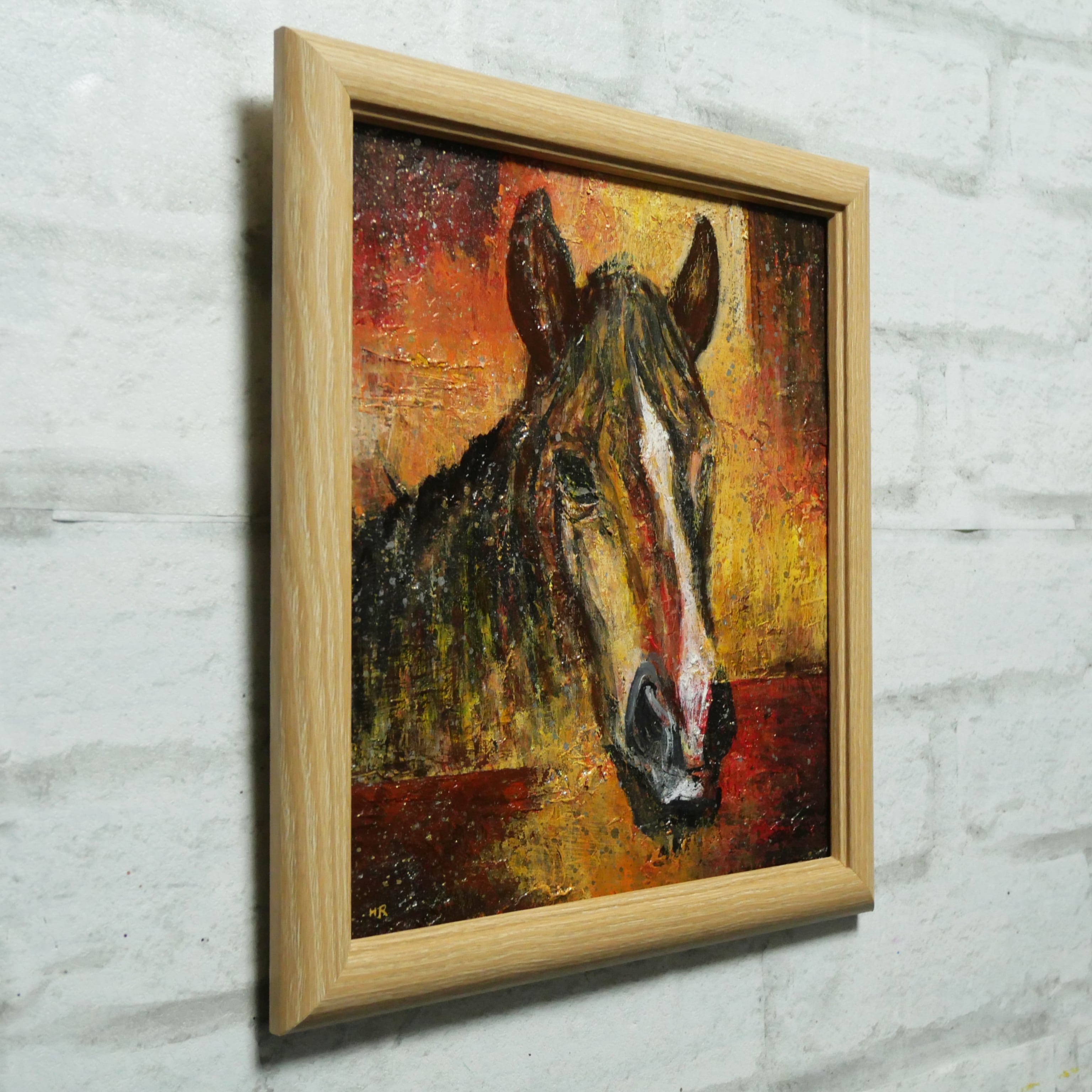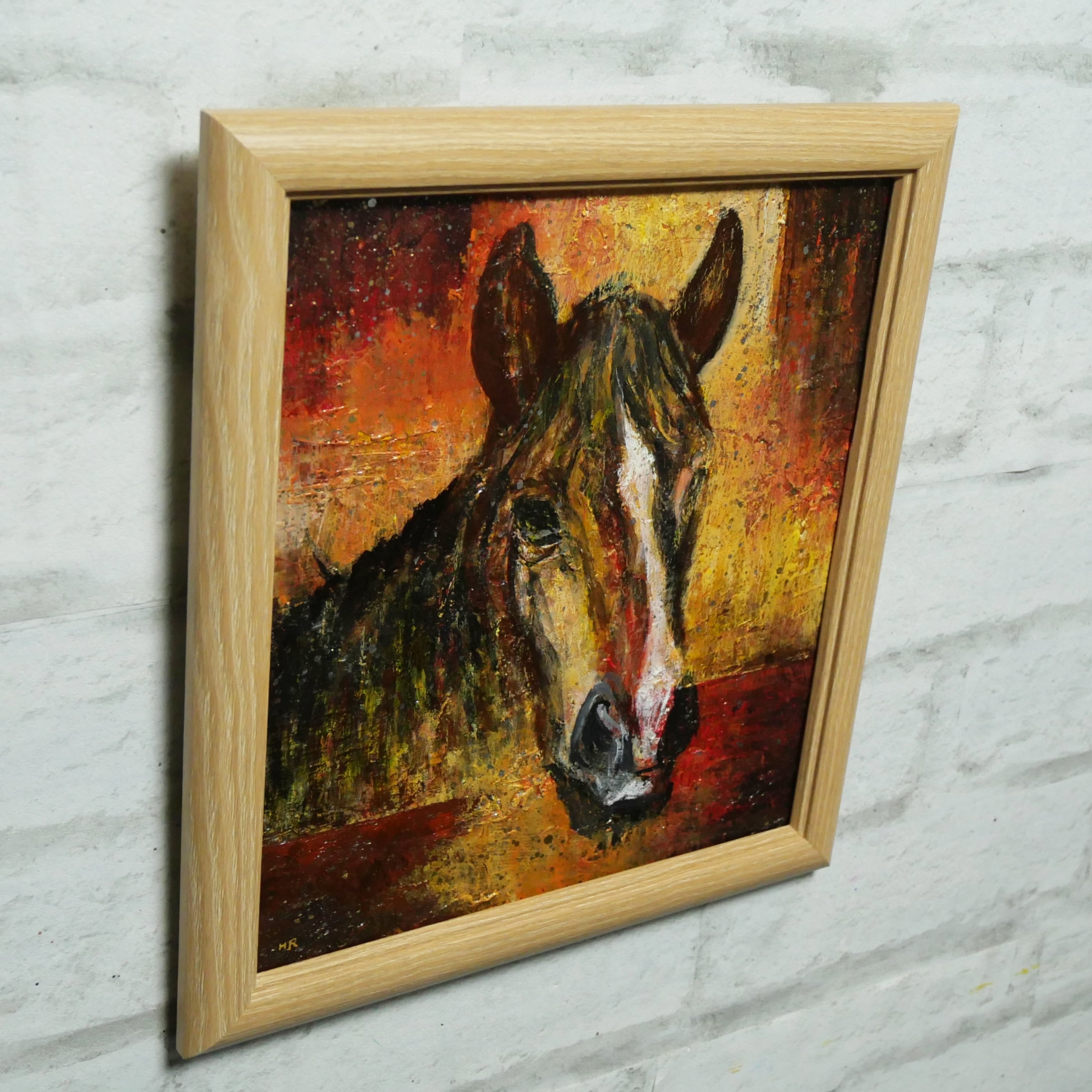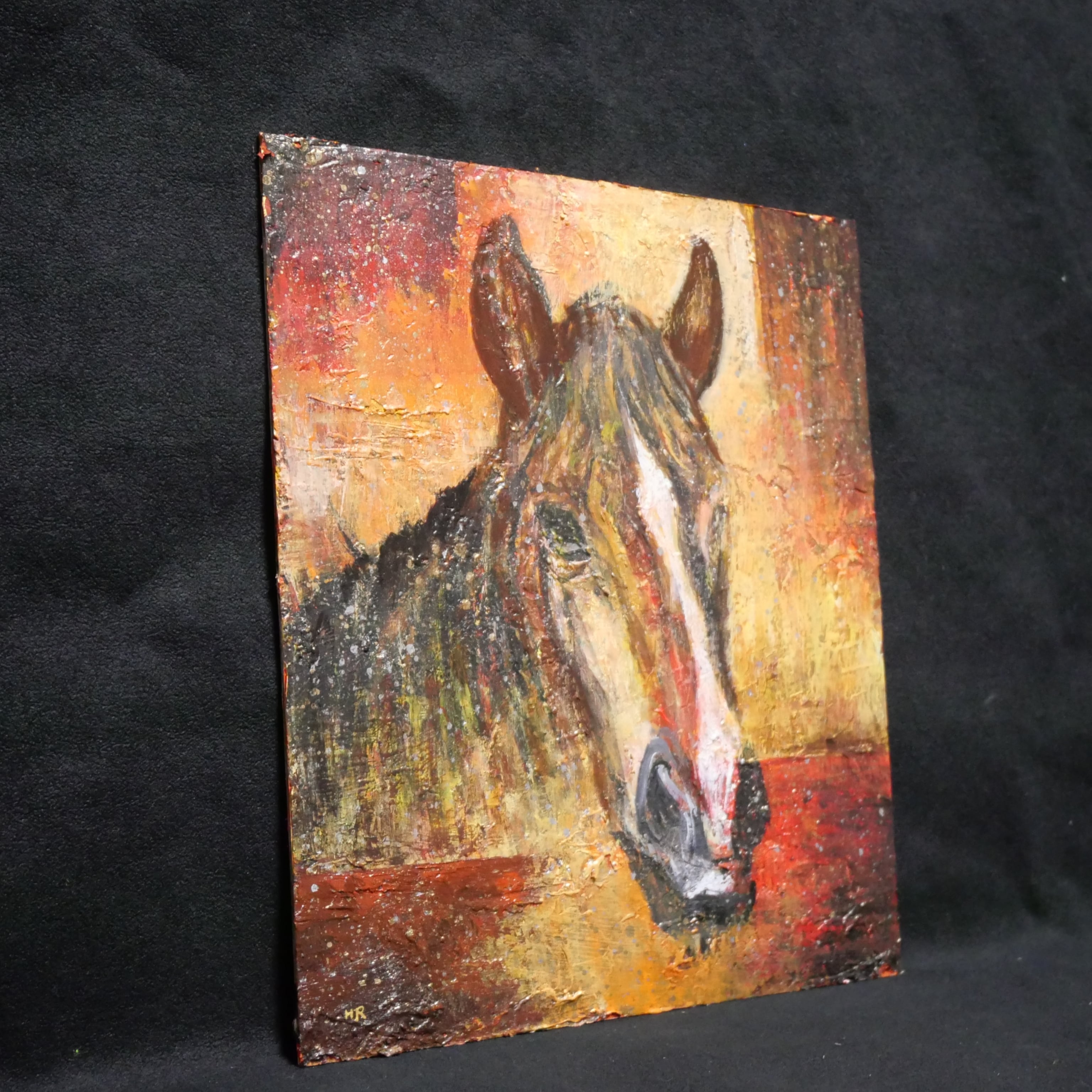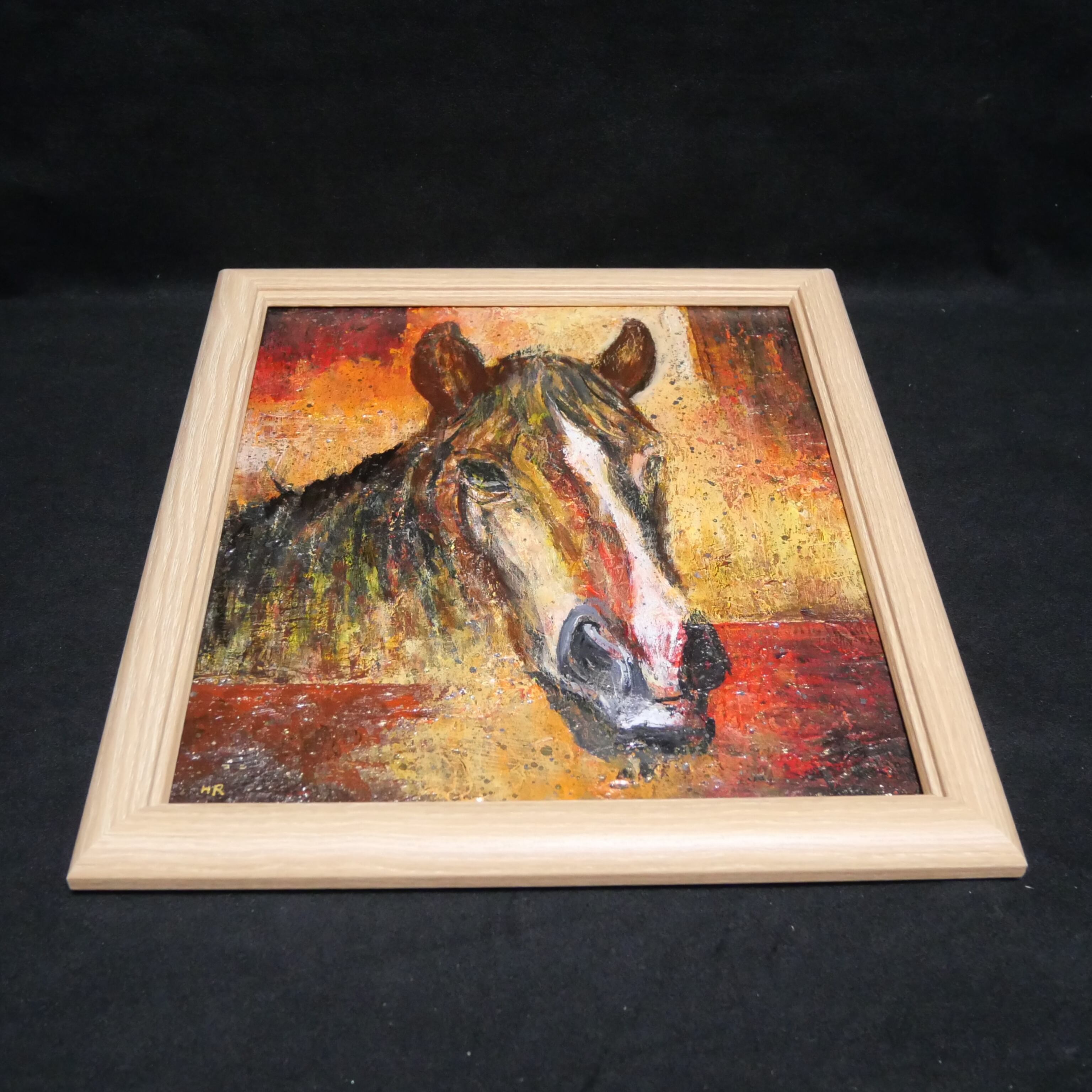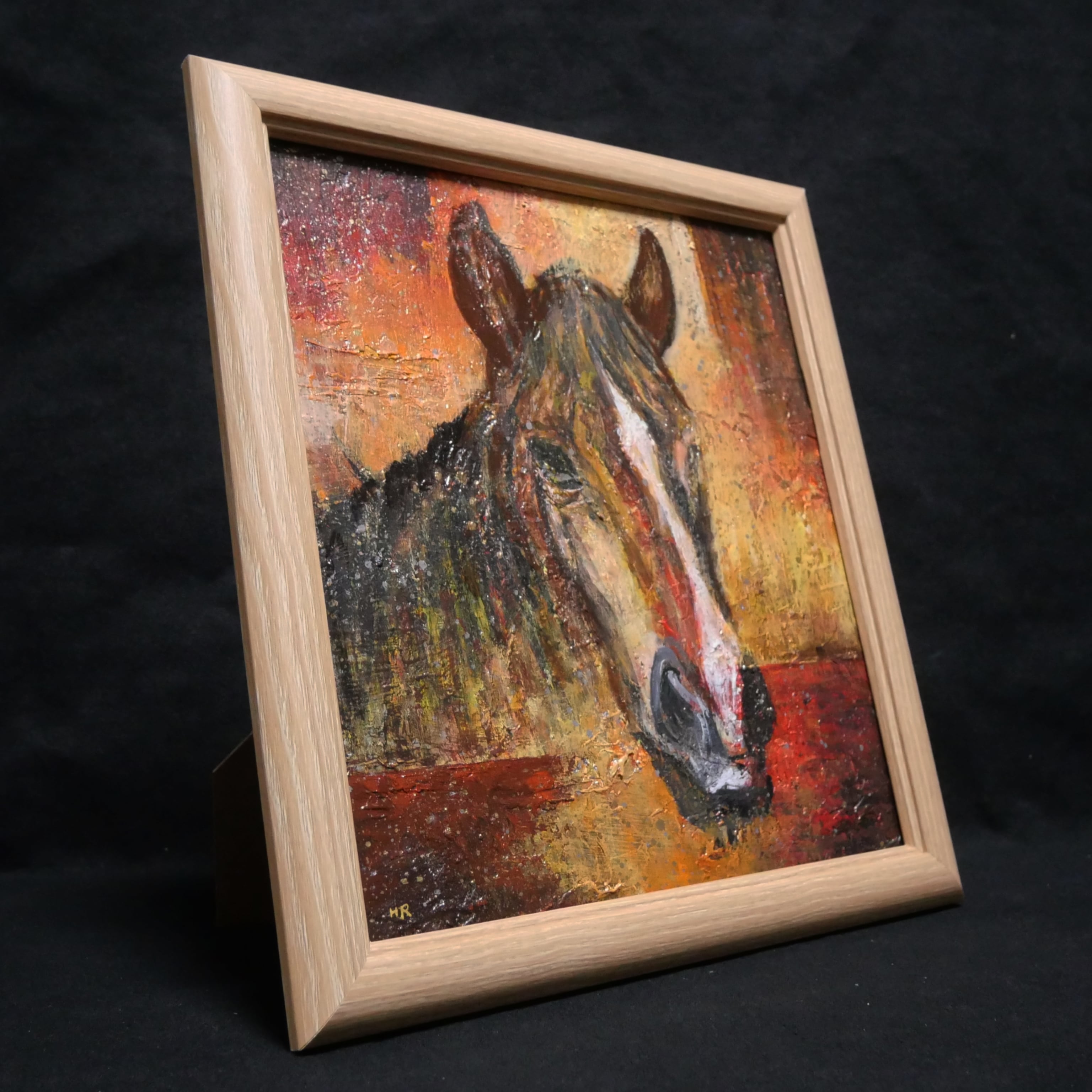 こちらの油絵は、高品質な油絵具【ホルベイン】を使用し、サイズは縦272mm × 横242mm、額縁は縦31.2cm × 横28.1cm、厚さ1.5cmです。作品が持つ美しい色合いは10年後、100年後も変わらず、長くお楽しみいただけます。スタンド付き・金具付きで、壁に掛けてもテーブルなどに置いても飾れる便利な仕様です。「午年」は、大切な方への特別な贈り物や新年の縁起物としても自信を持ってご提案いたします。この作品が、お客様の生活空間に力強いエネルギーをもたらし、素晴らしいパートナーとなることを願っています。