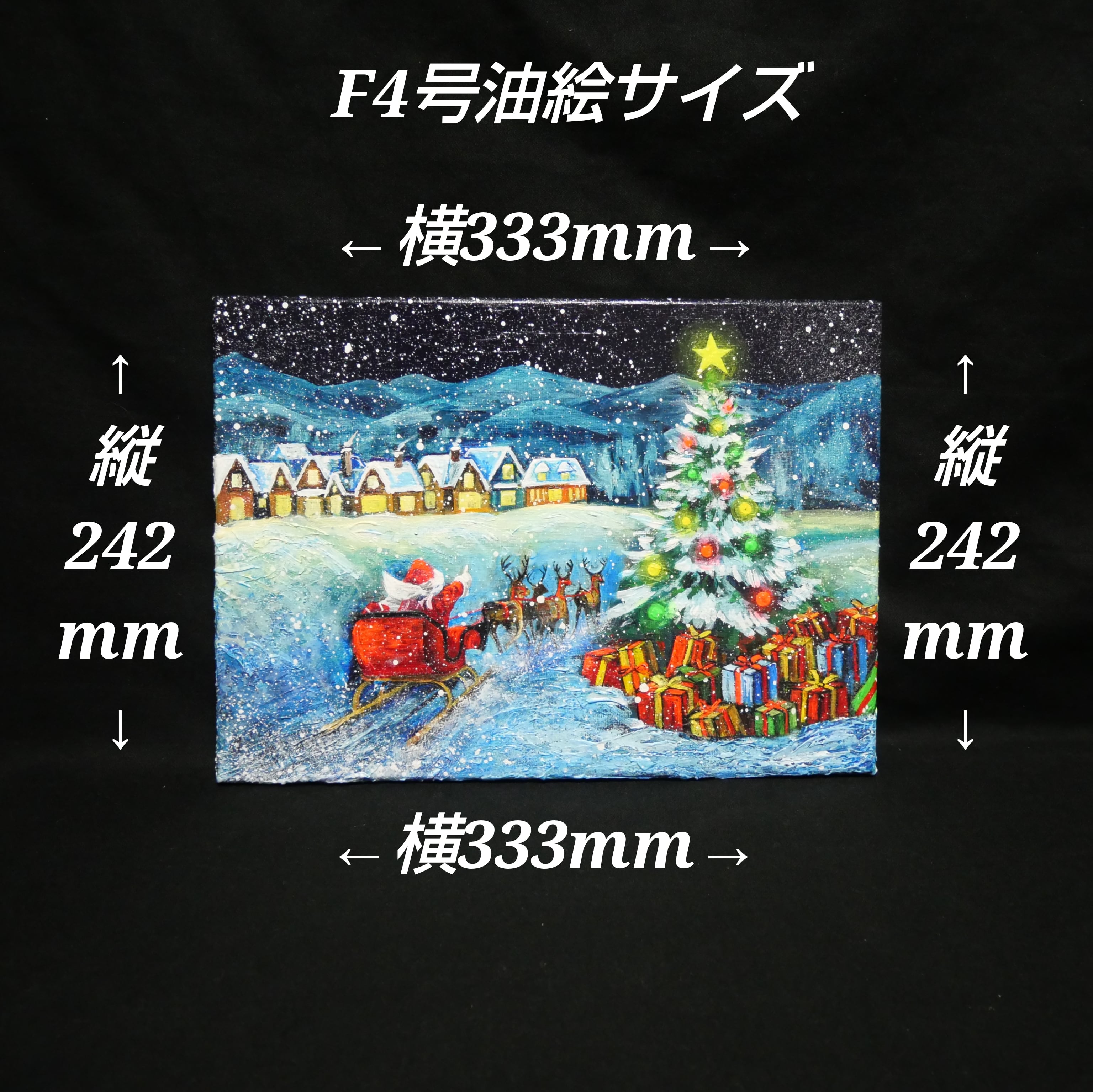 こちらの油絵は、高品質な油絵具【ホルベイン】を使用し、F4号サイズのキャンバスに手描きで仕上げています。「聖夜の贈り物」は、大切な人へのギフトやクリスマスの装飾としてもおすすめの一品です。この作品が、お客様の生活空間に冬の温もりと心安らぐひとときをもたらすことを願っております。