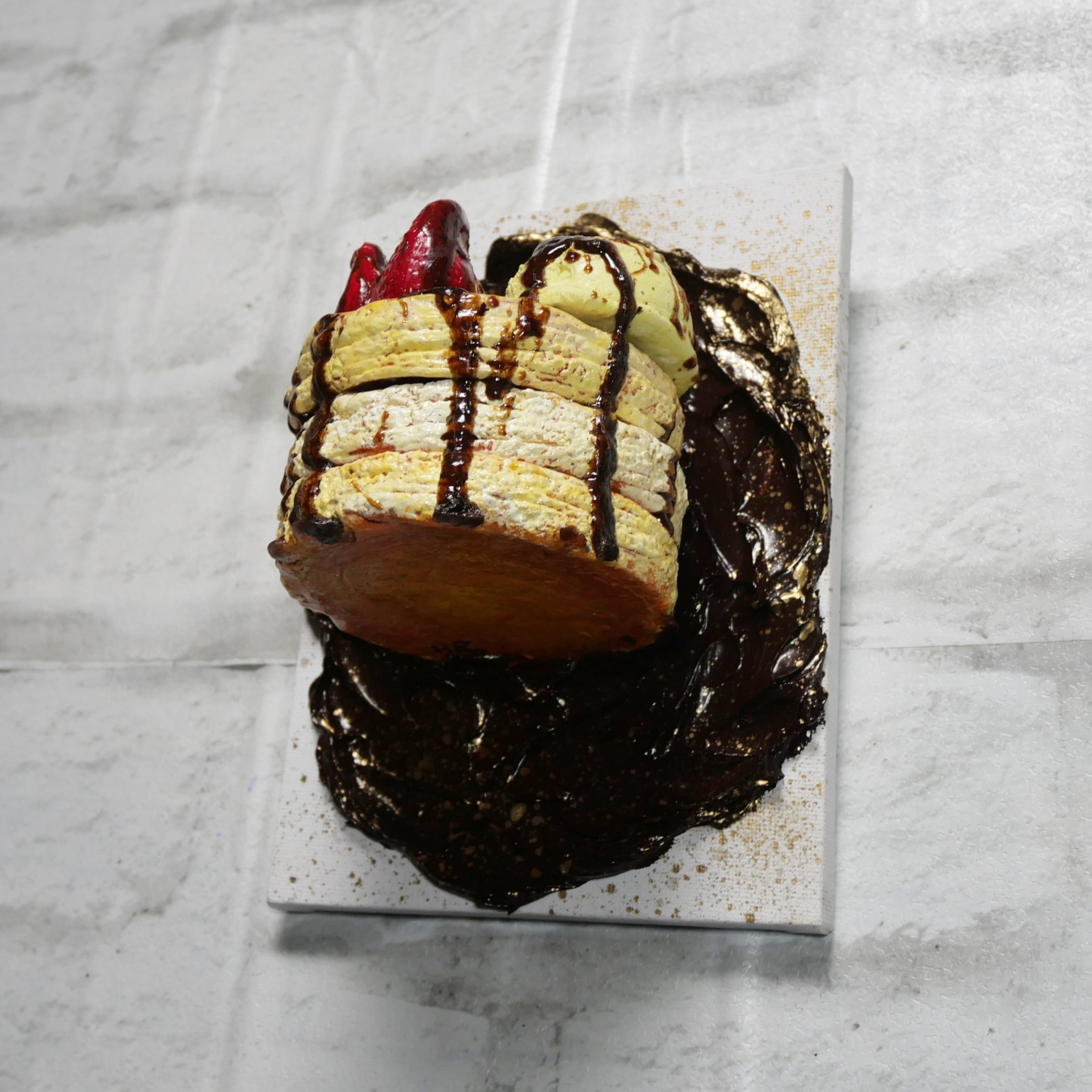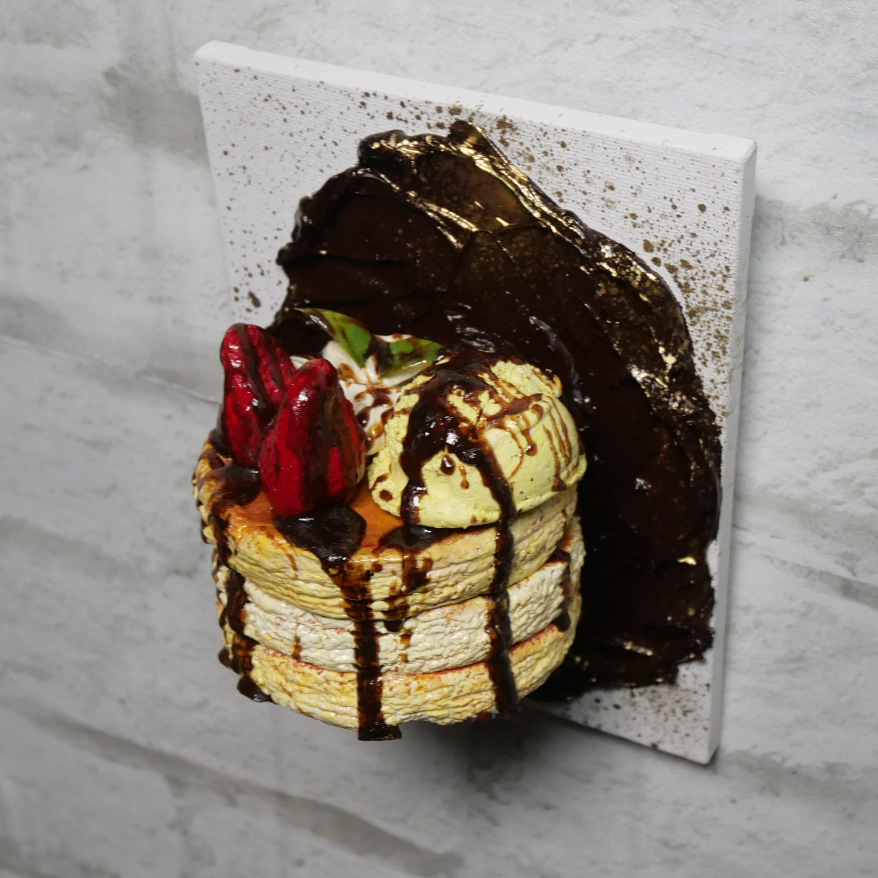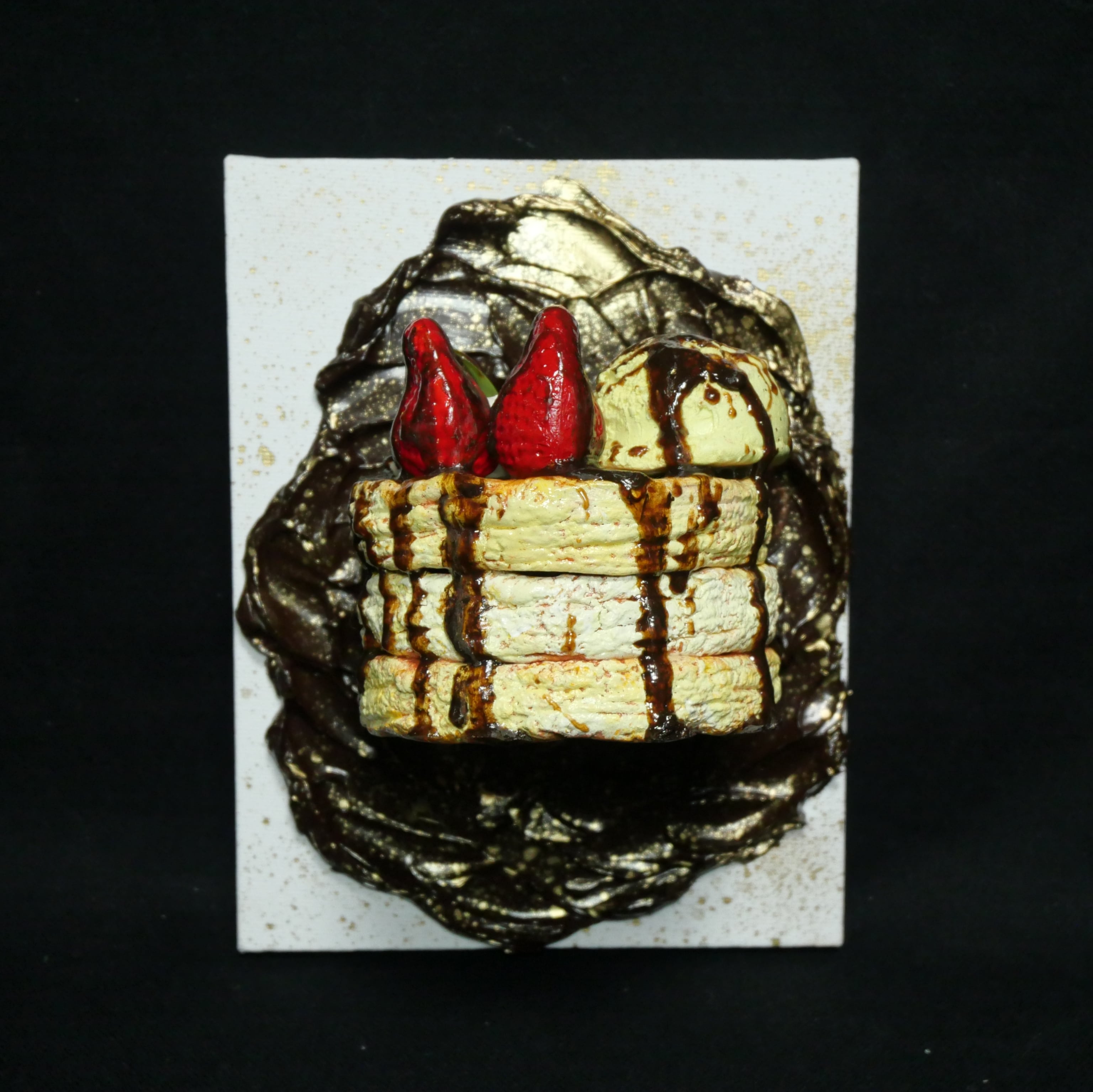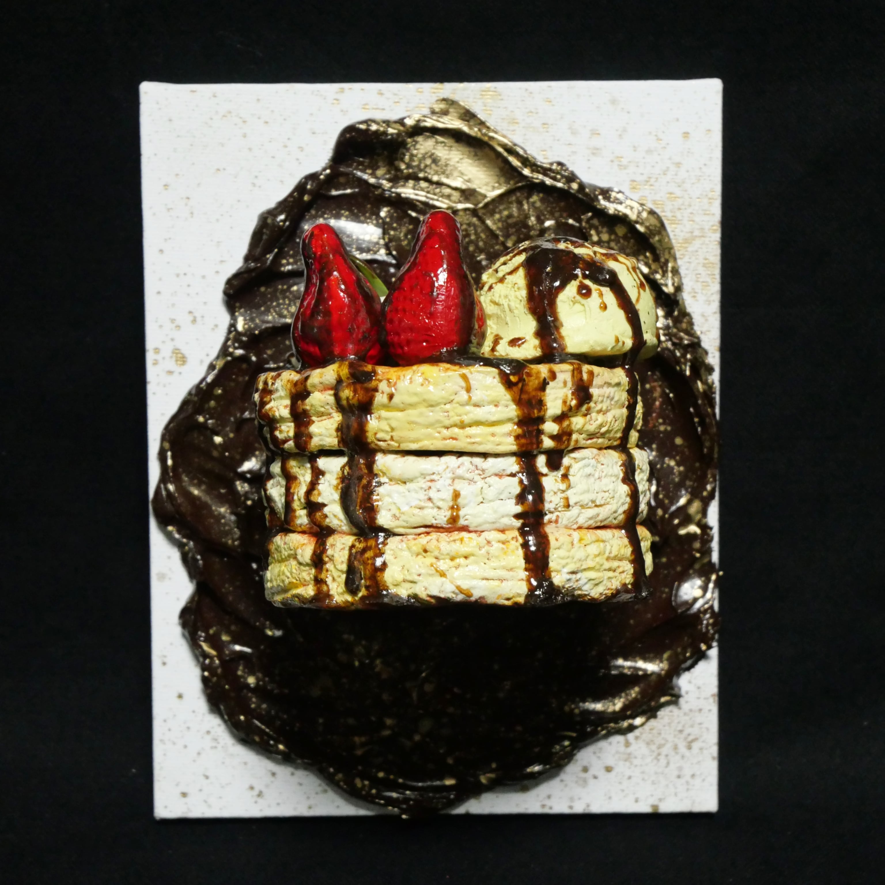「ゴールドダスト・デザート」は、甘美なチョコレートイメージを表現したオリジナル油絵作品です。F0号キャンバスサイズの180mm×140mm縦構図に、深い茶色がホワイトキャンバスに映えるデザインは、まさに見ているだけで幸せな気持ちにさせてくれます。さらに、ゴールド色の輝きを降り注ぎ、特別なパンケーキオブジェがトッピングされた幻想的な一枚です。