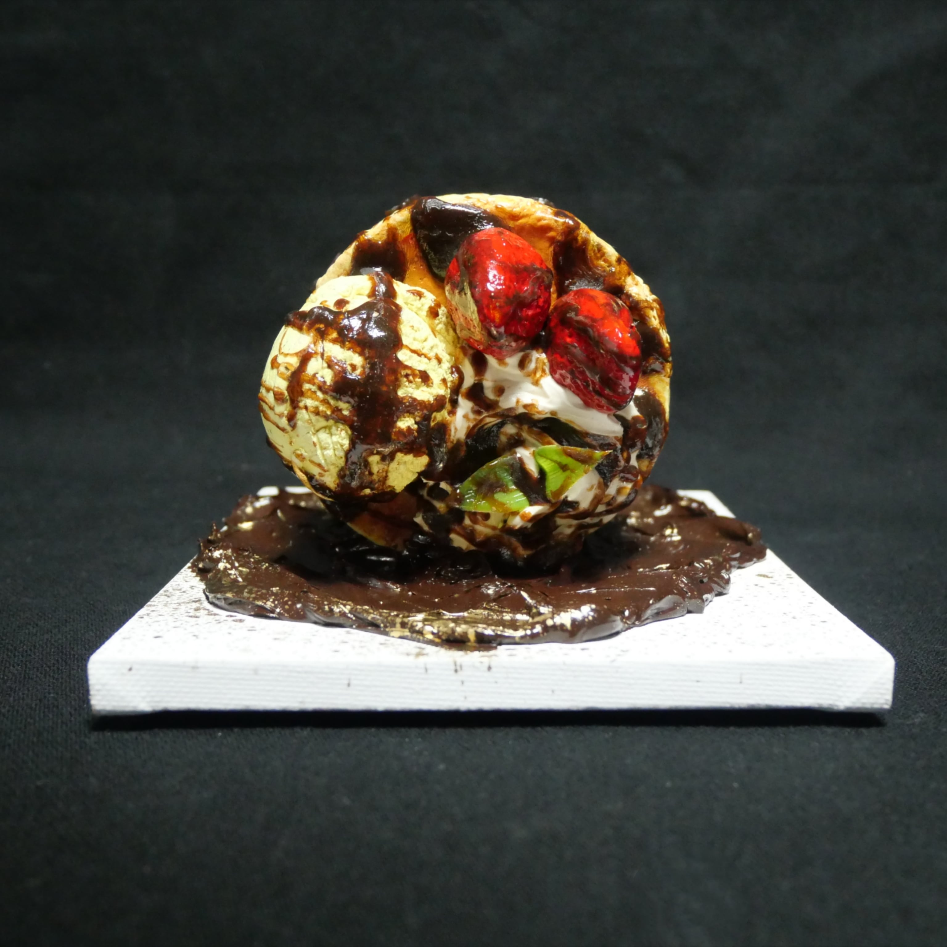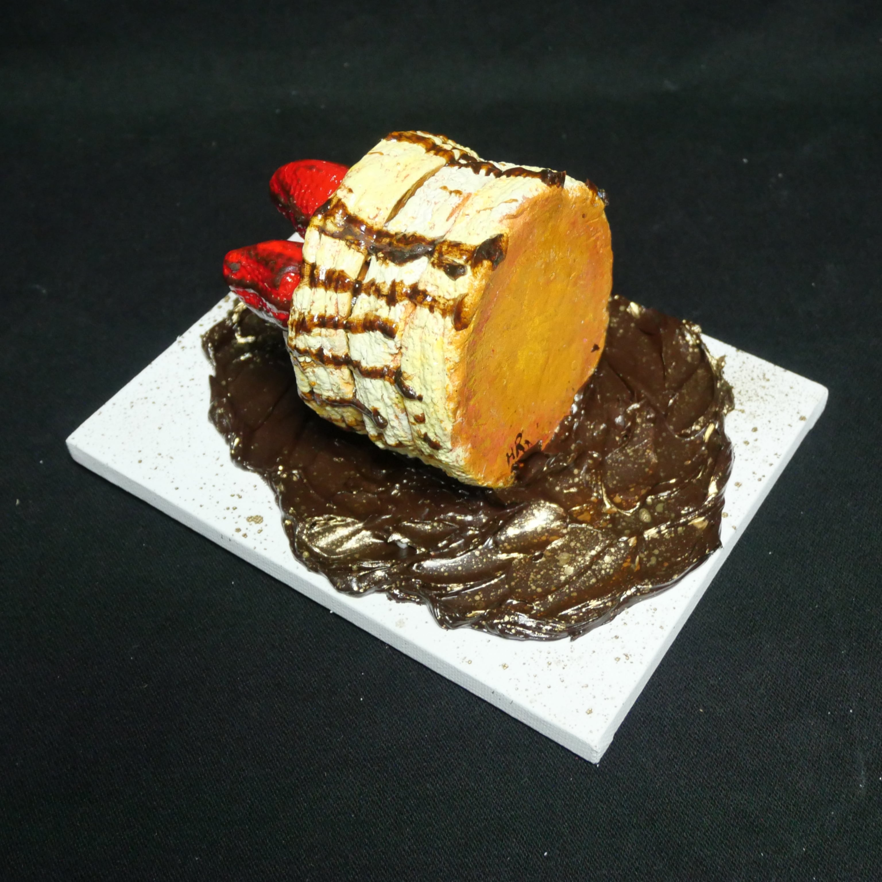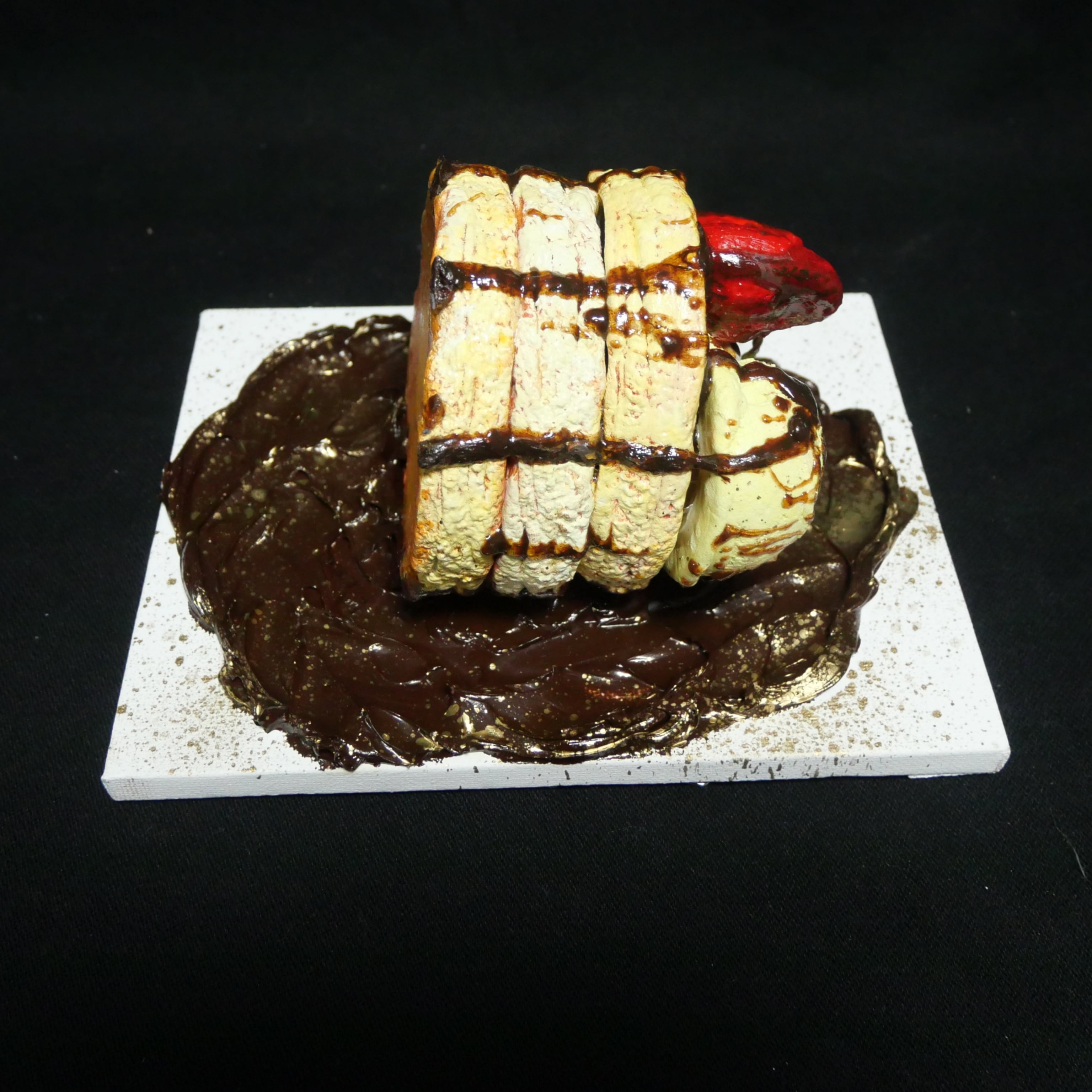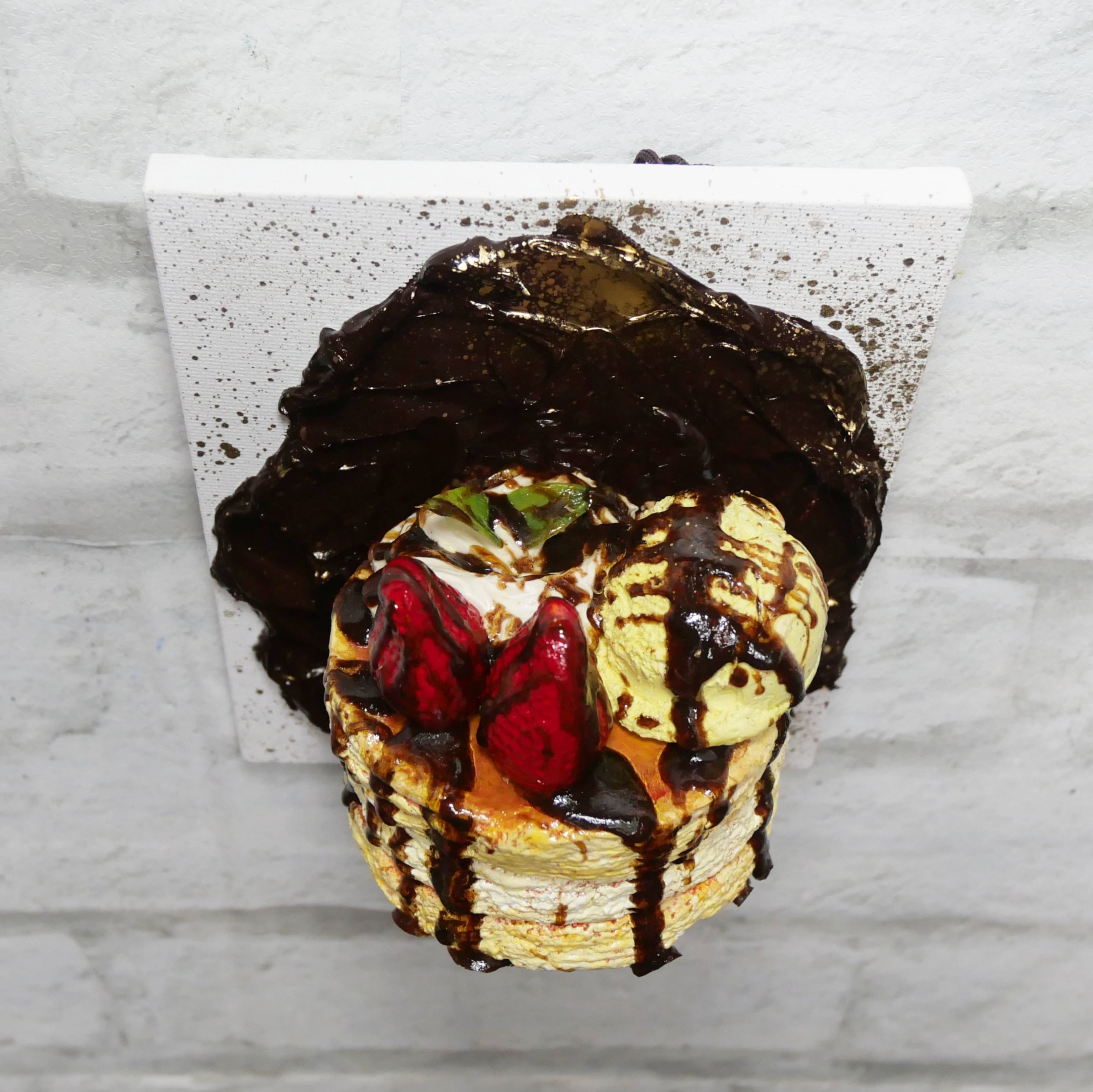 「ゴールドダスト・デザート」は、甘美なチョコレートイメージを表現したオリジナル油絵作品です。F0号キャンバスサイズの180mm×140mm縦構図に、深い茶色がホワイトキャンバスに映えるデザインは、まさに見ているだけで幸せな気持ちにさせてくれます。さらに、ゴールド色の輝きを降り注ぎ、特別なパンケーキオブジェがトッピングされた幻想的な一枚です。
