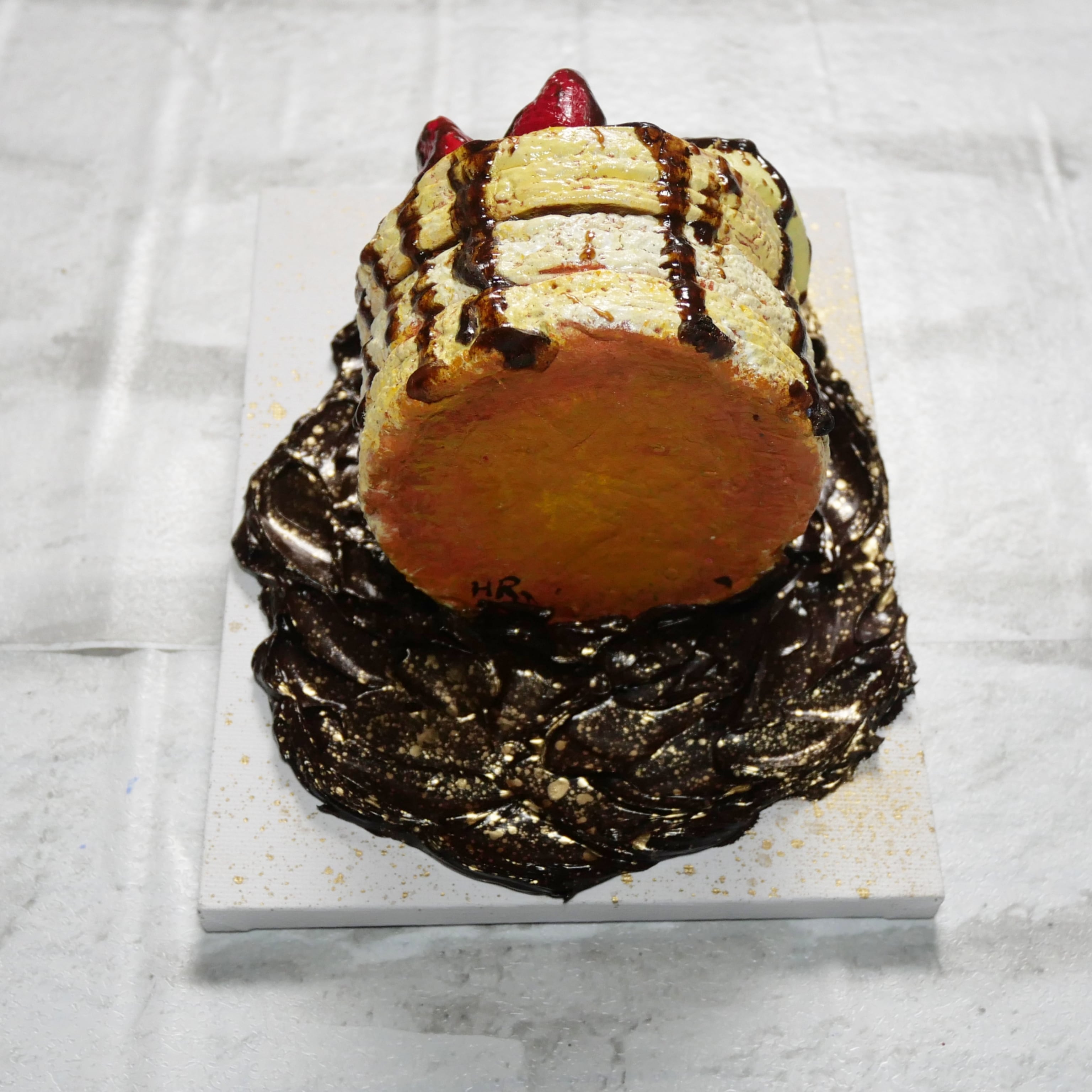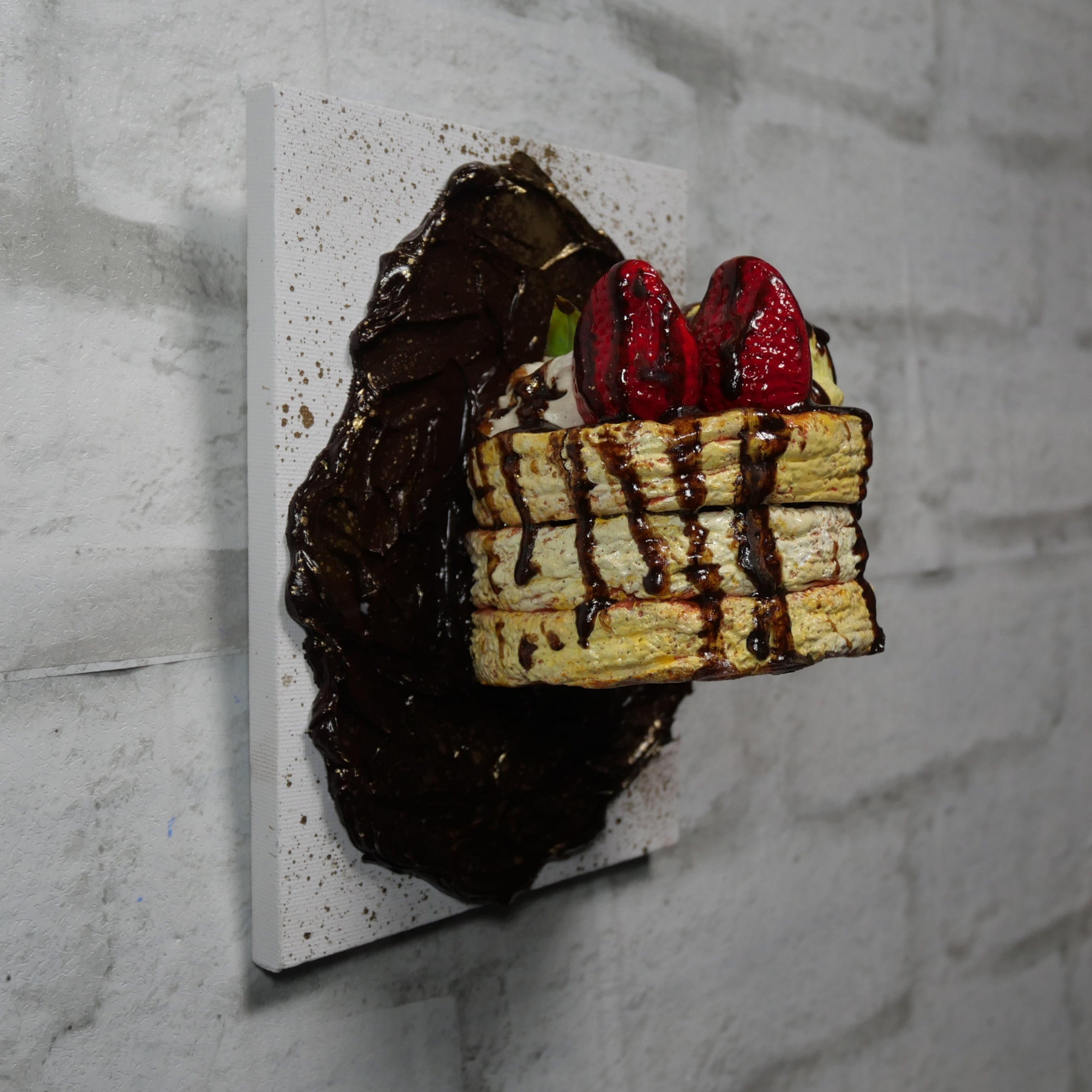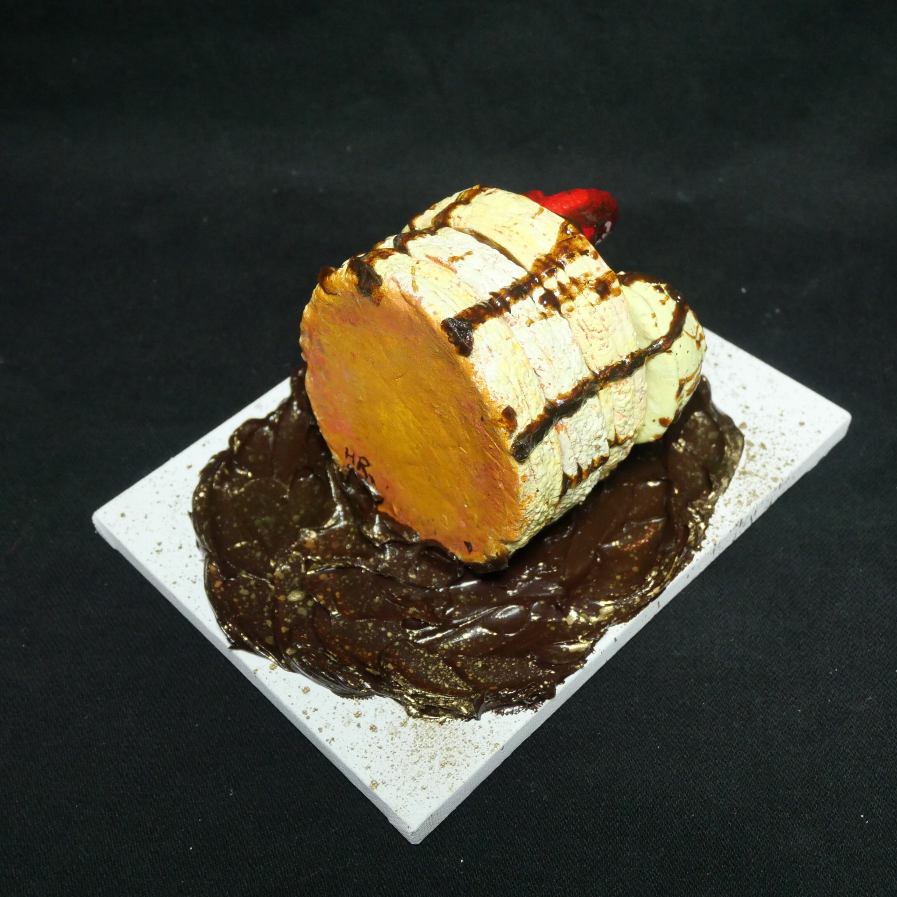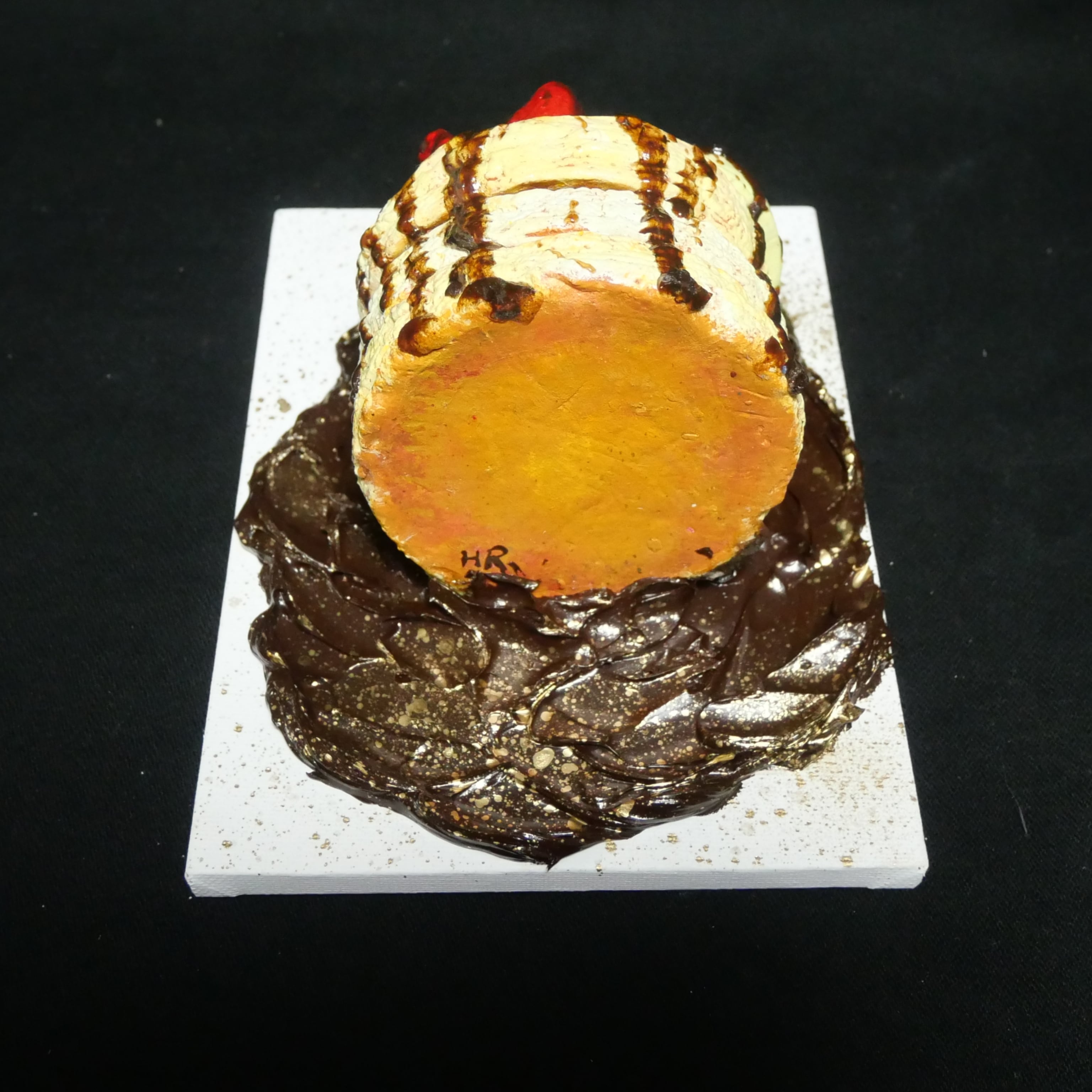 「ゴールドダスト・デザート」は、甘美なチョコレートイメージを表現したオリジナル油絵作品です。F0号キャンバスサイズの180mm×140mm縦構図に、深い茶色がホワイトキャンバスに映えるデザインは、まさに見ているだけで幸せな気持ちにさせてくれます。さらに、ゴールド色の輝きを降り注ぎ、特別なパンケーキオブジェがトッピングされた幻想的な一枚です。