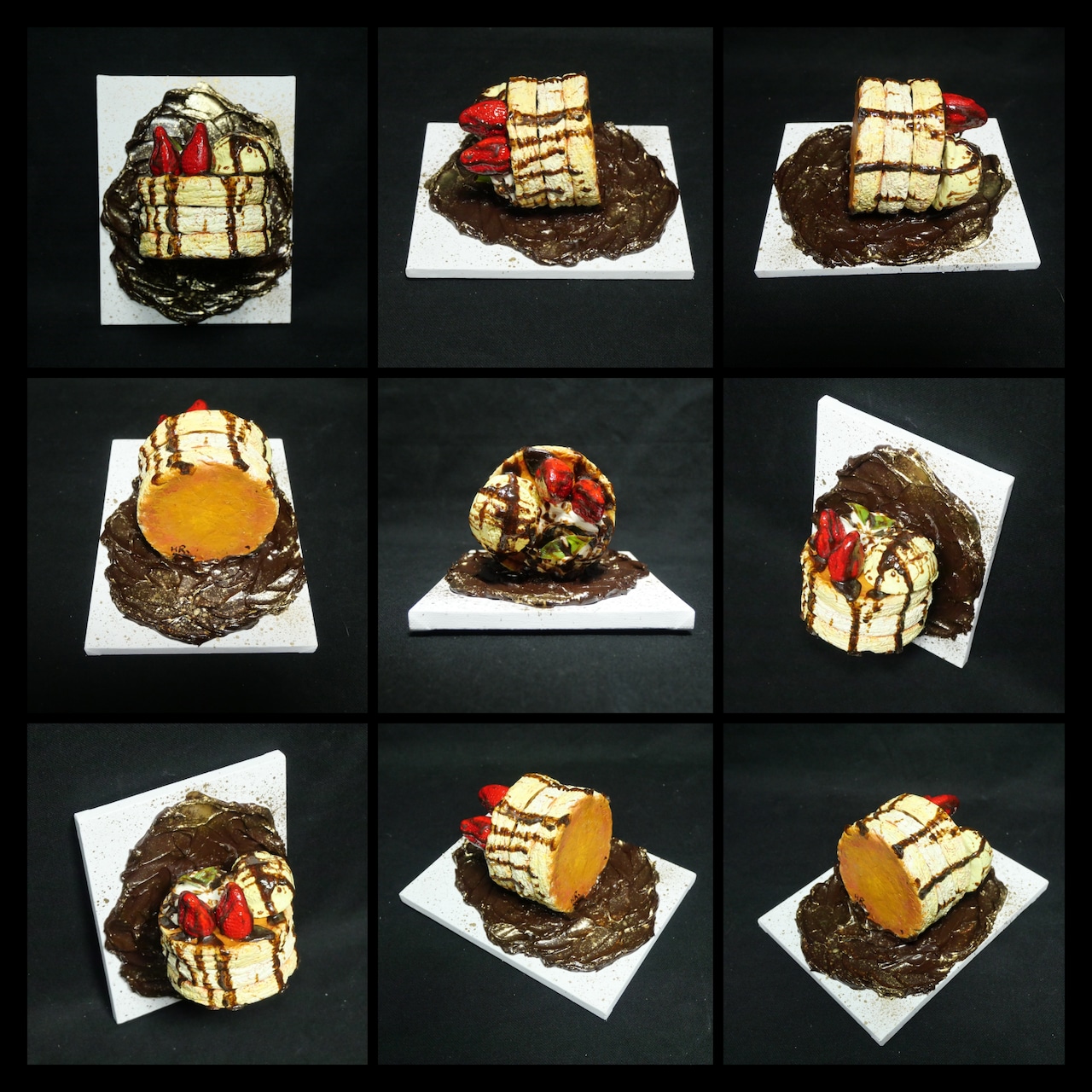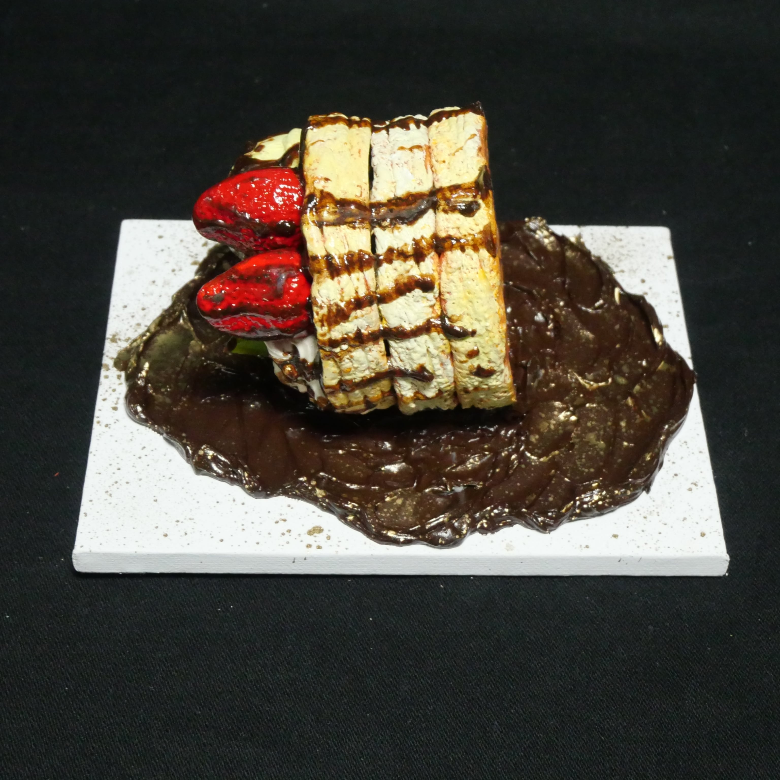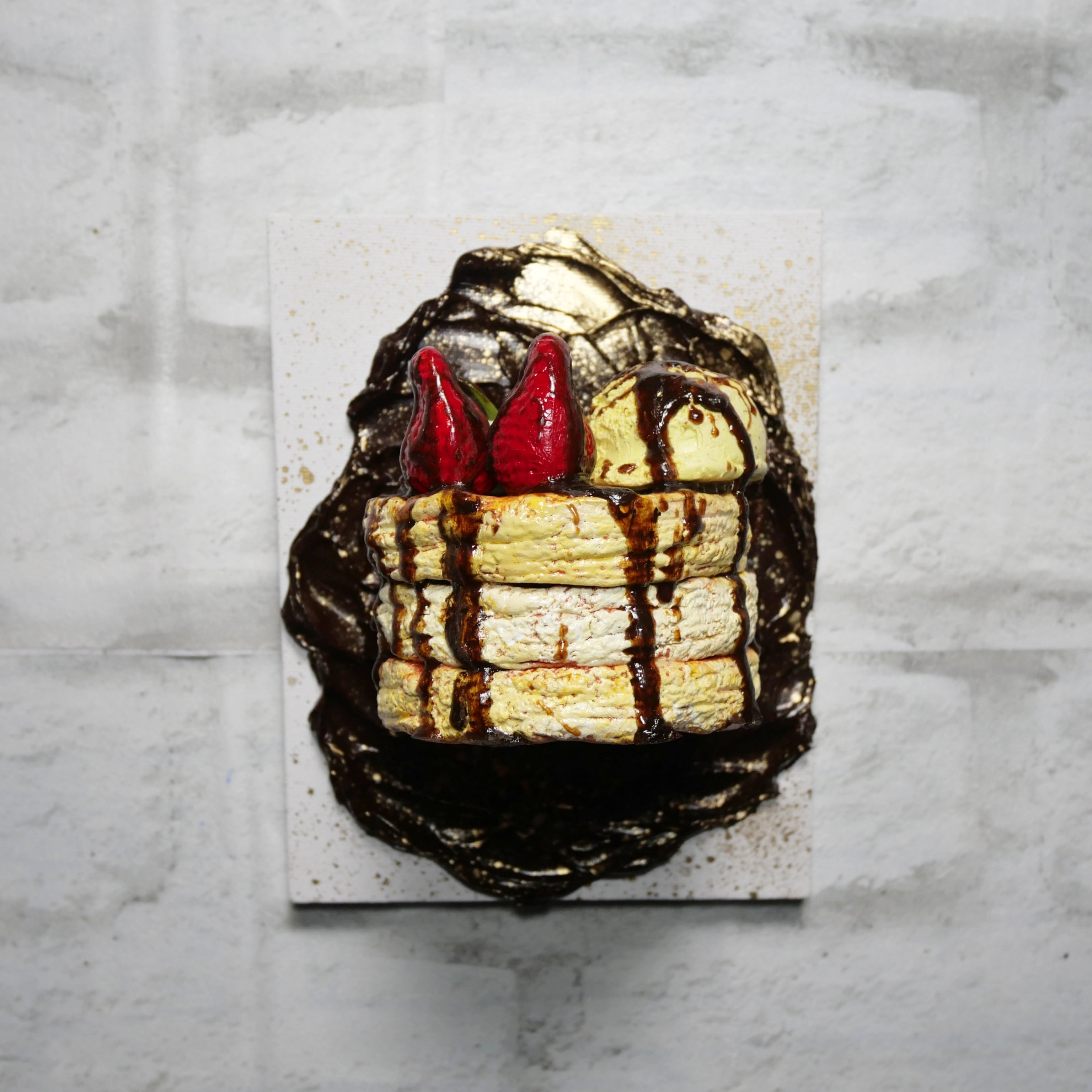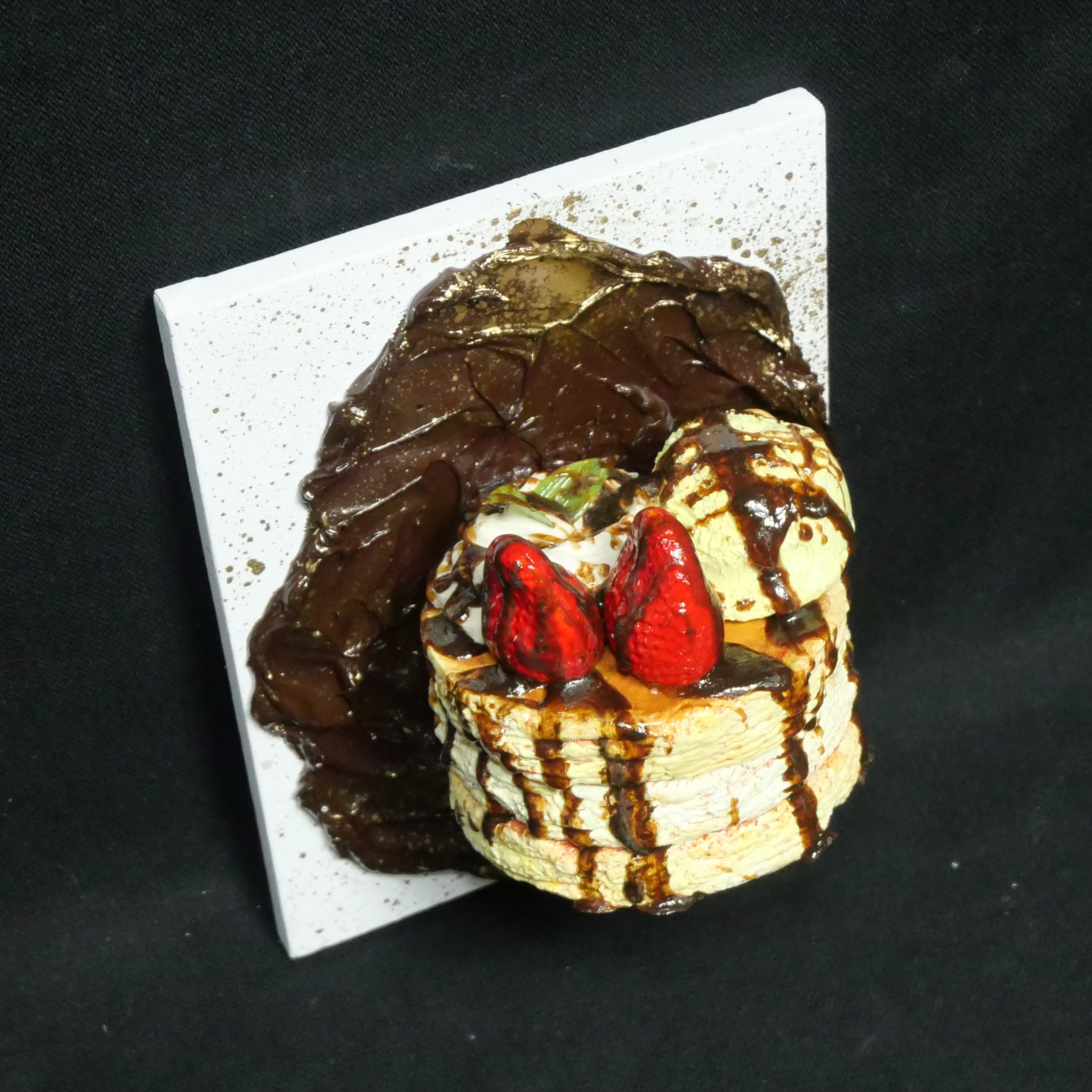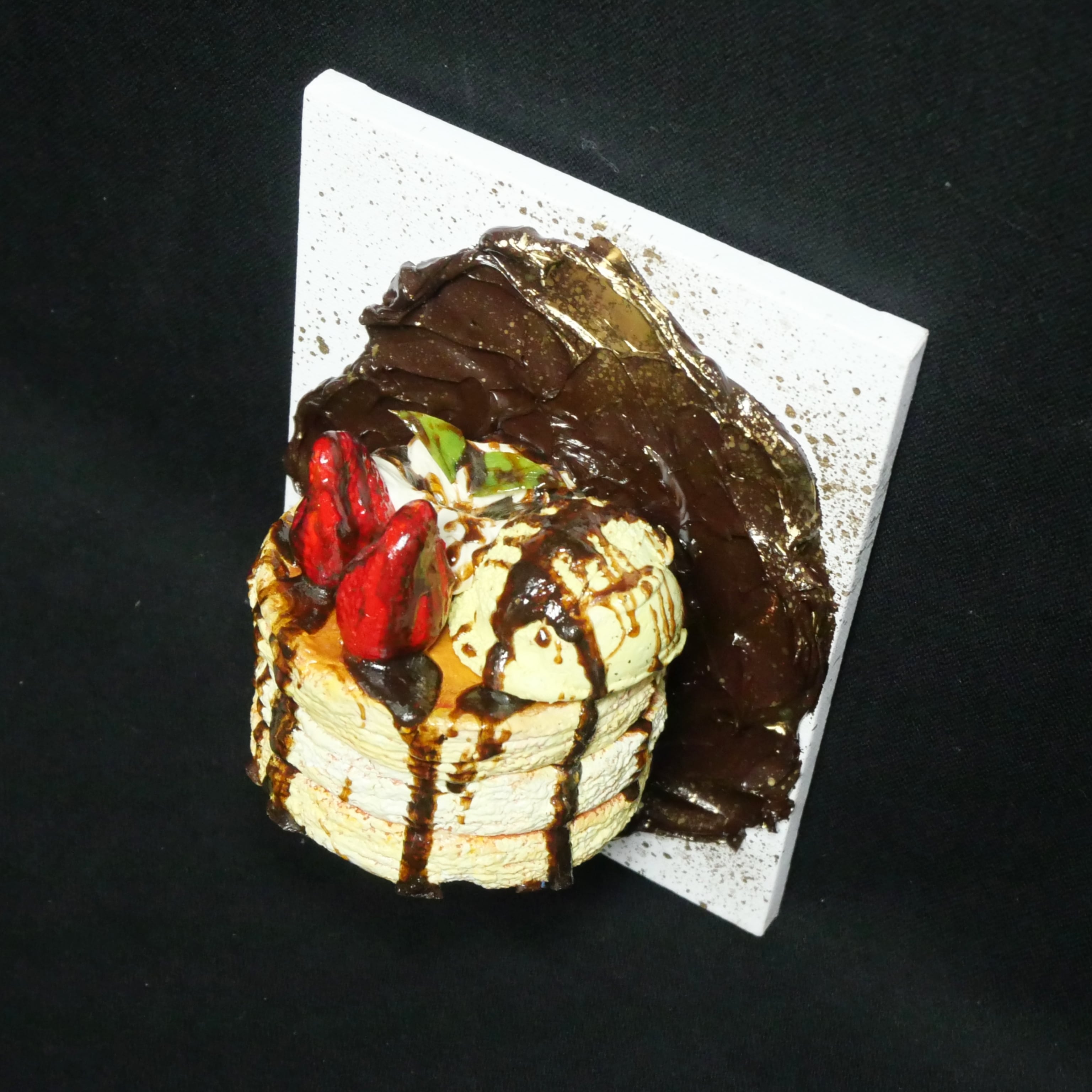 モチーフには、手作り感溢れるパンケーキがふわっと配置され、そのシンプルな美しさを引き立てる苺2個、バニラアイス、ホイップクリーム、そしてチョコレートソースが贅沢にトッピングされています。加えて、温かみのあるミトンを添えることで、ほっとするような食の豊かさと手仕事のぬくもりを表現しました。この作品は、特別な瞬間や大切な方への贈り物としても最適です。