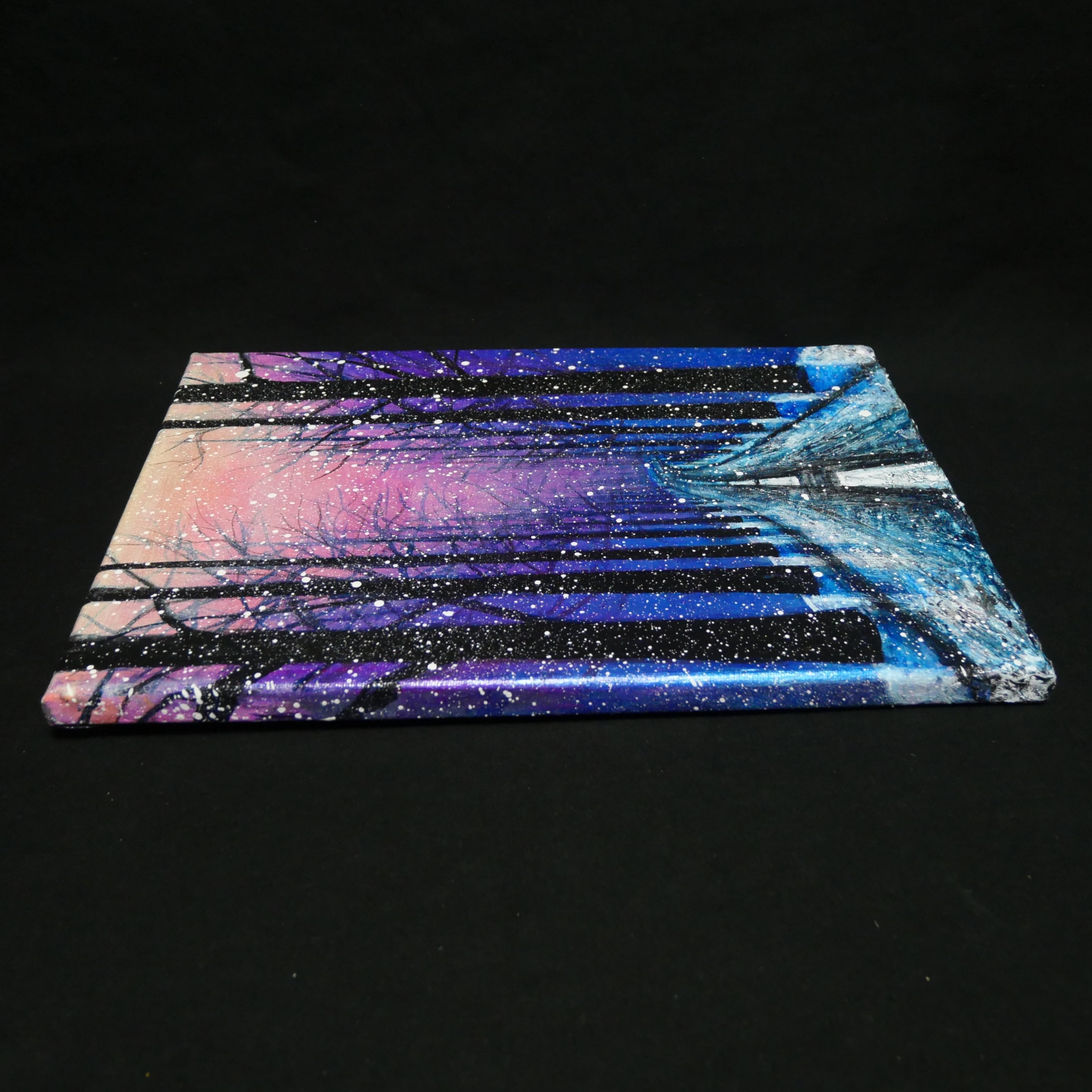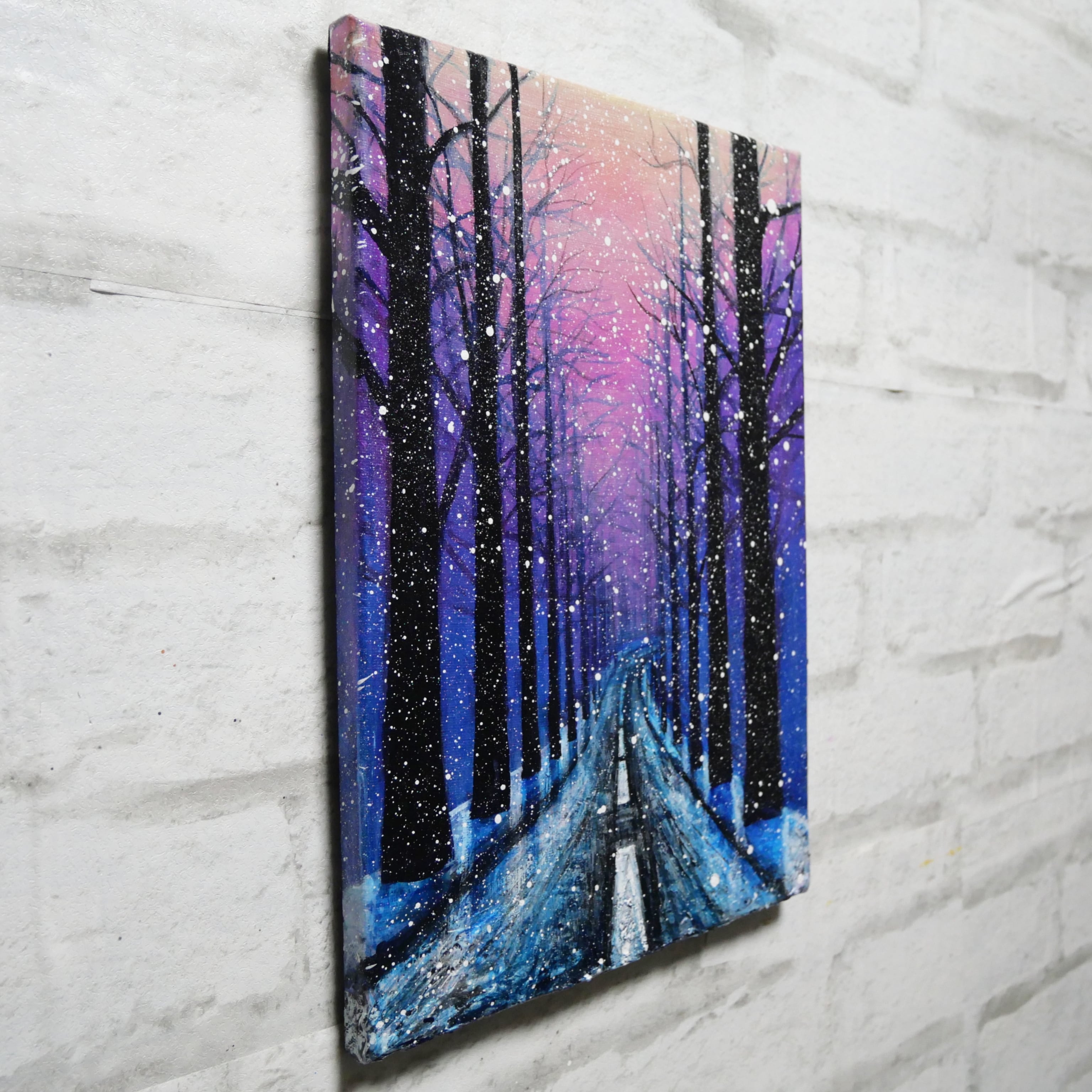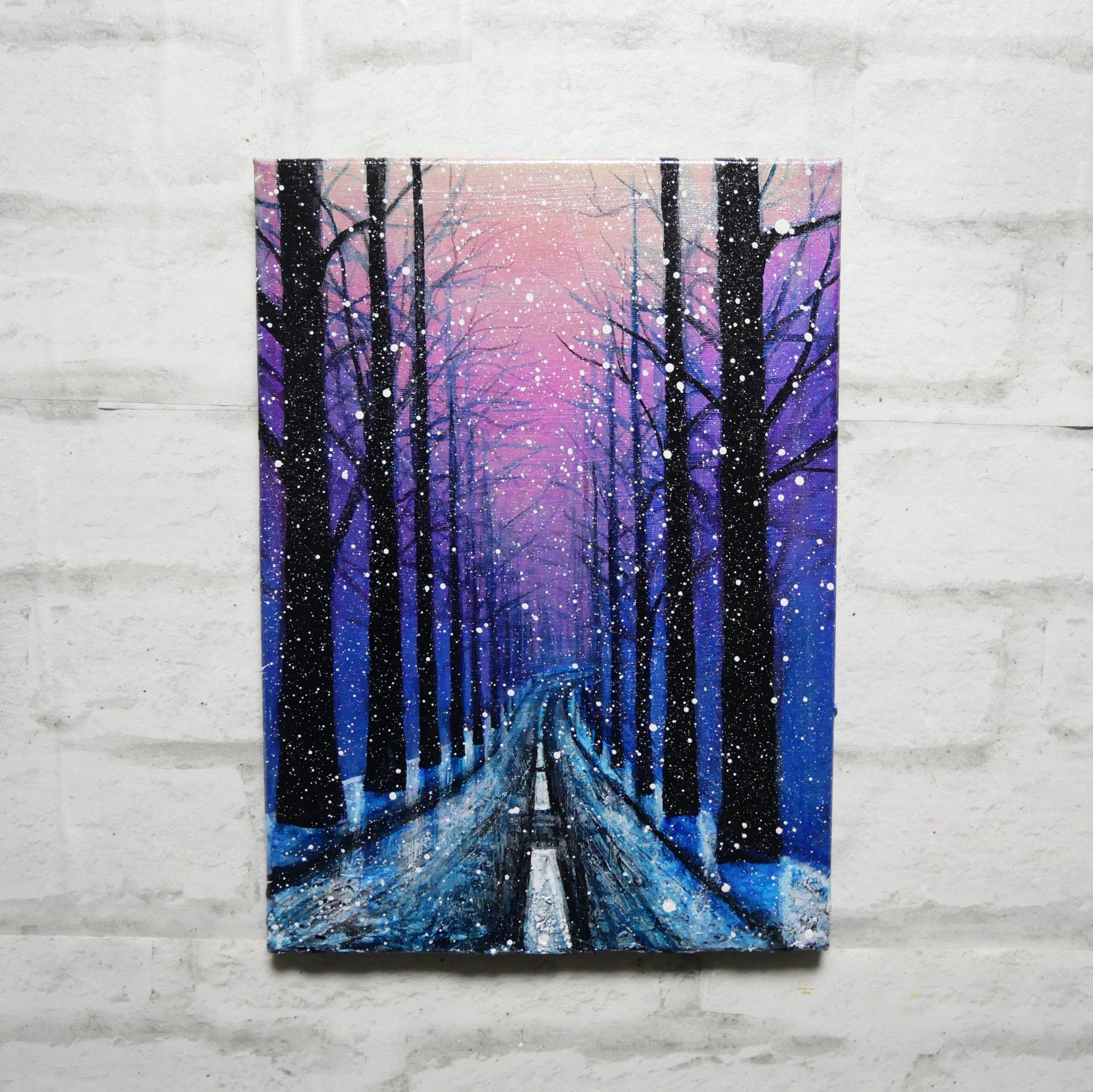 「雪降る幻想」は、冬の美しさを鮮やかに描いたオリジナル油絵作品です。果てしなく広がるピンク、紫、青の空の下、静かに降り積もる雪が、冬の風景を優しく包み込んでいます。中央には、雪に覆われた道路と林、その上を走る白い線が特徴的に描かれ、見ているだけで冬の静寂や寒さを感じさせる、まさに幻想的な一枚です。