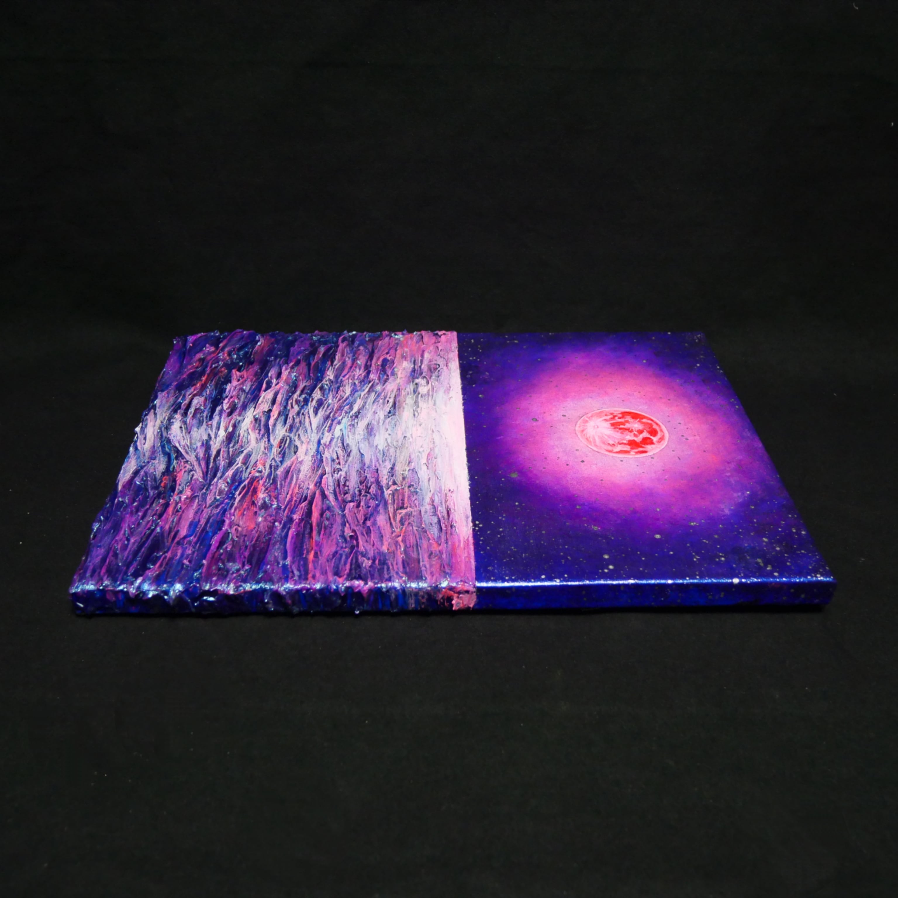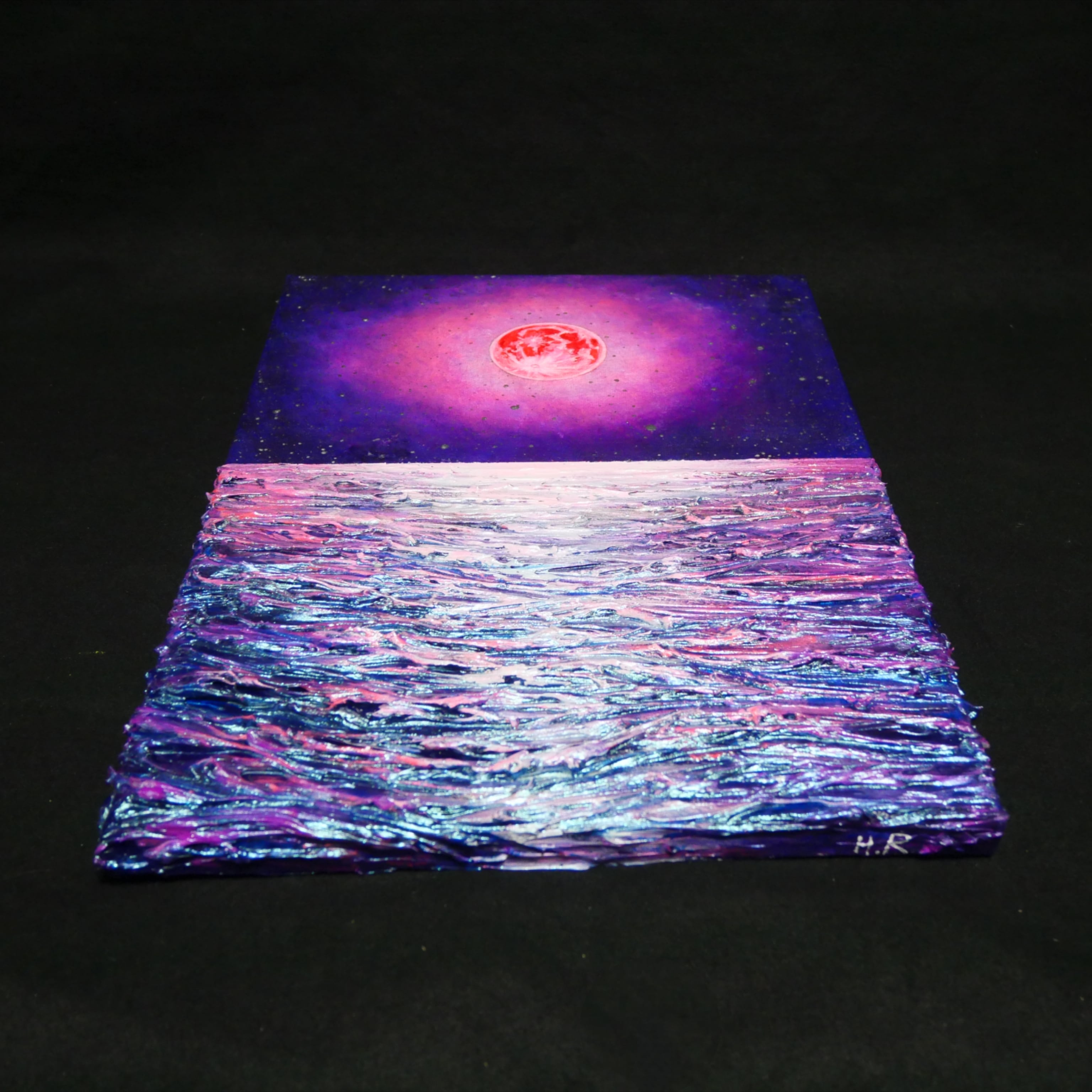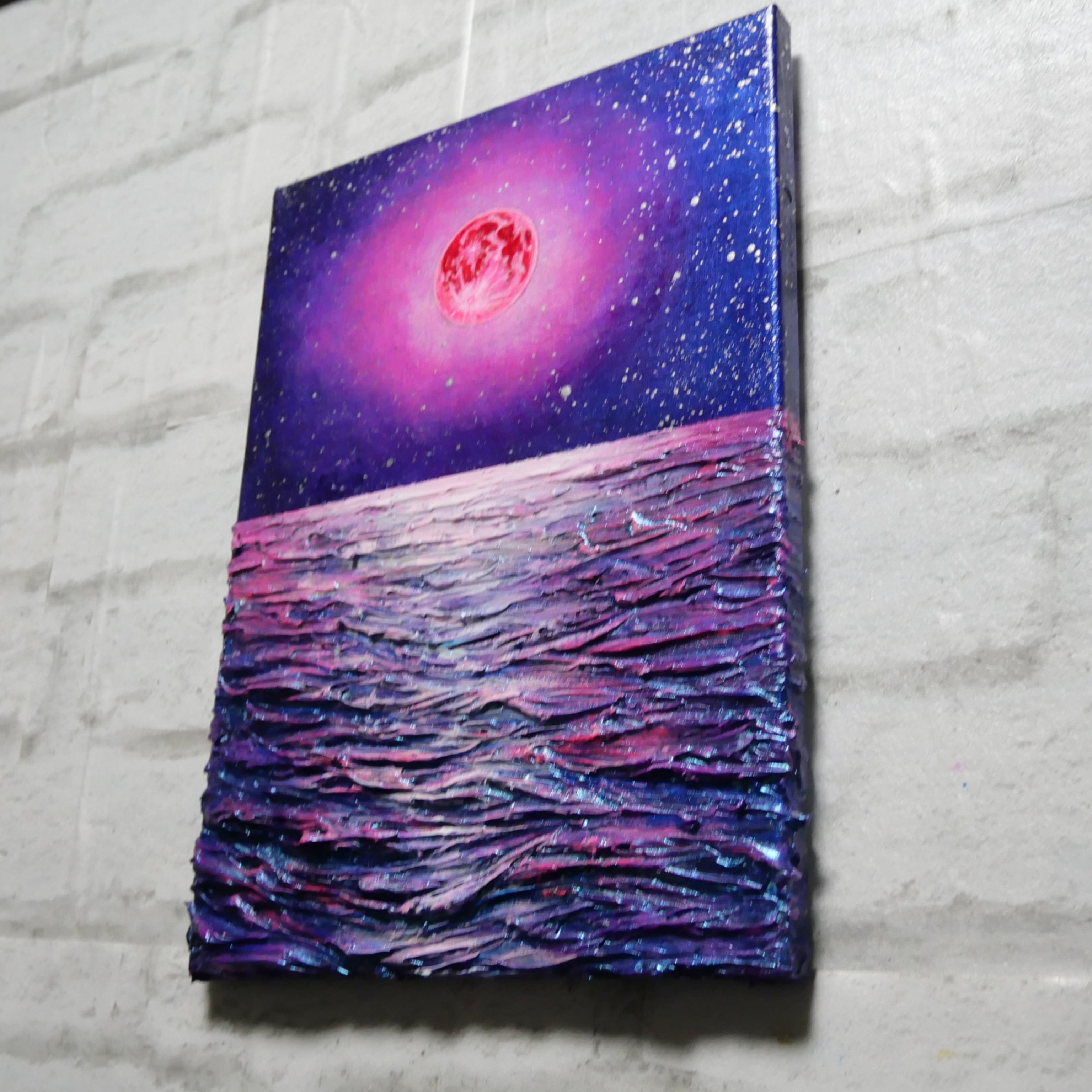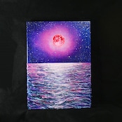 「ストロベリームーン」は、夜空に浮かぶ銀色の星々と、柔らかなピンク色に光る満月が描かれた特別な油絵作品です。満月の下には穏やかな海が広がり、その海面には月光が道のように煌めいています。神秘的な夜の美しさを堪能できる一作で、見る人の心を惹きつけることでしょう。ぜひ、「ストロベリームーン」で、月夜の魔法を感じてみてください!